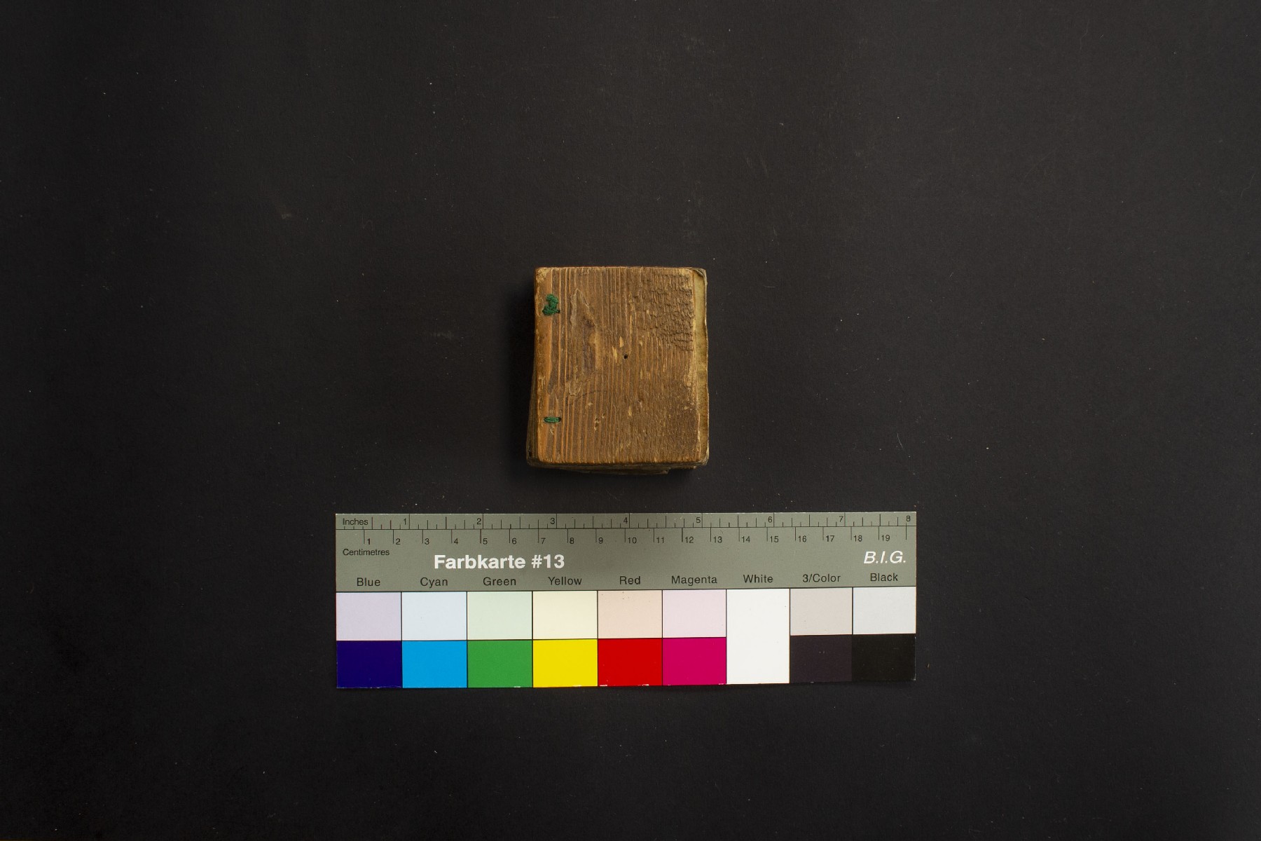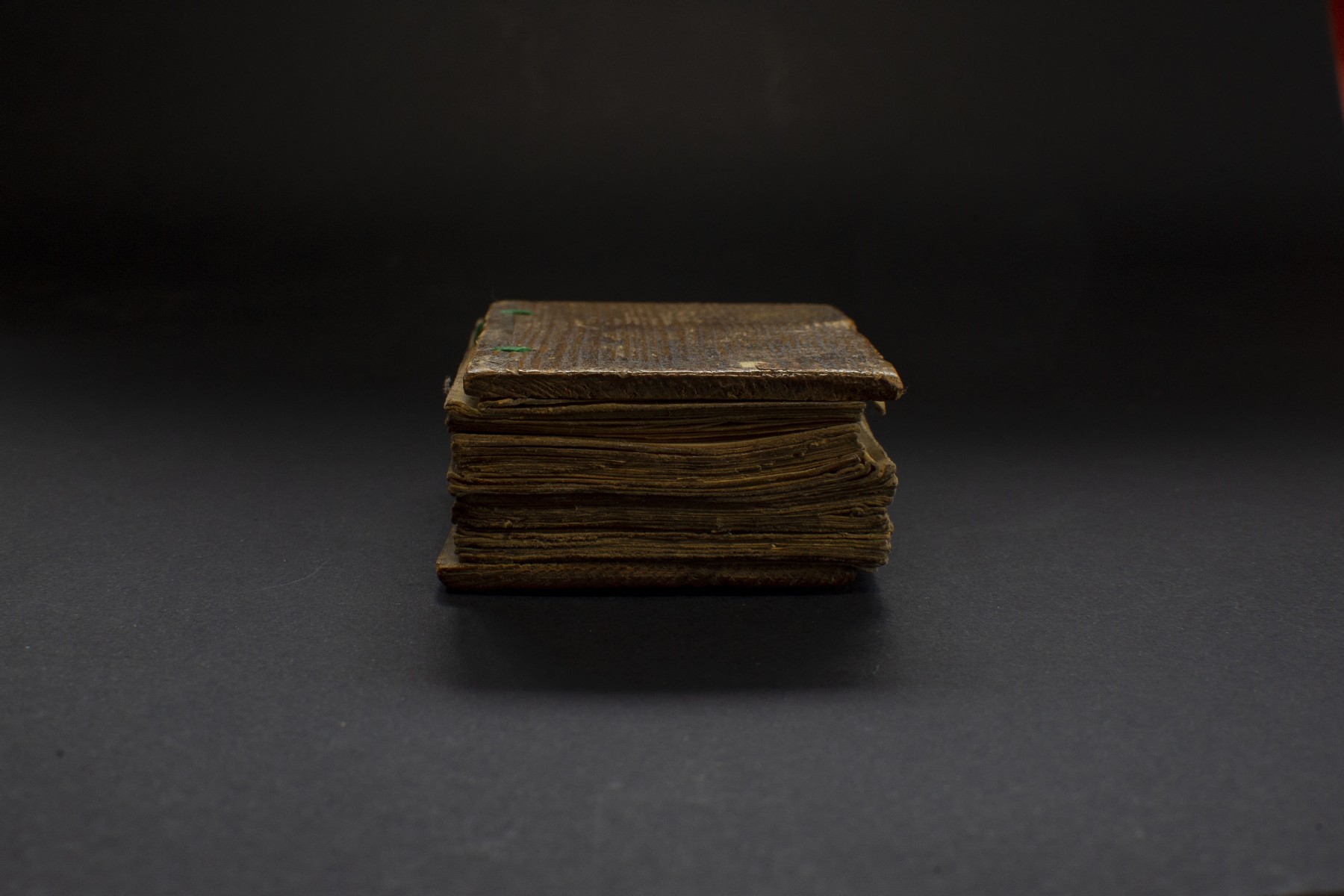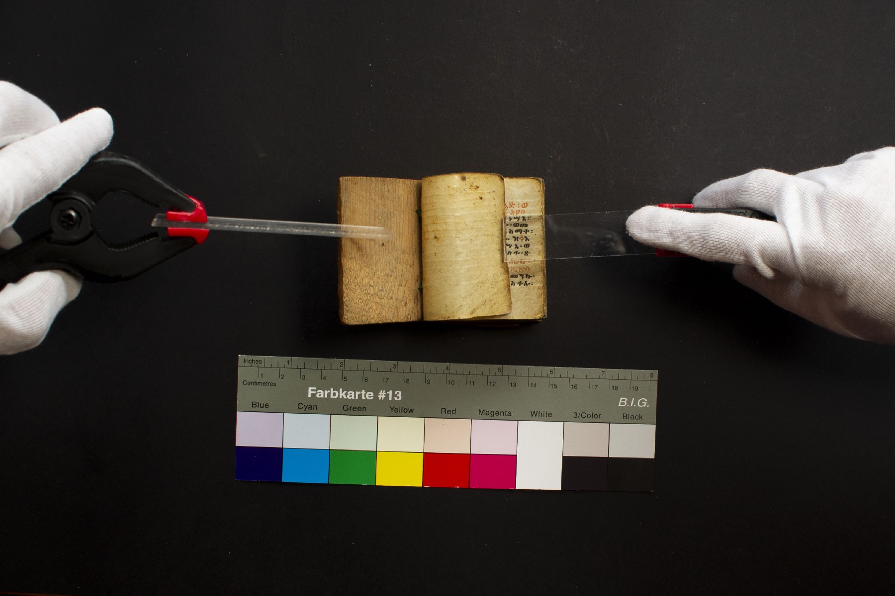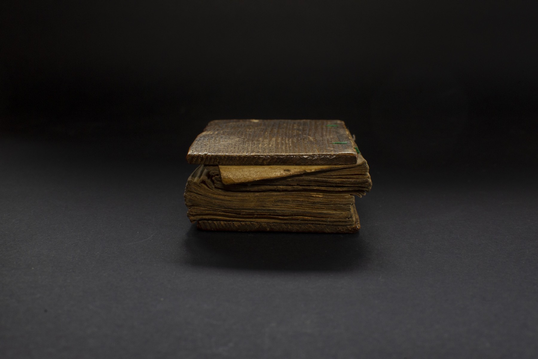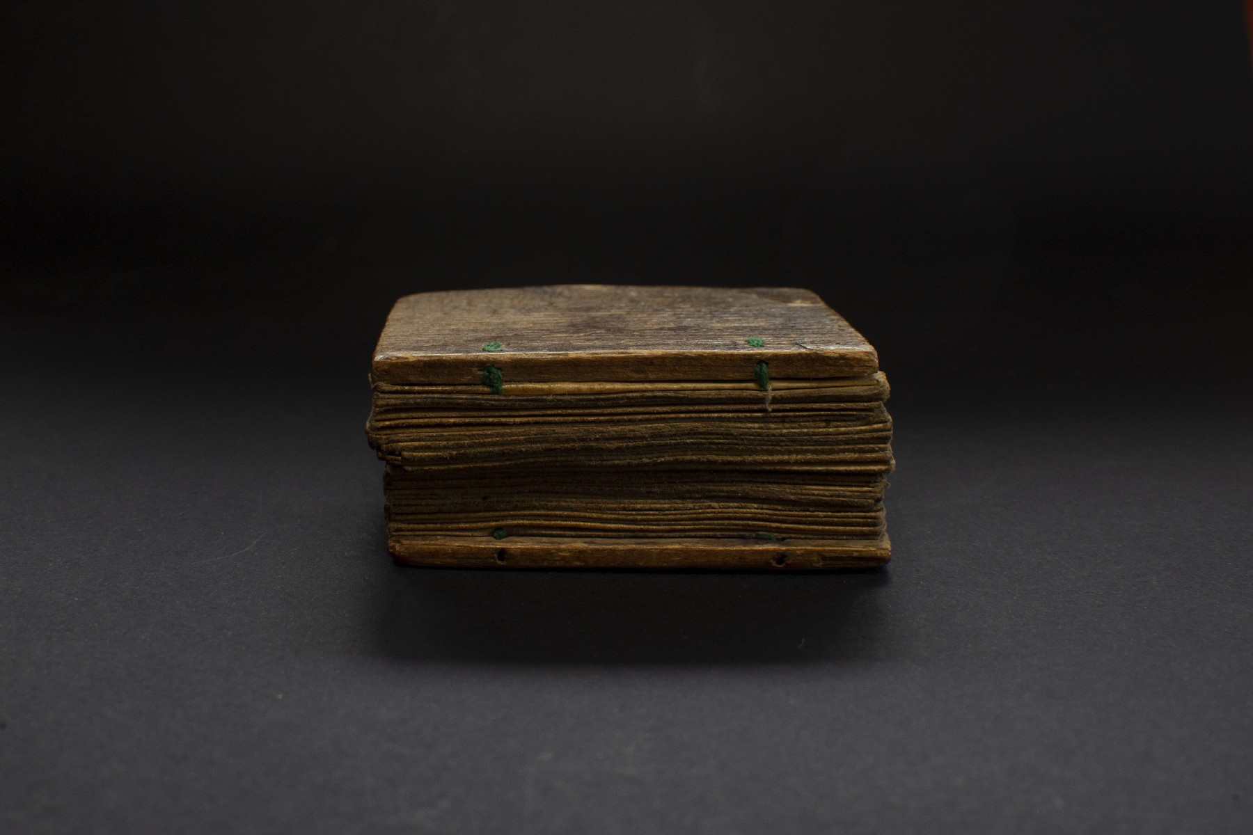 Two wooden boards. The spine is uncovered. Two sewing stations. |