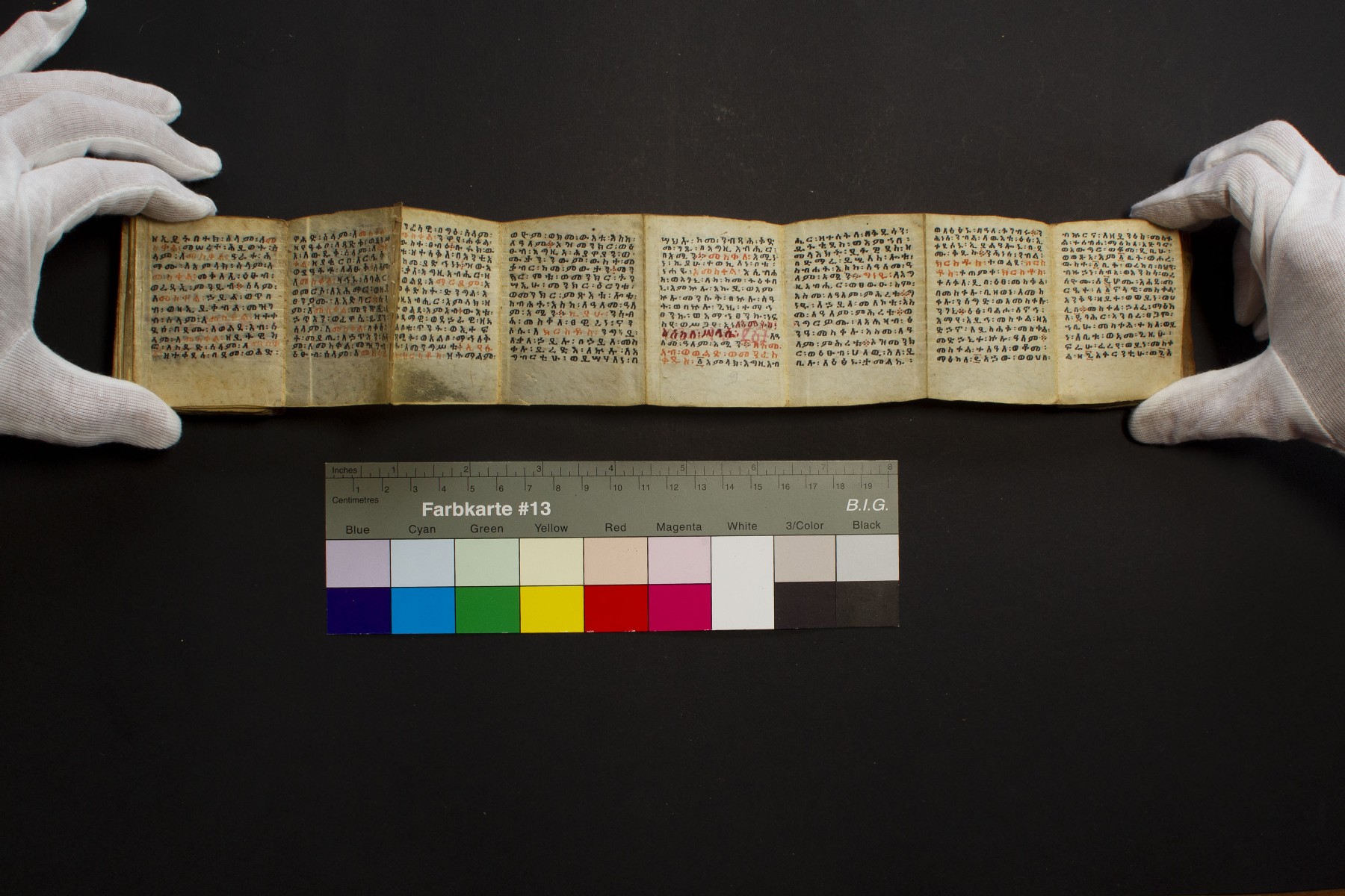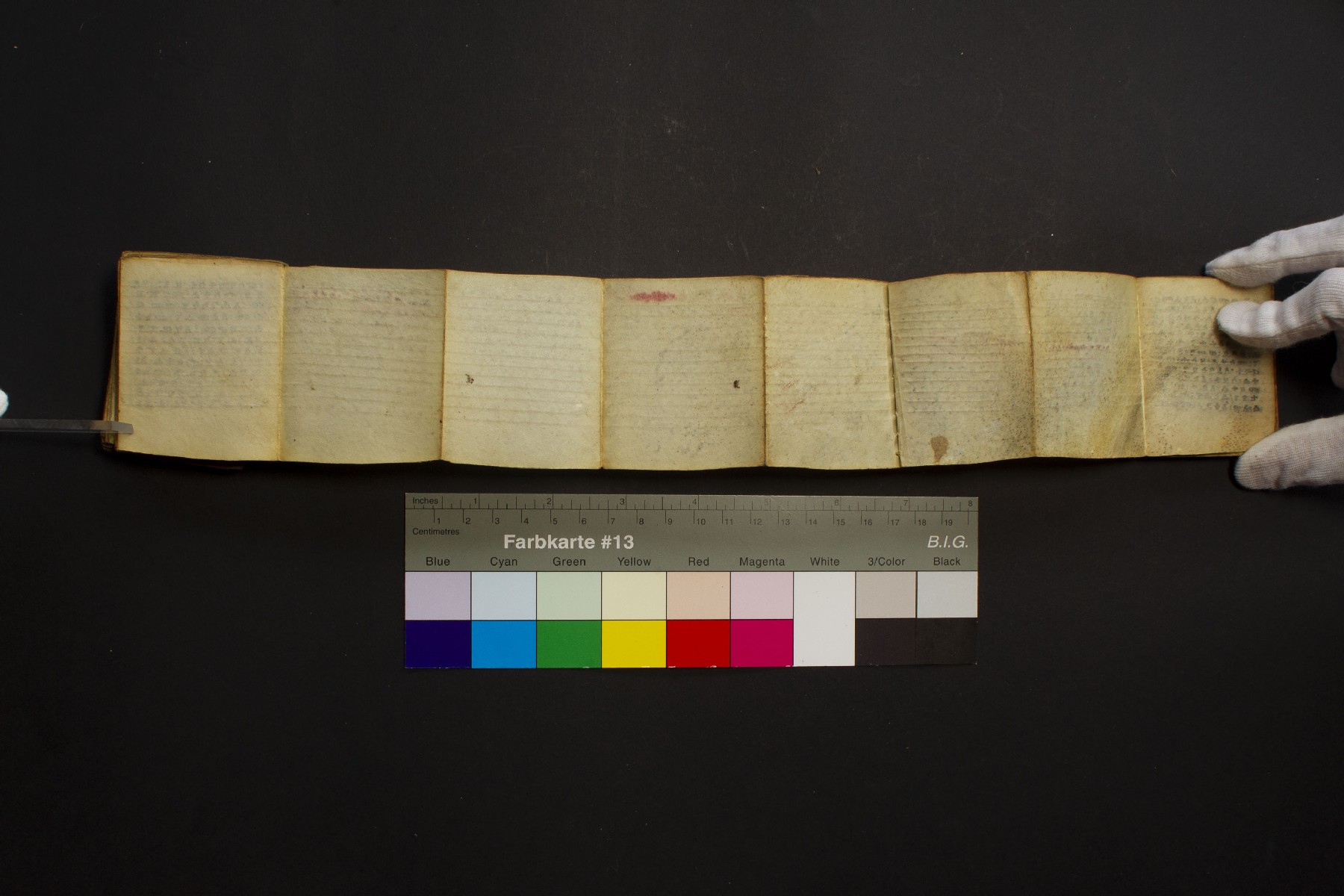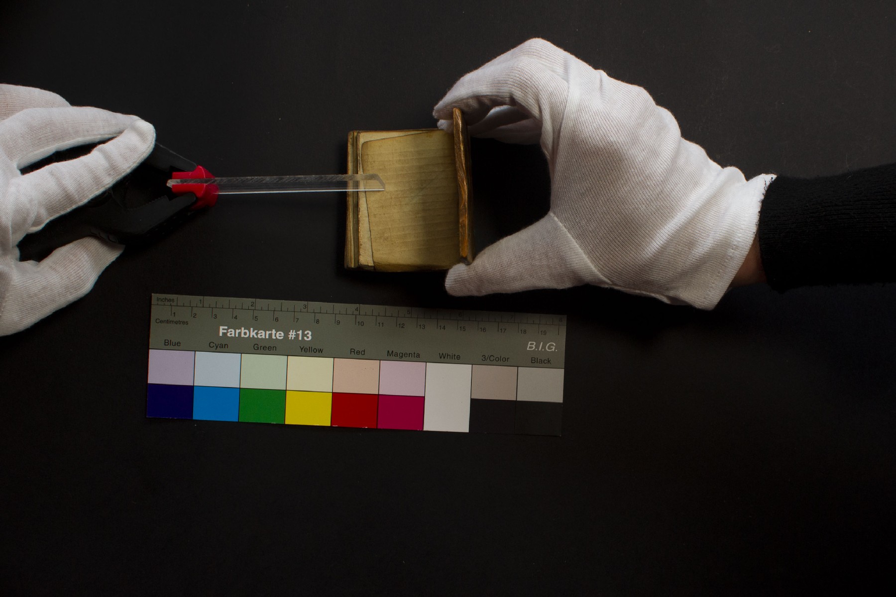 Blind ruling, from the flesh side to the hair side. Blind pricking, from the flesh side to the hair side. Lines are written above the ruling. |