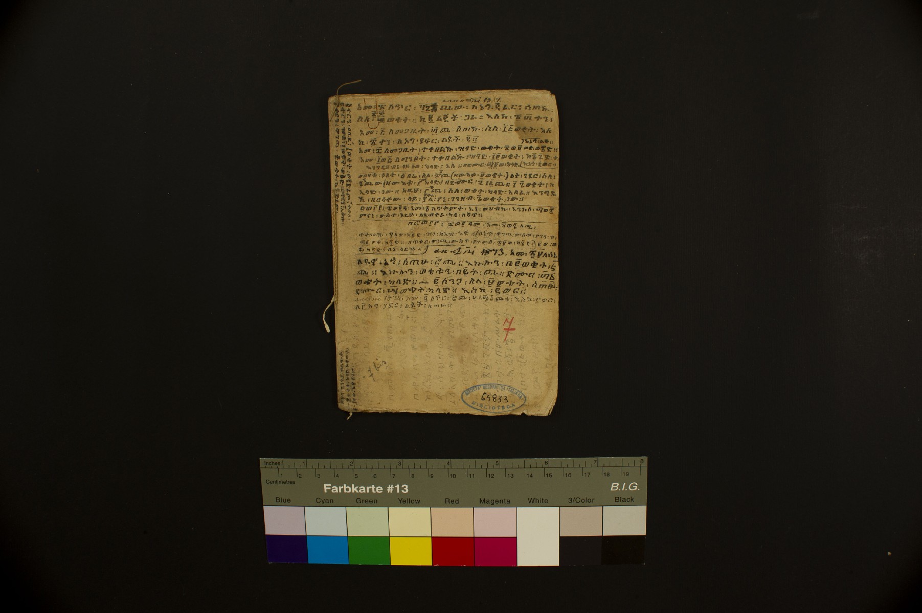 1). F. 1r: An. Dni 187[.] አመ፡ ፳ለጥር፡ ፶፮ጨው፡ ለኦጎ፡ ጃፈር፡ ሰጣኹ፡ ስለ፡ ፳፰፡ ወቄት። ከ፪ልጆች፡ ጋራ። እስከ፡ ፳፴ቀን፡ Transaction note concerning the sale of a quantity of salt. The note is written in Latin and Amharic by a European hand and is dated to 20 Ṭǝrr of a poorly understandable year (1871?). 2). F. 1r: አመ፡ ፭ለመጋቢት፡ ፴ጨ<ው>፡ ሰጣኹ፡ ስለ፡ ፲፭ወቄት፡ እስከ፡ ፳ቀን፡ ለኦግ፡ ያፈር፡ ልጆች፡ ፪። Transaction note concerning the sale of a quantity of salt. The note is written in Amharic and is dated to 5 Mäggabit of an unspecified year. 3). F. 1r: አመ፡ ፰ለመጋቢት፡ ተቀበልኹ፡ ዝባድ፡ ፳ወ፱ወቄ<ት>፡ ወ፰ድ። ከኦጎ፡ ለጅ። Transaction note concerning the procurement of musk. The note is written in Amharic and is dated to 8 Mäggabit of an unspecified year. 4). F. 1r: አመ፡ ፲ወ፭ለግንቦት፡ ተቀበልኹ፡ ዝባድ፡ ፲፬ወቄት፡ ከ፯ድ፡ ቀ፡ ከኦጎ፡ ጃር። እንግዴህ፡ በኔ፡ ላይ፡ ፩ወ፡ ካላድ፡ አለ። በድሙር፡ ፵፬ወ፡ ካላድ። Transaction note concerning the procurement of musk. The note is written in Amharic and is dated to 15 Gǝnbot of an unspecified year. 5). F. 1r: ወበዛቲ፡ ዕለት፡ ፩በሬ፡ ስለ፡ ፰፱ጨ (ዘውእቱ፡ ፬ወቄት፡) ዕት፡ ጊደር፡ ስለ፡ ፮፯ጨው (ዘውእቱ፡ ፫ወ፡ ካላድ፡) በድሙር፡ ፲፭ጨ። ፲፯ወቄት፡ ከኢላድ፡ ነው። ከዚህ፡ ፫ቱጨ፡ ስለ፡ ወቄት፡ ካላድ፡ አለፈ። እንግዴህ፡ በርሳቸው፡ ላይ፡ ያለ፡ ፬ቀረ፡ የኔ፡ ገንዘብ፡ ፮ወቄት፡ ነው። Transaction note concerning the trading of an ox for a quantity of salt. The note is written in Amharic. 6). F. 1r: ፸ወ፫፻፡ ፷ወ፬ዓ<መት>፡ አመ፡ ፩ለጥቅምት፡ አነ፡ ወሀብኩ፡ እንስሶ፡ (sic) ፵ወ፰ምናኒ፡ ውስተ፡ እዴሁ፡ ለደብተራ፡ ካሳ፡ ቢሻጥ። Transaction note concerning the transfer of cattle to däbtära Kassa Biššaṭ. The note is written in Gǝʿǝz and is dated to 1 Ṭǝqǝmt of the year of mercy 7364, i.e. 12 October 1871. 7). F. 1r: በ፸ወ፫፻፡ ፷ወ፬ዓመ፡ አመ፡ ፳ወ፯ለሚ<ያዝያ>፡ ትቀበልኹ፡ ፶፩ወ፡ ከ፪ድ፡ ዝባ<ድ>፡ ከአብ፡ እጅ። (በነጭ፡ ዋንጫ፡ ውስጥ፡ የገቢ፡ ዝ፡ ፴፩ወቄ<ት>፡ ከ፮ድ። በጥቁር፡ ዋንጫ፡ ውስጥ፡ የተውስ፡ ፳፱ወ፡ ከ፮ድ፡) ፪ወ፡ ከ፪ድ፡ በኔ፡ ላይ፡ አላ፡ Transaction note concerning the procurement of musk (?). The note is written in Amharic and is dated to 27 Miyazya of the year of mercy 7364, i.e. 4 May 1872. 8). F. 1r: An. Dni 1873 አመ፡ ፳፱ለሰኔ፡ ለደኖ፡ ኦጎ፡ ሰጣሁ፡ ፸ጨ<ው>። እኩሉን፡ በ፪ወቄት፡ ፭ጨ። እኩሉን፡ ወቄቱን፡ በ፪ት፡ ጨ። ድሙር፡ ፴፩ወቄት፡ ካላድ። ፪ሰንጋ፡ ስለ፡ ፱ወቄት፡ ስጠሉ፡ ድሙር፡ ፵ወቄት፡ ካላድ። እስከ፡ ፪ወር። Transaction note concerning the sale of a quantity of salt. The note is written in Latin and Amharic by a European hand and is dated to 29 Säne (i.e. 5 July) of the year 1873. 9). F. 1r: An. Dni 1874 አመ፡ ፪ለጥር፡ ፸ጨ<ው>፡ ፱ለ፵፩ወቄ<ት>፡ እስከ፡ ፫ወር፡ ለ፫ኦግ፡ ያፎር፡ ልጆች፡ ሰጣሁ። Transaction note concerning the sale of a quantity of salt. The note is written in Latin and Amharic by a European hand and is dated to 2 Ṭǝrr (i.e. 3 January) of the year 1874. 10). F. 1r: ፩ቀርን፡ ዐቢይ፡ ፲ወቄት፡ ወ፪ድሪም፡ ቅቡዕ፡ ፪ቀርን፡ ንዑስ፡ ፲ወቄት፡ ወ፩ድ፡ ወትረን፡ ኢቅቡ፡ ፫ቀርን፡ ዋንጫ፡ ፲ወቄት፡ ወ፮ድሪም፡ The note is written in Gǝʿǝz and Amharic along the inner upper margin of the folio. It mentions certain quantities of oil. |