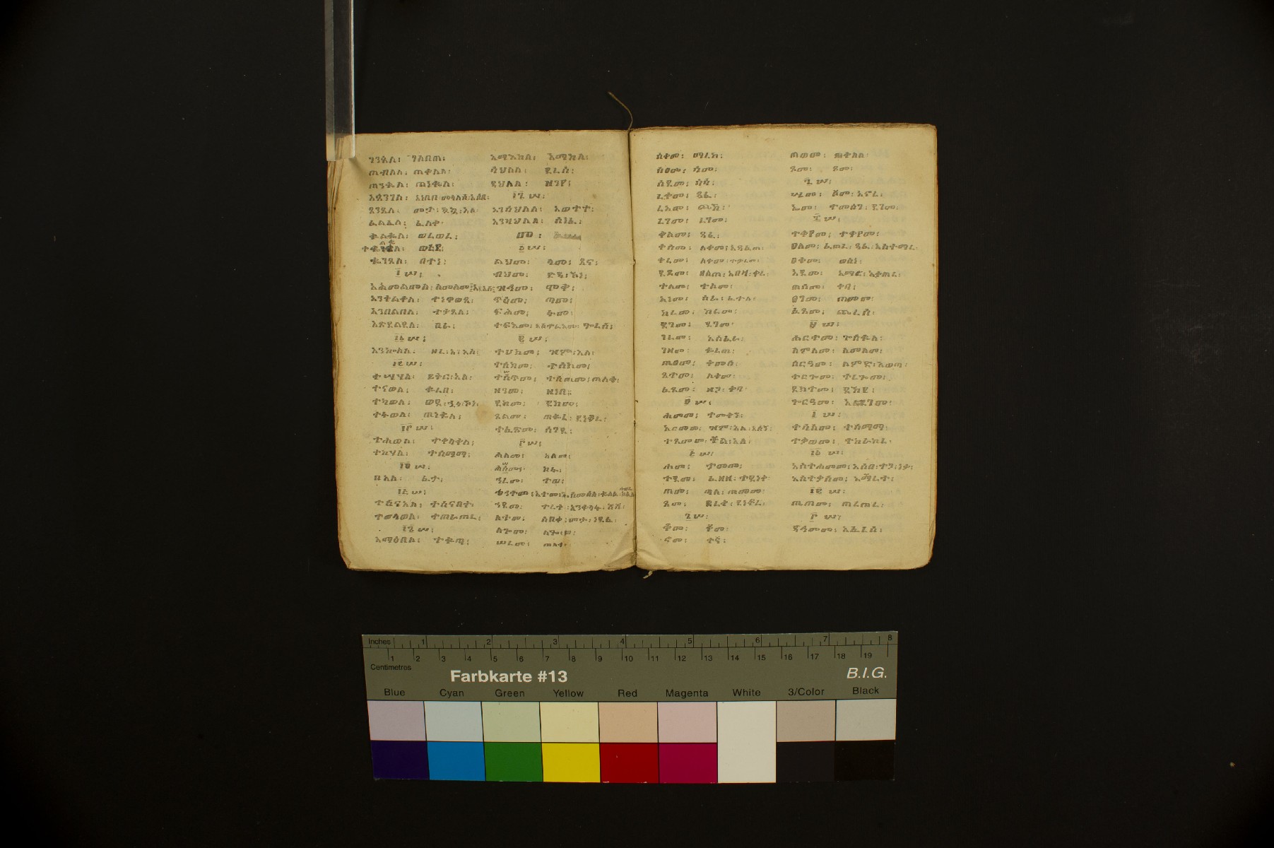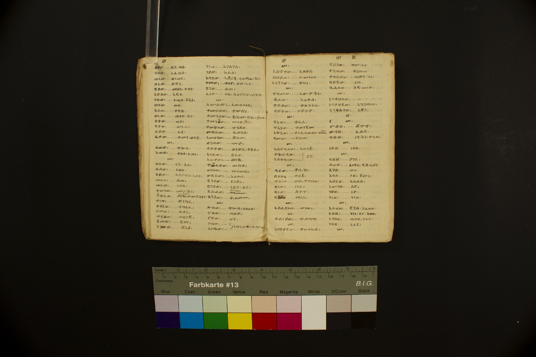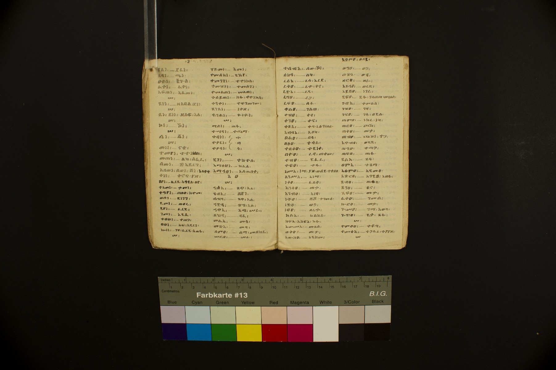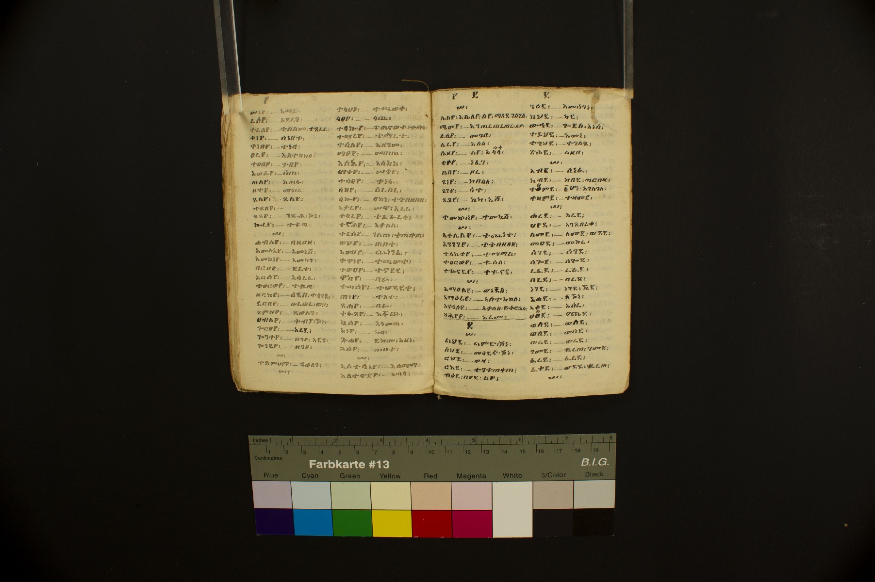 Ff. 2r–16va: Gǝʿǝz-Amharic vocabulary Incipit, in Amharic: ከሀ፡ እስከ፡ ኈ፡ ያለ፡ ግሥ፡ ኹሉ፡ ካዕብና፡ ሣልስ፡ ሲቀር፡ ባምስት፡ ፊደል፡ ይነሣል፡ በግዕዝ፡ ይጨረሳል። በዝርዝር፡ ጊዜ፡ ግን፡ ከኃምስ፡ በቀር፡ በ፮ፊደል፡ ይጨረሳል። ከ፯ፊደል፡ አይወጣም፡ ከ፪ፊደል፡ አይወርድም። The vocabulary is arranged in alphabetical order according to the last consonant of the root. Chapters are: ሀ/ሐ/ኀ (ff. 1ra–3v), ለ (ff. 3va–4vb), መ (ff. 4vb–5rb), ሠ/ሰ (ff. 5va–6rb), ረ (ff. 6rb–7va), ቀ (ff. 7va–8ra), በ (ff. 8ra–vb), ተ (ff. 8vb–9rb), ነ (ff. 9rb–vb), አ/ዐ (ff. 9vb–10vb), ከ (ff. 10vb–11ra), ወ (ff. 11ra–12rb), ዘ (ff. 12rb–va), የ (ff. 12va–14ra), ደ (ff. 14ra–vb), ገ (ff. 14vb–15ra), ጠ (ff. 15ra–rb), ጰ (ff. 15rb–va), ጸ/ፀ (ff. 15va–16ra), ፈ (ff. 16ra–rb), ኰ (f. 16rb), ጐ (f. 16rb), ቈ (ff. 16rb–va), ኈ (f. 16va). Each chapter is internally subdivided into sections indicated as ሠ(ርዌ፡) (“commander”) followed by a progressive number. The numbering is sometimes omitted. Verbs are listed on two columns: the first accommodates Gǝʿǝz entries, the second accommodates the corresponding meaning in Amharic. Chapter ሀ/ሐ/ኀ concludes with a wordlist of Gǝʿǝz nouns and their corresponding meanings in Amharic, written on one column. Ff. 16va–18vb: Treatise of Gǝʿǝz verbal morphology, in Amharic Incipit, in Amharic: ቀደሰ፡ ድርቡ፡ አንገለገ፡ ጥኅረ፡ ቀተለ፡ ኃሠሠ፡ ገብረ፡ ነደ፡ ሴመ፡ ቆመ፡ አእመረ። ከጥኅረ፡ ጀምሮ፡ እስከ፡ አእመረ፡ ካሉቱ፡ ሳቤ፡ ዘር፡ ይወፃል። አንከረ፡ ድርቡ፡ አድለቅለቀ፤ ዜነወ፡ ድርቡ፡ አንጌገየ። The short treatise begins with a list of the base forms of some sample verbs (ቀደሰ፡, አንገለገ፡, ቀተለ፡, ኃሠሰ፡, ገብረ፡, ነደ፡, ሴመ፡, ቆመ፡, አእመረ፡, etc.) and continues with their conjugations according to the Gǝʿǝz verbal tenses. Ff. 19r–21v: Wordlist of Amharic roots, incomplete. Entries are listed is in alphabetical order according to the first consonant of the root. They are not accompanied by their meaning. The wordlist is incomplete: it only includes consonants ለ (ff. 19r–20r), መ (ff. 20v–21r), and ሠ/ሰ (ff. 21r–v). |