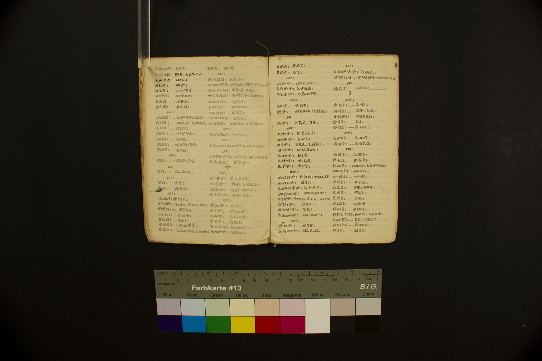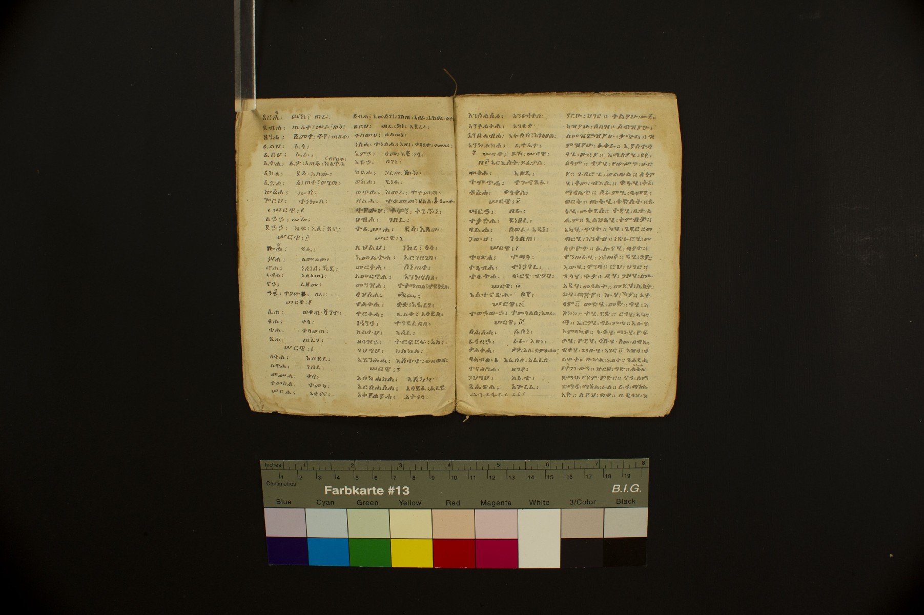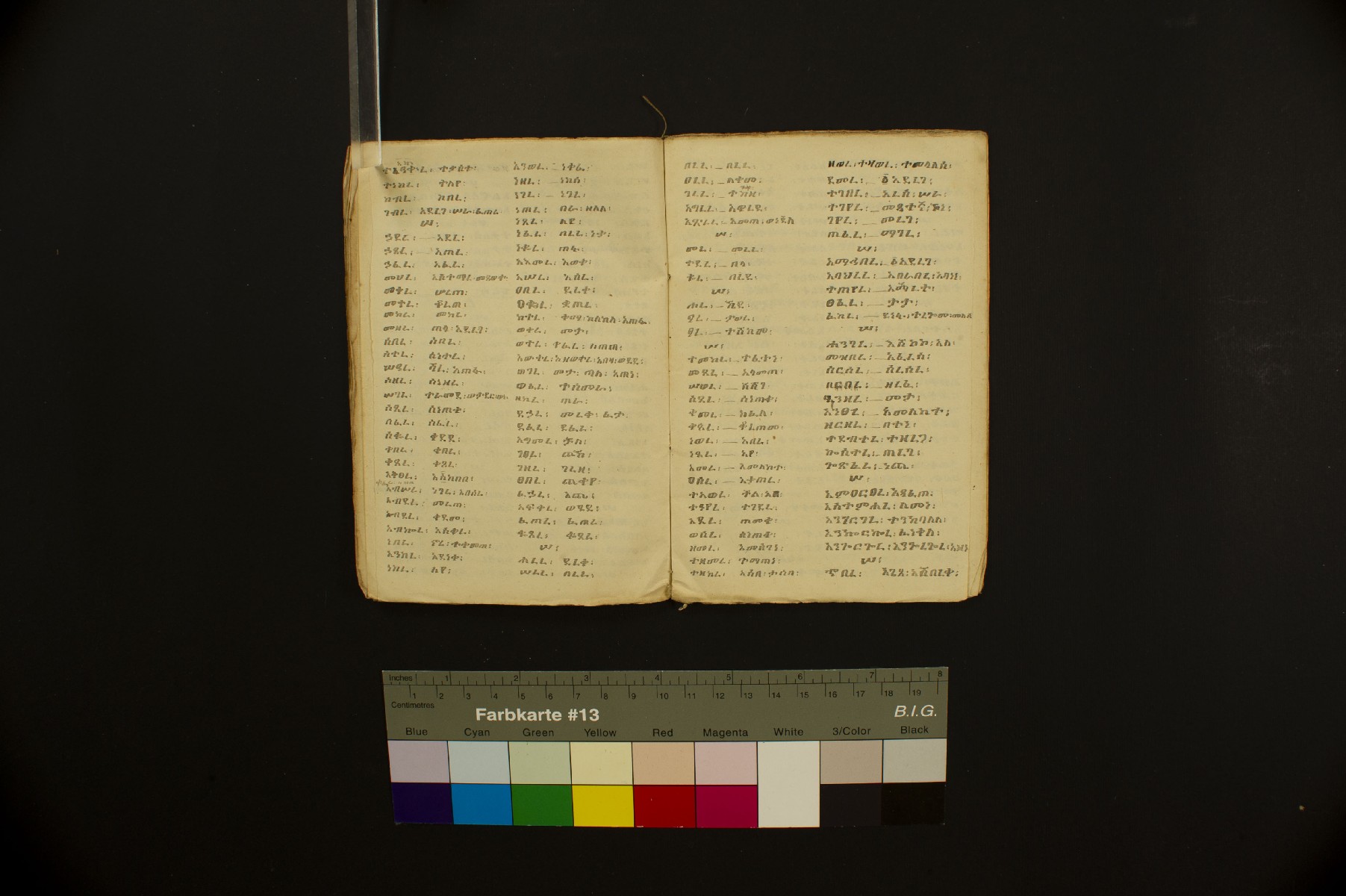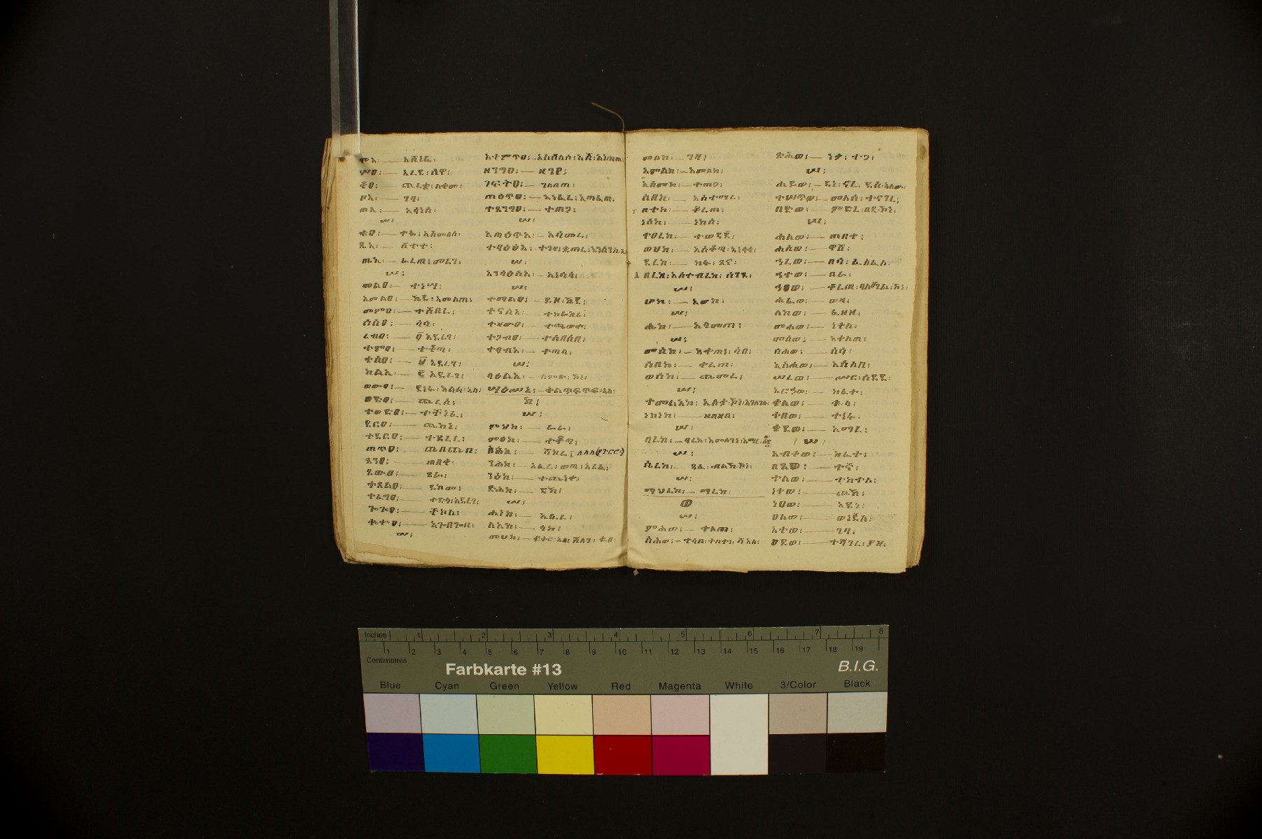 Ff. 2r–16va: Gǝʿǝz-Amharic vocabulary Incipit, in Amharic: ከሀ፡ እስከ፡ ኈ፡ ያለ፡ ግሥ፡ ኹሉ፡ ካዕብና፡ ሣልስ፡ ሲቀር፡ ባምስት፡ ፊደል፡ ይነሣል፡ በግዕዝ፡ ይጨረሳል። በዝርዝር፡ ጊዜ፡ ግን፡ ከኃምስ፡ በቀር፡ በ፮ፊደል፡ ይጨረሳል። ከ፯ፊደል፡ አይወጣም፡ ከ፪ፊደል፡ አይወርድም። The vocabulary is arranged in alphabetical order according to the last consonant of the root. Chapters are: ሀ/ሐ/ኀ (ff. 1ra–3v), ለ (ff. 3va–4vb), መ (ff. 4vb–5rb), ሠ/ሰ (ff. 5va–6rb), ረ (ff. 6rb–7va), ቀ (ff. 7va–8ra), በ (ff. 8ra–vb), ተ (ff. 8vb–9rb), ነ (ff. 9rb–vb), አ/ዐ (ff. 9vb–10vb), ከ (ff. 10vb–11ra), ወ (ff. 11ra–12rb), ዘ (ff. 12rb–va), የ (ff. 12va–14ra), ደ (ff. 14ra–vb), ገ (ff. 14vb–15ra), ጠ (ff. 15ra–rb), ጰ (ff. 15rb–va), ጸ/ፀ (ff. 15va–16ra), ፈ (ff. 16ra–rb), ኰ (f. 16rb), ጐ (f. 16rb), ቈ (ff. 16rb–va), ኈ (f. 16va). Each chapter is internally subdivided into sections indicated as ሠ(ርዌ፡) (“commander”) followed by a progressive number. The numbering is sometimes omitted. Verbs are listed on two columns: the first accommodates Gǝʿǝz entries, the second accommodates the corresponding meaning in Amharic. Chapter ሀ/ሐ/ኀ concludes with a wordlist of Gǝʿǝz nouns and their corresponding meanings in Amharic, written on one column. Ff. 16va–18vb: Treatise of Gǝʿǝz verbal morphology, in Amharic Incipit, in Amharic: ቀደሰ፡ ድርቡ፡ አንገለገ፡ ጥኅረ፡ ቀተለ፡ ኃሠሠ፡ ገብረ፡ ነደ፡ ሴመ፡ ቆመ፡ አእመረ። ከጥኅረ፡ ጀምሮ፡ እስከ፡ አእመረ፡ ካሉቱ፡ ሳቤ፡ ዘር፡ ይወፃል። አንከረ፡ ድርቡ፡ አድለቅለቀ፤ ዜነወ፡ ድርቡ፡ አንጌገየ። The short treatise begins with a list of the base forms of some sample verbs (ቀደሰ፡, አንገለገ፡, ቀተለ፡, ኃሠሰ፡, ገብረ፡, ነደ፡, ሴመ፡, ቆመ፡, አእመረ፡, etc.) and continues with their conjugations according to the Gǝʿǝz verbal tenses. Ff. 19r–21v: Wordlist of Amharic roots, incomplete. Entries are listed is in alphabetical order according to the first consonant of the root. They are not accompanied by their meaning. The wordlist is incomplete: it only includes consonants ለ (ff. 19r–20r), መ (ff. 20v–21r), and ሠ/ሰ (ff. 21r–v). |