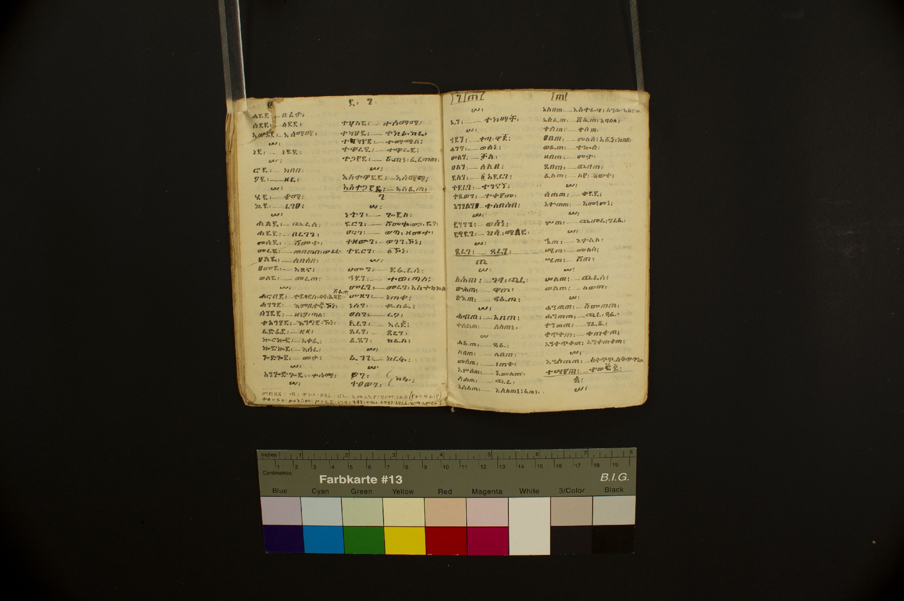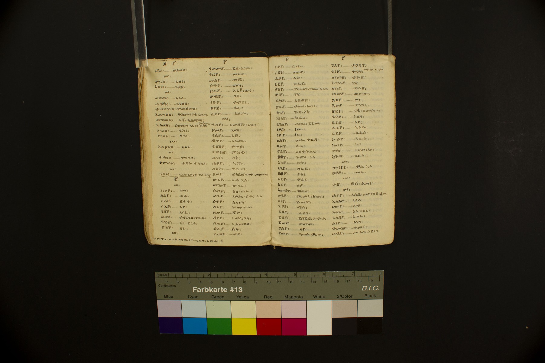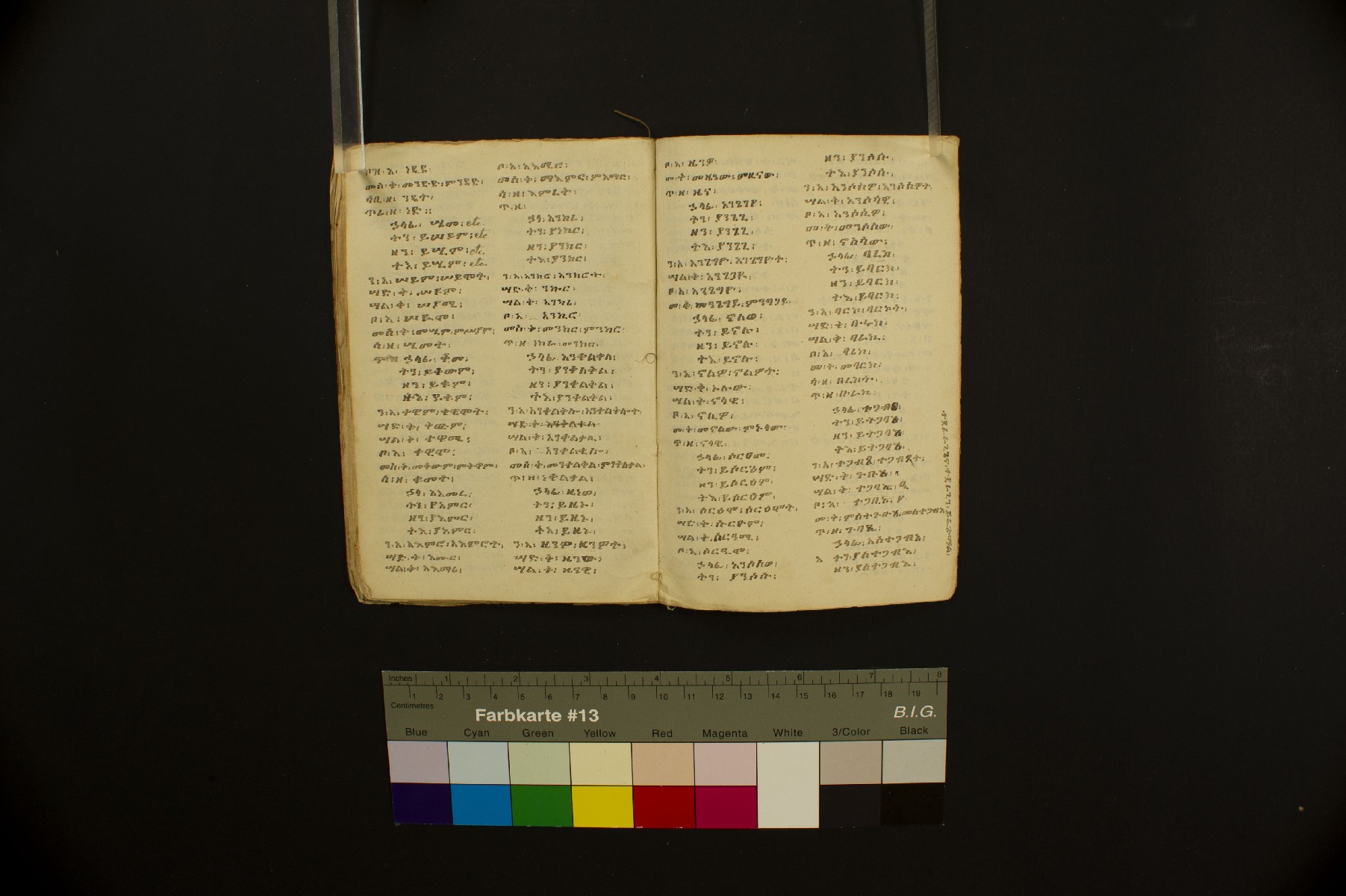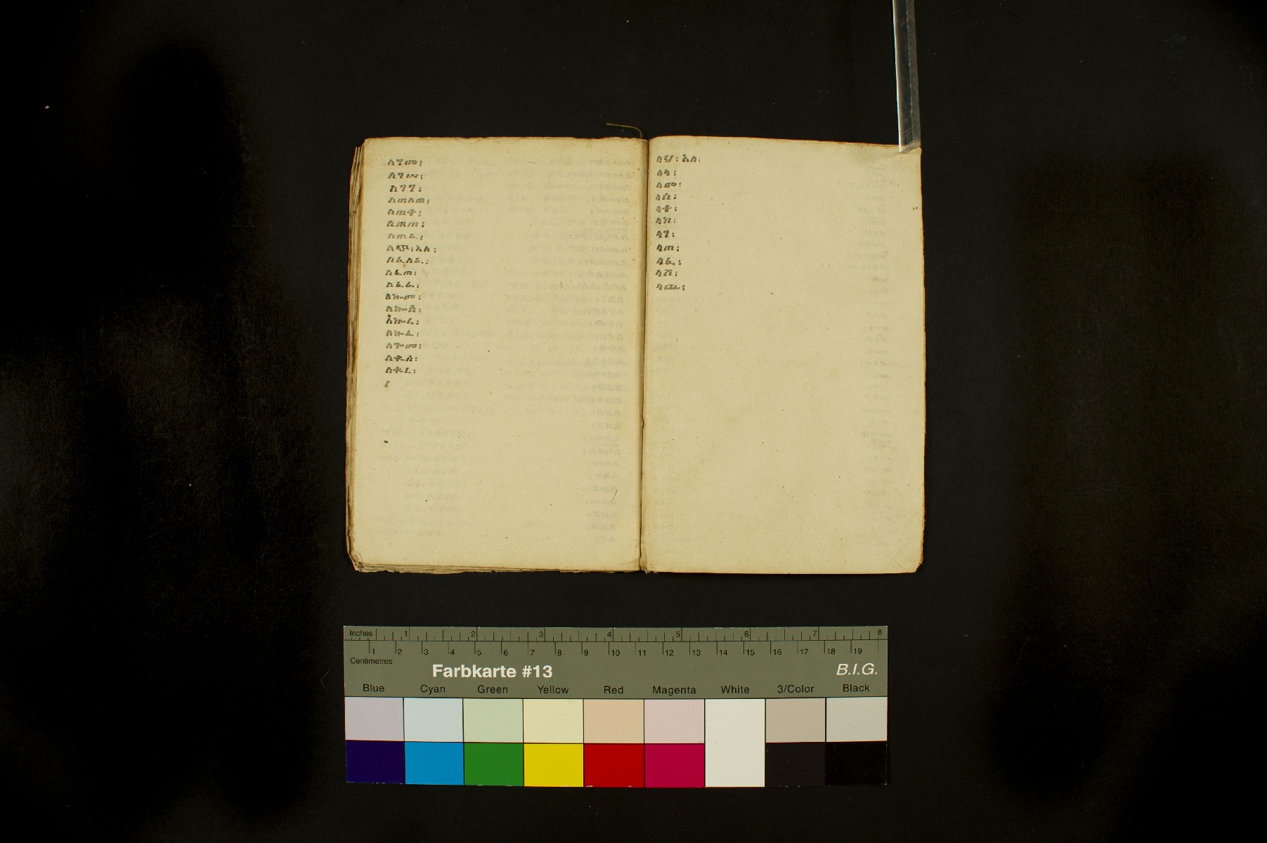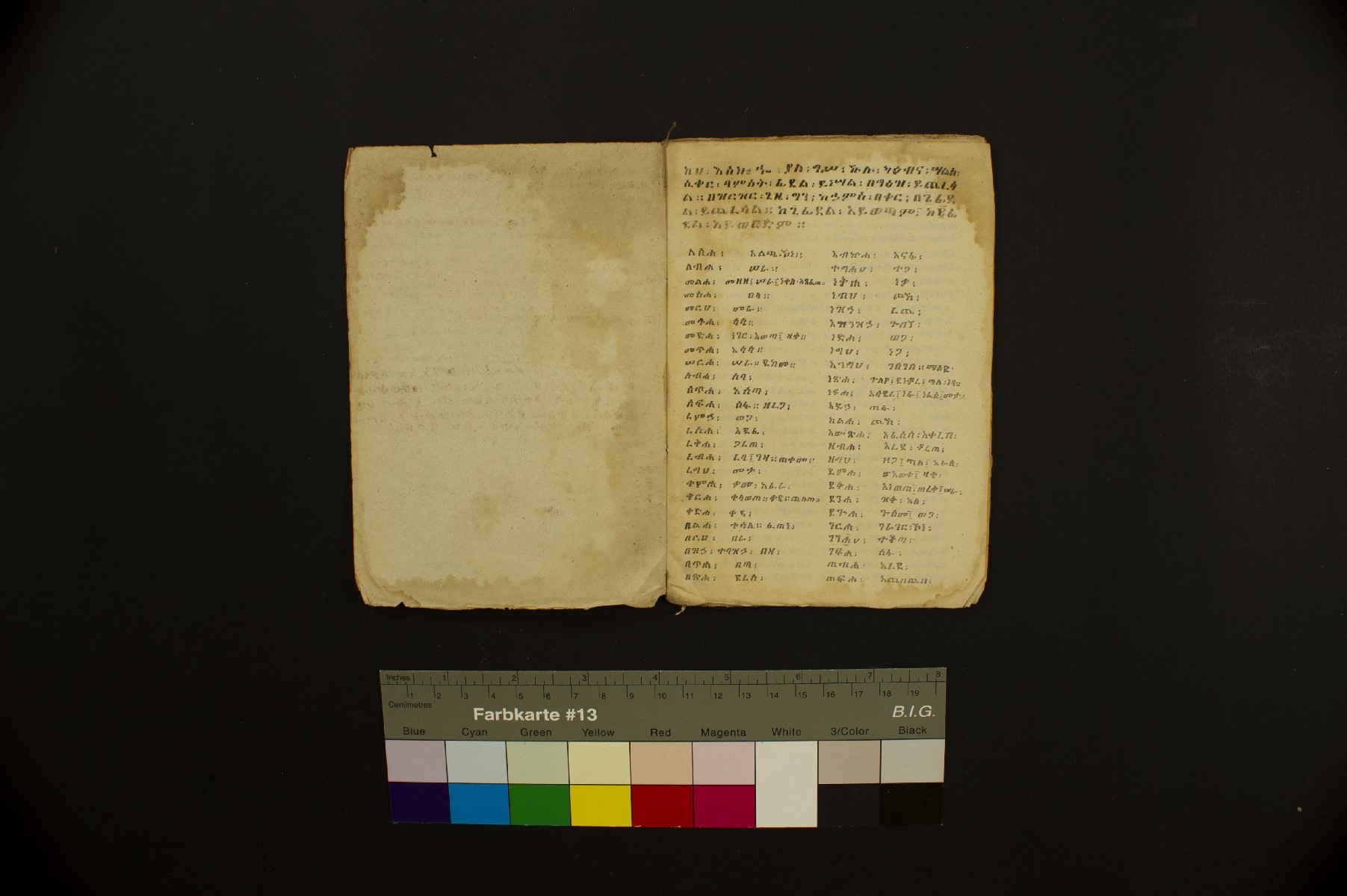 Ff. 2r–16va: Gǝʿǝz-Amharic vocabulary Incipit, in Amharic: ከሀ፡ እስከ፡ ኈ፡ ያለ፡ ግሥ፡ ኹሉ፡ ካዕብና፡ ሣልስ፡ ሲቀር፡ ባምስት፡ ፊደል፡ ይነሣል፡ በግዕዝ፡ ይጨረሳል። በዝርዝር፡ ጊዜ፡ ግን፡ ከኃምስ፡ በቀር፡ በ፮ፊደል፡ ይጨረሳል። ከ፯ፊደል፡ አይወጣም፡ ከ፪ፊደል፡ አይወርድም። The vocabulary is arranged in alphabetical order according to the last consonant of the root. Chapters are: ሀ/ሐ/ኀ (ff. 1ra–3v), ለ (ff. 3va–4vb), መ (ff. 4vb–5rb), ሠ/ሰ (ff. 5va–6rb), ረ (ff. 6rb–7va), ቀ (ff. 7va–8ra), በ (ff. 8ra–vb), ተ (ff. 8vb–9rb), ነ (ff. 9rb–vb), አ/ዐ (ff. 9vb–10vb), ከ (ff. 10vb–11ra), ወ (ff. 11ra–12rb), ዘ (ff. 12rb–va), የ (ff. 12va–14ra), ደ (ff. 14ra–vb), ገ (ff. 14vb–15ra), ጠ (ff. 15ra–rb), ጰ (ff. 15rb–va), ጸ/ፀ (ff. 15va–16ra), ፈ (ff. 16ra–rb), ኰ (f. 16rb), ጐ (f. 16rb), ቈ (ff. 16rb–va), ኈ (f. 16va). Each chapter is internally subdivided into sections indicated as ሠ(ርዌ፡) (“commander”) followed by a progressive number. The numbering is sometimes omitted. Verbs are listed on two columns: the first accommodates Gǝʿǝz entries, the second accommodates the corresponding meaning in Amharic. Chapter ሀ/ሐ/ኀ concludes with a wordlist of Gǝʿǝz nouns and their corresponding meanings in Amharic, written on one column. Ff. 16va–18vb: Treatise of Gǝʿǝz verbal morphology, in Amharic Incipit, in Amharic: ቀደሰ፡ ድርቡ፡ አንገለገ፡ ጥኅረ፡ ቀተለ፡ ኃሠሠ፡ ገብረ፡ ነደ፡ ሴመ፡ ቆመ፡ አእመረ። ከጥኅረ፡ ጀምሮ፡ እስከ፡ አእመረ፡ ካሉቱ፡ ሳቤ፡ ዘር፡ ይወፃል። አንከረ፡ ድርቡ፡ አድለቅለቀ፤ ዜነወ፡ ድርቡ፡ አንጌገየ። The short treatise begins with a list of the base forms of some sample verbs (ቀደሰ፡, አንገለገ፡, ቀተለ፡, ኃሠሰ፡, ገብረ፡, ነደ፡, ሴመ፡, ቆመ፡, አእመረ፡, etc.) and continues with their conjugations according to the Gǝʿǝz verbal tenses. Ff. 19r–21v: Wordlist of Amharic roots, incomplete. Entries are listed is in alphabetical order according to the first consonant of the root. They are not accompanied by their meaning. The wordlist is incomplete: it only includes consonants ለ (ff. 19r–20r), መ (ff. 20v–21r), and ሠ/ሰ (ff. 21r–v). |