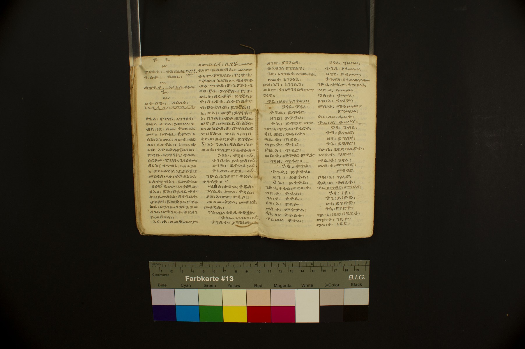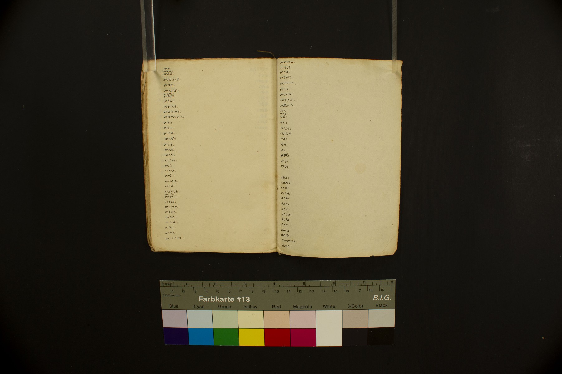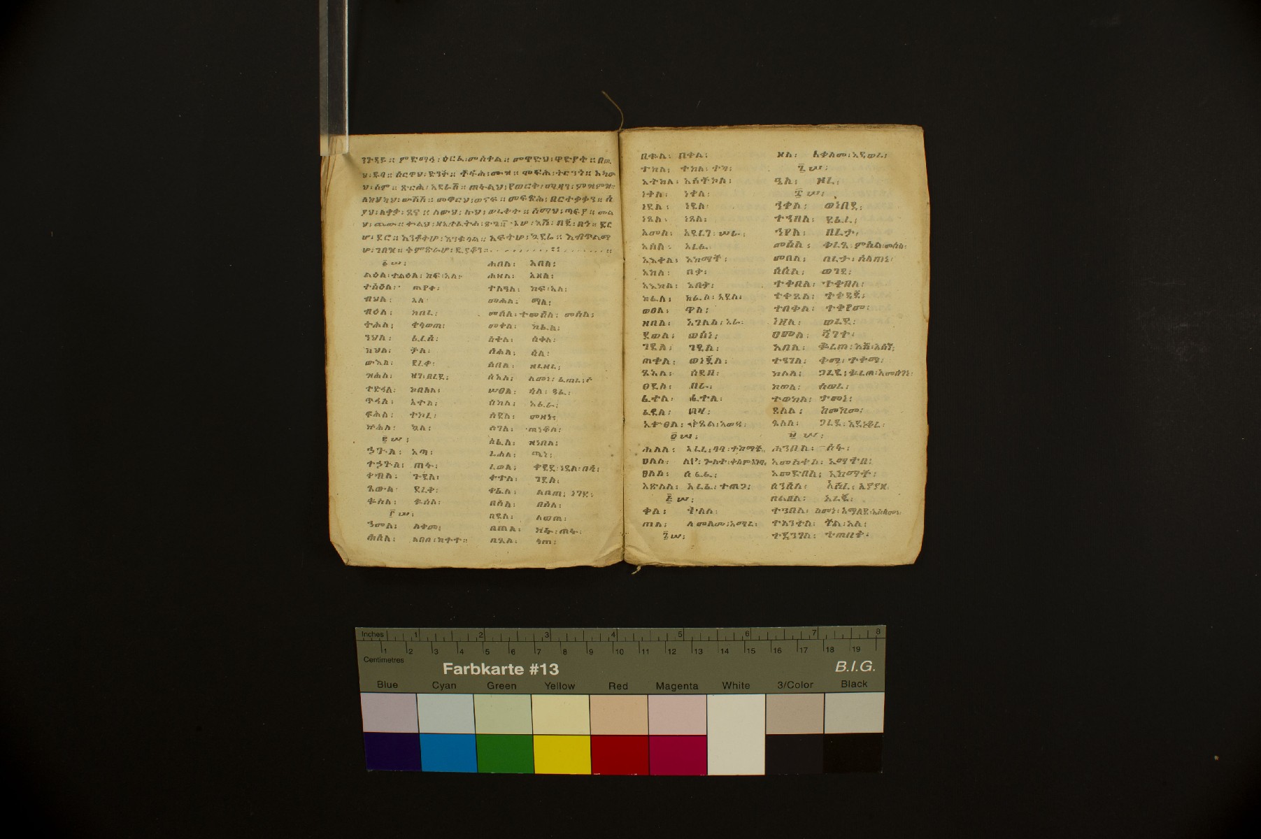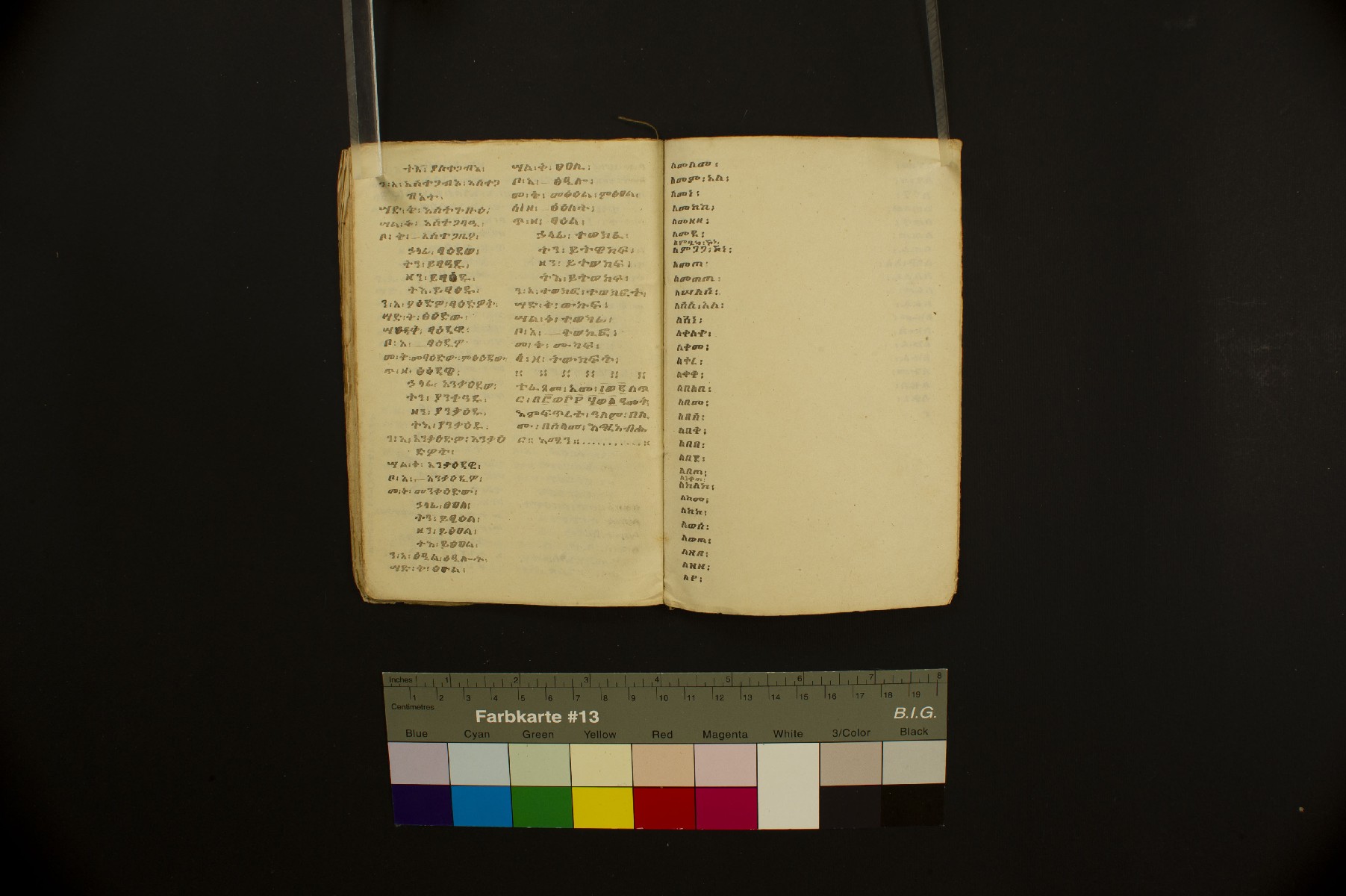 Ff. 2r–16va: Gǝʿǝz-Amharic vocabulary Incipit, in Amharic: ከሀ፡ እስከ፡ ኈ፡ ያለ፡ ግሥ፡ ኹሉ፡ ካዕብና፡ ሣልስ፡ ሲቀር፡ ባምስት፡ ፊደል፡ ይነሣል፡ በግዕዝ፡ ይጨረሳል። በዝርዝር፡ ጊዜ፡ ግን፡ ከኃምስ፡ በቀር፡ በ፮ፊደል፡ ይጨረሳል። ከ፯ፊደል፡ አይወጣም፡ ከ፪ፊደል፡ አይወርድም። The vocabulary is arranged in alphabetical order according to the last consonant of the root. Chapters are: ሀ/ሐ/ኀ (ff. 1ra–3v), ለ (ff. 3va–4vb), መ (ff. 4vb–5rb), ሠ/ሰ (ff. 5va–6rb), ረ (ff. 6rb–7va), ቀ (ff. 7va–8ra), በ (ff. 8ra–vb), ተ (ff. 8vb–9rb), ነ (ff. 9rb–vb), አ/ዐ (ff. 9vb–10vb), ከ (ff. 10vb–11ra), ወ (ff. 11ra–12rb), ዘ (ff. 12rb–va), የ (ff. 12va–14ra), ደ (ff. 14ra–vb), ገ (ff. 14vb–15ra), ጠ (ff. 15ra–rb), ጰ (ff. 15rb–va), ጸ/ፀ (ff. 15va–16ra), ፈ (ff. 16ra–rb), ኰ (f. 16rb), ጐ (f. 16rb), ቈ (ff. 16rb–va), ኈ (f. 16va). Each chapter is internally subdivided into sections indicated as ሠ(ርዌ፡) (“commander”) followed by a progressive number. The numbering is sometimes omitted. Verbs are listed on two columns: the first accommodates Gǝʿǝz entries, the second accommodates the corresponding meaning in Amharic. Chapter ሀ/ሐ/ኀ concludes with a wordlist of Gǝʿǝz nouns and their corresponding meanings in Amharic, written on one column. Ff. 16va–18vb: Treatise of Gǝʿǝz verbal morphology, in Amharic Incipit, in Amharic: ቀደሰ፡ ድርቡ፡ አንገለገ፡ ጥኅረ፡ ቀተለ፡ ኃሠሠ፡ ገብረ፡ ነደ፡ ሴመ፡ ቆመ፡ አእመረ። ከጥኅረ፡ ጀምሮ፡ እስከ፡ አእመረ፡ ካሉቱ፡ ሳቤ፡ ዘር፡ ይወፃል። አንከረ፡ ድርቡ፡ አድለቅለቀ፤ ዜነወ፡ ድርቡ፡ አንጌገየ። The short treatise begins with a list of the base forms of some sample verbs (ቀደሰ፡, አንገለገ፡, ቀተለ፡, ኃሠሰ፡, ገብረ፡, ነደ፡, ሴመ፡, ቆመ፡, አእመረ፡, etc.) and continues with their conjugations according to the Gǝʿǝz verbal tenses. Ff. 19r–21v: Wordlist of Amharic roots, incomplete. Entries are listed is in alphabetical order according to the first consonant of the root. They are not accompanied by their meaning. The wordlist is incomplete: it only includes consonants ለ (ff. 19r–20r), መ (ff. 20v–21r), and ሠ/ሰ (ff. 21r–v). |