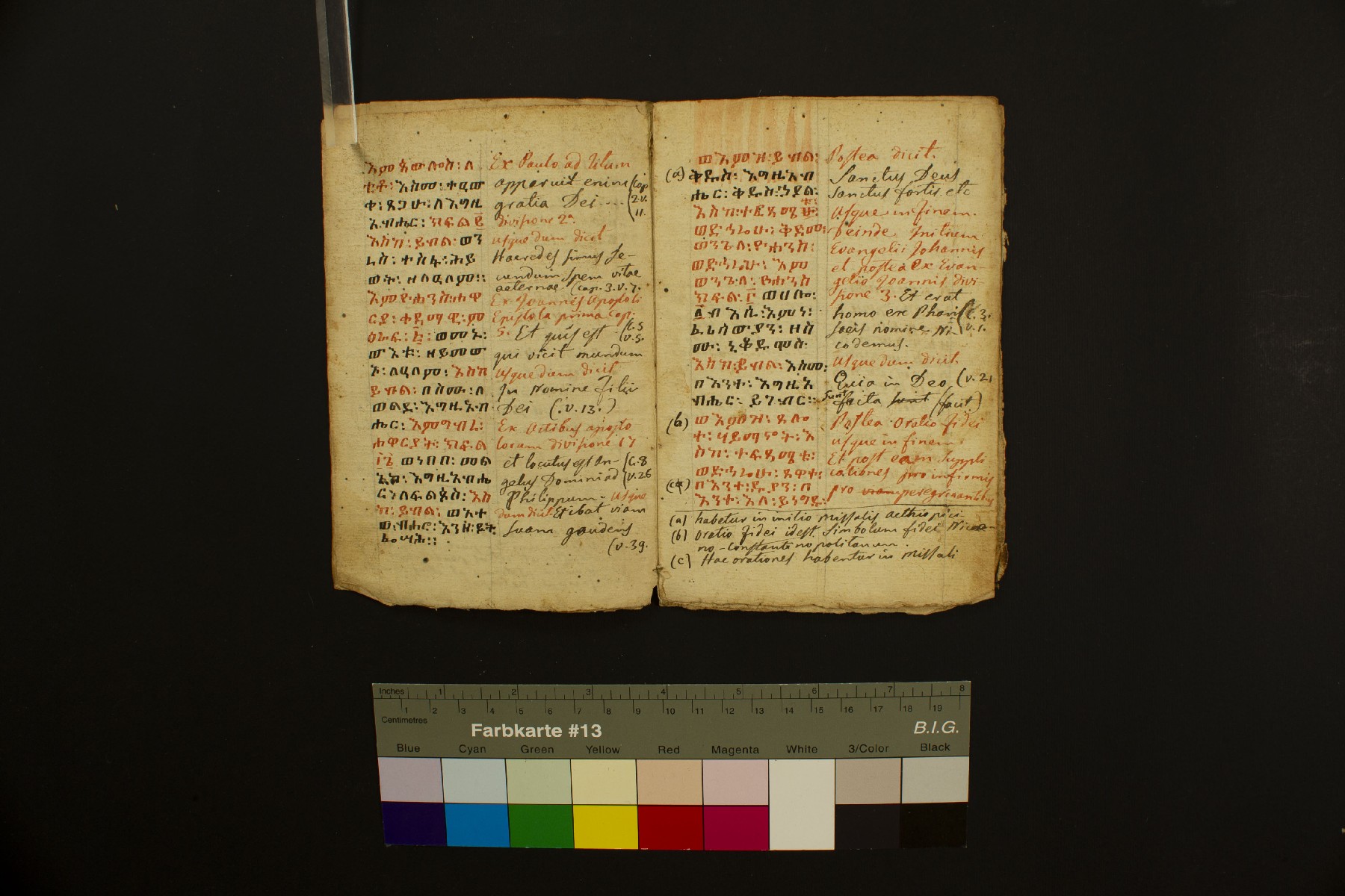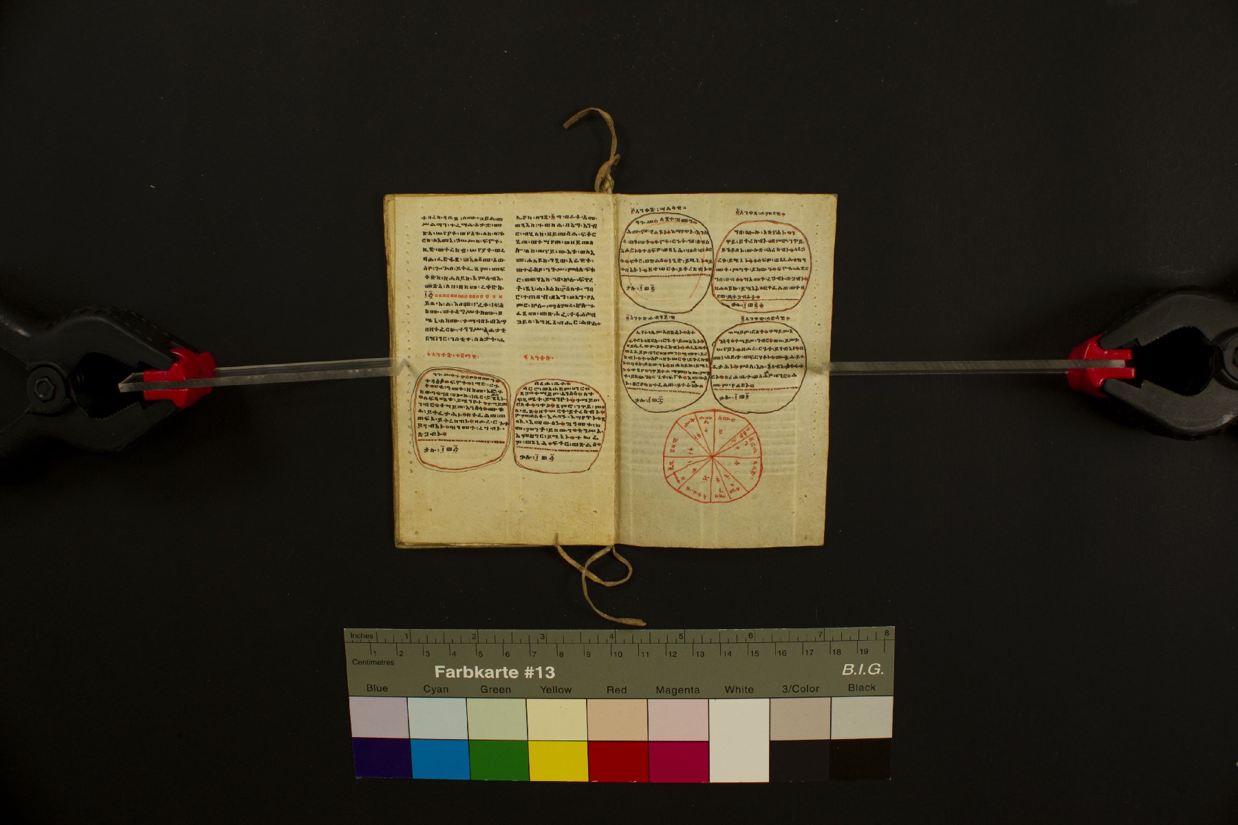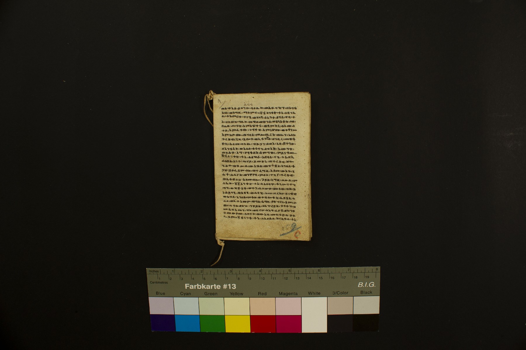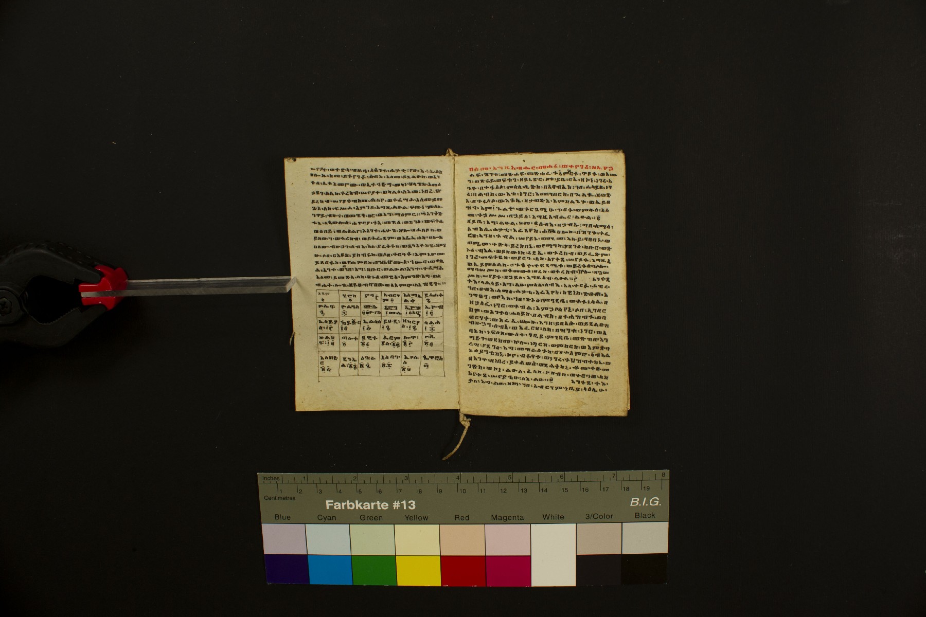 Ff. 1ra–6vb: Mäṣḥafä mäqdǝm käśate mǝśṭirat zäṬäsimos (sic) ṭäbib yonanawi (“Book of the introduction revealing the mysteries of Ptolemy the wise Greek”, or Liber de revelatione misteriorum). Incipit: በስመ፡ እግዚአብሔር፡ መሐሪ፡ ወመስተሣህል፡ ጸሐፍነ፡ ዘንተ፡ መጽሐፈ፡ መቅድም፡ ከሣቴ፡ ምሥጢራት፡ ዘጠሲሞስ፡ (!) ጠቢብ፡ ዮናናዊ፡ ላዕሌሁ፡ ሰላም፡ አሜን። አዕርኬ፡ ወለቡ፡ ኦብእሲ፡ ኃሣሤ፡ ዝንቱ፡ ምሥጢራት፡ ወእግዚአብሔር፡ ይክሥት፡ ለከ፡ Then follow 12 chapters, each entitled after one of the twelve ‘kings of the world’, i.e. one of the signs of the zodiac. Each chapter contains 34 numbered formulas for prediction called ḥatäta. The text is incomplete due to material loss: it ends up abruptly at ch. 11. Explicit: ፳፮ሐ፡ በዛቲ፡ እፎ፡ ዓመት፡ እፎ፡ ኩነታ፡ ብዙኃ፡ ሠናያቲሃ፡ ለዛቲ፡ ዓመት። ፳፯ሐ<፡> በጸኒሕ፡ ኀበ፡ ህላዌ፡ ኢይሬኒ፡ ሠናየ፡ ኅድግ። ፳፰ሐ<፡> በተንሥኦ፡ ተንሥ Ff. 7ra–8r: Unidentified divinatory text in 16 chapters. The text is incomplete, the beginning is missing due to material loss. Only the end of ch. 10 and chs 11–16 are preserved. Incipit: ዜናሁ፡ አመዝግኖ፡ ለእግ፡ ረከብከ፡ መፍቅድከ፡ ወትድኅን፡ እምእኩይ፡ ተፈሣሕ፡ ጥቀ። ፲፩ይቤ፡ እግ፡ ልዑ፡ ኦሆ፡ ኢትበሎ፡ ለፀርከ፡ ጽናሕ፡ ከማሁ፡ ተዓገሥ፡ ኦሐታቲ፡ ኢሠነየ፡ ኮከብከ፡ ወእመ፡ ፈቅድከ፡ The text is followed on ff. 7v–8r by seven circular diagrams: six are in black and red ink and contain writings in the main hand. The seventh diagram is in red ink and is divided into 12 sections, each numbered and titled after one of the zodiacal signs. Ff.8va–b; 1ra: Unidentified divinatory text in 12 chapters (anqäṣ). Each chapter is entitled after one of the signs of the zodiac. The conclusion follows on f. 1ra (the original sequence of the textblock is perturbed). Incipit (f. 8va): ፩አንቀጽ፡ ሐመል፡ አሳታዊ፡ በግዕ፡ አሰአሌ፡ ኢትኅድጎ፡ ለጣዖሰ፡ ዖፍ፡ ውእቱ፡ ይነግረከ። ፪አንቀ<፡> ተወር፡ መሬታዊ፡ ብዕራይ<፡> አኃሣሤ፡ ዜና፡ ኢትኅድጎ፡ ለዖፈ፡ አልኢታብ፡ ውእ፡ ይነ። |