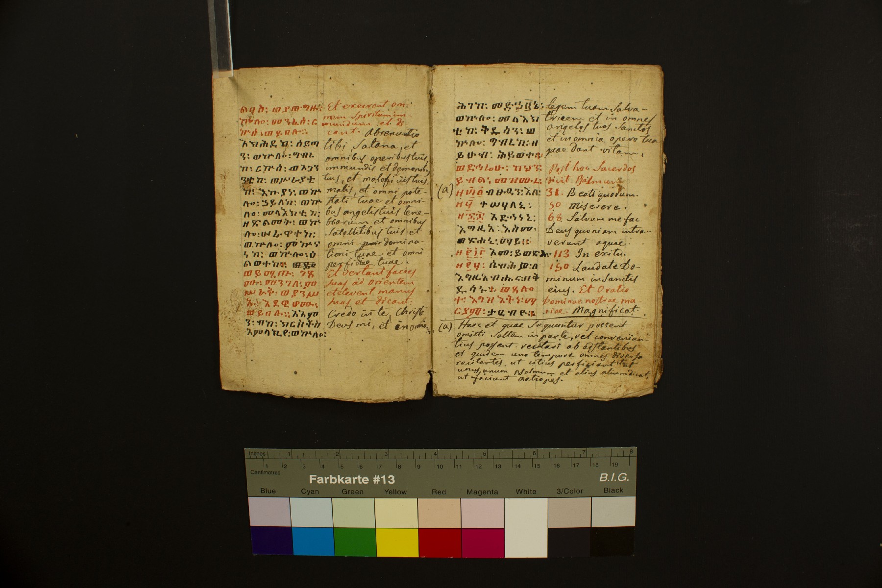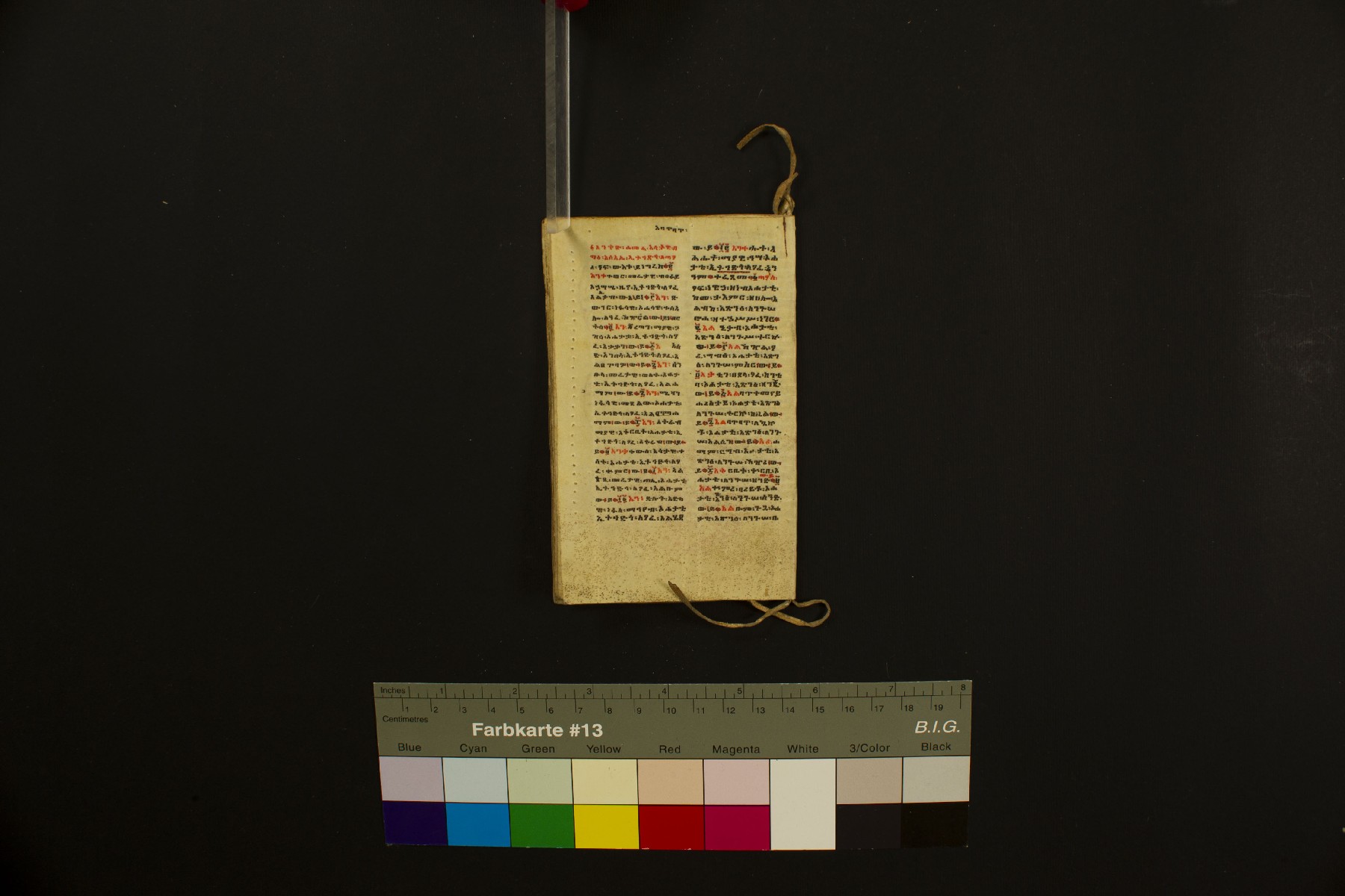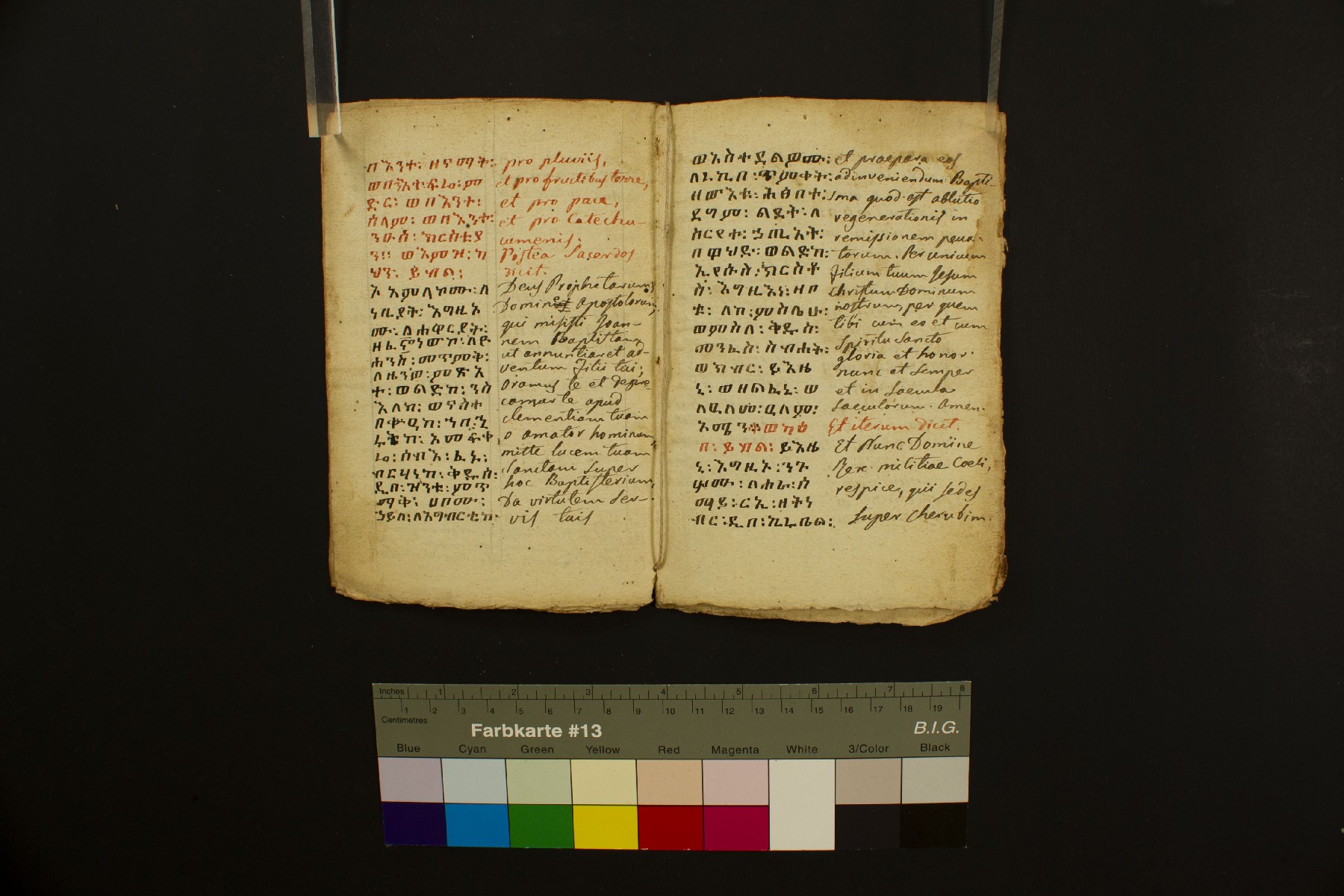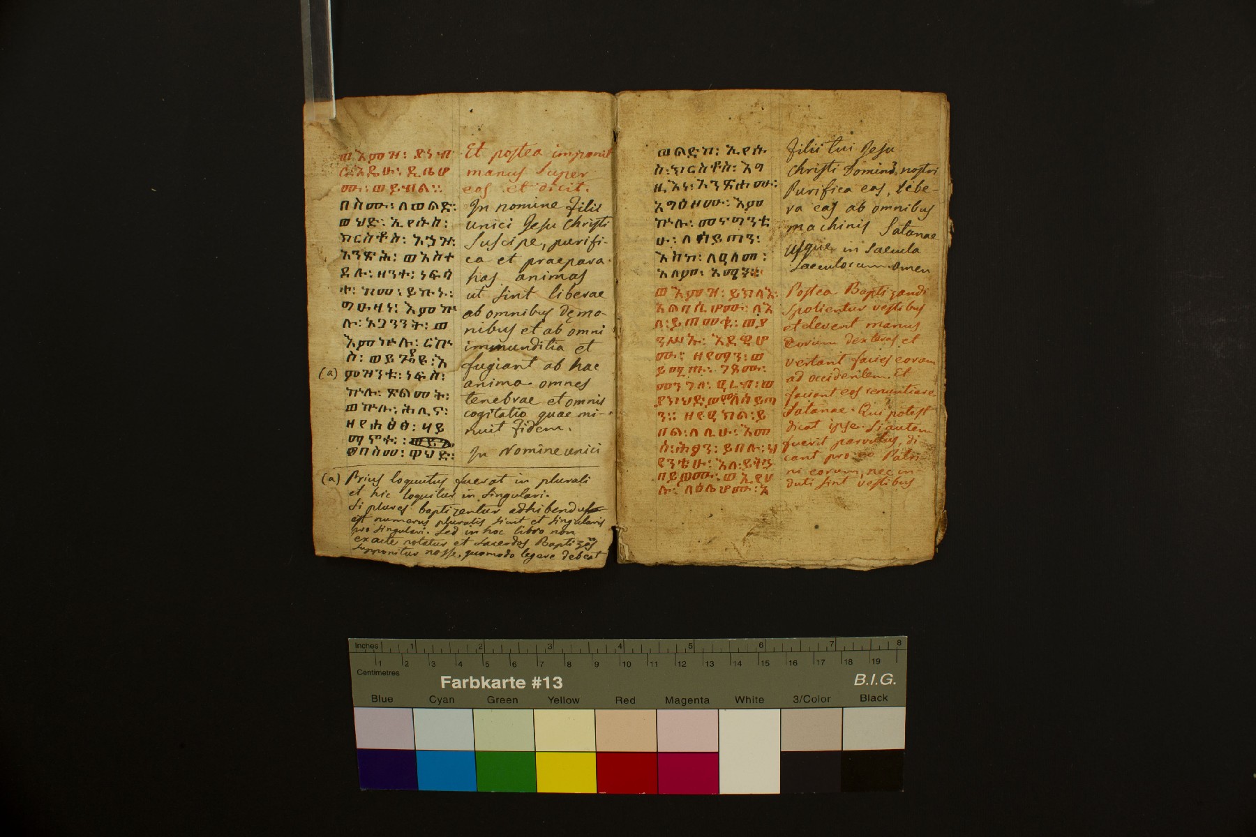 Ff. 1ra–6vb: Mäṣḥafä mäqdǝm käśate mǝśṭirat zäṬäsimos (sic) ṭäbib yonanawi (“Book of the introduction revealing the mysteries of Ptolemy the wise Greek”, or Liber de revelatione misteriorum). Incipit: በስመ፡ እግዚአብሔር፡ መሐሪ፡ ወመስተሣህል፡ ጸሐፍነ፡ ዘንተ፡ መጽሐፈ፡ መቅድም፡ ከሣቴ፡ ምሥጢራት፡ ዘጠሲሞስ፡ (!) ጠቢብ፡ ዮናናዊ፡ ላዕሌሁ፡ ሰላም፡ አሜን። አዕርኬ፡ ወለቡ፡ ኦብእሲ፡ ኃሣሤ፡ ዝንቱ፡ ምሥጢራት፡ ወእግዚአብሔር፡ ይክሥት፡ ለከ፡ Then follow 12 chapters, each entitled after one of the twelve ‘kings of the world’, i.e. one of the signs of the zodiac. Each chapter contains 34 numbered formulas for prediction called ḥatäta. The text is incomplete due to material loss: it ends up abruptly at ch. 11. Explicit: ፳፮ሐ፡ በዛቲ፡ እፎ፡ ዓመት፡ እፎ፡ ኩነታ፡ ብዙኃ፡ ሠናያቲሃ፡ ለዛቲ፡ ዓመት። ፳፯ሐ<፡> በጸኒሕ፡ ኀበ፡ ህላዌ፡ ኢይሬኒ፡ ሠናየ፡ ኅድግ። ፳፰ሐ<፡> በተንሥኦ፡ ተንሥ Ff. 7ra–8r: Unidentified divinatory text in 16 chapters. The text is incomplete, the beginning is missing due to material loss. Only the end of ch. 10 and chs 11–16 are preserved. Incipit: ዜናሁ፡ አመዝግኖ፡ ለእግ፡ ረከብከ፡ መፍቅድከ፡ ወትድኅን፡ እምእኩይ፡ ተፈሣሕ፡ ጥቀ። ፲፩ይቤ፡ እግ፡ ልዑ፡ ኦሆ፡ ኢትበሎ፡ ለፀርከ፡ ጽናሕ፡ ከማሁ፡ ተዓገሥ፡ ኦሐታቲ፡ ኢሠነየ፡ ኮከብከ፡ ወእመ፡ ፈቅድከ፡ The text is followed on ff. 7v–8r by seven circular diagrams: six are in black and red ink and contain writings in the main hand. The seventh diagram is in red ink and is divided into 12 sections, each numbered and titled after one of the zodiacal signs. Ff.8va–b; 1ra: Unidentified divinatory text in 12 chapters (anqäṣ). Each chapter is entitled after one of the signs of the zodiac. The conclusion follows on f. 1ra (the original sequence of the textblock is perturbed). Incipit (f. 8va): ፩አንቀጽ፡ ሐመል፡ አሳታዊ፡ በግዕ፡ አሰአሌ፡ ኢትኅድጎ፡ ለጣዖሰ፡ ዖፍ፡ ውእቱ፡ ይነግረከ። ፪አንቀ<፡> ተወር፡ መሬታዊ፡ ብዕራይ<፡> አኃሣሤ፡ ዜና፡ ኢትኅድጎ፡ ለዖፈ፡ አልኢታብ፡ ውእ፡ ይነ። |