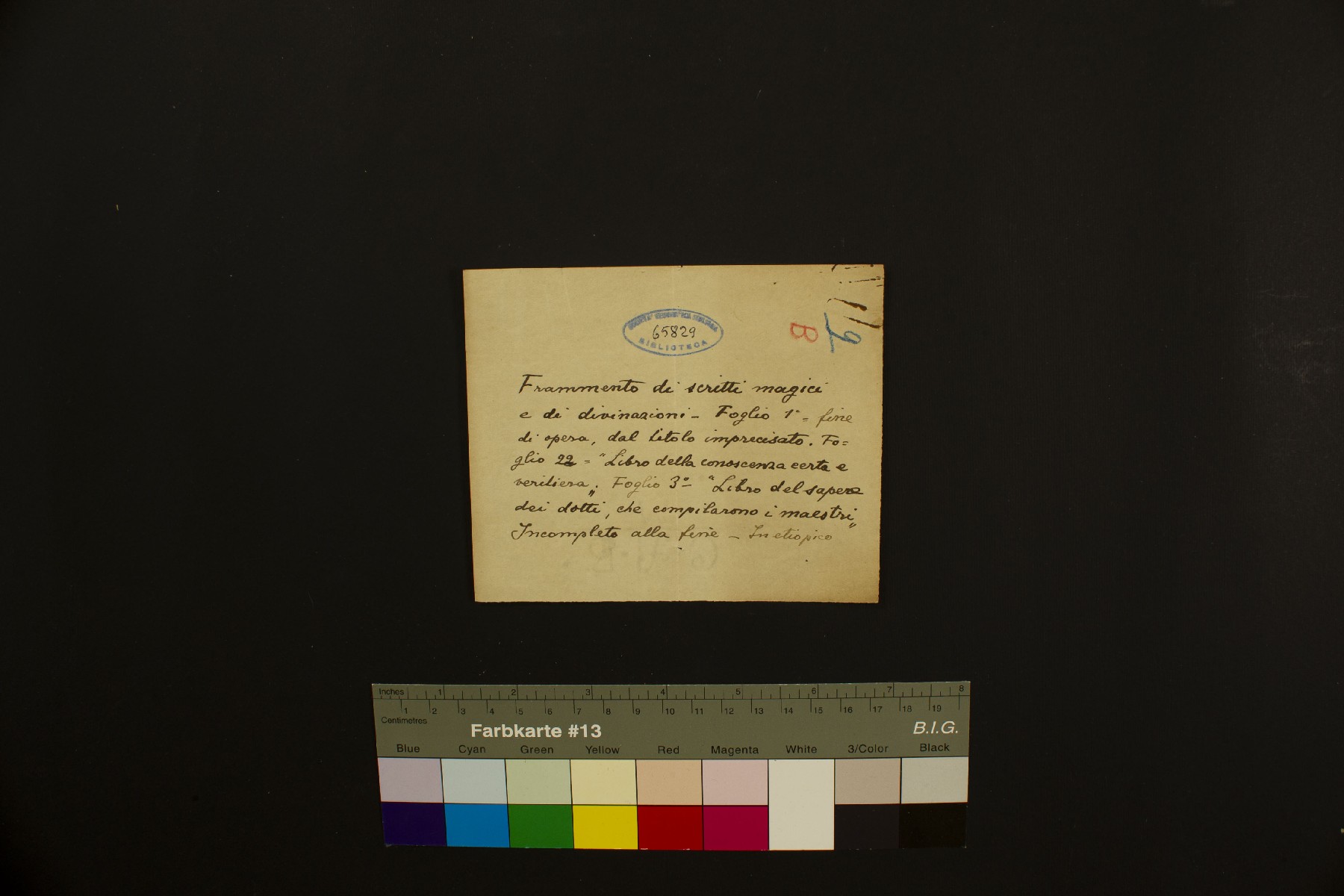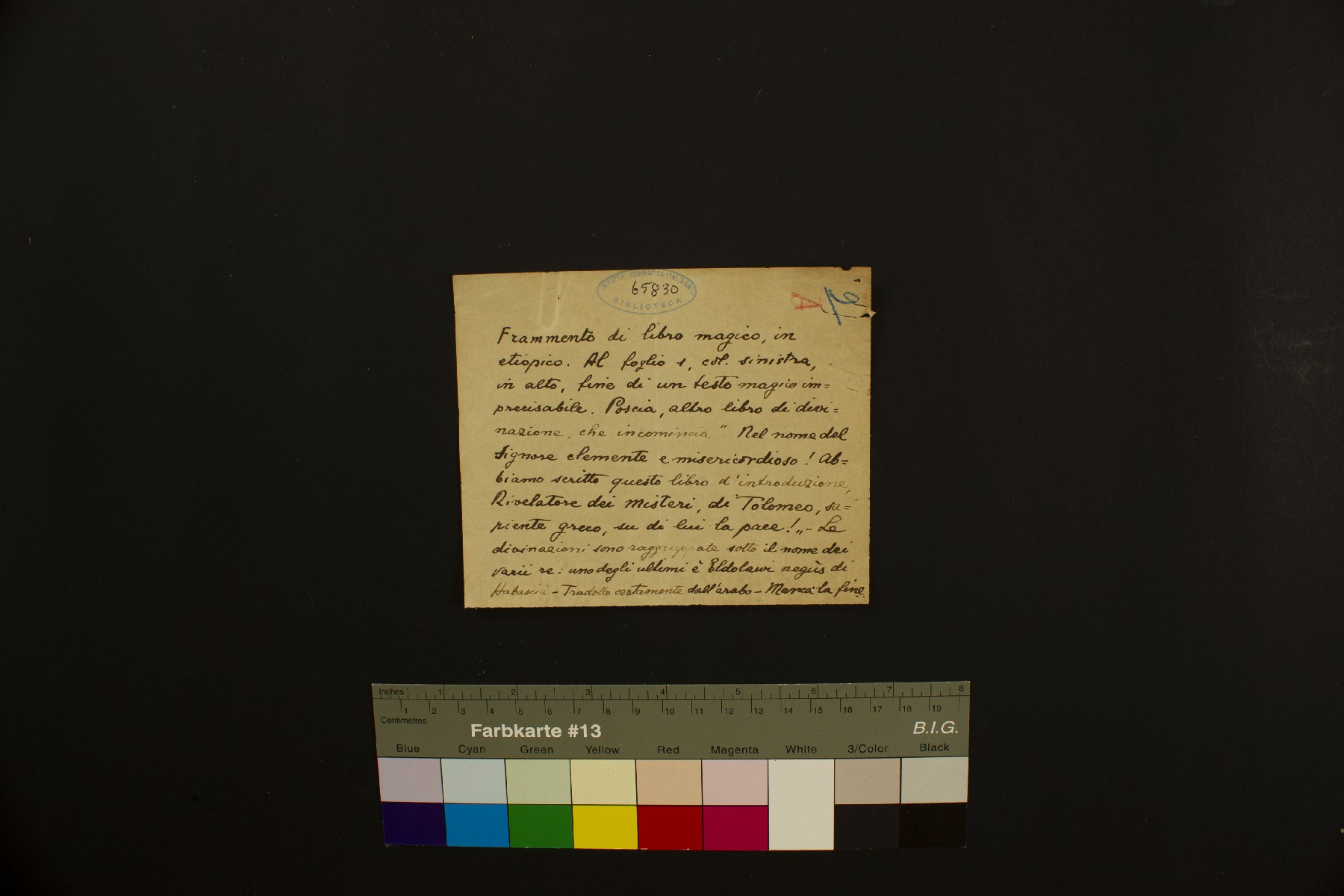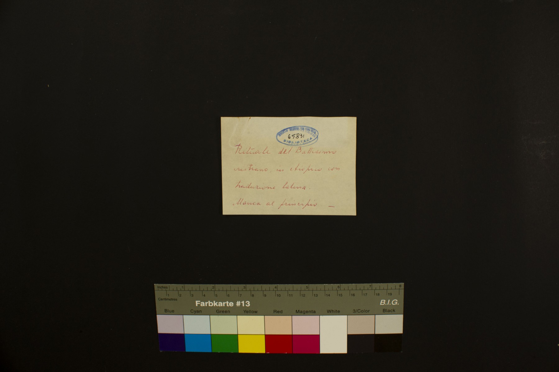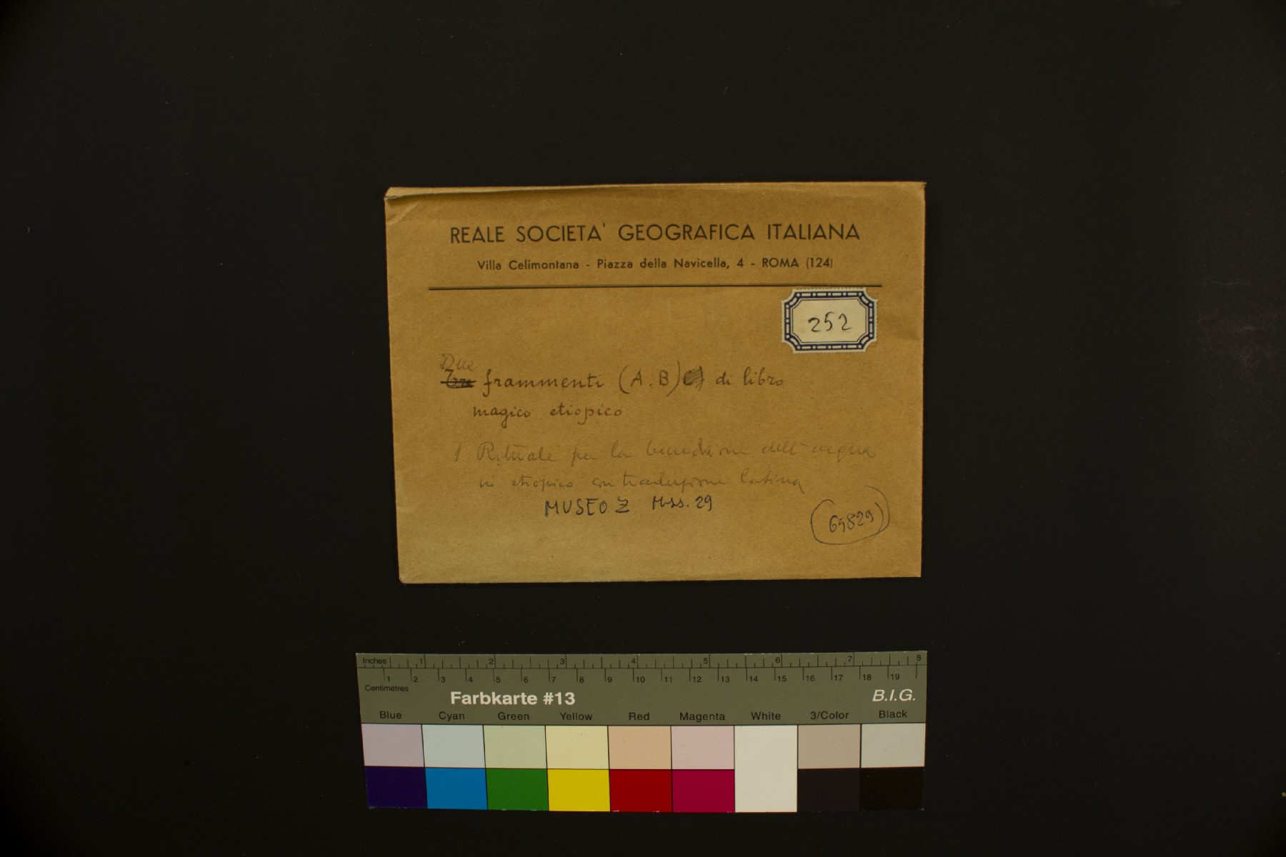 The item consists of three separate units, here labelled SGI 252.1, SGI 252.2, and SGI 252.6 (the last unit is indicated as 6). The three units are kept in a large envelope of the Reale Società Geografica Italiana, bearing the following inscription written in Italian in black pen: “Tre Due frammenti (A, B), C) di libro magico etiopico”. The following title has also been added in pencil: “1 Rituale per la benedizione dell’acqua in etiopico con traduzione latina”. The envelope also contains a small-size sheet, referring to unit SGI 252.6, with the title written in Italian in red: “Rituale del Battesimo cristiano, in etiopico con traduzione Latina. Manca al principio”.