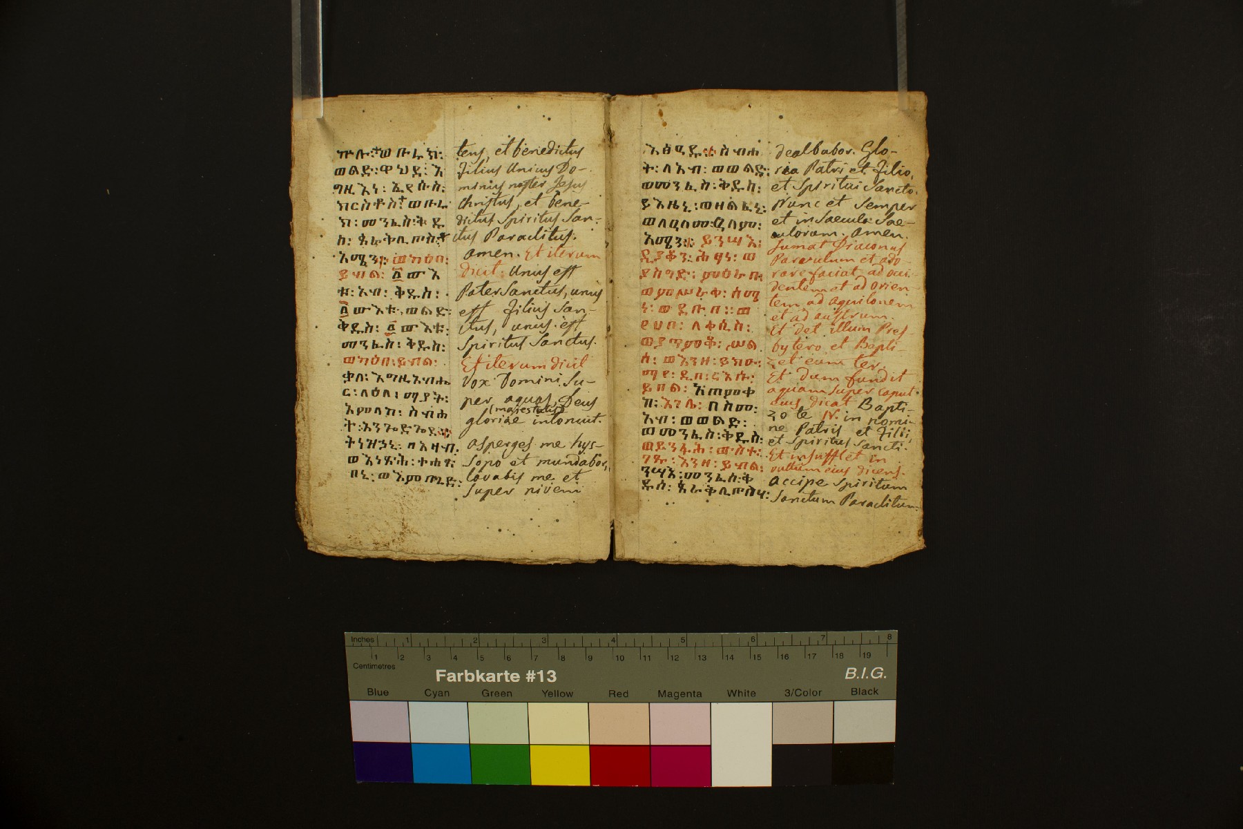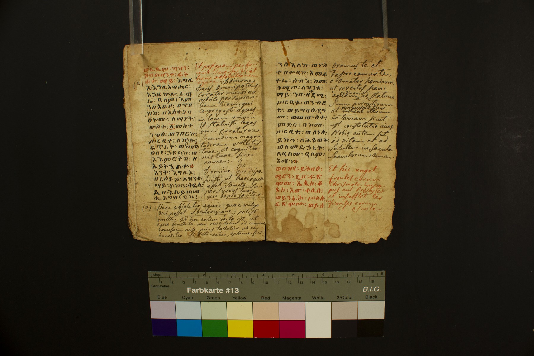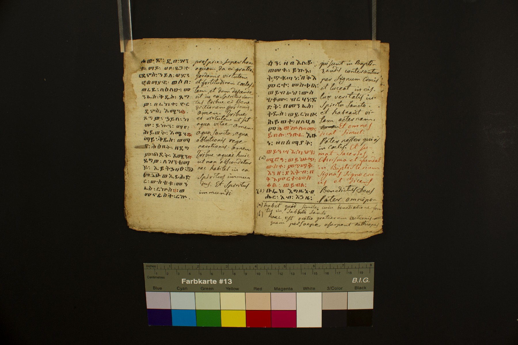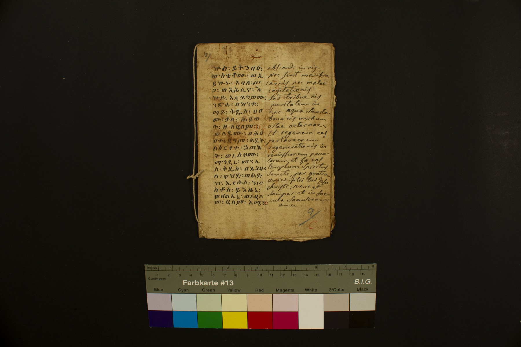 Ff. 1ra–7vb: Excerpt from the Mäṣḥafä krǝstǝnna (“Book of the Christening”), with Latin translation on the right column. The text is incomplete, the beginning is missing due to material loss. Incipit: ኵዕ፡ ይትኃባዕ፡ ውስቴቶሙ፡ ወኢይኩኑ፡ አባለ፡ ሥጋ፡ ወኢሕሊና፡ እኩይ፡ አላ፡ ጸግዎሙ፡ ንጽሐ፡ በዝንቱ፡ ማይ፡ ቅዱስ፡ ሀቦሙ፡ ቃለ፡ ሕይወት፡ ዘለዓለም። ወለዶሙ፡ በሕፅበተ፡ ዳግም፡ ልደት፡ ለስርየተ፡ |