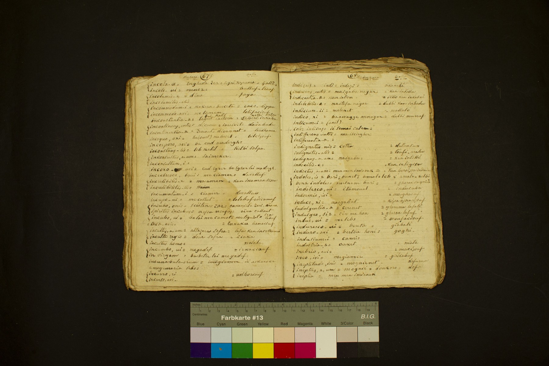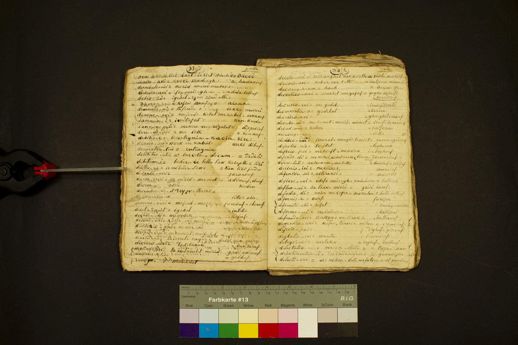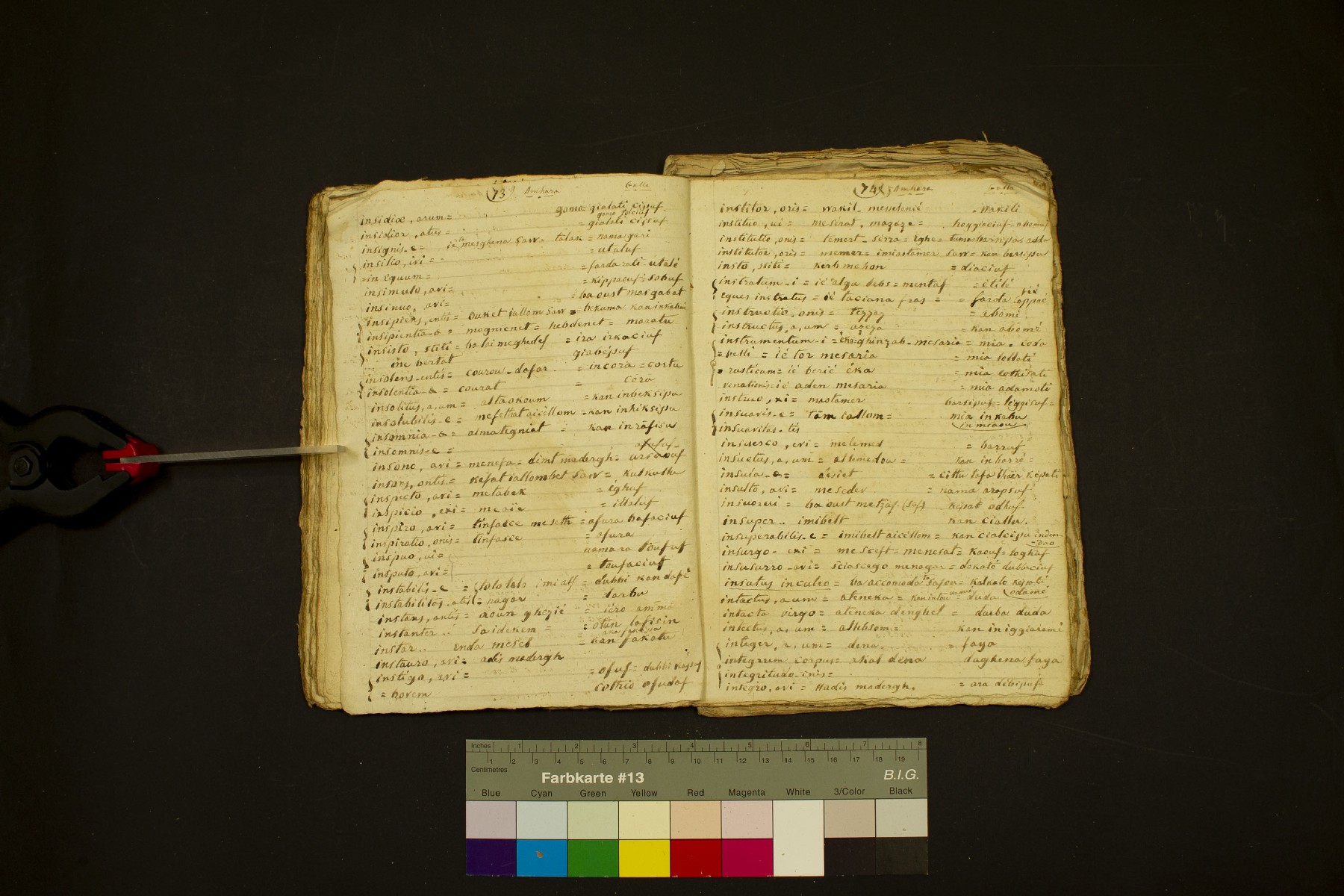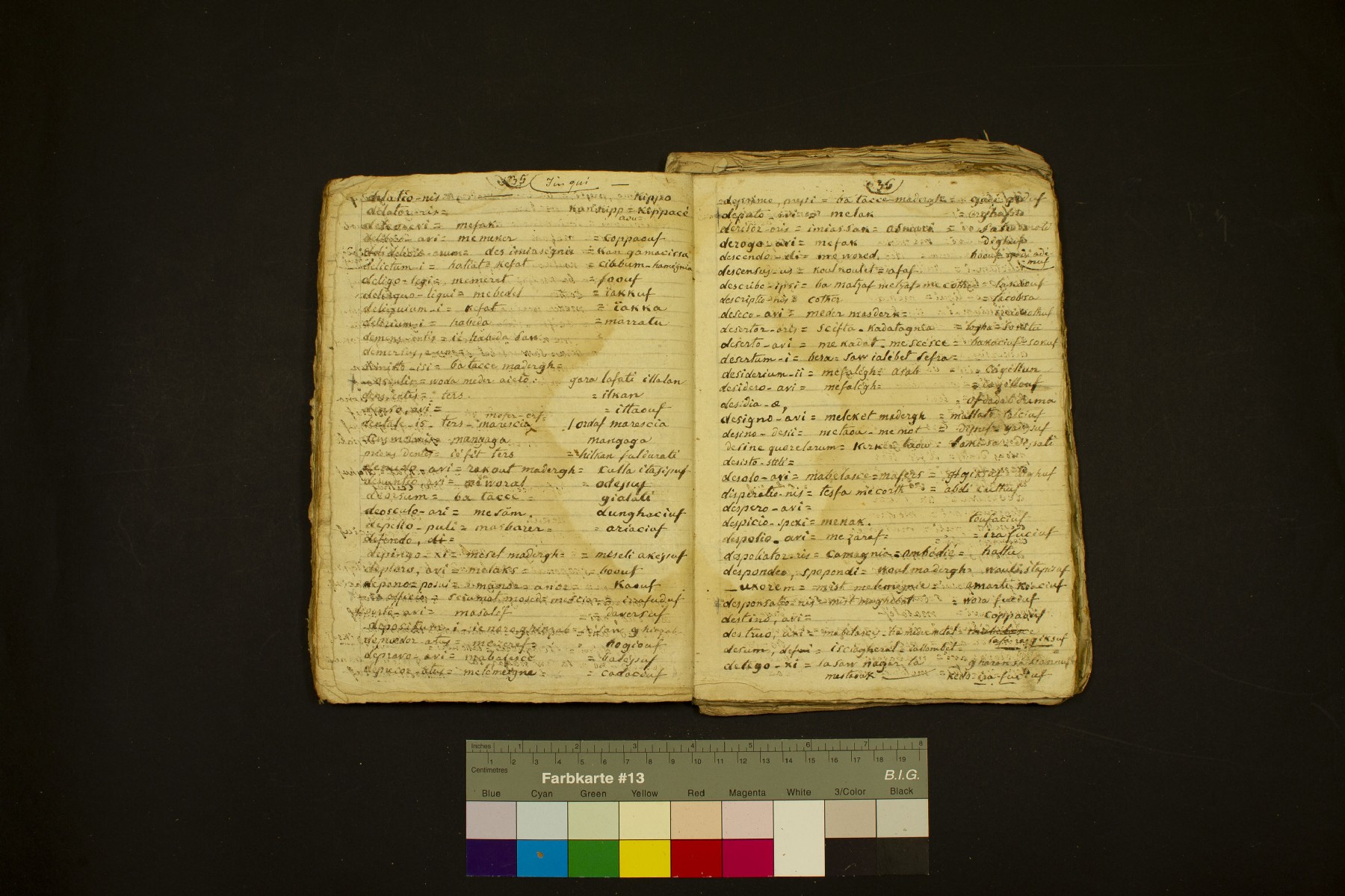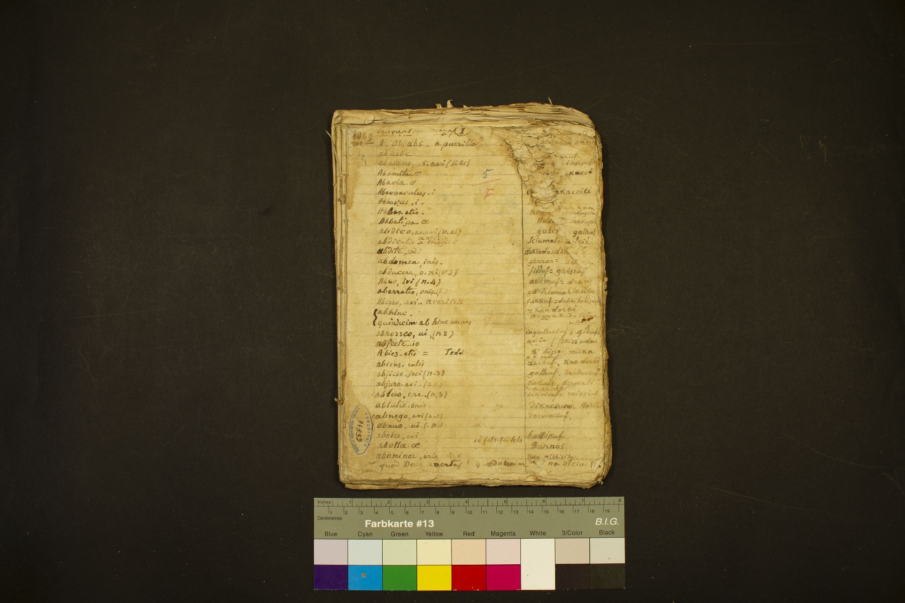 Ff. 1r–75v: Latin-Amharic-Oromo vocabulary, incomplete. The vocabulary is arranged on three irregular columns. The first column accommodates an alphabetical list of Latin words. The second and the third columns accommodate the corresponding meanings in Amharic and Oromo, transcribed in Latin script. On ff. 47v–48v a fourth column has been added with a few counterparts in Sidamo. Languages are indicated on the top of the column; the Oromo wordlist is marked mostly as “Galla” (ff. 7v, 9v–10v, 13v–18r, etc.), sometimes as “Oromo” (ff. 3v, 6v–7r), and occasionally as both (ff. 8v–9r). A large number of Latin entries have no Amharic, Oromo or Sidamo counterpart. Sections are indicated on the top of the page: A (f. 1r), B (f. 6v), C (f. 8r), D (f. 17v), E (f. 21v), F (f. 24r), G (f. 28r), H (f. 30r), I (f. 32r), L (f. 42v), M (f. 47v), N (f. 56v), O (f. 61r), P (f. 66r). The vocabulary is incomplete: it stops abruptly on f. 75v with the word “procurro – curri”. The year of composition of the lexicon has been added in the upper inner corner of f. 1: “1865”. The reading is uncertain due to ink partially faded out. |