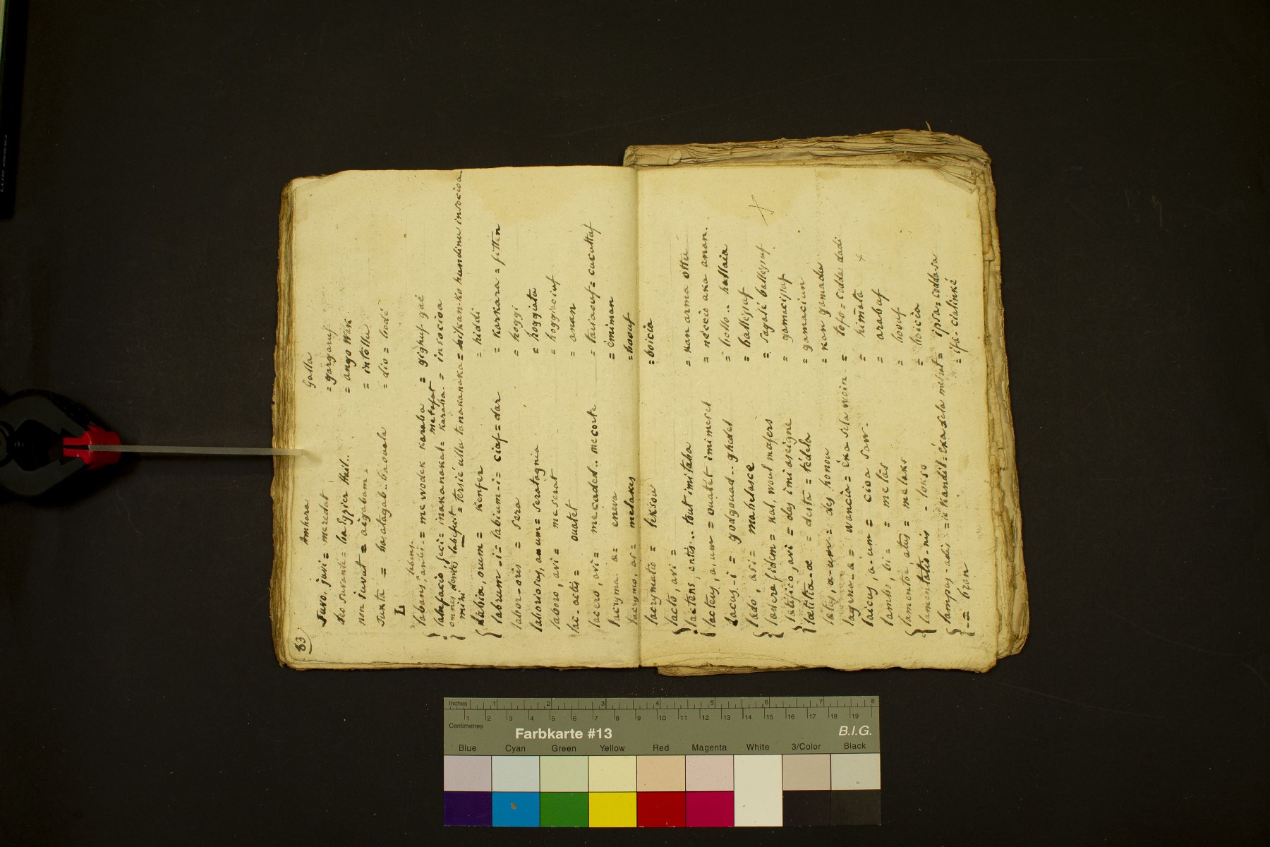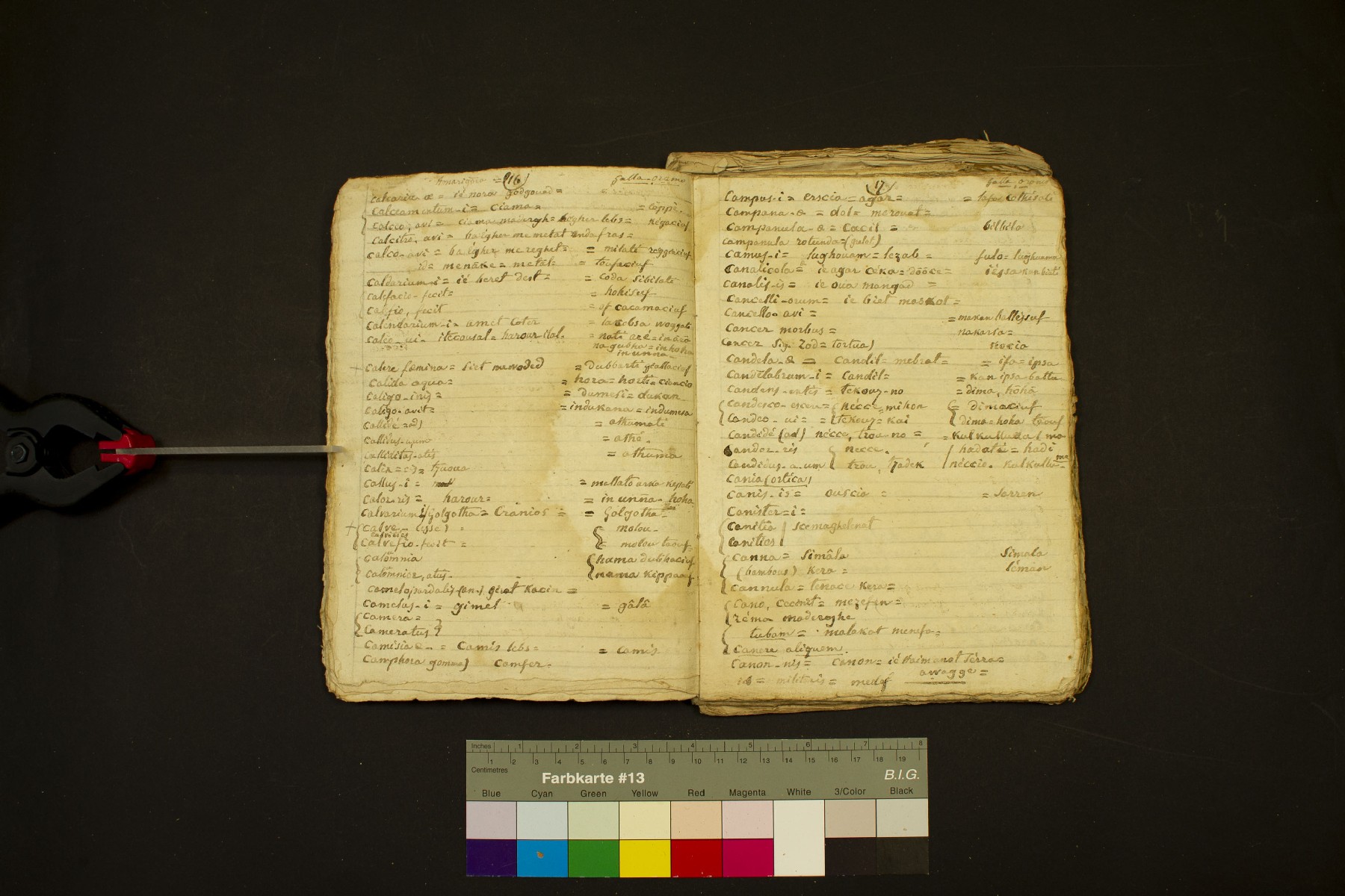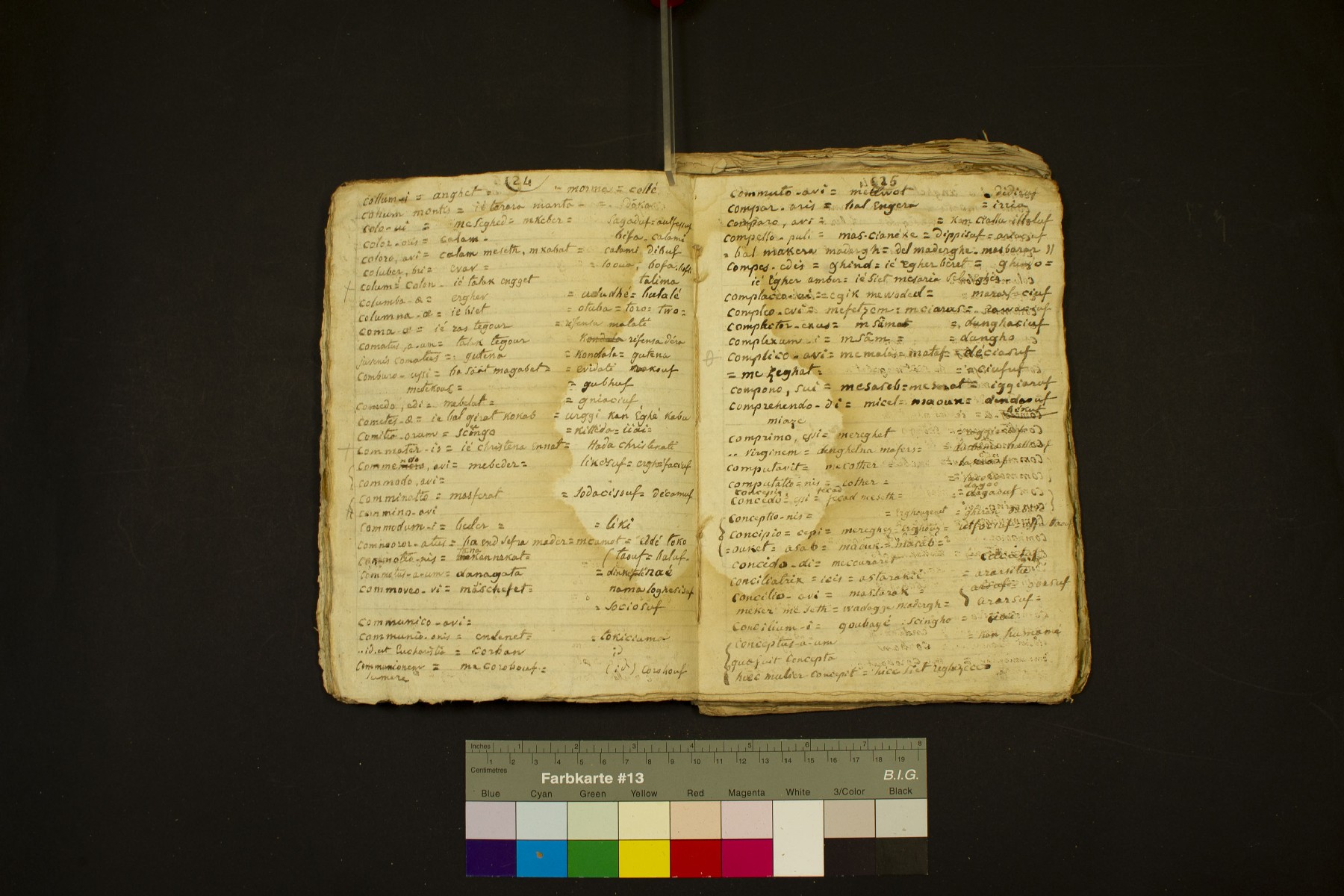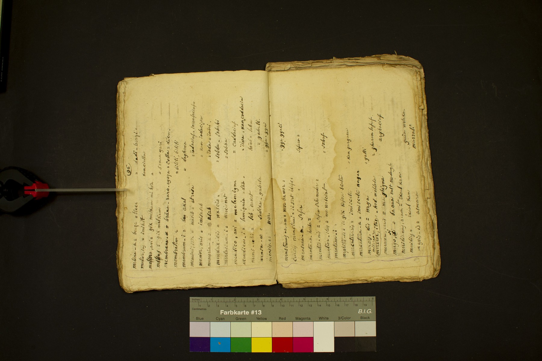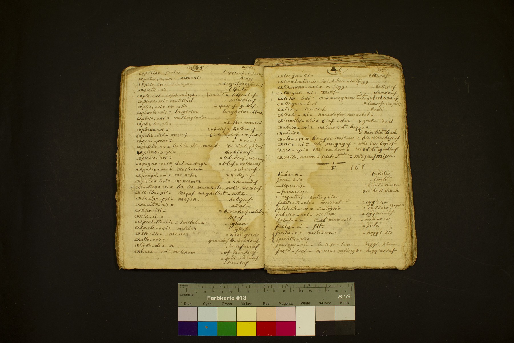 Ff. 1r–75v: Latin-Amharic-Oromo vocabulary, incomplete. The vocabulary is arranged on three irregular columns. The first column accommodates an alphabetical list of Latin words. The second and the third columns accommodate the corresponding meanings in Amharic and Oromo, transcribed in Latin script. On ff. 47v–48v a fourth column has been added with a few counterparts in Sidamo. Languages are indicated on the top of the column; the Oromo wordlist is marked mostly as “Galla” (ff. 7v, 9v–10v, 13v–18r, etc.), sometimes as “Oromo” (ff. 3v, 6v–7r), and occasionally as both (ff. 8v–9r). A large number of Latin entries have no Amharic, Oromo or Sidamo counterpart. Sections are indicated on the top of the page: A (f. 1r), B (f. 6v), C (f. 8r), D (f. 17v), E (f. 21v), F (f. 24r), G (f. 28r), H (f. 30r), I (f. 32r), L (f. 42v), M (f. 47v), N (f. 56v), O (f. 61r), P (f. 66r). The vocabulary is incomplete: it stops abruptly on f. 75v with the word “procurro – curri”. The year of composition of the lexicon has been added in the upper inner corner of f. 1: “1865”. The reading is uncertain due to ink partially faded out. |