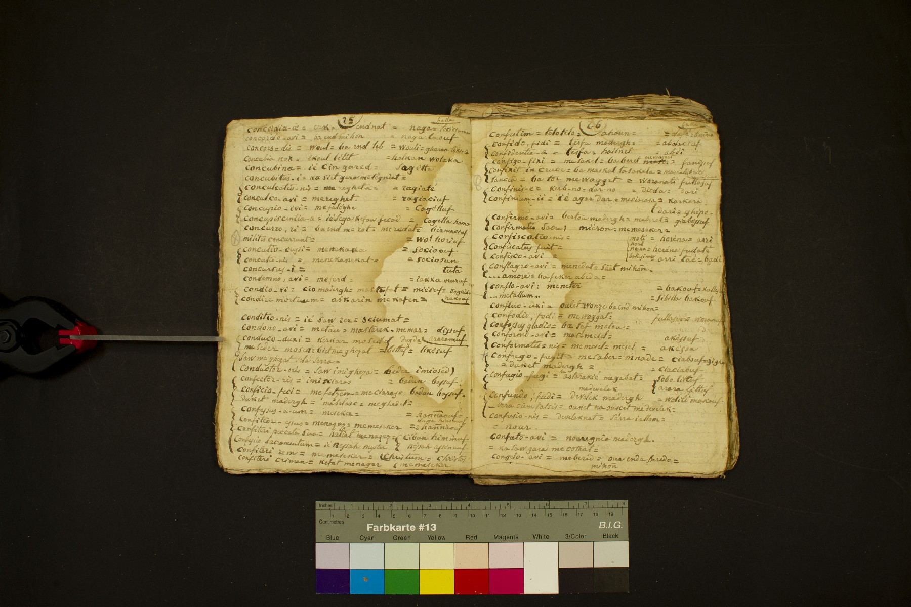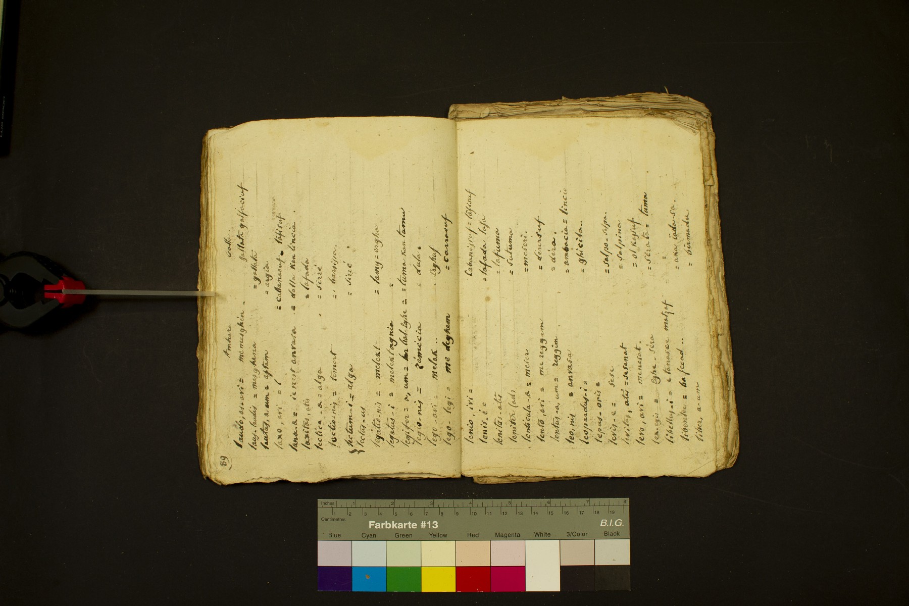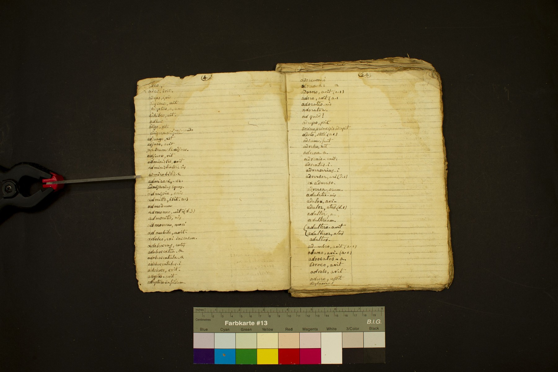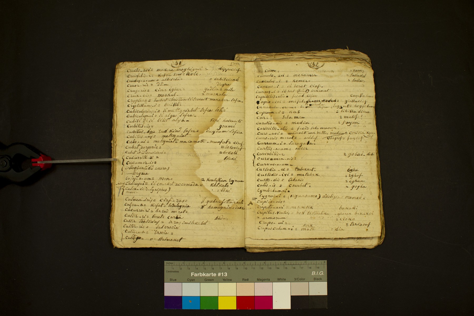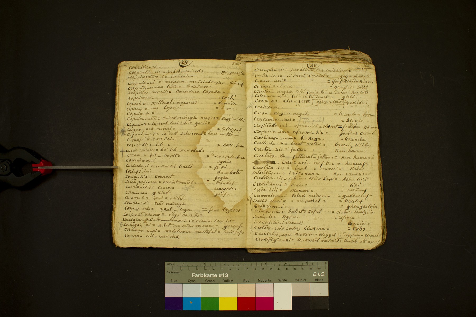 Ff. 1r–75v: Latin-Amharic-Oromo vocabulary, incomplete. The vocabulary is arranged on three irregular columns. The first column accommodates an alphabetical list of Latin words. The second and the third columns accommodate the corresponding meanings in Amharic and Oromo, transcribed in Latin script. On ff. 47v–48v a fourth column has been added with a few counterparts in Sidamo. Languages are indicated on the top of the column; the Oromo wordlist is marked mostly as “Galla” (ff. 7v, 9v–10v, 13v–18r, etc.), sometimes as “Oromo” (ff. 3v, 6v–7r), and occasionally as both (ff. 8v–9r). A large number of Latin entries have no Amharic, Oromo or Sidamo counterpart. Sections are indicated on the top of the page: A (f. 1r), B (f. 6v), C (f. 8r), D (f. 17v), E (f. 21v), F (f. 24r), G (f. 28r), H (f. 30r), I (f. 32r), L (f. 42v), M (f. 47v), N (f. 56v), O (f. 61r), P (f. 66r). The vocabulary is incomplete: it stops abruptly on f. 75v with the word “procurro – curri”. The year of composition of the lexicon has been added in the upper inner corner of f. 1: “1865”. The reading is uncertain due to ink partially faded out. |