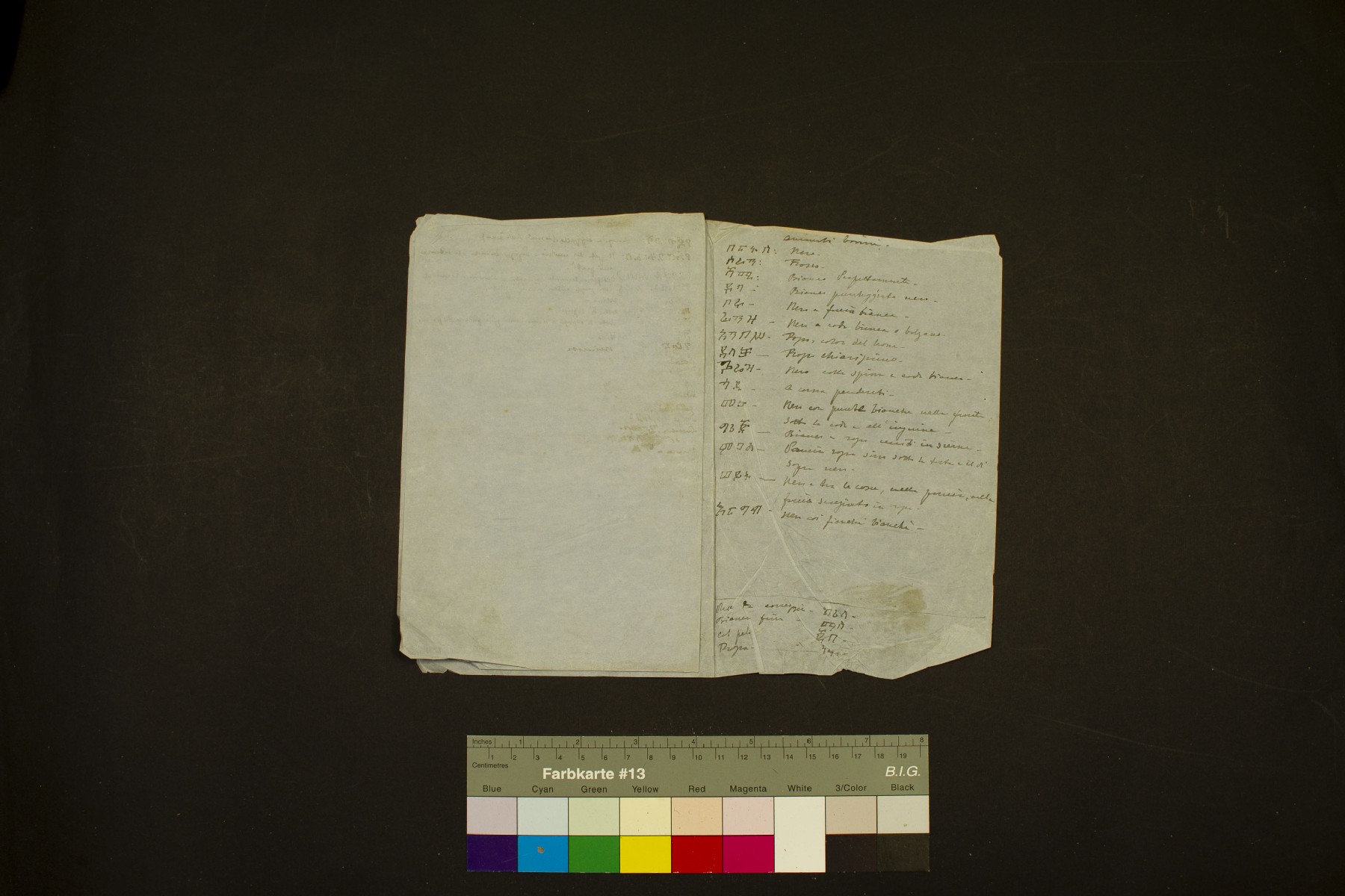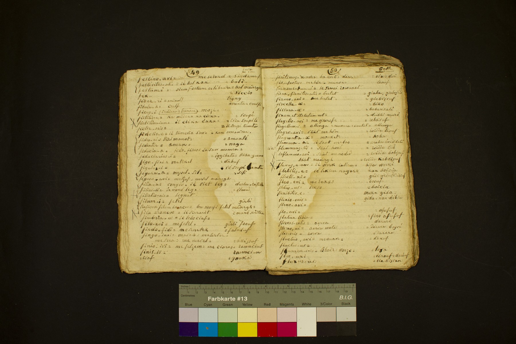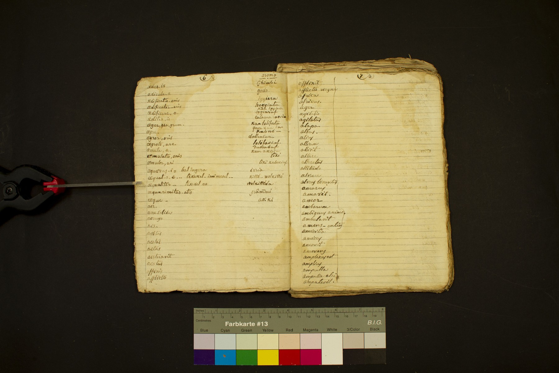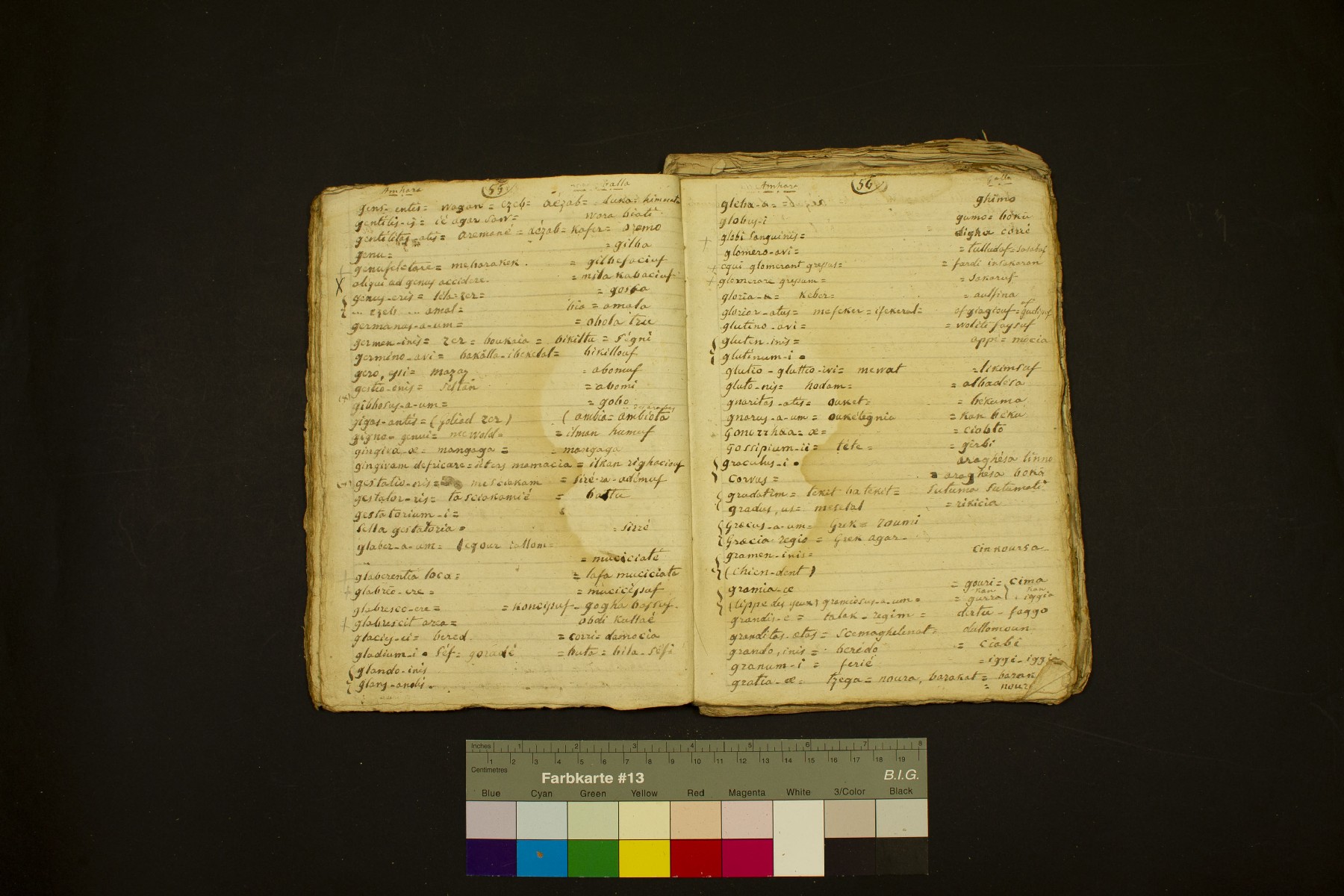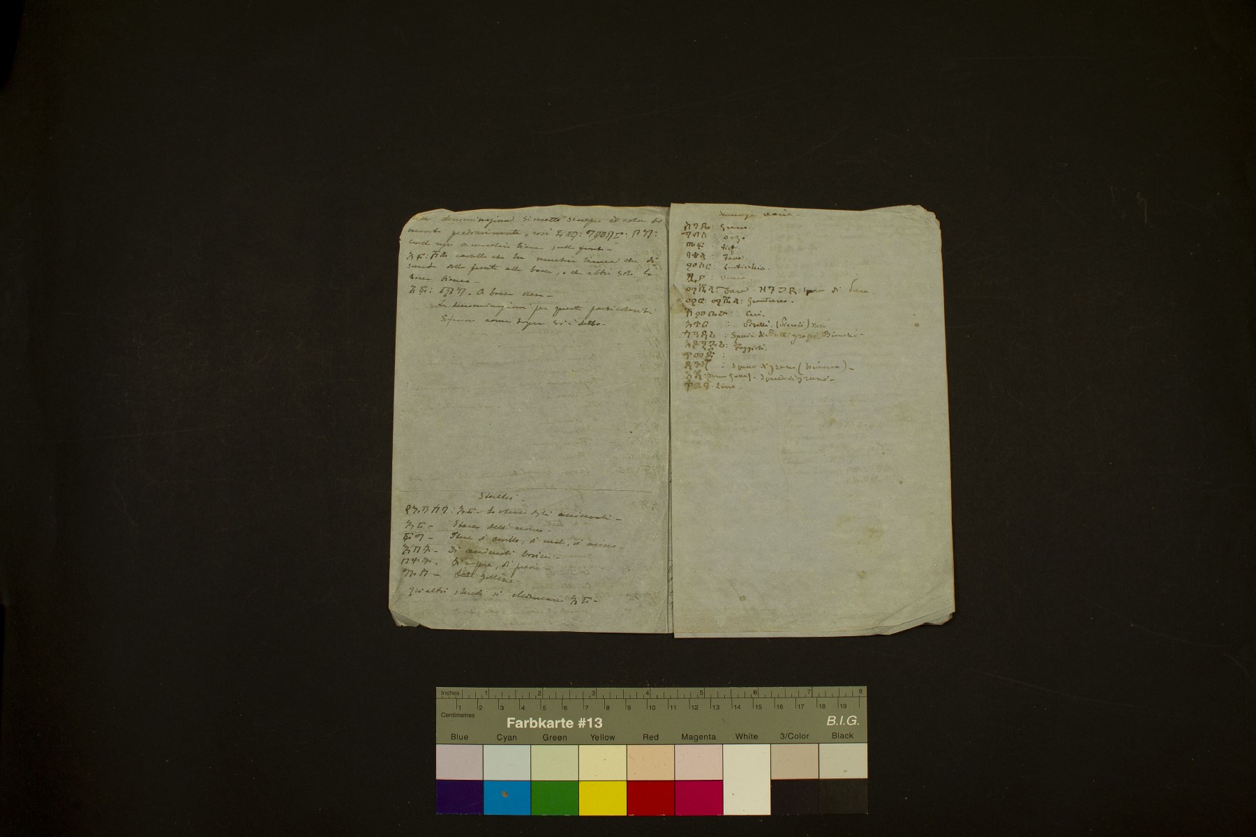 Quire 2 consists of three medium-size paper bifolia folded one inside the other without binding, for a total amount of 6 folia. The quire contains various Amharic wordlists written in fidäl on one or two columns (f. 3r–v is written on two columns). Each entry is accompanied by the respective meaning in Italian. The entire text is written in pale black ink, in all likelihood by Léon des Avanchers. All leaves are unruled. F. 1r: “Dei nomi degli animali domestici considerati nel loro mondo” (“About the names of the domestic animals considered in their world”). F. 1v: “Sterchi” (“Animal droppings”). F. 2r: “Semenze varie” (“Various seeds”). F. 3ra: “Insetti” (“Insects”); “Rettili” (“Reptiles”); F. 3rb: “Volatili” (“Birds”); Acquatici (“Aquatic animals”). F. 3va: untitled but contains words for kinship. F. 3vb: “Scimmie” (“Monkeys”). F. 4r: “Quadrupedi” (“Four-legged animals”). F. 5r: “Piante” (“Plants”). F. 6r: “Animali bovini” (“Bovine animals”). Ff. 2v, 4v, 5v, 6v are blank.