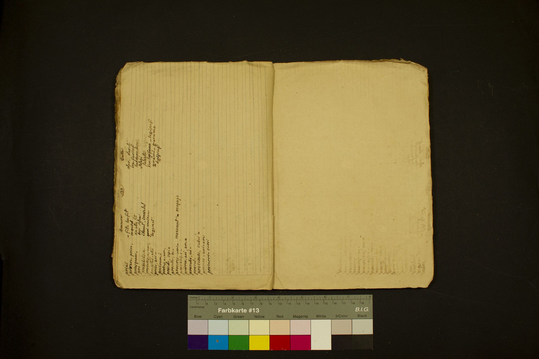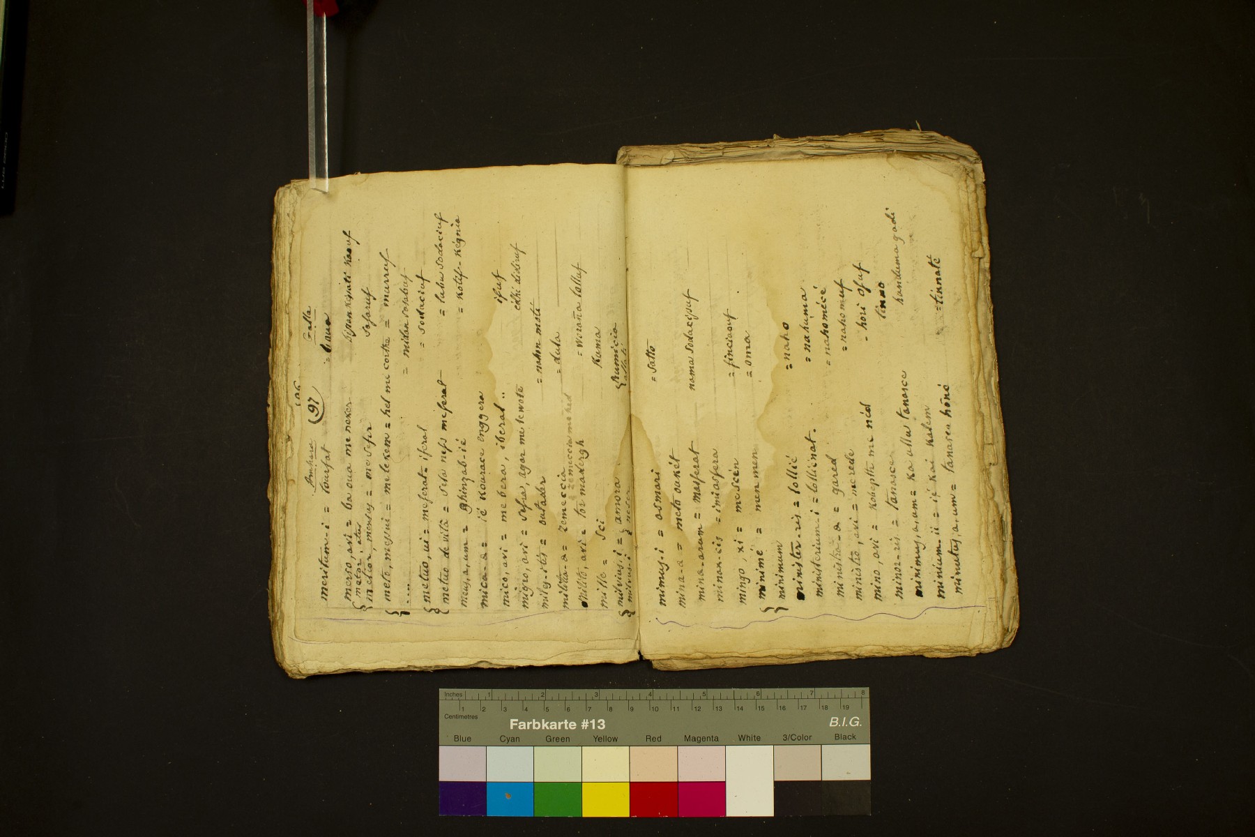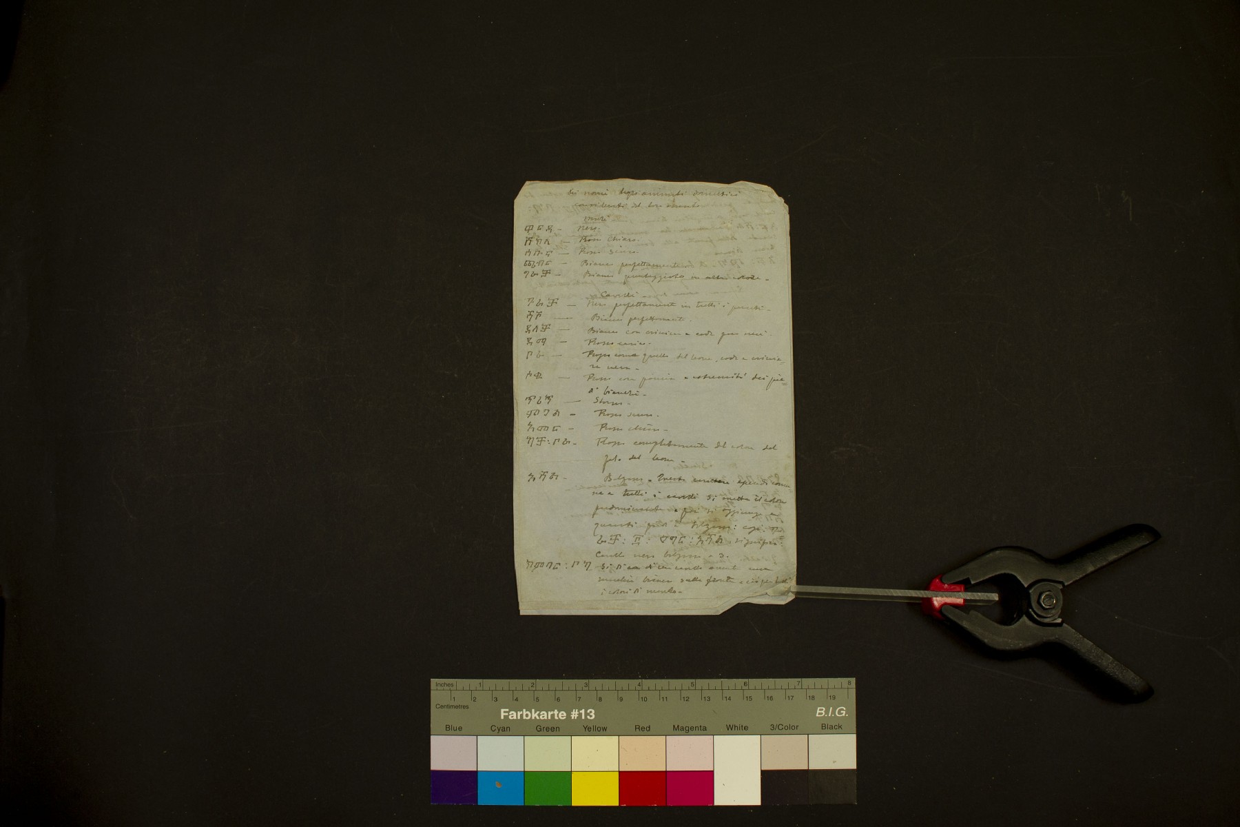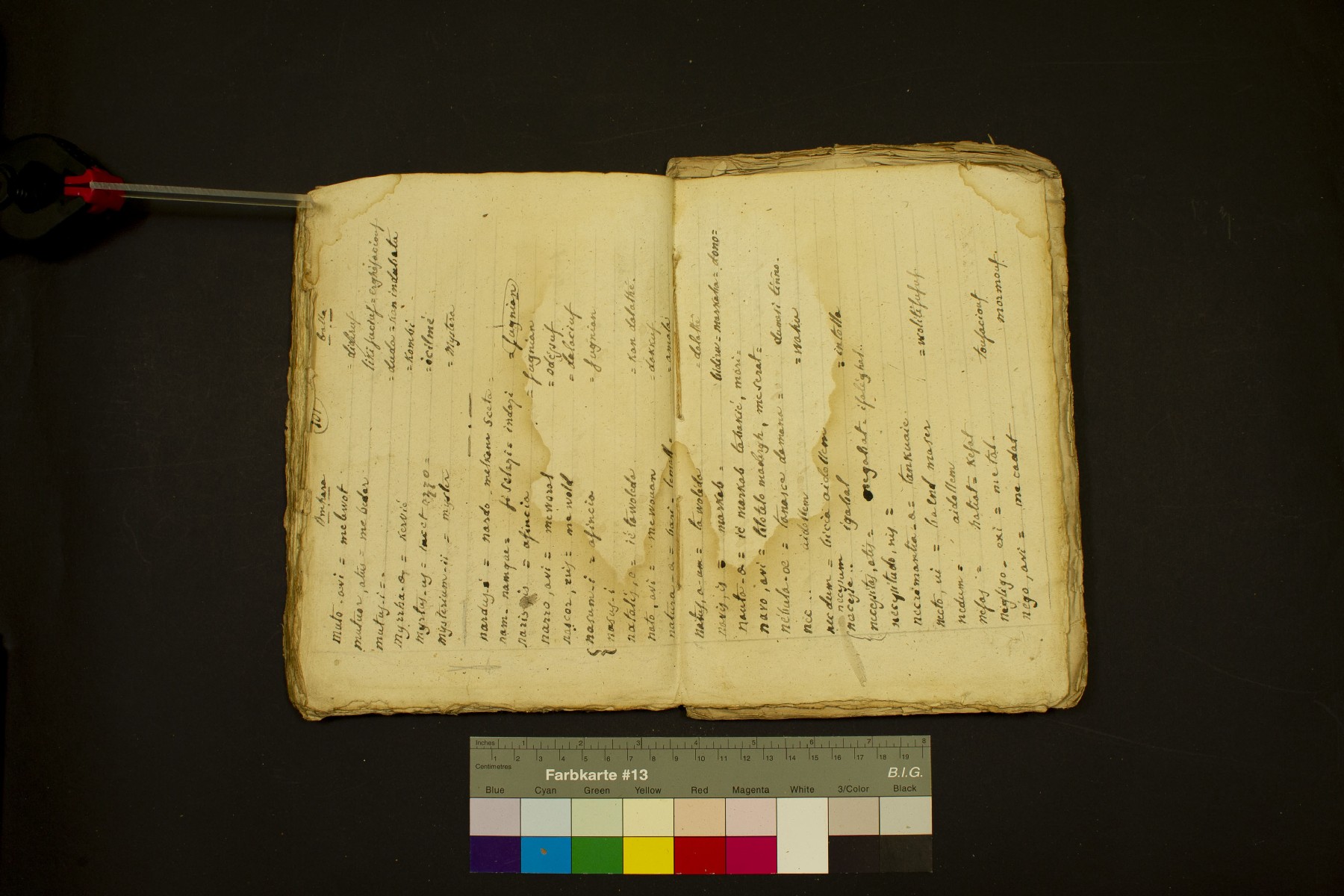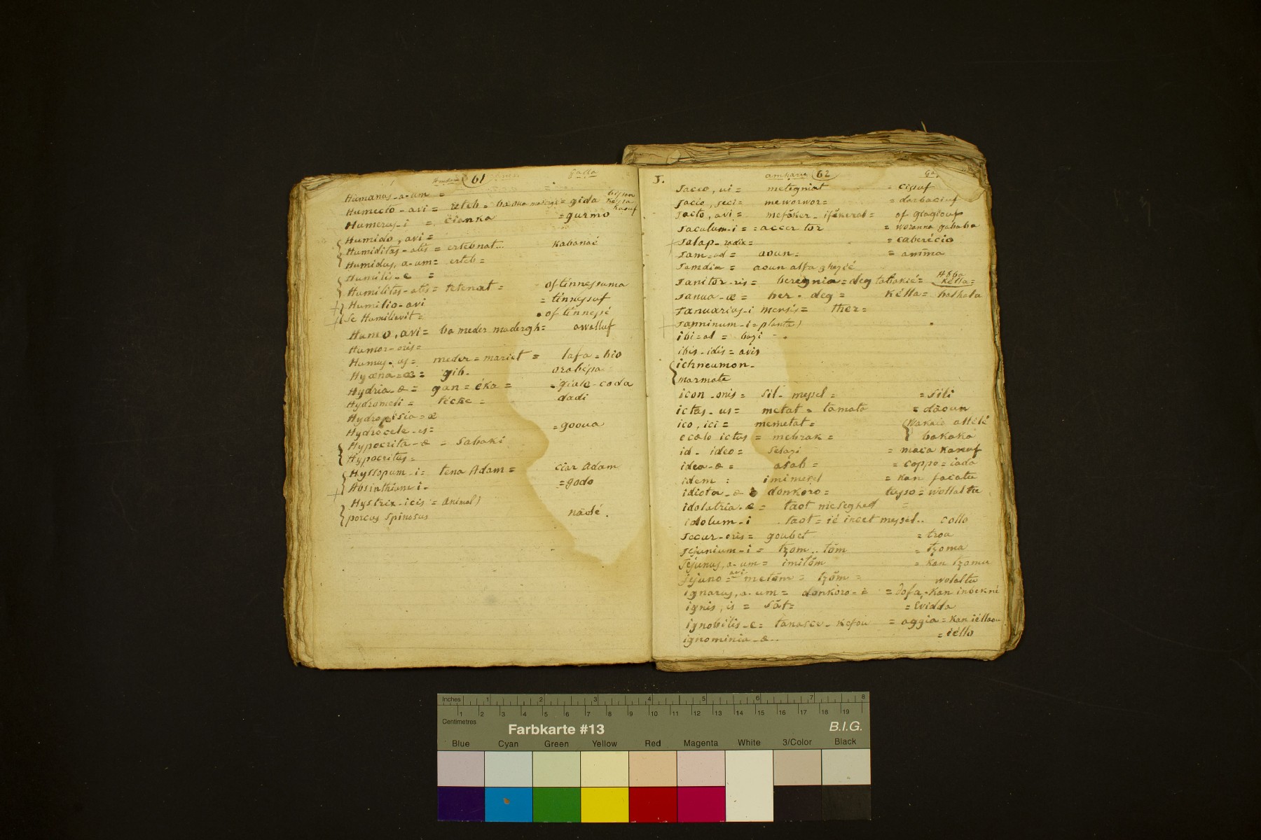 Quire 2 consists of three medium-size paper bifolia folded one inside the other without binding, for a total amount of 6 folia. The quire contains various Amharic wordlists written in fidäl on one or two columns (f. 3r–v is written on two columns). Each entry is accompanied by the respective meaning in Italian. The entire text is written in pale black ink, in all likelihood by Léon des Avanchers. All leaves are unruled. F. 1r: “Dei nomi degli animali domestici considerati nel loro mondo” (“About the names of the domestic animals considered in their world”). F. 1v: “Sterchi” (“Animal droppings”). F. 2r: “Semenze varie” (“Various seeds”). F. 3ra: “Insetti” (“Insects”); “Rettili” (“Reptiles”); F. 3rb: “Volatili” (“Birds”); Acquatici (“Aquatic animals”). F. 3va: untitled but contains words for kinship. F. 3vb: “Scimmie” (“Monkeys”). F. 4r: “Quadrupedi” (“Four-legged animals”). F. 5r: “Piante” (“Plants”). F. 6r: “Animali bovini” (“Bovine animals”). Ff. 2v, 4v, 5v, 6v are blank.
