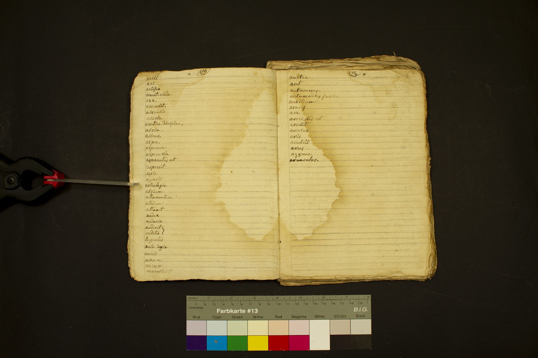 Mediocre. Material damages are mainly located at the beginning and at the end of the manuscript: f. 1 shows a large fold in the upper right corner, and f. 80 has gaps of different sizes. The rest of the textblock is characterized by various folds, small tears, holes, and extensive stains due to humidity, especially at the center of all leaves. There are also consistent and inconsistent deposits on all leaves. |