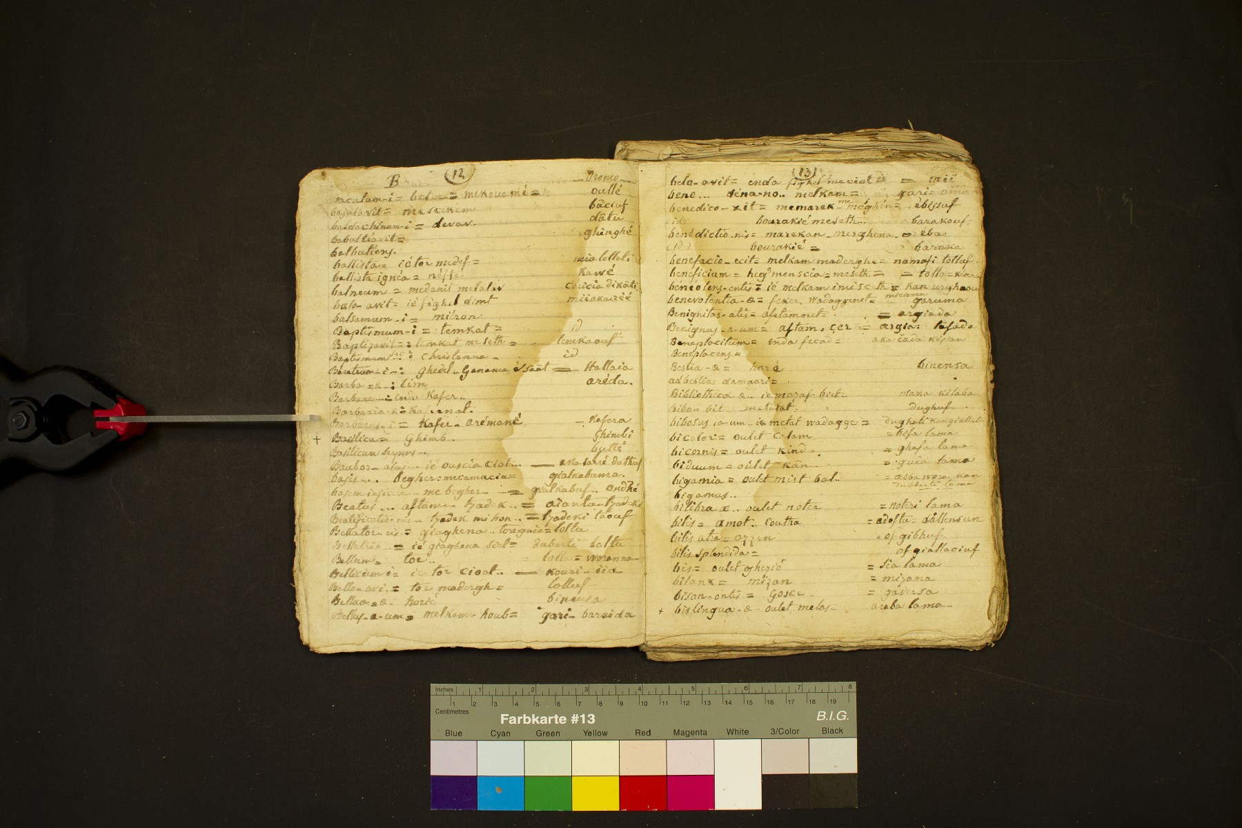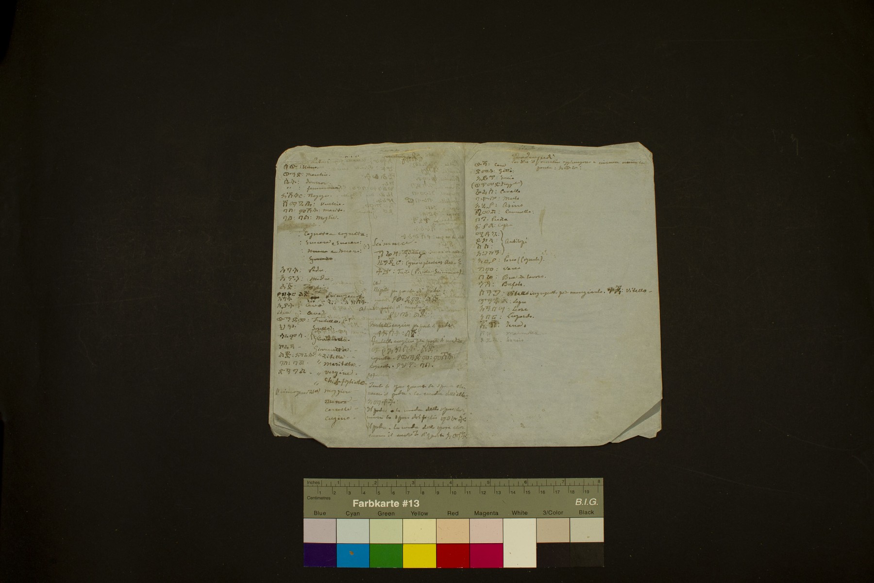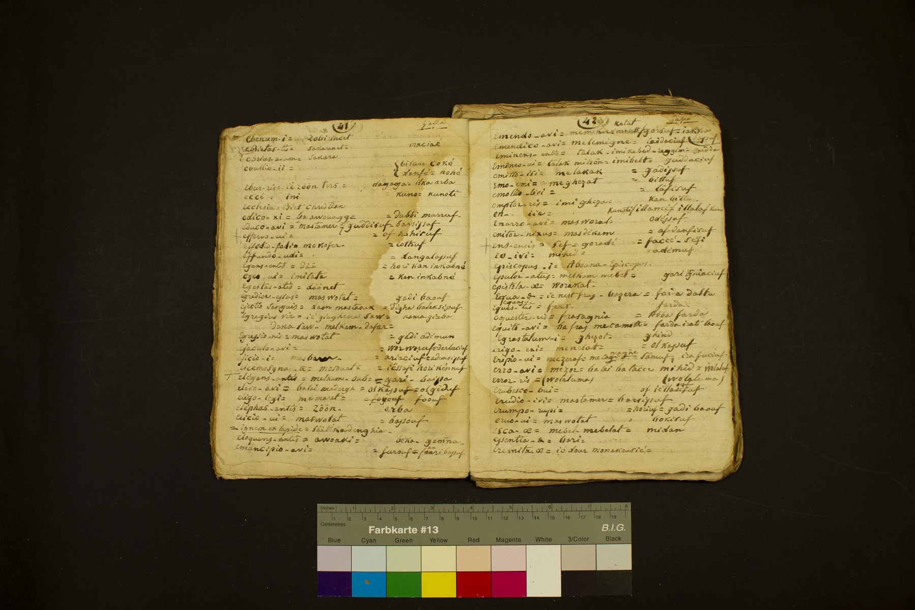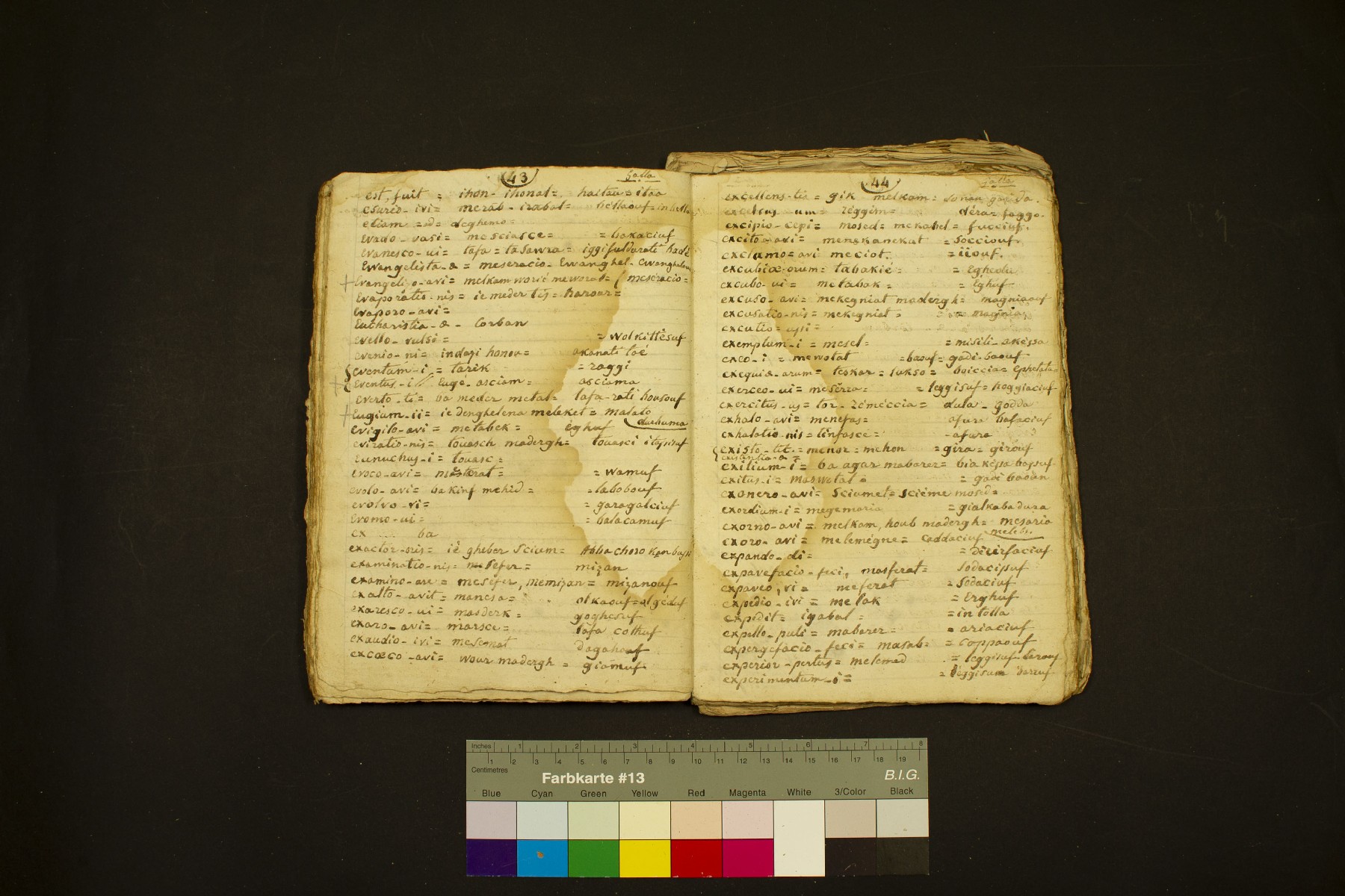 The item also includes two additional loose quires, labelled 1 and 2. Quire 1 is a medium-size paper bifolium. Ff. 1–2 contain a wordlist in an unidentified Ethiopian language written in black ink in Latin script, in all likelihood by Léon des Avanchers. Each entry is accompanied by the respective meaning in Italian. Ff. 3–4 are blank.