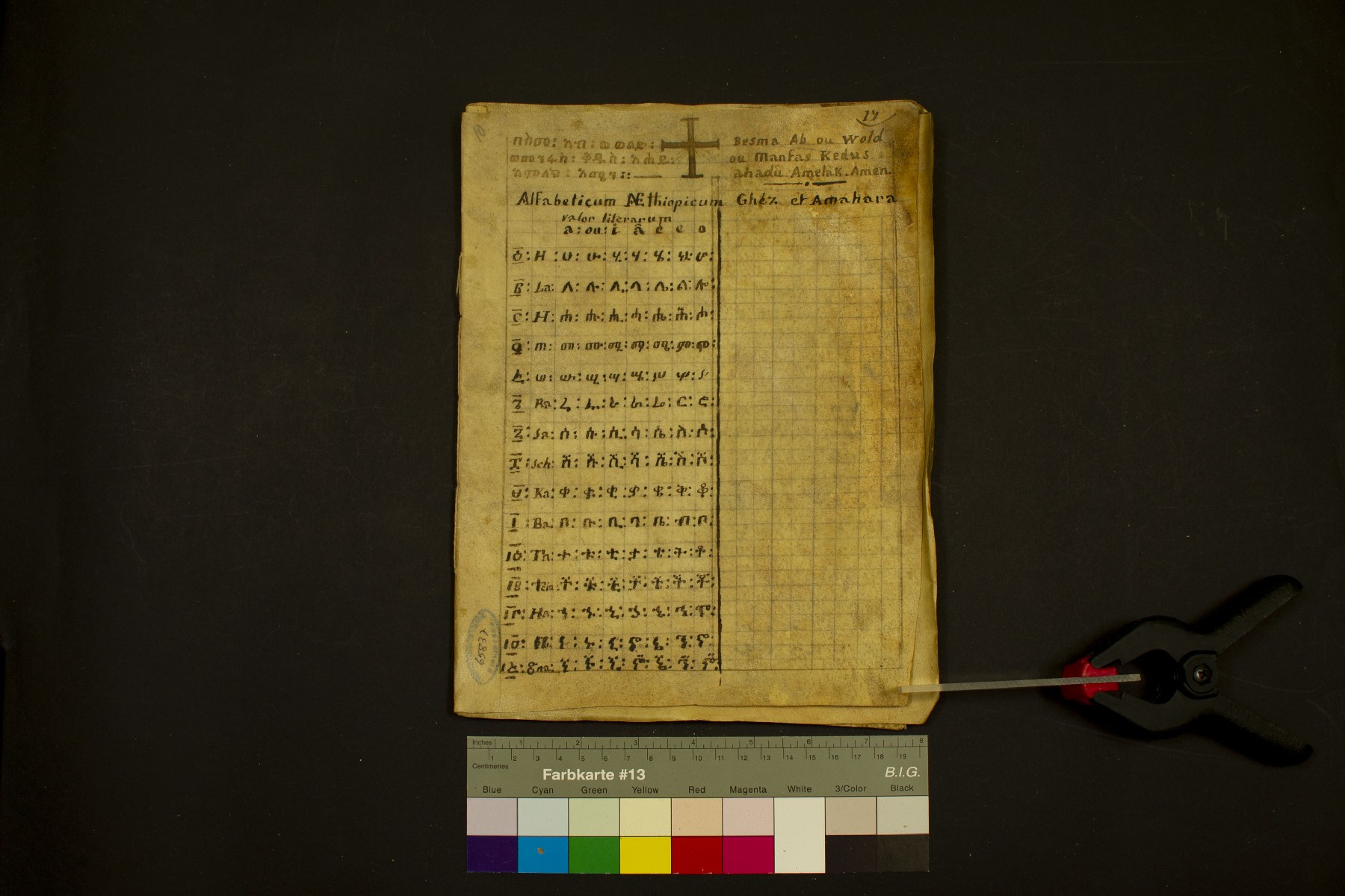 Ff. 1ra–1va: Alfabeticum Aethiopicum Ghéz et Amahara (“Gǝʿǝz and Amharic Ethiopic alphabet”). Above the title is a cross with equal arms and the following Gǝʿǝz formula, in fidäl and Latin transliteration: በስመ፡ አብ፡ ወወልድ፡ ወመንፈስ፡ ቅዱስ፡ አሐዲ፡ አምላክ፡ አሜን። Besma Ab ou Wold ou Manfas Kedus ahadu Amelak. Amen. The syllabary consists of a nine-column table. The first column indicates the Ethiopic number of the consonant, from ፩ to ፴፯. The second column contains the name of the consonant in Latin transcription (“H, La, H, M, Ra, Sa, Sch, Ka, Ba”, …). Columns 3–9 contain the Ethiopic characters according to their vocalic order. Vocalic orders (“valor literarum”) are indicated as “a, ou, i, â, ê, e, o”. The syllabary also includes Amharic consonants and labiovelars. |