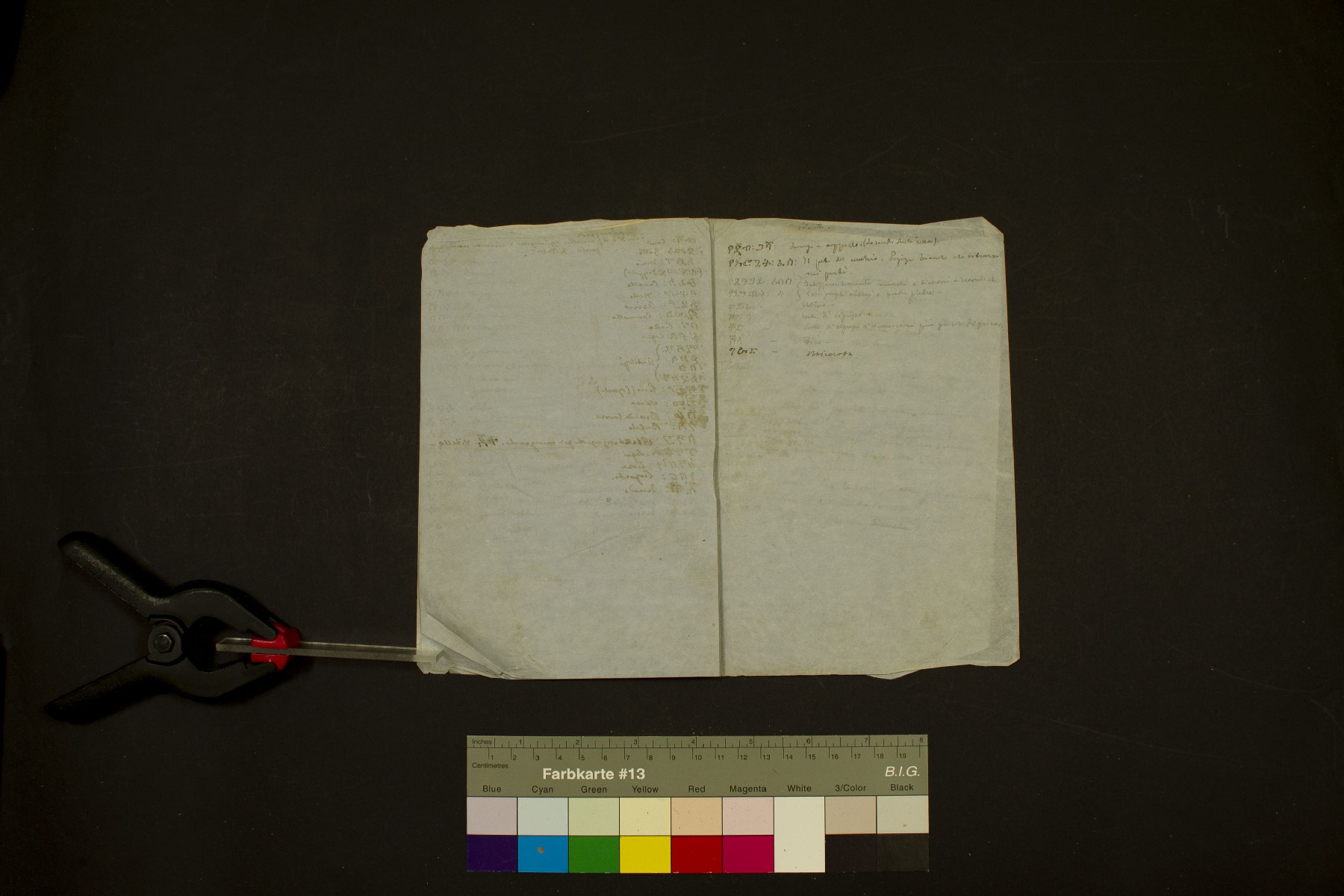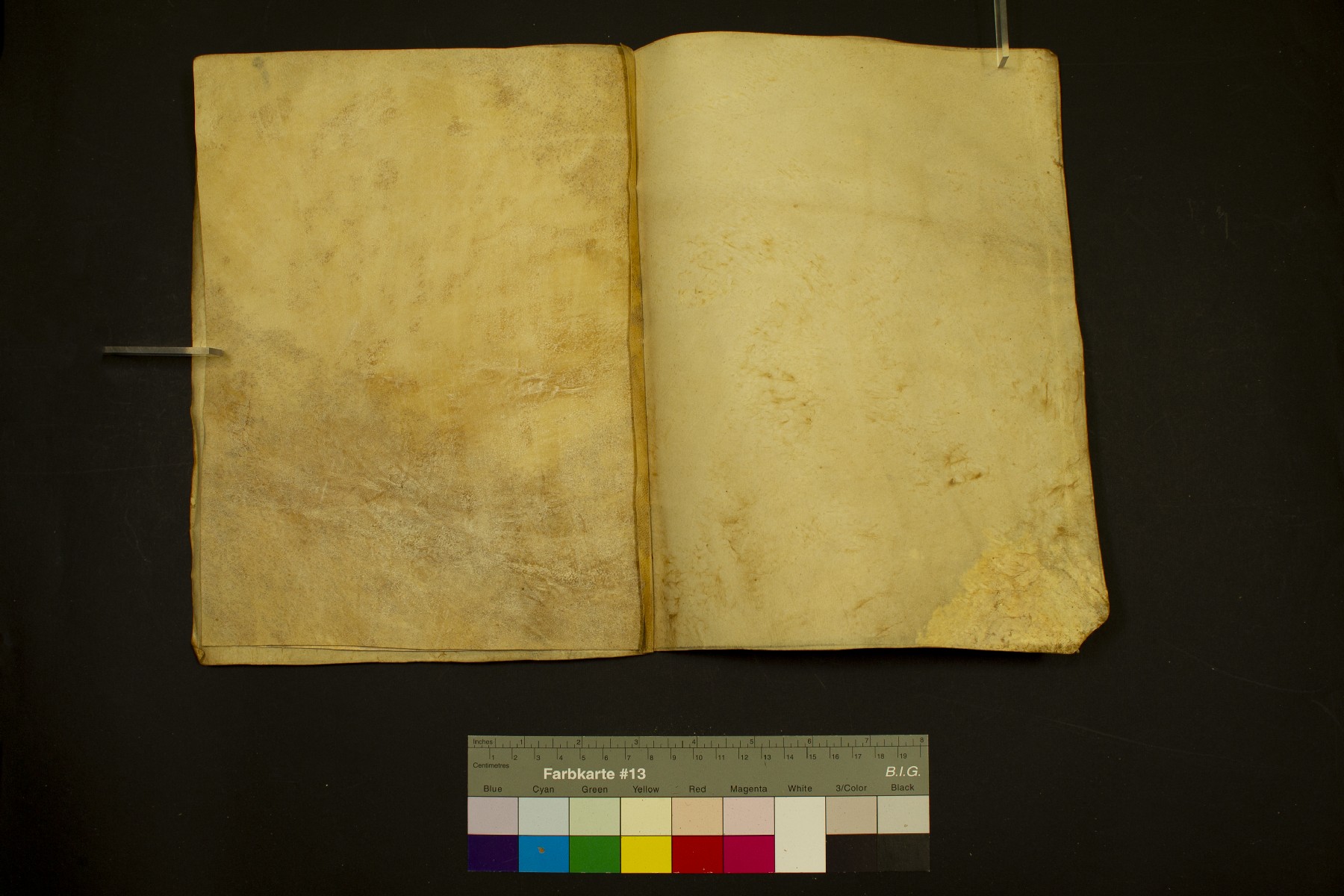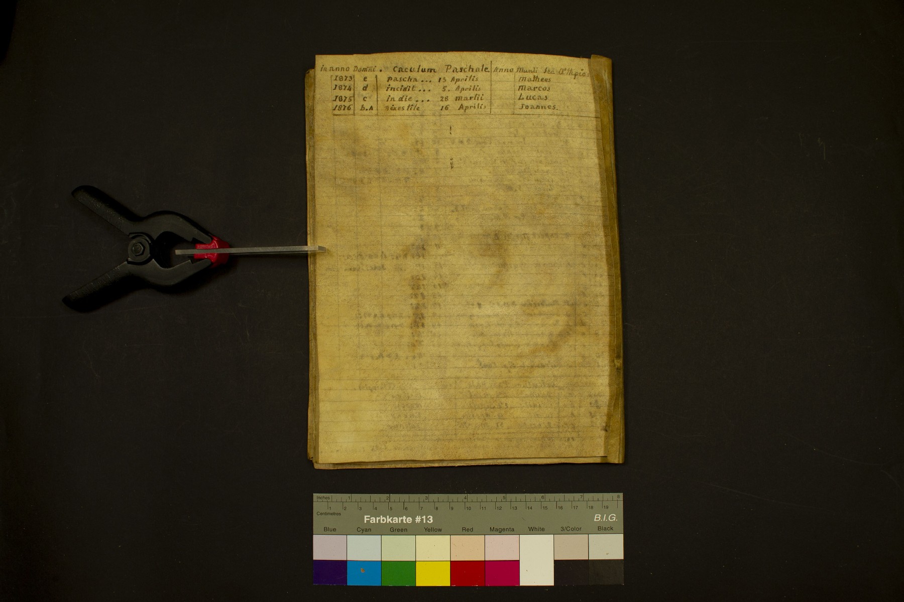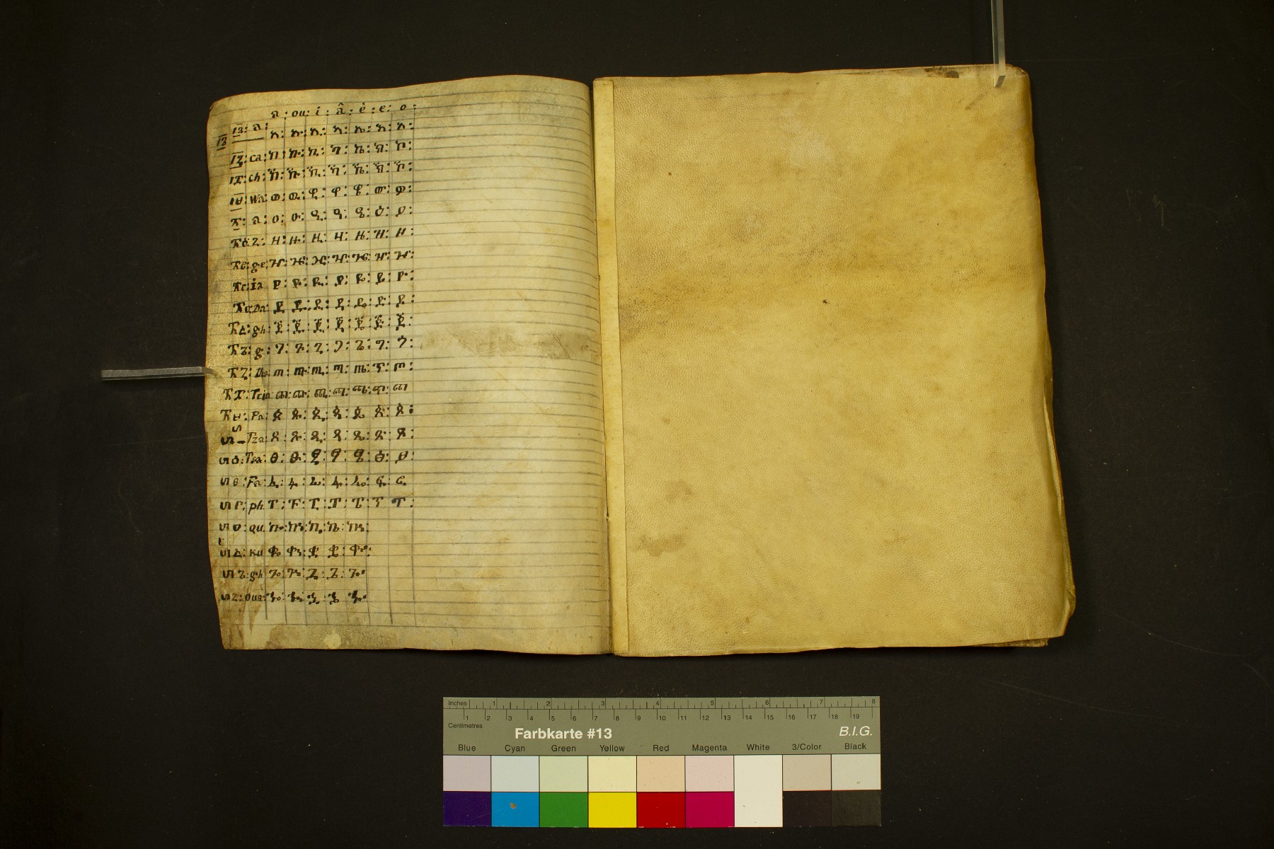 The quire is unruled. On f. 1r–v a table for accommodating the syllabary has been drawn up in pencil. The table counts 37 lines and 19 columns on f. 1r, and 47 lines and 11 columns on f. 1v. |