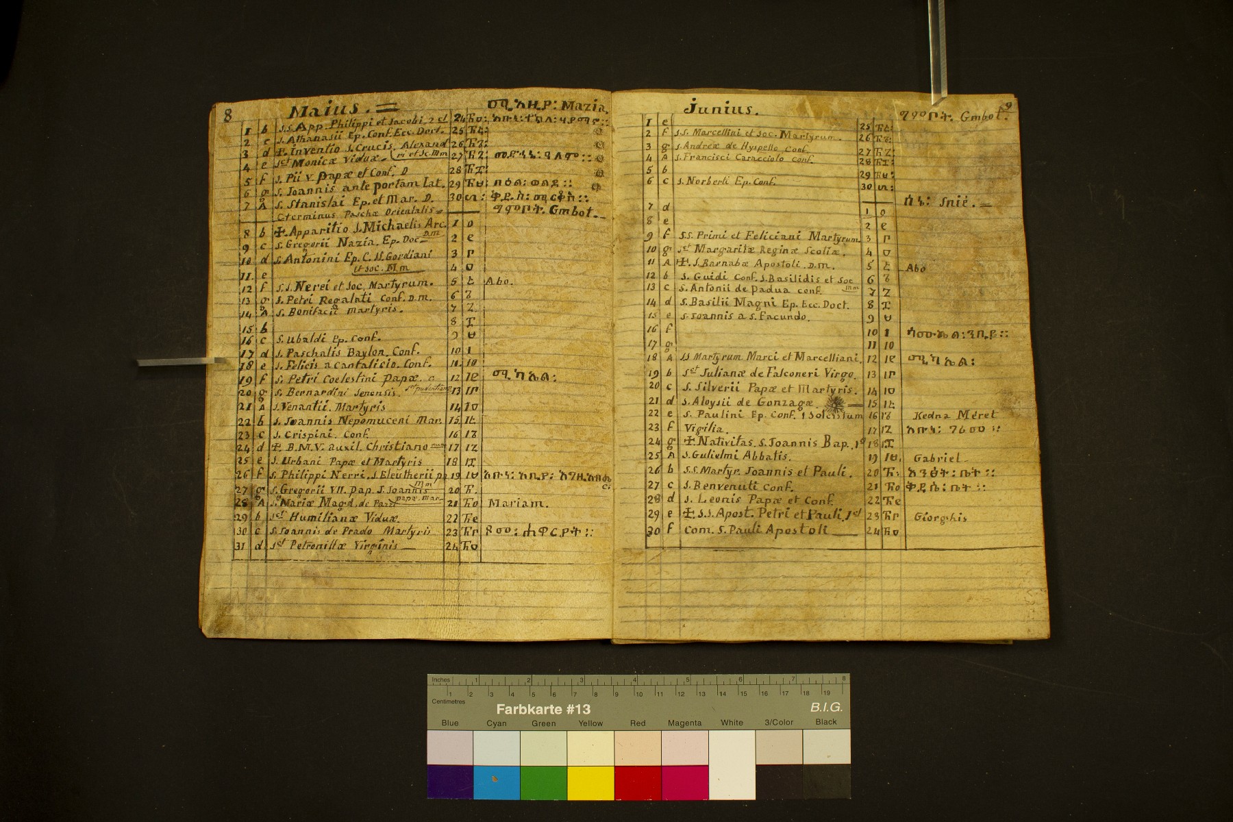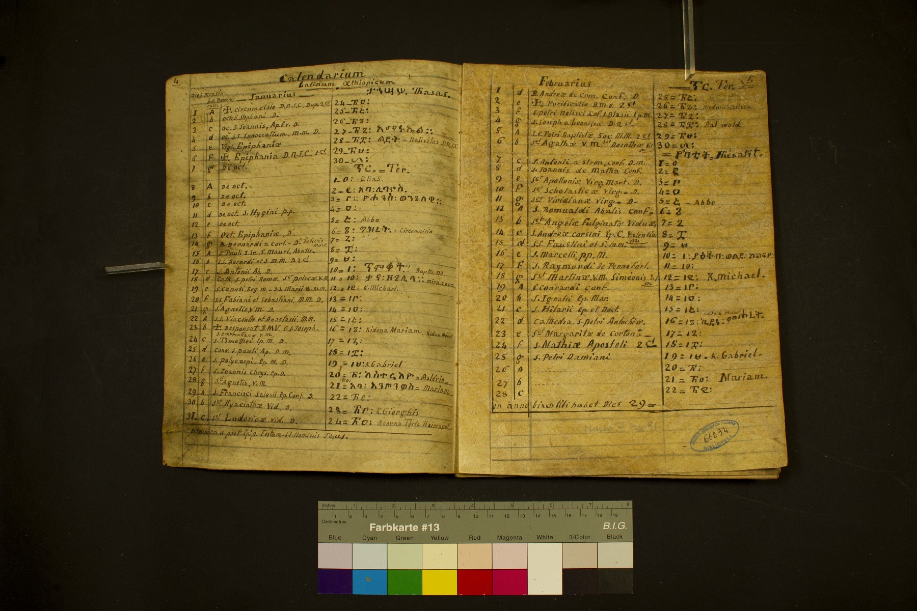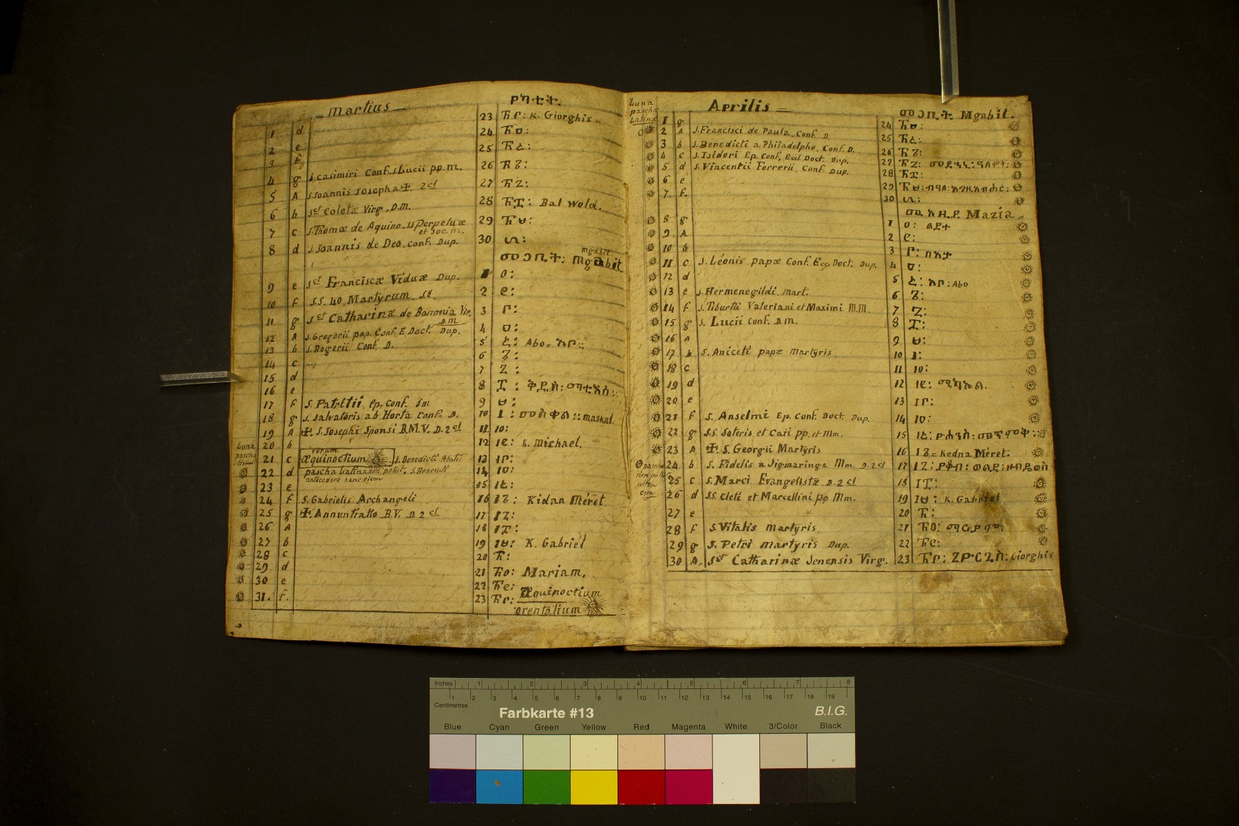 Ff. 1r–16vb: Kara motuma samai kan barsissa barsissa christian catholica, kan F. Léon des Avanchers kitabe (“Kingdom of Paradise, that is, the Catholic Christian Doctrine, written by F. Léon des Avanchers”). The title in Oromo is followed by a long invocation to Mary in Latin. Incipit: o Maria! Magistra Apostolorum, spes prophetarum, scientia doctorum, benedicat te omnis lingua; et nomen sanctuum fili tui Jesus confiteatur ab omni carne. Domina mea, suscipe hoc opus manum mearum. Ff. 1v–7v: Calendarium latinum æthiopicum (“Latin-Ethiopian Calendar”). The calendar consists of a four-column table. The first column (“dies”) indicates the number of the day of each month, from 1 to 28, 30, or 31. The second column (“lett. Dominicalis”) indicates the weekday with letters from “A” to “g”. The third column, designated after the Latin months from “Januarius” to “December”, indicates the feasts of the year according to the Catholic calendar. The fourth column, designated after the Ethiopian months from “ታኅሣሥ Thasas” to “Hedar”, indicates the days and the feasts of the Ethiopian year corresponding to those of the other columns. In the lower margins of ff. 6v–7r and on f. 7v are tables for the calculation of the Easter day (“Calculum Paschale”) for the years 1865–1876. |