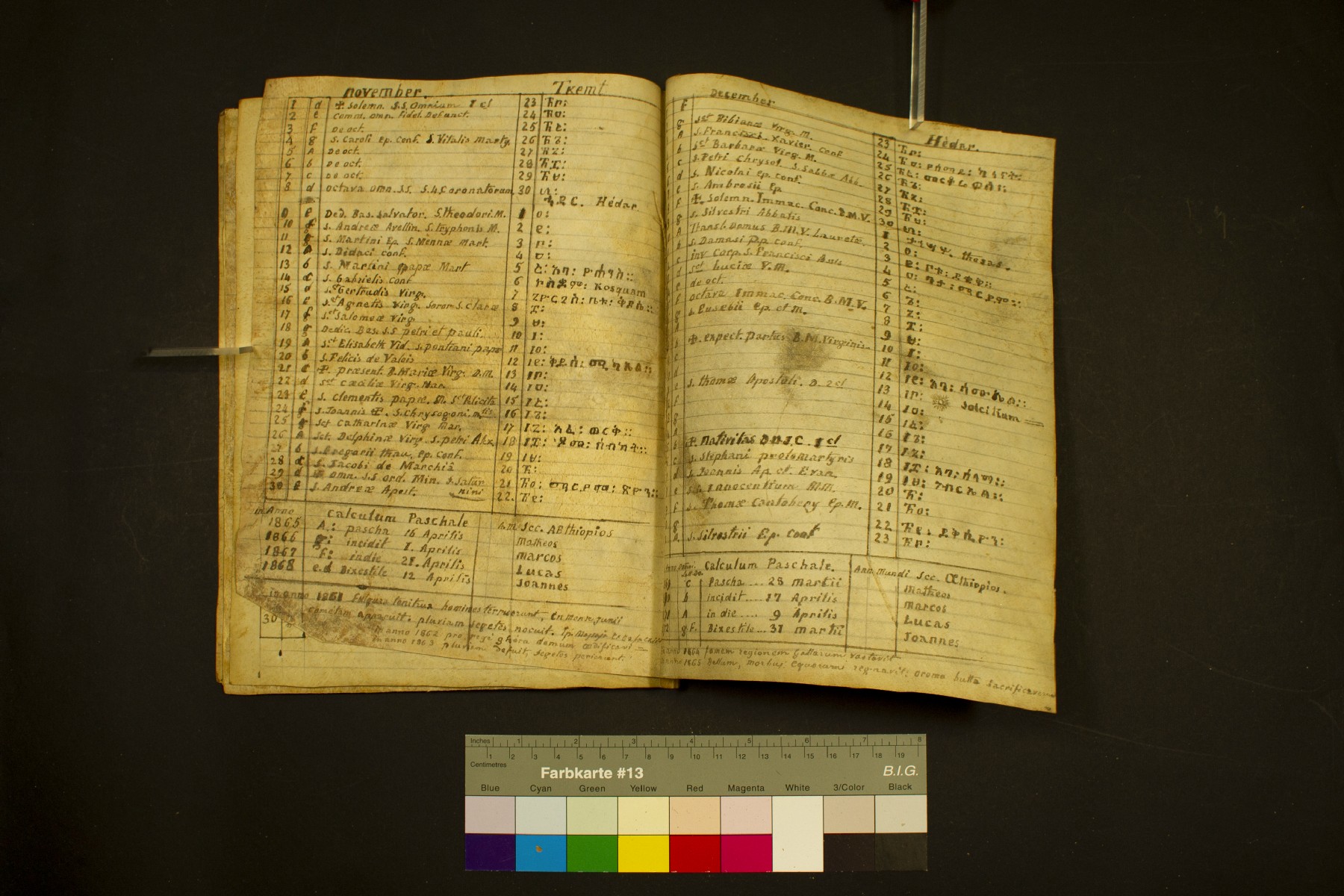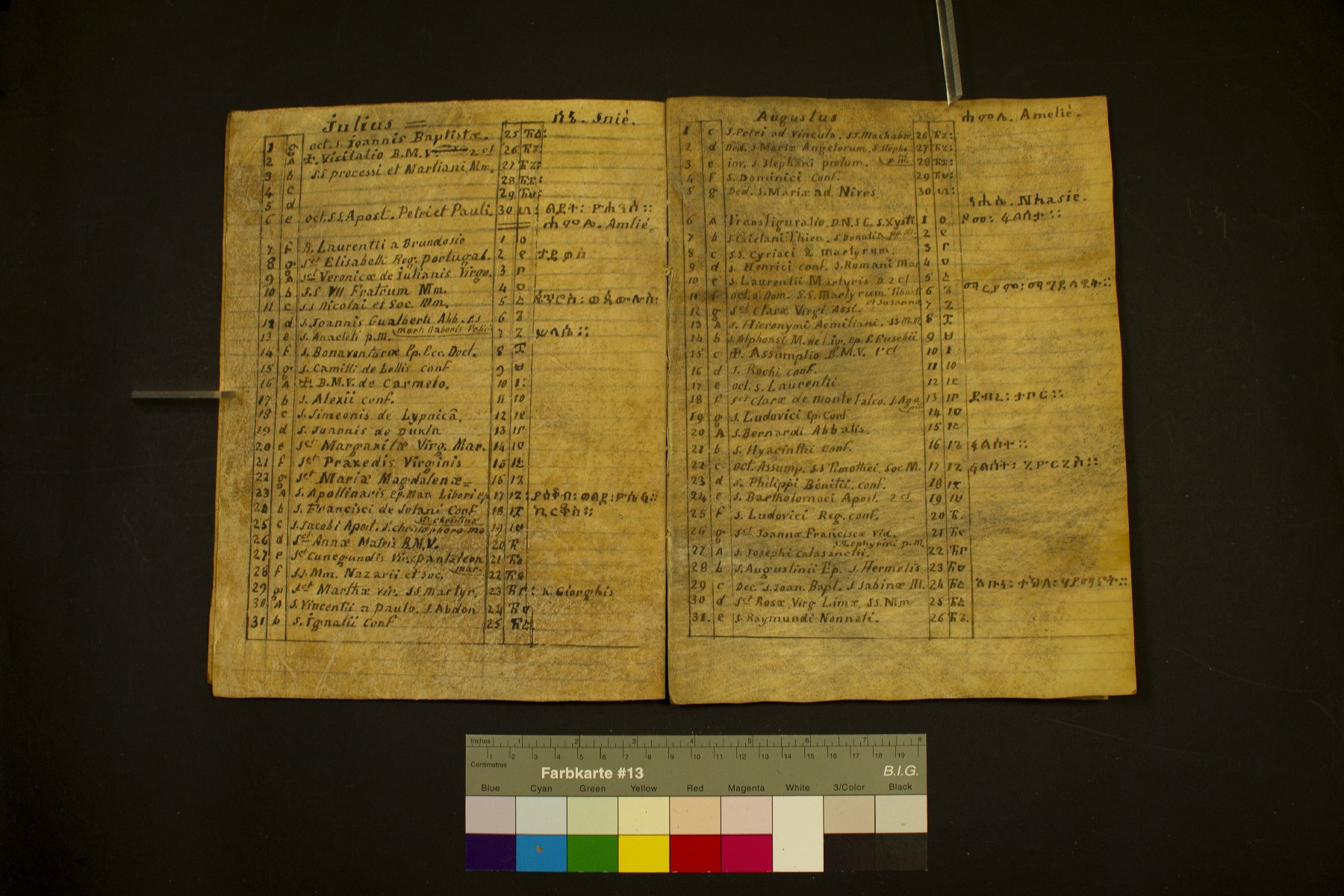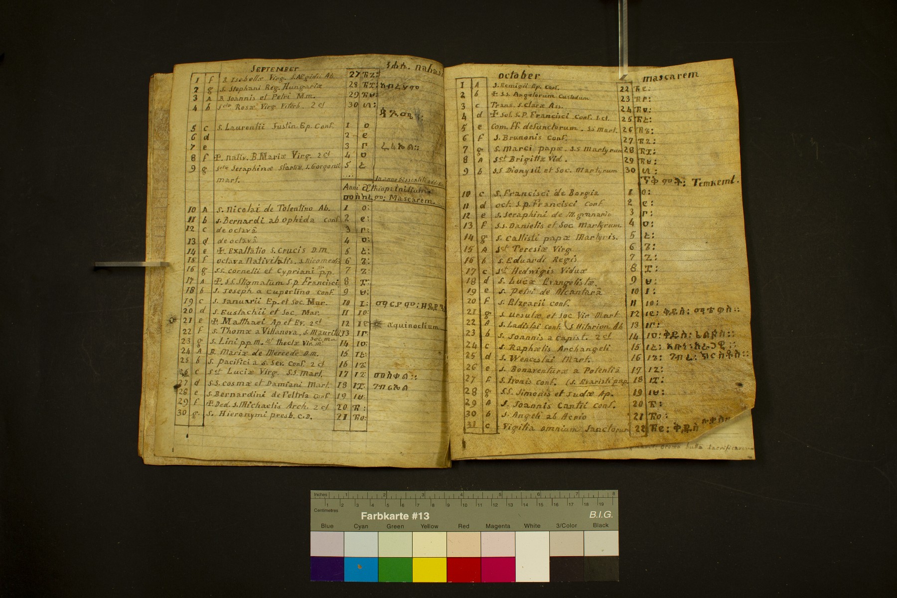 Ff. 1r–16vb: Kara motuma samai kan barsissa barsissa christian catholica, kan F. Léon des Avanchers kitabe (“Kingdom of Paradise, that is, the Catholic Christian Doctrine, written by F. Léon des Avanchers”). The title in Oromo is followed by a long invocation to Mary in Latin. Incipit: o Maria! Magistra Apostolorum, spes prophetarum, scientia doctorum, benedicat te omnis lingua; et nomen sanctuum fili tui Jesus confiteatur ab omni carne. Domina mea, suscipe hoc opus manum mearum. Ff. 1v–7v: Calendarium latinum æthiopicum (“Latin-Ethiopian Calendar”). The calendar consists of a four-column table. The first column (“dies”) indicates the number of the day of each month, from 1 to 28, 30, or 31. The second column (“lett. Dominicalis”) indicates the weekday with letters from “A” to “g”. The third column, designated after the Latin months from “Januarius” to “December”, indicates the feasts of the year according to the Catholic calendar. The fourth column, designated after the Ethiopian months from “ታኅሣሥ Thasas” to “Hedar”, indicates the days and the feasts of the Ethiopian year corresponding to those of the other columns. In the lower margins of ff. 6v–7r and on f. 7v are tables for the calculation of the Easter day (“Calculum Paschale”) for the years 1865–1876. |