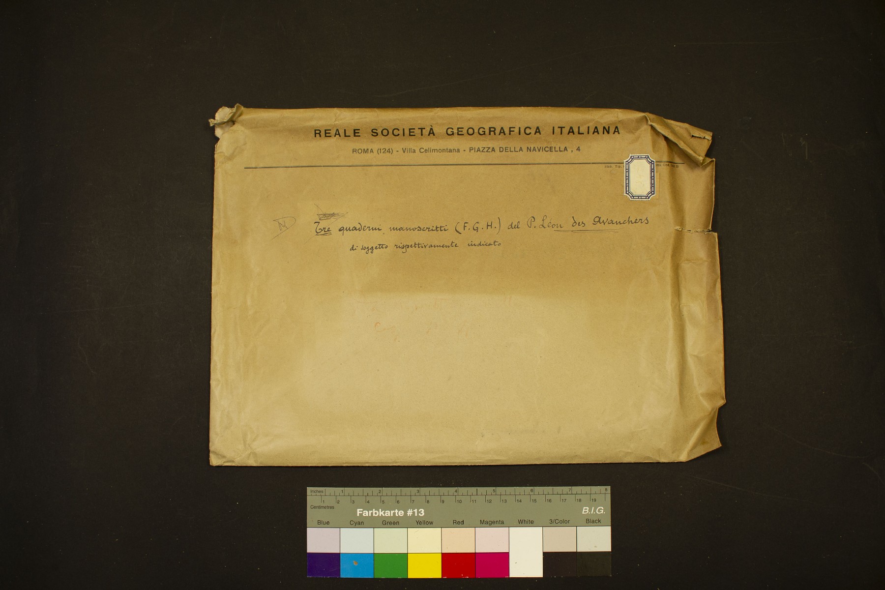 The item consists of three separate units, labelled SGI 248.F, SGI 248.G, and SGI 248.H. The item also includes due additional loose quires, labelled 1 and 2. All of them came together at the Società Geografica Italiana in a large envelope, bearing the following inscription in Italian: “Tre quaderni manoscritti (F.G.H.) del P. Léon des Avanchers di soggetto rispettivamente indicato”.