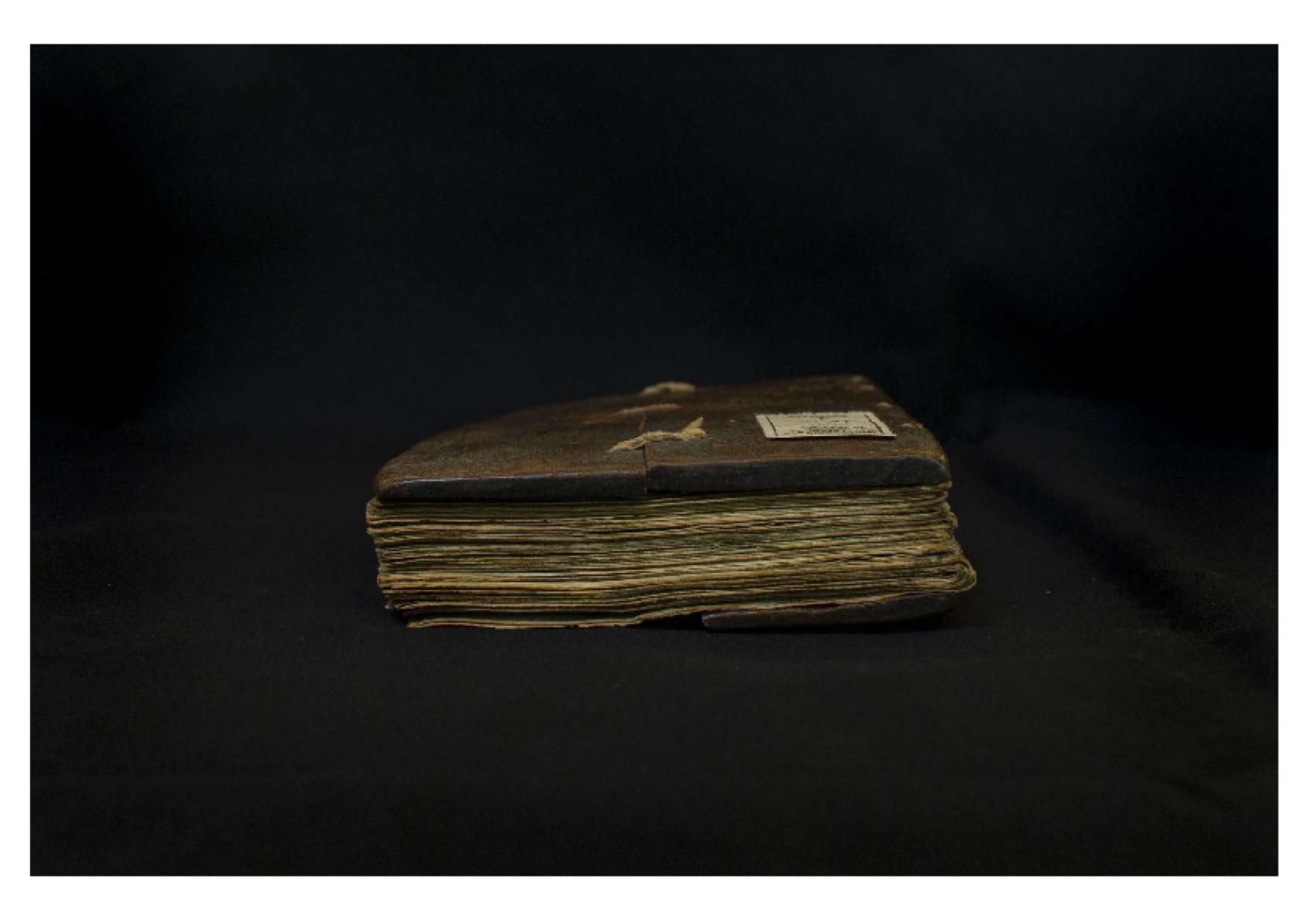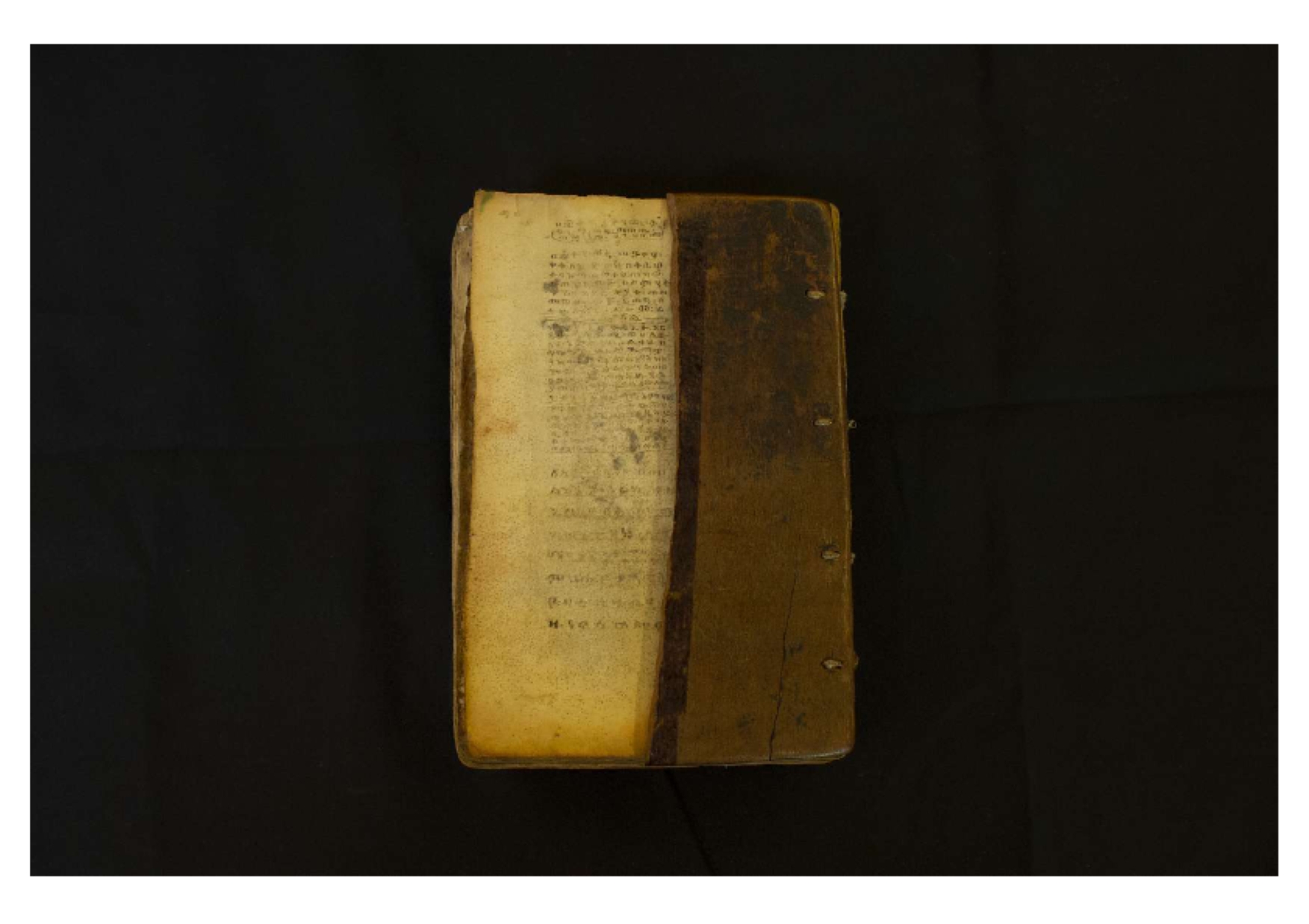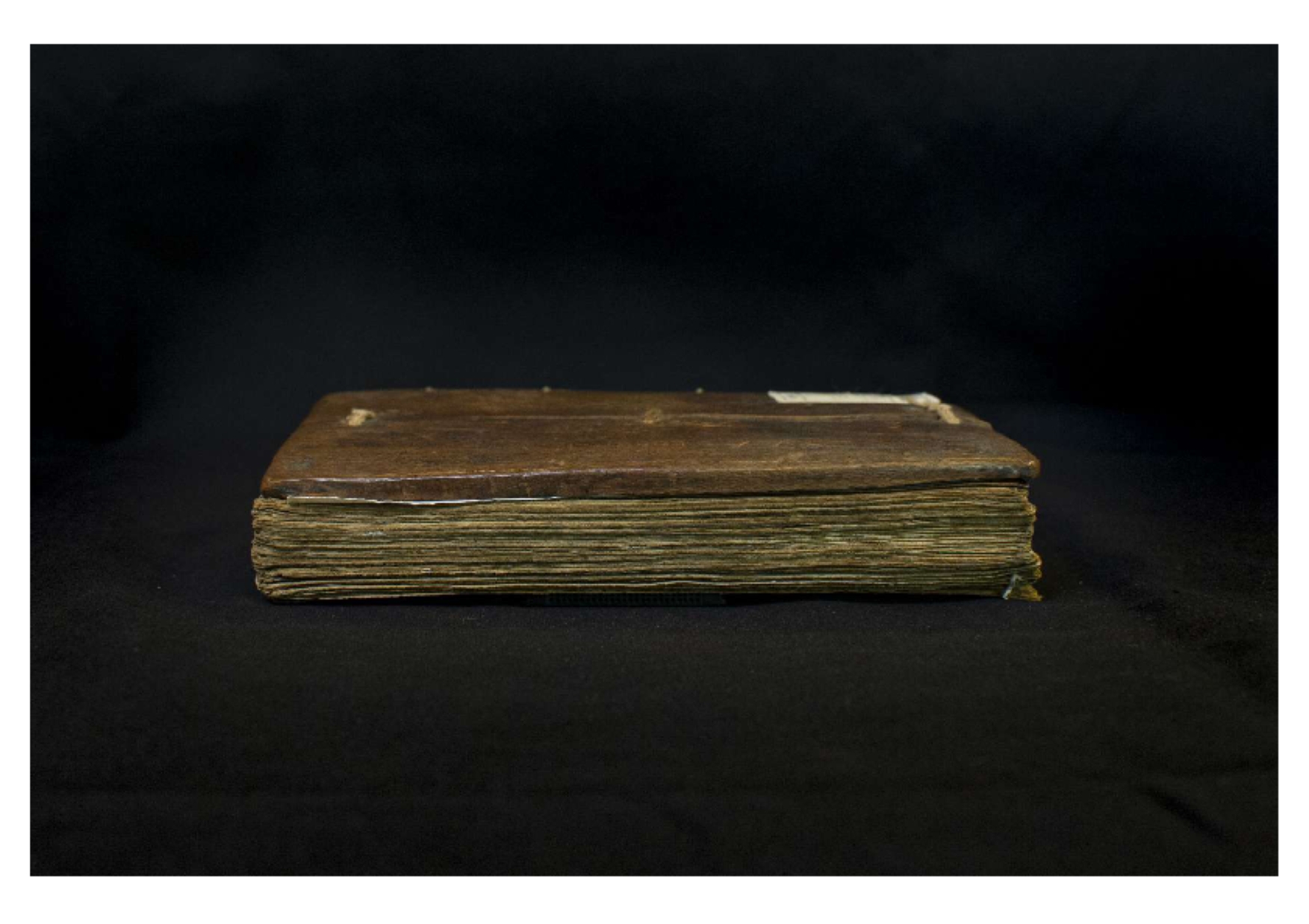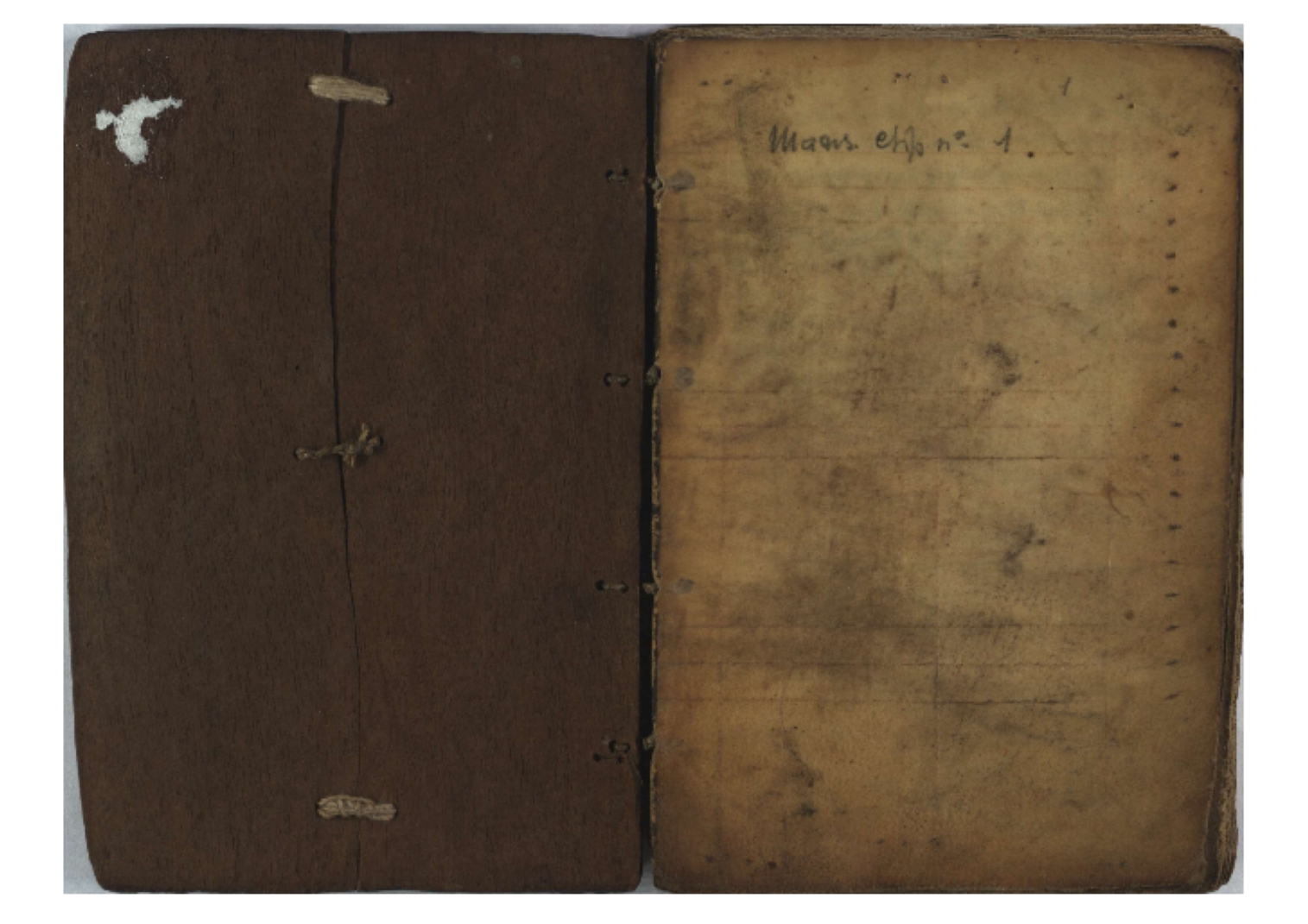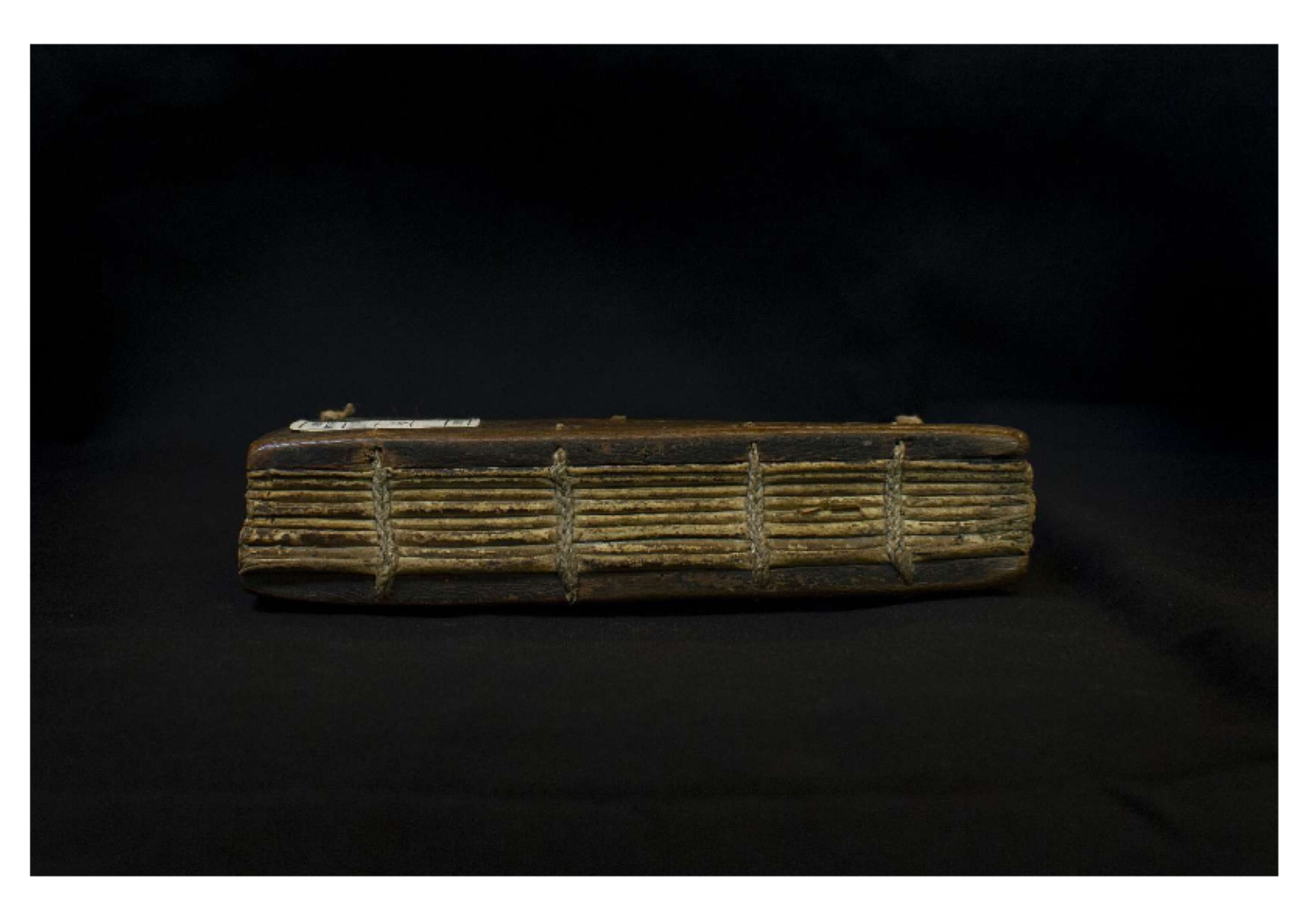 Two wooden boards. The spine is uncovered. Four sewing stations. |