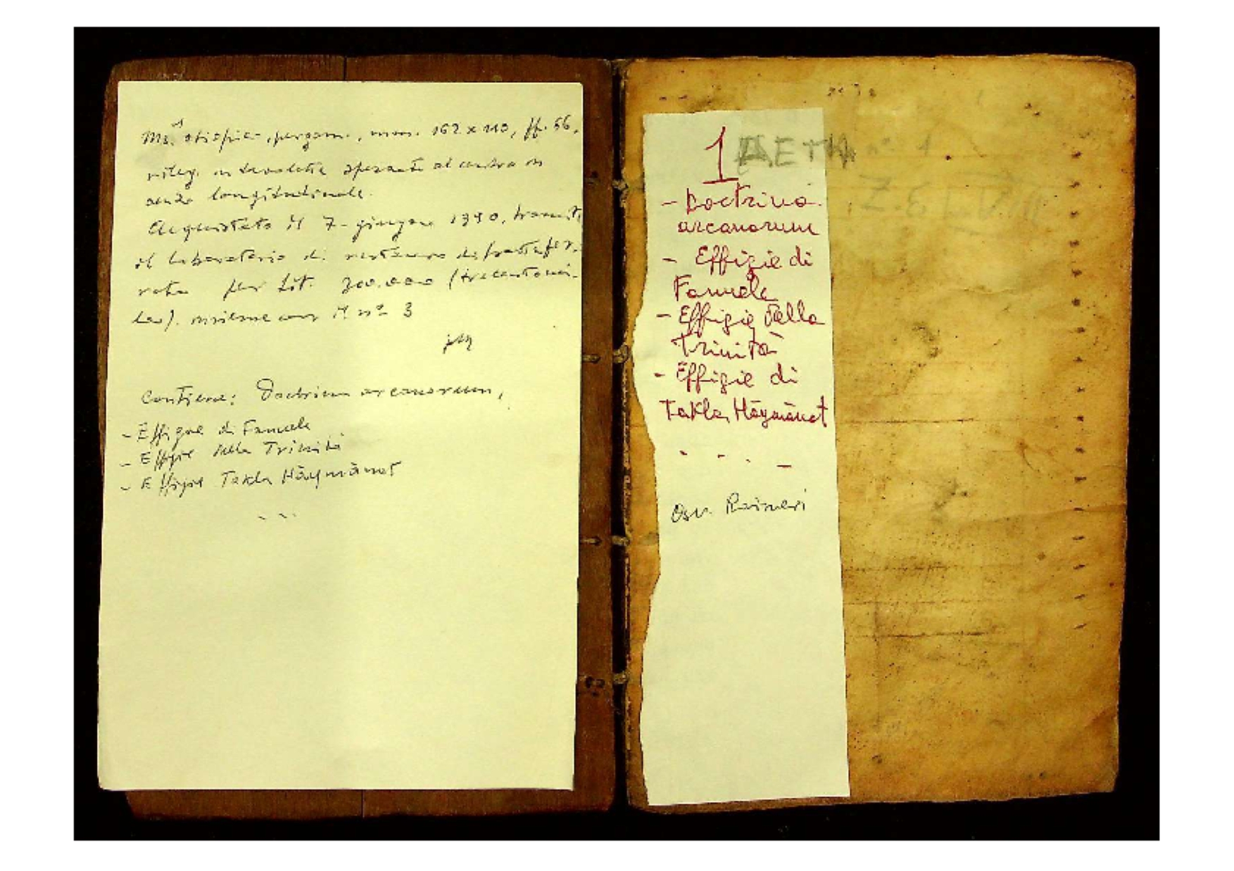 Unknown provenance. A sheet on the inner side of the front board states that the manuscript was purchased “tramite il laboratorio di restauro di Grottaferrata” on 7 June 1990 for the sum of Lire 300,000 together with MS Crypt. Aet. 3; see also Proverbio D.V., 2000, ‘Inventario sommario dei manoscritti arabi, ebraici, etiopici – con notizia dei turchi – conservati presso la Biblioteca della Badia di Grottaferrata’. Atti della Accademia nazionale dei Lincei, Memorie, Classe di scienze morali, storiche e filologiche, serie IX, 12 (2000), 468–570 (here p. 479). |
