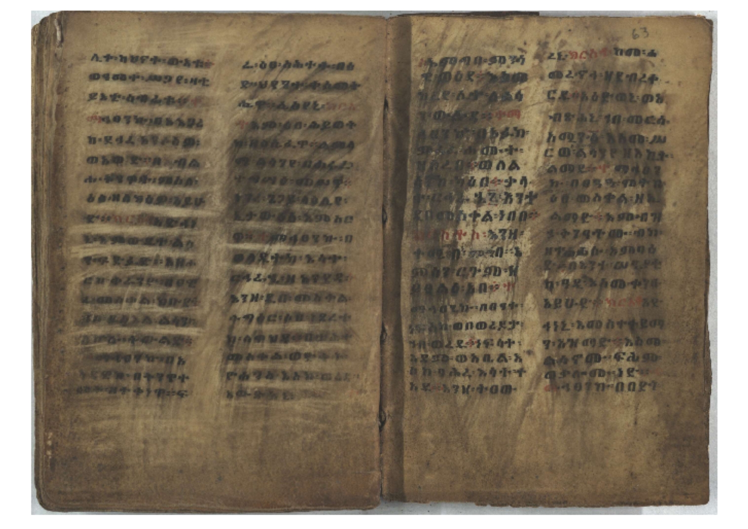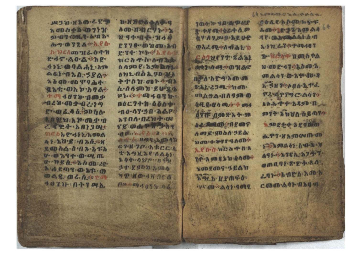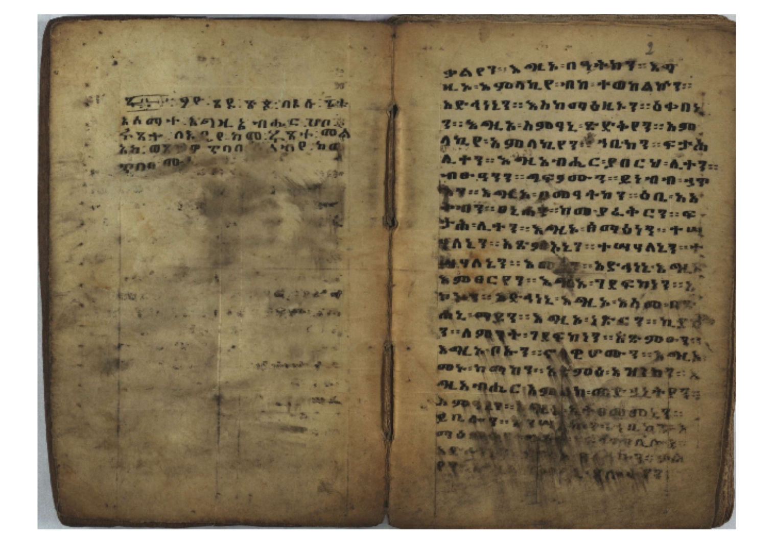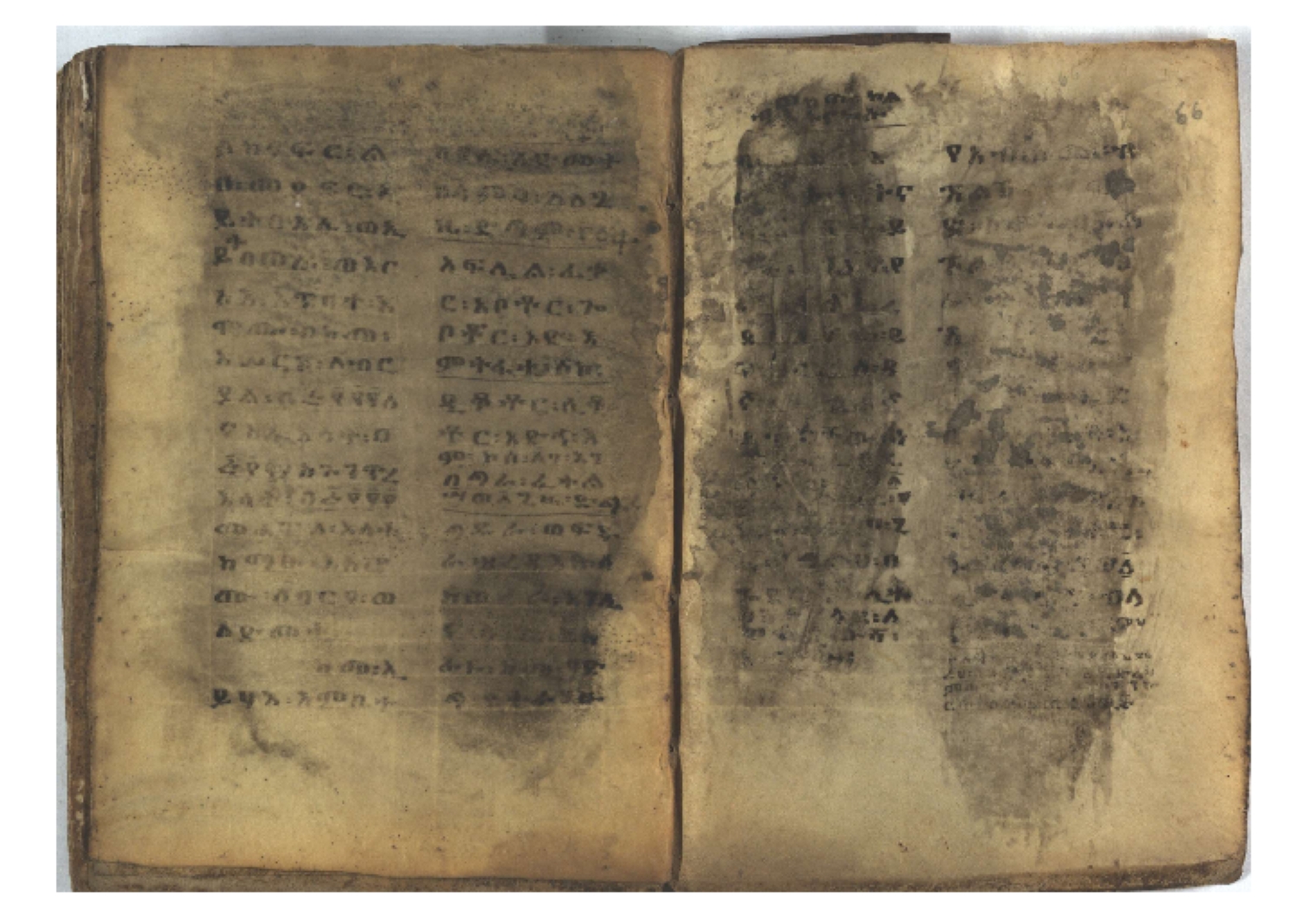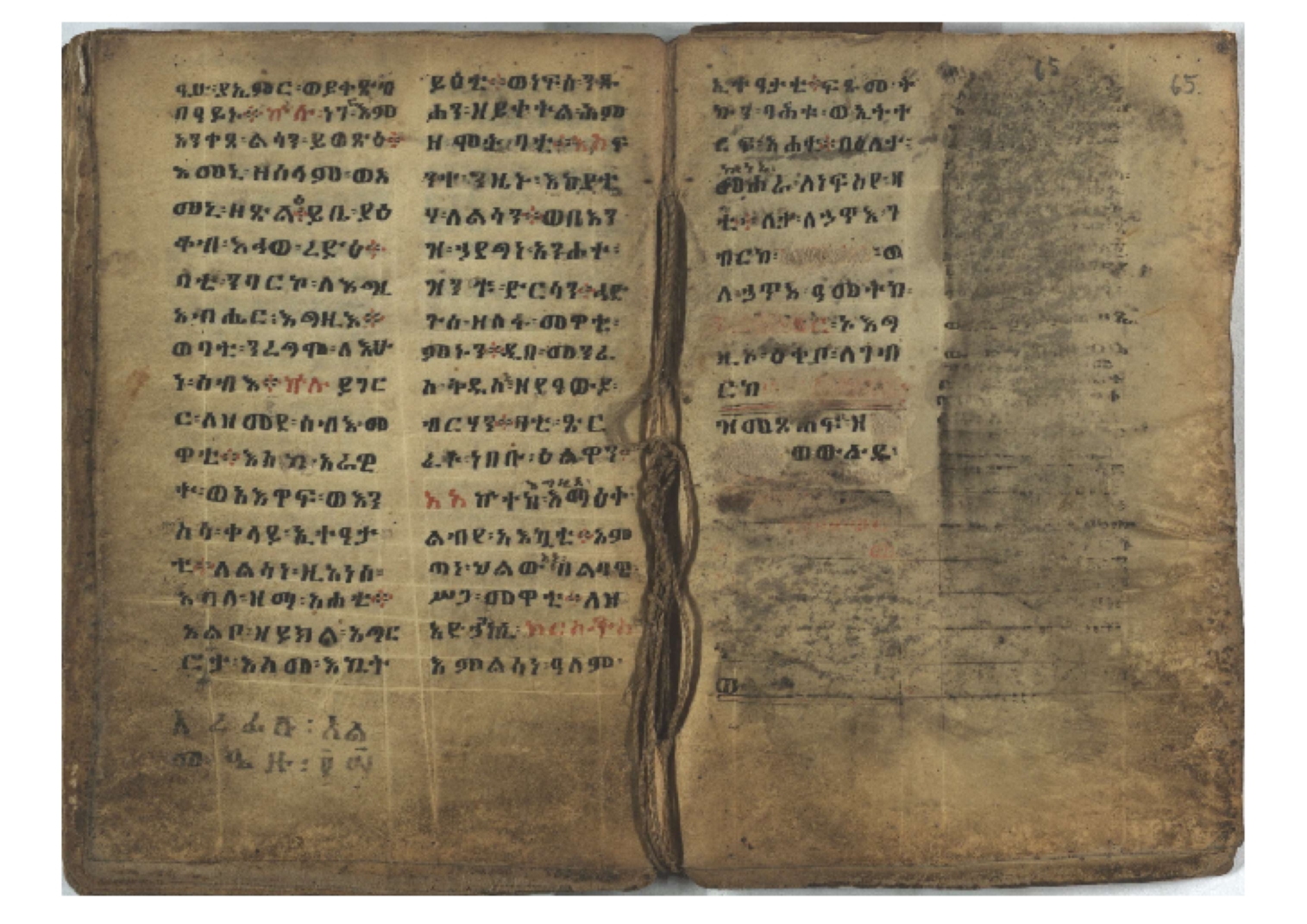 1. F. 1v: text of probable protective content. It consists of 5 poorly readable lines. Incipit: ፆዮ፡ ዸዶ፡ ጸጶ፡ በእሉ፡ ፯ቱ፡ አስማተ፡ እግዚአብሔር፡ etc. 2. F. 2r: Protective prayer. The conclusion is not legible because the ink is washed away. Incipit: ቃልያን። እግዚኦ፡ በዓትከን። እግዚኦ፡ አምላኪየ፡ ብከ፡ ተወከልኵን። አድኅነኒን። እስከማዕዜኑን። ዕቀበኒን። እግዚ፡ ስምዓኒ፡ ጽድቅየን። አምላኪየ፡ አምላኪየን። ኀቤከን። 3. F. 65ra: Ownership note, partially washed away. The legible text states: ዝመጽሐፍ፡ ዘ…፡ ወውልዱ፡ …. The entire text on f. 65rb has been washed away. 4. Ff. 65va–66va: Protective prayers and text of unknown content. The ink is mostly washed away and the texts are poorly legible. 5. Ff. 66va–b: Mälkǝʾ-hymn (Chaine nr. 170). The text is barely legible due to faded ink. Incipit: ሰላም፡ ለዝክረ፡ ስምኪ፡ ጸዳላ፡ ምሥራቅ፡ ወምዕራብ፡ |