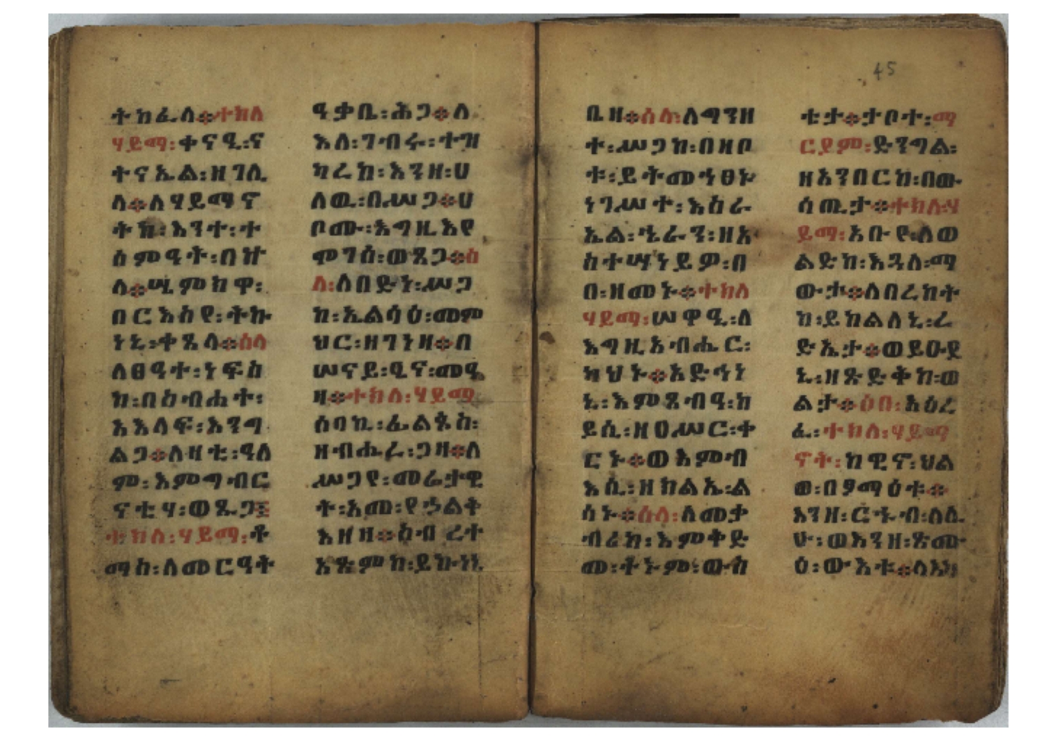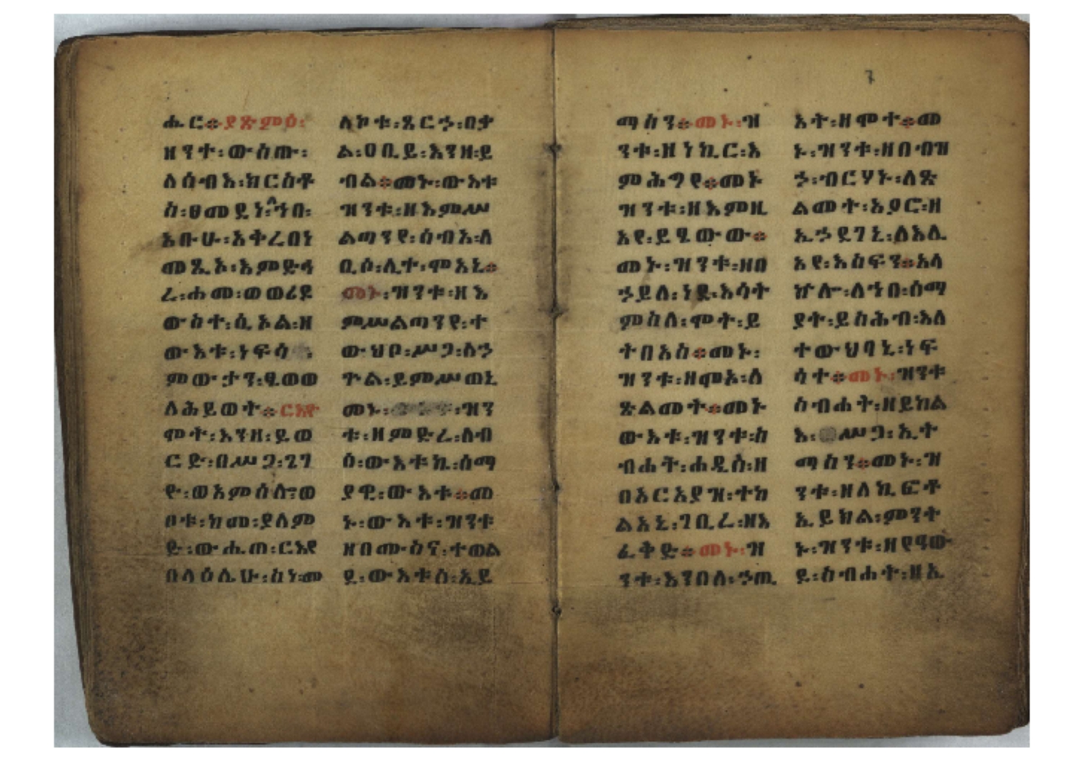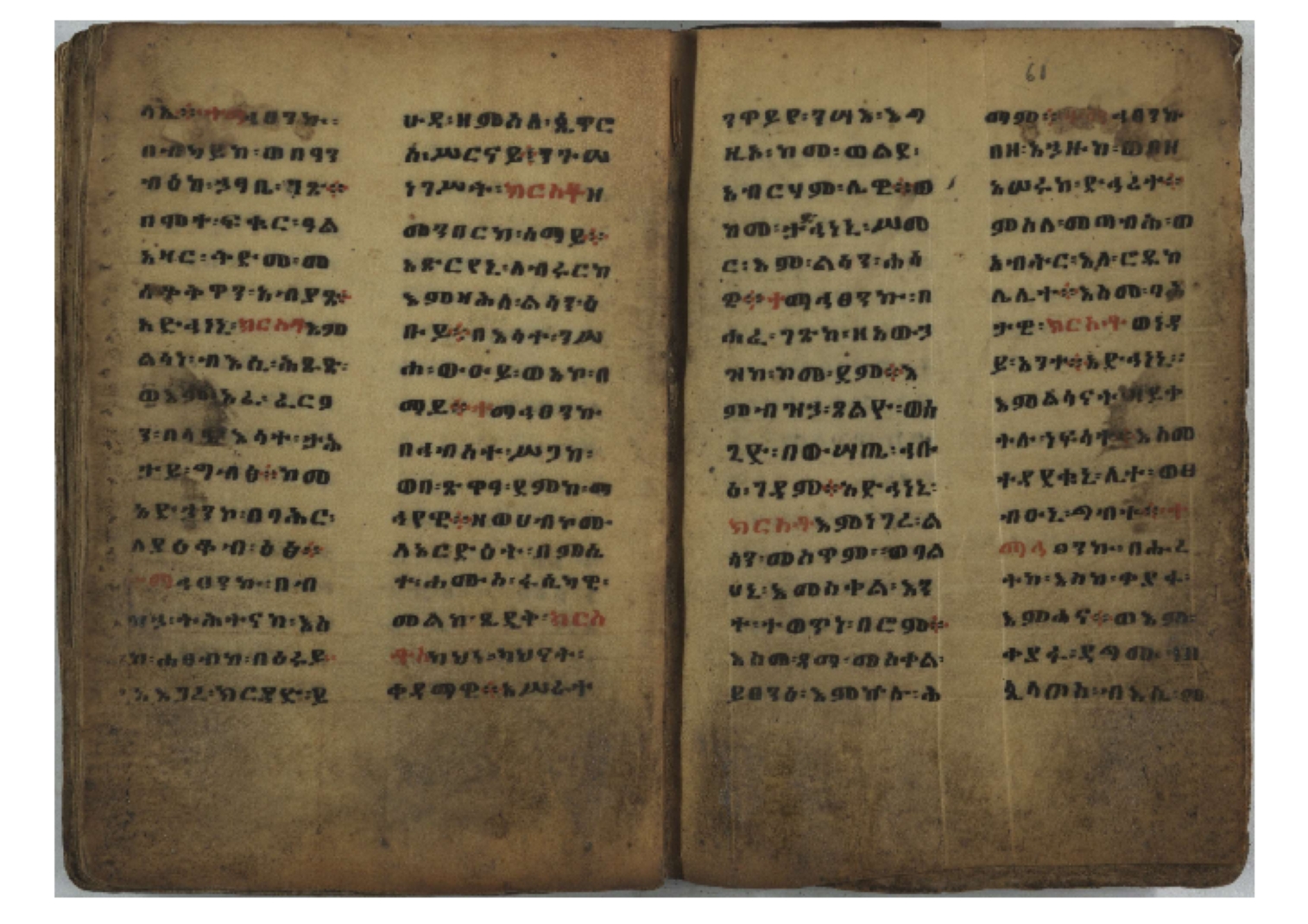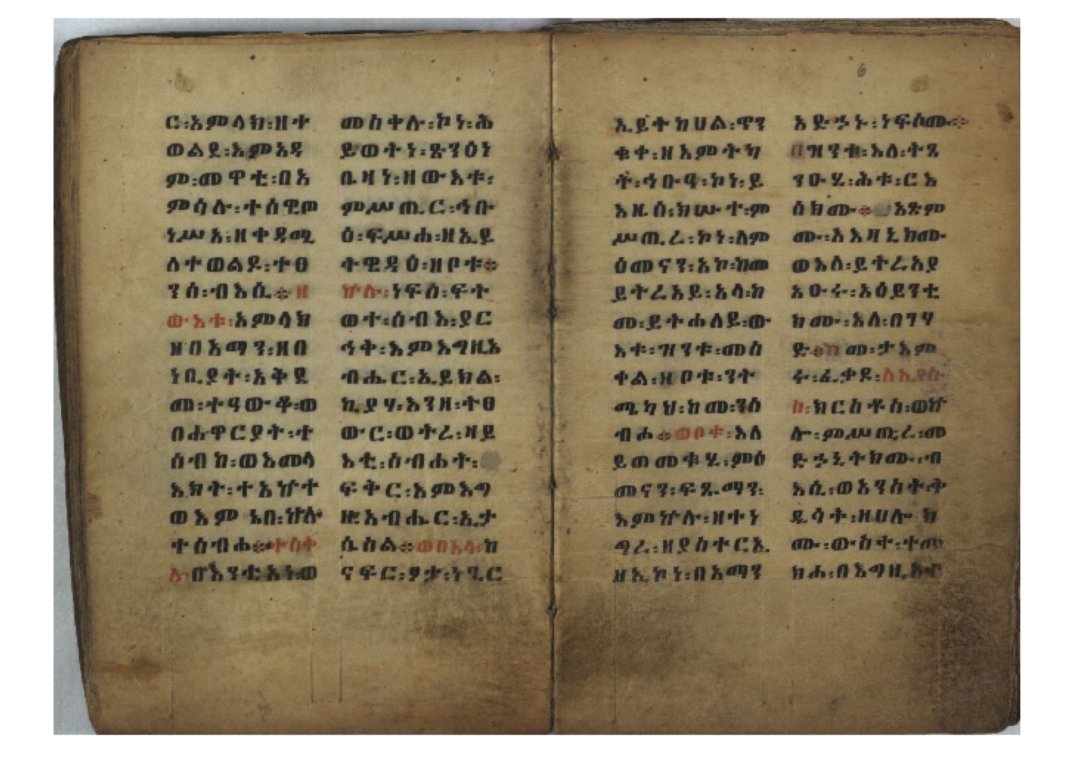 1. F. 1v: text of probable protective content. It consists of 5 poorly readable lines. Incipit: ፆዮ፡ ዸዶ፡ ጸጶ፡ በእሉ፡ ፯ቱ፡ አስማተ፡ እግዚአብሔር፡ etc. 2. F. 2r: Protective prayer. The conclusion is not legible because the ink is washed away. Incipit: ቃልያን። እግዚኦ፡ በዓትከን። እግዚኦ፡ አምላኪየ፡ ብከ፡ ተወከልኵን። አድኅነኒን። እስከማዕዜኑን። ዕቀበኒን። እግዚ፡ ስምዓኒ፡ ጽድቅየን። አምላኪየ፡ አምላኪየን። ኀቤከን። 3. F. 65ra: Ownership note, partially washed away. The legible text states: ዝመጽሐፍ፡ ዘ…፡ ወውልዱ፡ …. The entire text on f. 65rb has been washed away. 4. Ff. 65va–66va: Protective prayers and text of unknown content. The ink is mostly washed away and the texts are poorly legible. 5. Ff. 66va–b: Mälkǝʾ-hymn (Chaine nr. 170). The text is barely legible due to faded ink. Incipit: ሰላም፡ ለዝክረ፡ ስምኪ፡ ጸዳላ፡ ምሥራቅ፡ ወምዕራብ፡ |