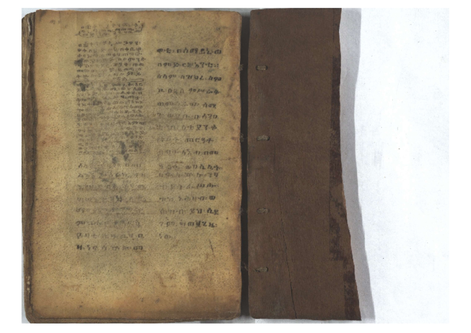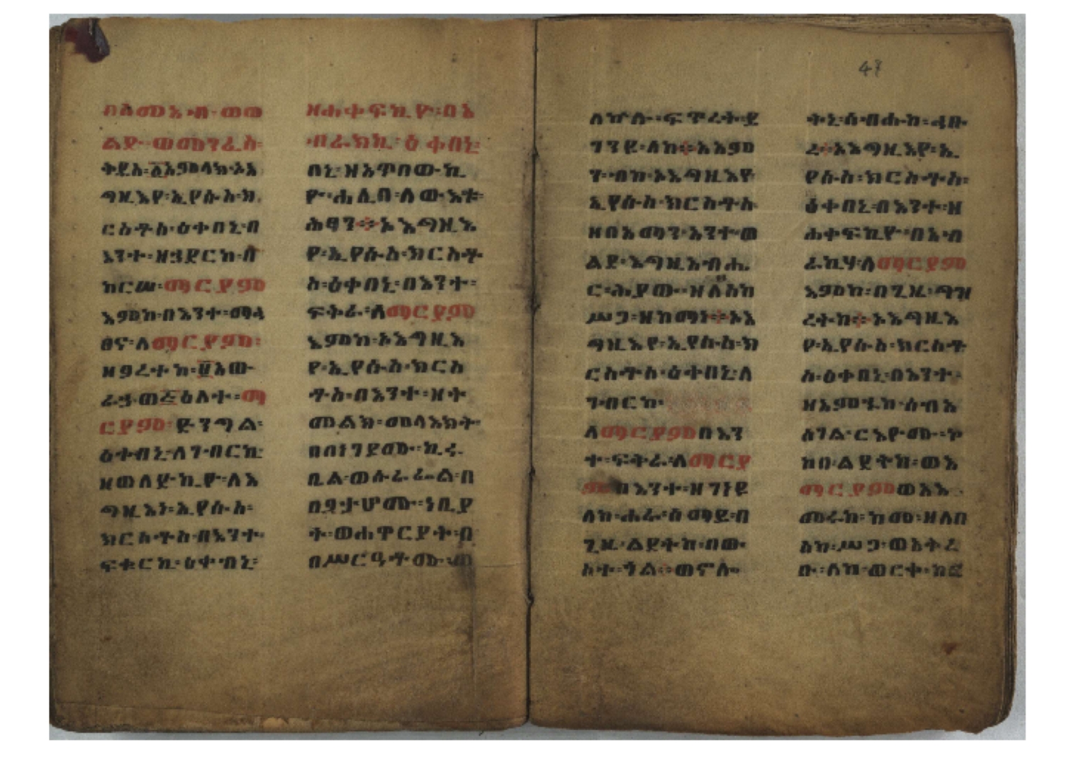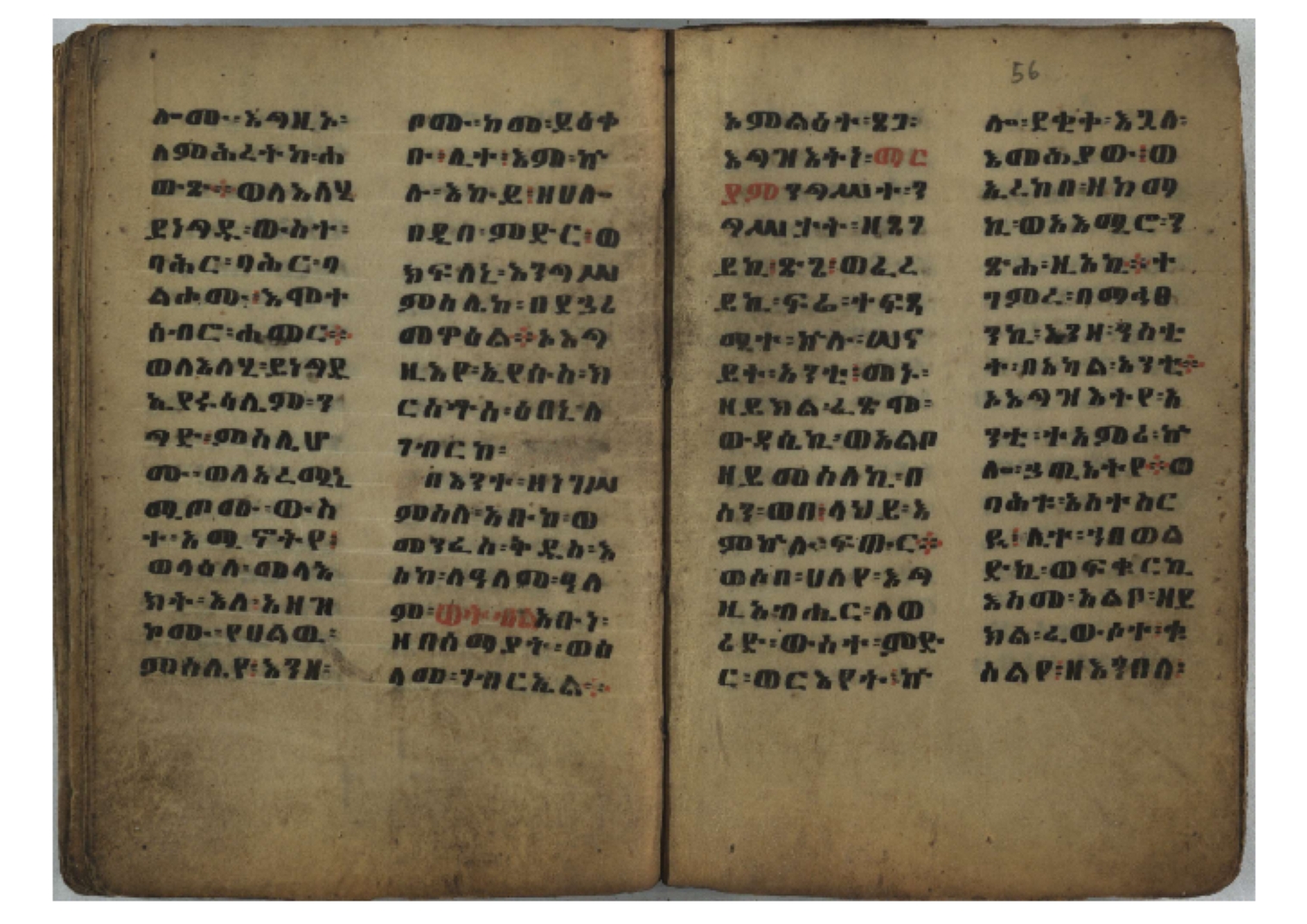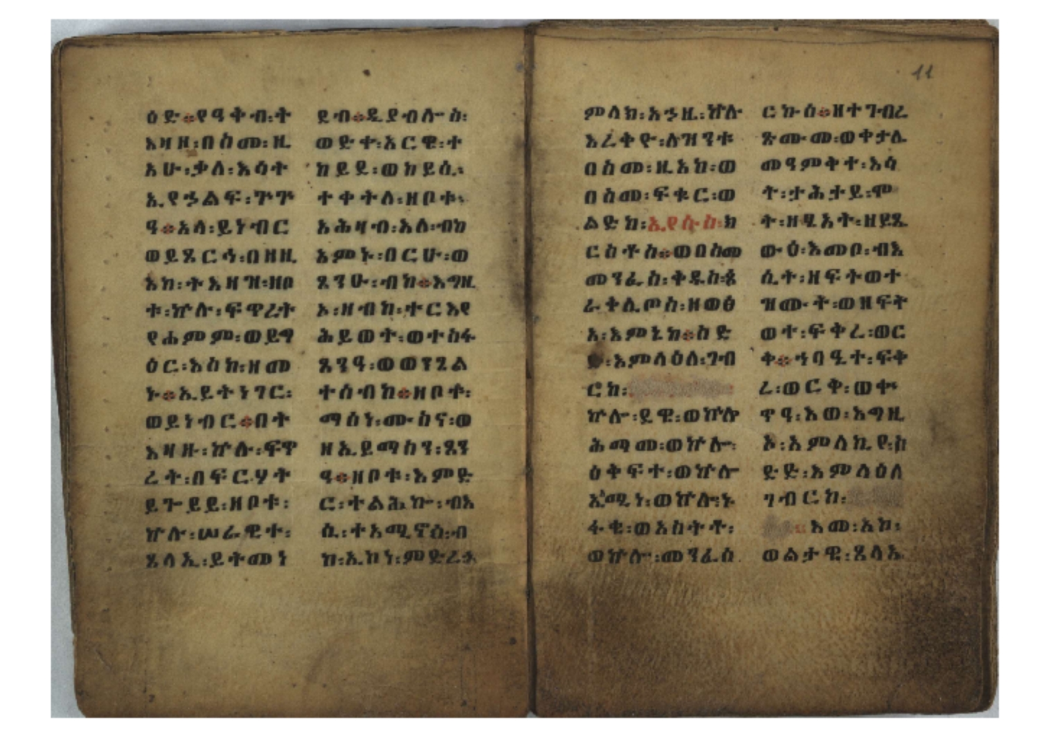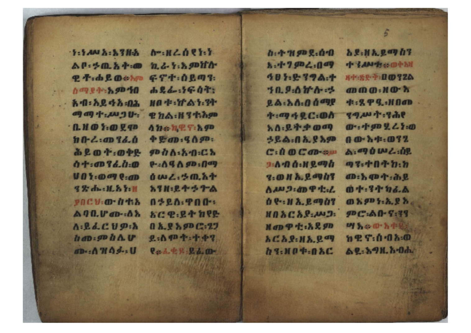 1. F. 1v: text of probable protective content. It consists of 5 poorly readable lines. Incipit: ፆዮ፡ ዸዶ፡ ጸጶ፡ በእሉ፡ ፯ቱ፡ አስማተ፡ እግዚአብሔር፡ etc. 2. F. 2r: Protective prayer. The conclusion is not legible because the ink is washed away. Incipit: ቃልያን። እግዚኦ፡ በዓትከን። እግዚኦ፡ አምላኪየ፡ ብከ፡ ተወከልኵን። አድኅነኒን። እስከማዕዜኑን። ዕቀበኒን። እግዚ፡ ስምዓኒ፡ ጽድቅየን። አምላኪየ፡ አምላኪየን። ኀቤከን። 3. F. 65ra: Ownership note, partially washed away. The legible text states: ዝመጽሐፍ፡ ዘ…፡ ወውልዱ፡ …. The entire text on f. 65rb has been washed away. 4. Ff. 65va–66va: Protective prayers and text of unknown content. The ink is mostly washed away and the texts are poorly legible. 5. Ff. 66va–b: Mälkǝʾ-hymn (Chaine nr. 170). The text is barely legible due to faded ink. Incipit: ሰላም፡ ለዝክረ፡ ስምኪ፡ ጸዳላ፡ ምሥራቅ፡ ወምዕራብ፡ |