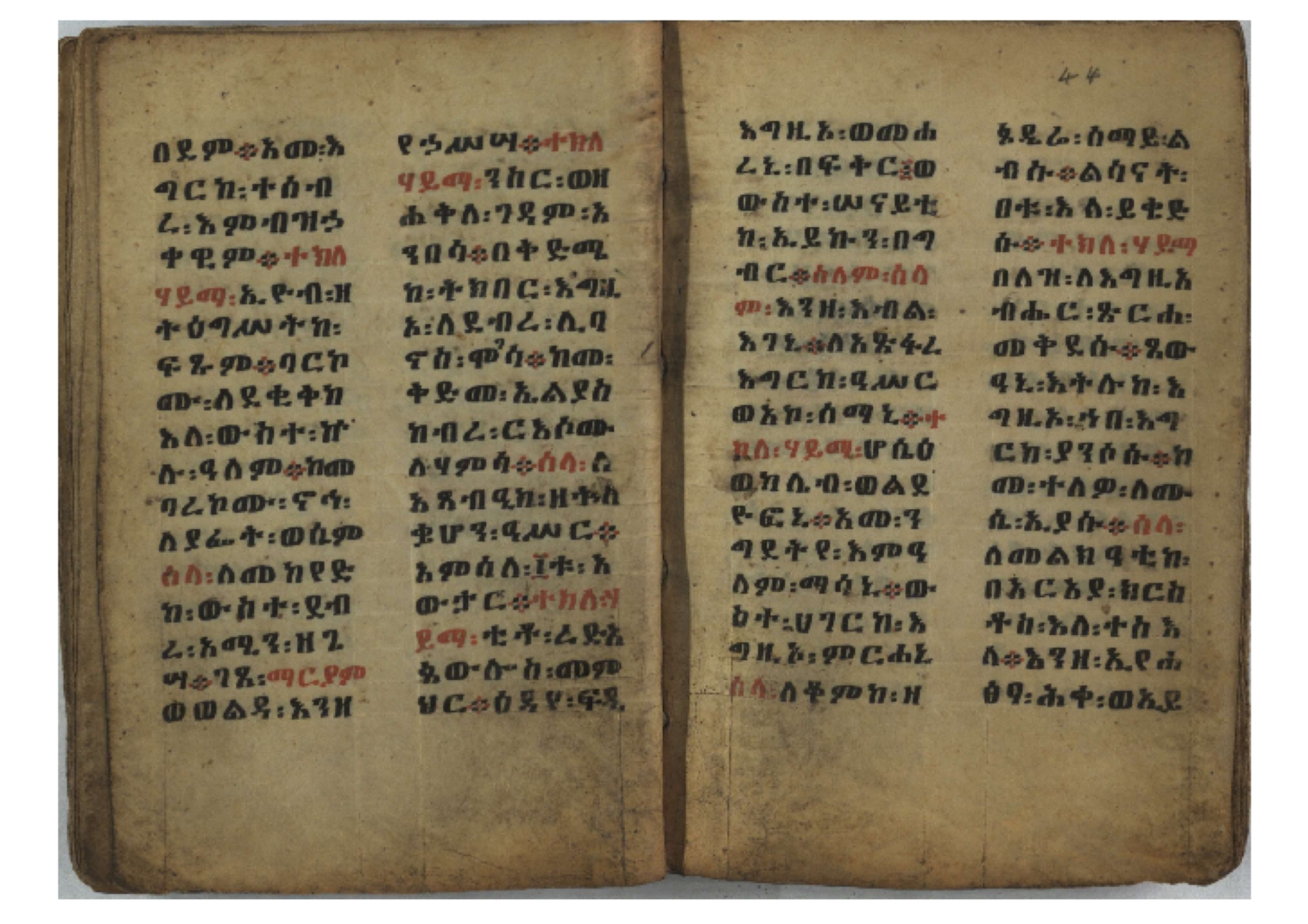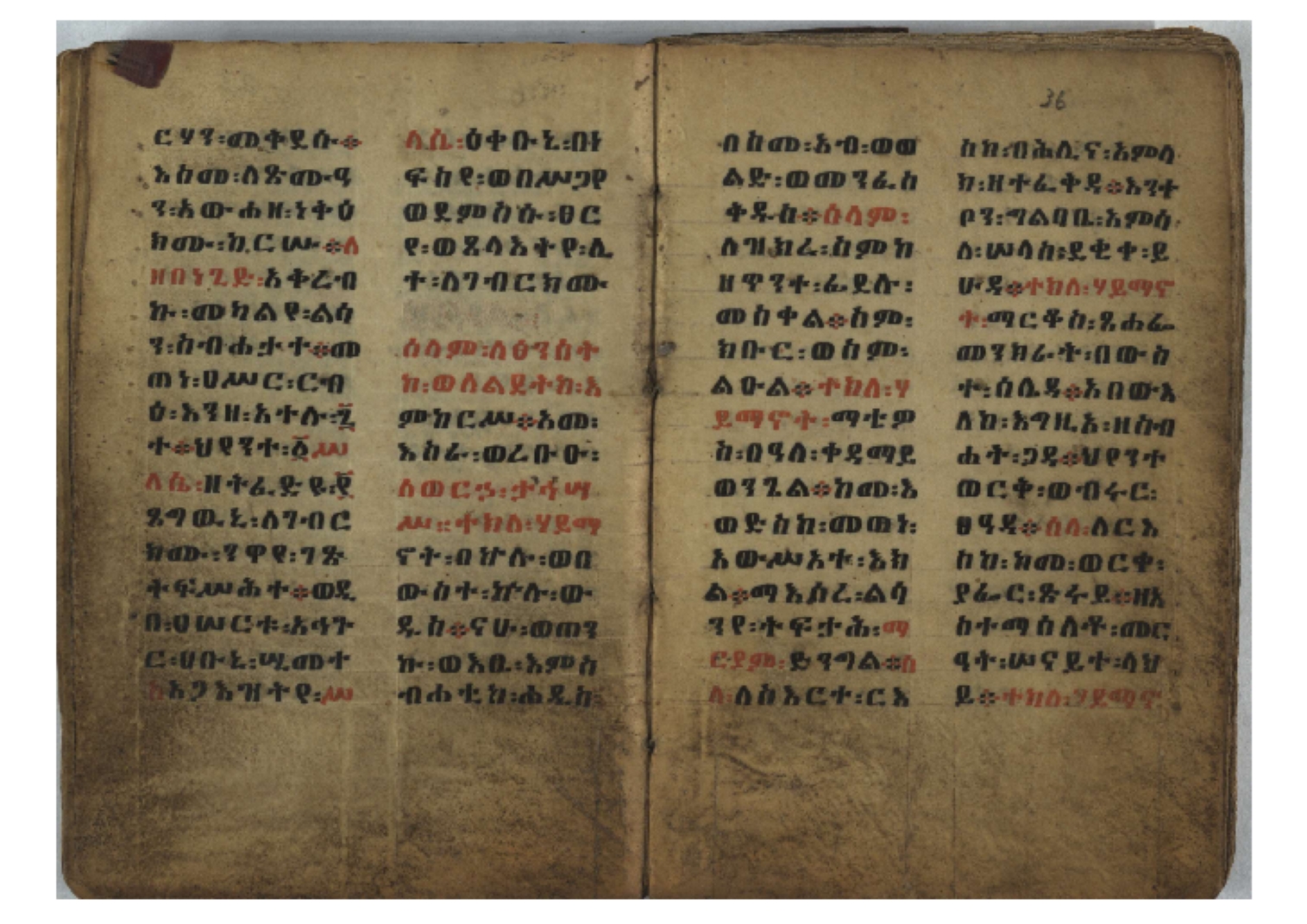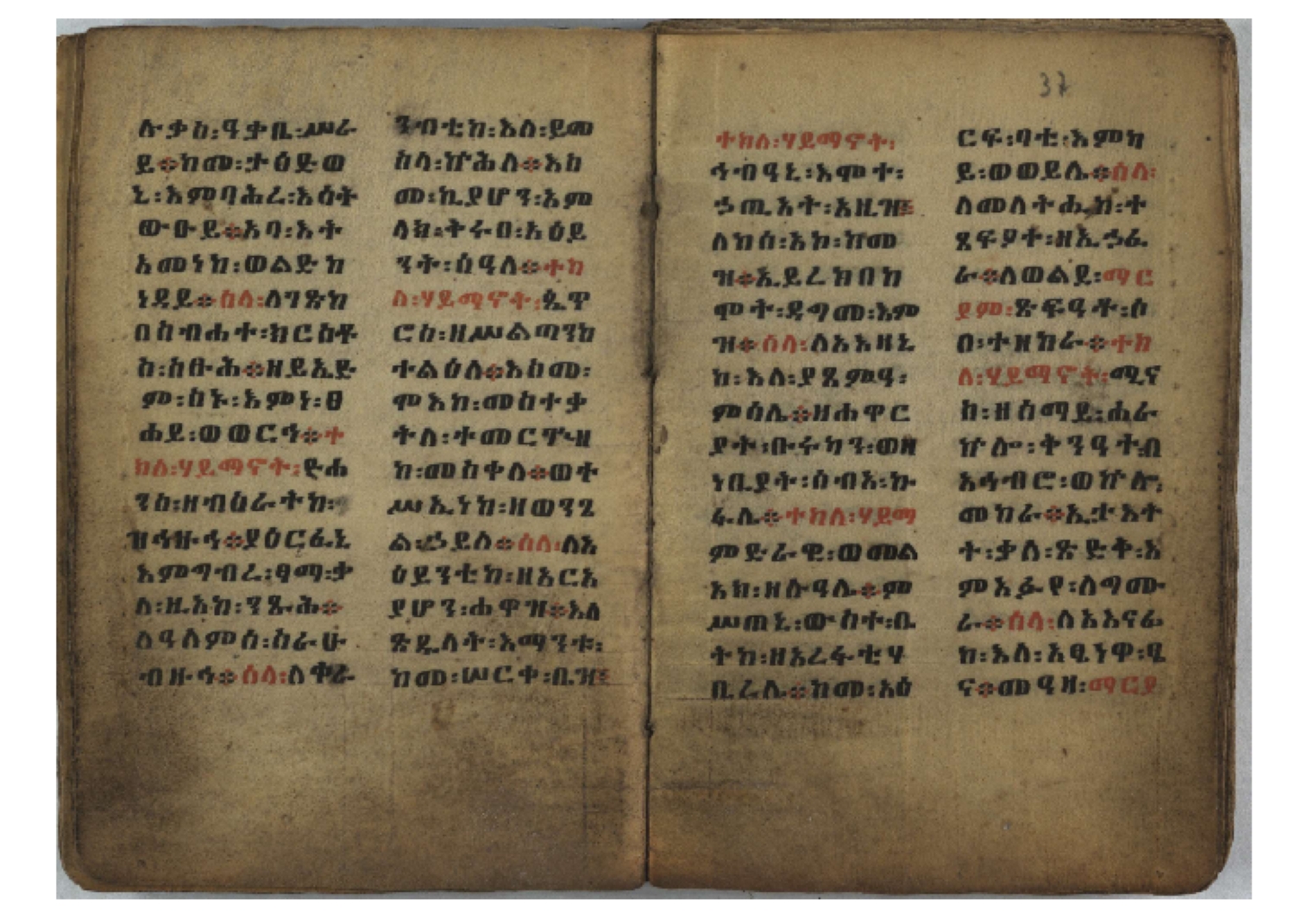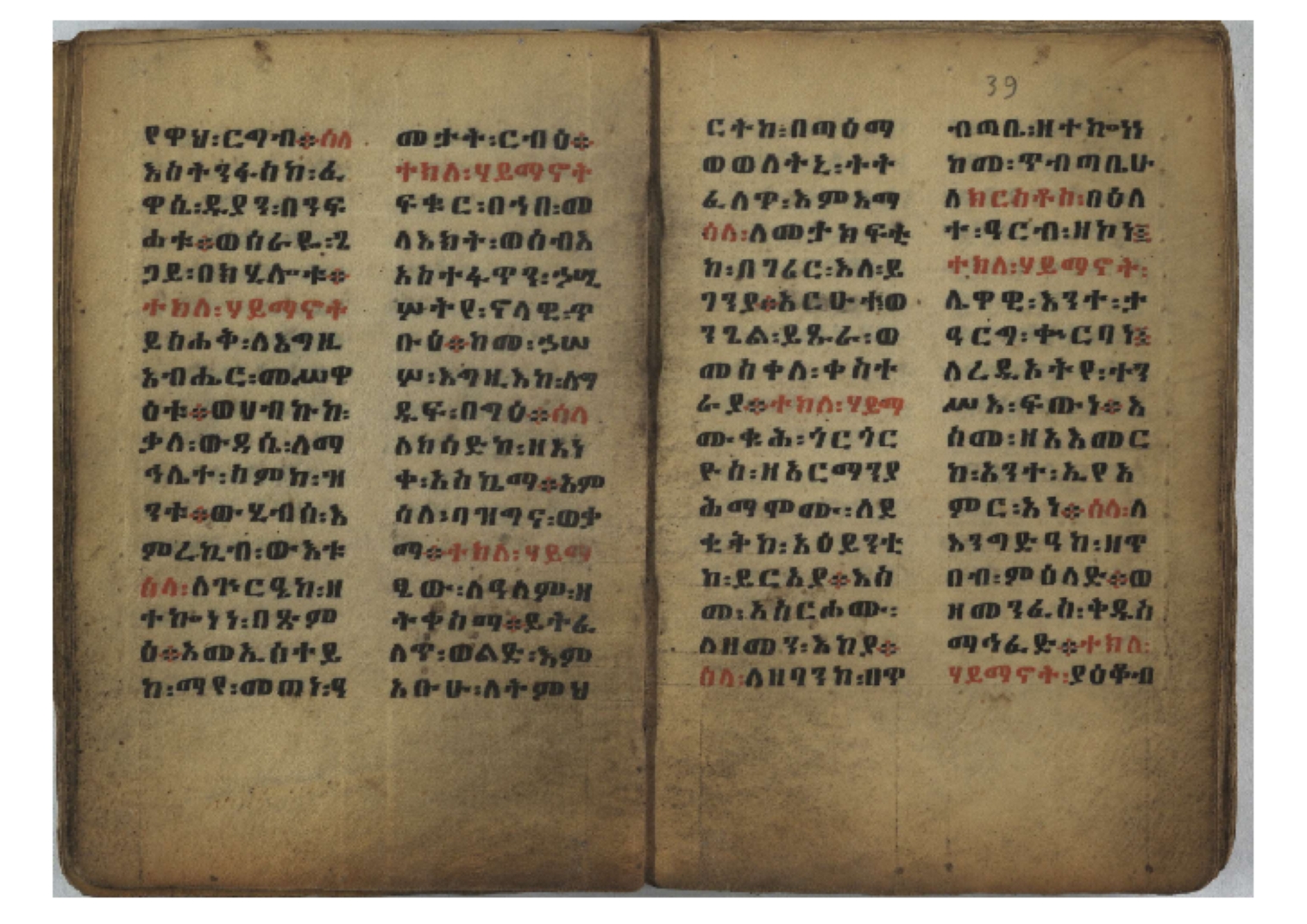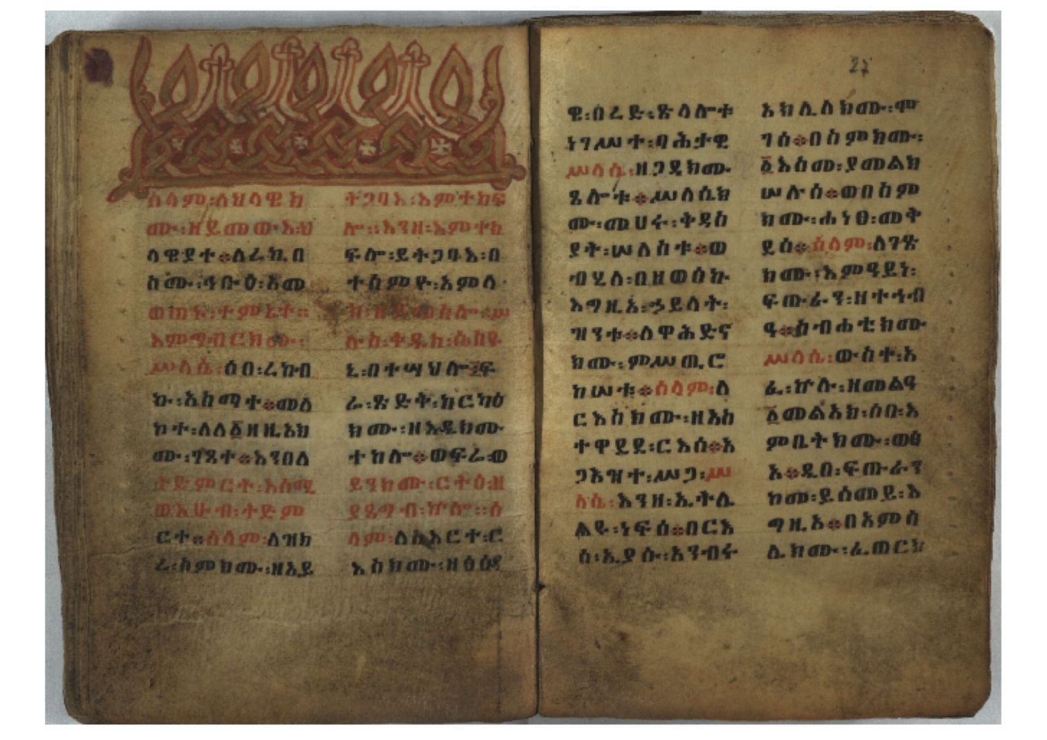 Ff. 3r–8vb: Tǝmhǝrtä ḫǝbuʾat (“The Doctrine of Mysteries”) Incipit: በእንተ፡ ትምህረተ፡ ኅቡዓት፡ ቅድመ፡ ዘትትነገር፡ እምጵርስፎራ፡ ለምዕመናን፡ ኅቡዓት[፡] ትምህርተ፡ ኅቡዓትሰ፡ ከመዝ፡ ንግር፡ ዘቅድመ፡ ሀሎ፡ ወይሄሉ፡ ዘመጽአ፡ ዘሐመ፡ ወሞተ፡ ወተቀብረ፡ ወተንሥአ፡ Ff. 9ra–12ra: Ǝgziʾabǝḥer zä-bǝrhanat (“God of the Lights”) Incipit: እግዚአብሔር፡ ዘብርሃናት፡ እግዚአብሔር፡ ዘሥልጣናት፡ እግዚአብሔር፡ ዘአርእስተ[፡] መላእክት፡ ዘእምታሕተ፡ እኂዘትከ[፡] ኵሉ፡ ፍጥረት። ንጉሠ፡ ነገሥት፡ ወእግዚአ፡ አጋእዝት። F. 12a–17ra: Ṣälotä mädḫanit (“Prayer of salvation”) Incipit: በስመ፡ አብ፡ ወወልድ፡ ወመንፈስ፡ ቅዱስ፡ ፩አምላከ፡ ጸሎተ፡ መድ()ኃኒት፡ አስማተ፡ ኃይላት፡ ዘወረደ፡ እምአርያም። ሰለታዊ፡ ኤላዊ፡ ኤላዊ፡ ሕዝቅያህ፡ ሰሮባኤላዊ፡ ኬንያዊ፡ ዴጋና፡ Ff. 17vb–26rb: Mälkǝʾa Fanuʾel (Mälkǝʾ-hymn to Fanuʾel, Chaine nr. 166) Incipit: ሰላም፡ ለዝክረ፡ ስምከ፡ ዘይደልዎ፡ ተበፅዓ። እምኀበ፡ ኵሎሙ፡ ሰብእ፡ በተዚያንዎ[፡] ወተዛውይ። እስመ[፡] ቀዋሚሆሙ፡ አንተ፡ ዘትተግህ፡ ለተራድኦ። ፋኑኤል፡ ስመከ፡ ሶበ፡ እዌጥን[፡] ጸውዖ። Ff. 26vb–35vb: Mälkǝʾa Śǝllase (Mälkǝʾ-hymn to the Trinity, Chaine nr. 20) Incipit: ሰላም፡ ለህላዌክሙ፡ ዘይመውእ፡ ህላዌያተ። ለረኪበ[፡] ስሙ፡ ኅቡዕ፡ አመ[፡] ወጠኑ፡ ተምኔተ። እምግብርክሙ፡ ሥላሴ፡ ሶበ፡ ረከብኩ፡ አስማተ። Ff. 35vb–46rb: Mälkǝʾa Täklä Haymanot (Mälkǝʾ-hymn to Täklä Haymanot, Chaine nr. 211) Incipit: ሰላም፡ ለፅንሰትከ፡ ወለልደትከ፡ እምከርሥ። አመ፡ እስራ፡ ወረቡዑ፡ ለወርኃ፡ ታኅሣሥ። ተክለ፡ ሃይማኖት፡ በኵሉ፡ ወበውስተ፡ ኵሉ፡ ውዱስ። ናሁ፡ ወጠንኩ፡ ወእቤ፡ እምስብሐቲከ፡ ሐዲስ፡ Ff. 46va–58rb: ʿƎqäbänni (“Protect me”, Chaine nr. 371), long version. It includes a section telling how a Frank nobleman received the prayer from heaven. Incipit: በስመ፡ … ኦእግዚእየ፡ ኢየሱስ፡ ክርስቶስ፡ ዕቀበኒ፡ በእንተ፡ ዘኃደርከ፡ በከርሠ፡ ማርያም[፡] እምከ፡ በእንተ፡ ማኅፀና፡ ለማርያም፡ ዘፆረተከ፡ ፱አውራኃ፡ ወ፭ዕለተ፡ ማርያም፡ ድንግል፡ እቀብኒ፡ Ff. 58rb–65ra: Ṣälot bäʾəntä ləssanä säbʾa (“Prayer against the tongue of men”). Incipit: ናሁ፡ ተማኀፀንኩ፡ በኆኅያተ፡ ስምከ፡ ካፍ፡ ወበቀዳማይ፡ የውጣ፡ ዘፕንተ፡ ፈደሎን፡ አሌፍ። ከመ፡ ታድኅነኒ፡ ክርስቶ[ስ]፡ እምትንሣኤ፡ ልሳን፡ ወአፍ። |