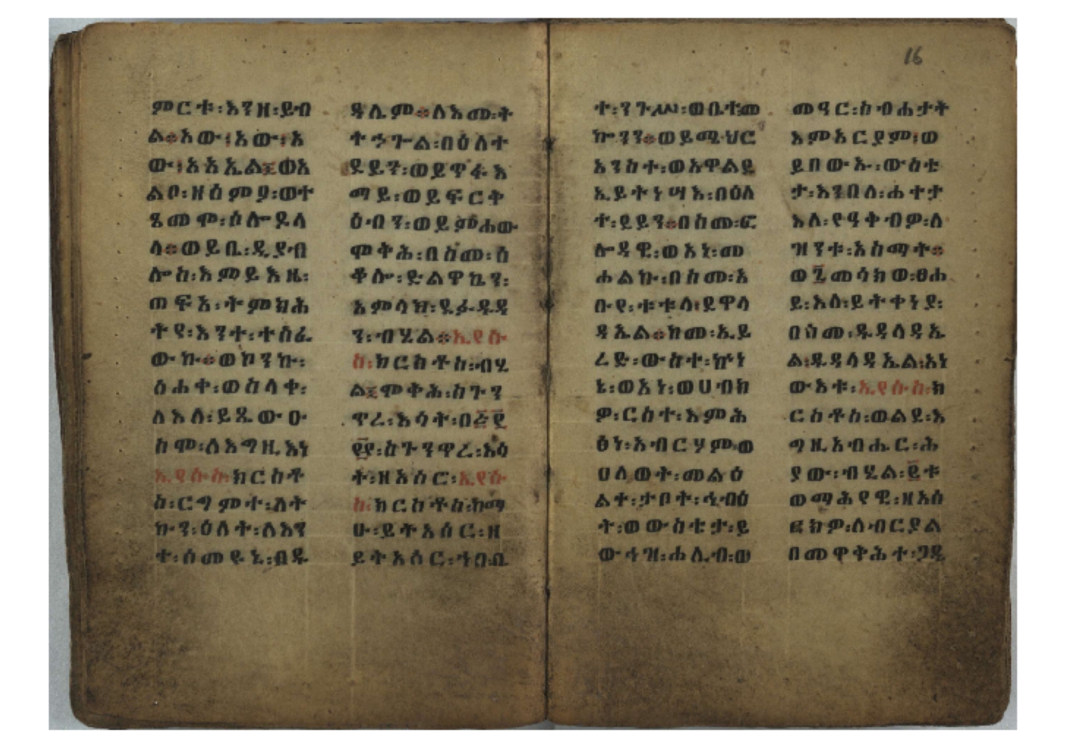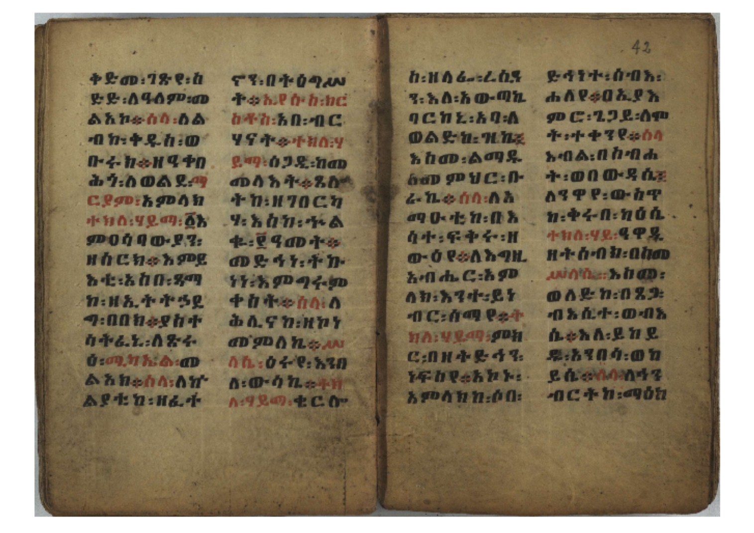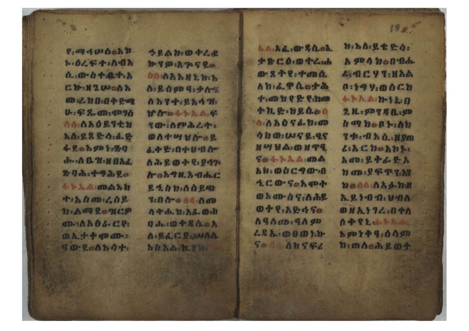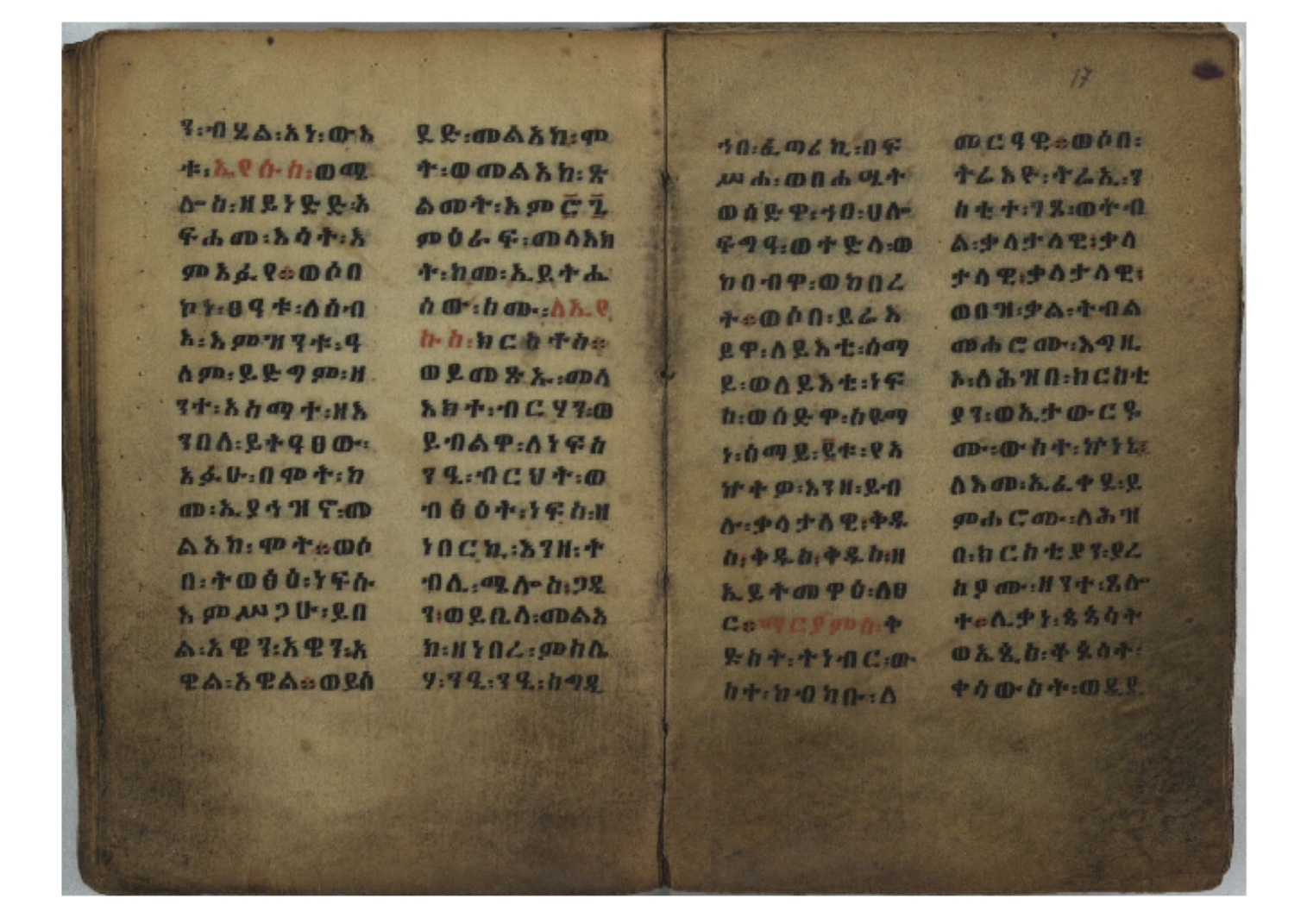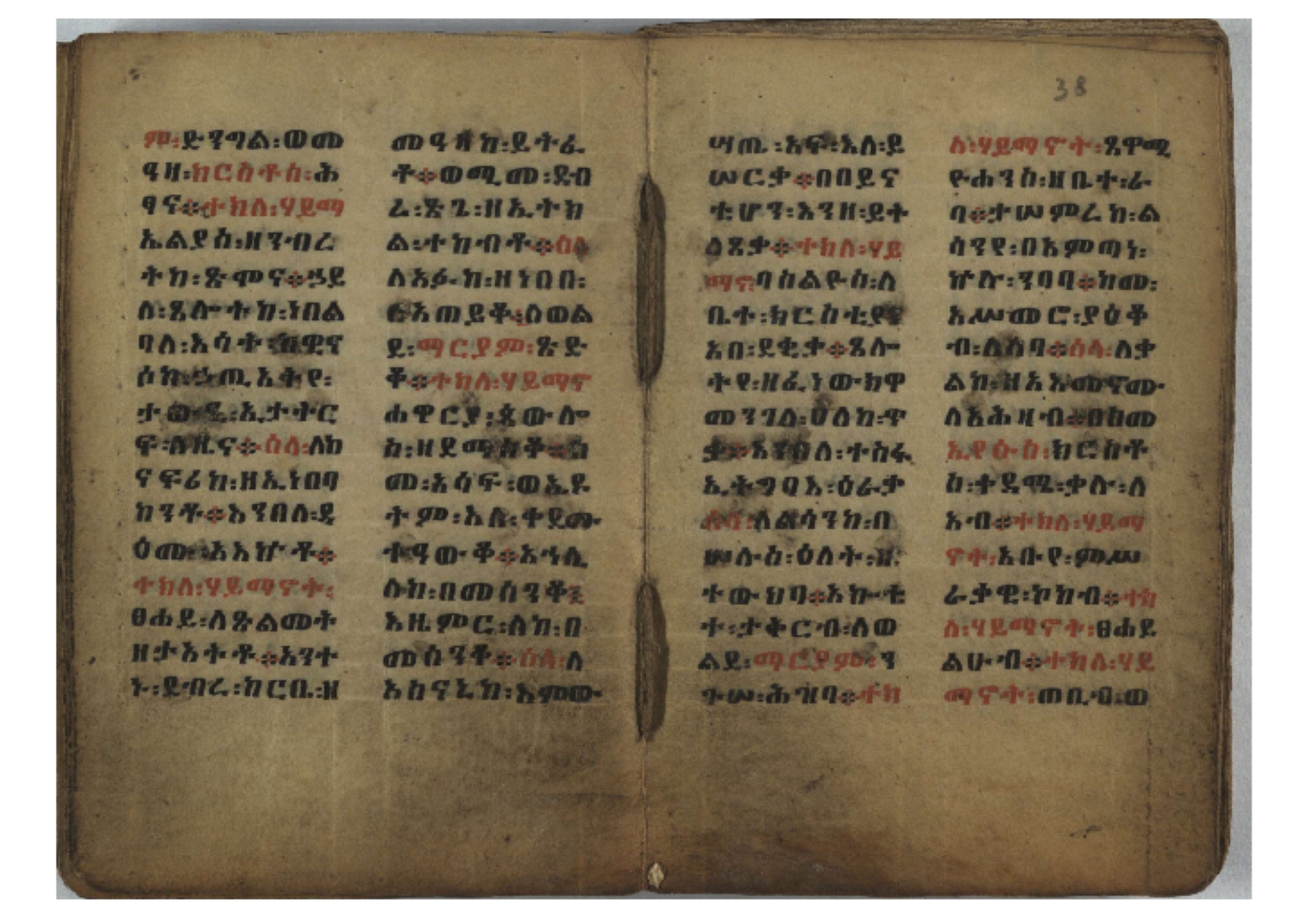 Ff. 3r–8vb: Tǝmhǝrtä ḫǝbuʾat (“The Doctrine of Mysteries”) Incipit: በእንተ፡ ትምህረተ፡ ኅቡዓት፡ ቅድመ፡ ዘትትነገር፡ እምጵርስፎራ፡ ለምዕመናን፡ ኅቡዓት[፡] ትምህርተ፡ ኅቡዓትሰ፡ ከመዝ፡ ንግር፡ ዘቅድመ፡ ሀሎ፡ ወይሄሉ፡ ዘመጽአ፡ ዘሐመ፡ ወሞተ፡ ወተቀብረ፡ ወተንሥአ፡ Ff. 9ra–12ra: Ǝgziʾabǝḥer zä-bǝrhanat (“God of the Lights”) Incipit: እግዚአብሔር፡ ዘብርሃናት፡ እግዚአብሔር፡ ዘሥልጣናት፡ እግዚአብሔር፡ ዘአርእስተ[፡] መላእክት፡ ዘእምታሕተ፡ እኂዘትከ[፡] ኵሉ፡ ፍጥረት። ንጉሠ፡ ነገሥት፡ ወእግዚአ፡ አጋእዝት። F. 12a–17ra: Ṣälotä mädḫanit (“Prayer of salvation”) Incipit: በስመ፡ አብ፡ ወወልድ፡ ወመንፈስ፡ ቅዱስ፡ ፩አምላከ፡ ጸሎተ፡ መድ()ኃኒት፡ አስማተ፡ ኃይላት፡ ዘወረደ፡ እምአርያም። ሰለታዊ፡ ኤላዊ፡ ኤላዊ፡ ሕዝቅያህ፡ ሰሮባኤላዊ፡ ኬንያዊ፡ ዴጋና፡ Ff. 17vb–26rb: Mälkǝʾa Fanuʾel (Mälkǝʾ-hymn to Fanuʾel, Chaine nr. 166) Incipit: ሰላም፡ ለዝክረ፡ ስምከ፡ ዘይደልዎ፡ ተበፅዓ። እምኀበ፡ ኵሎሙ፡ ሰብእ፡ በተዚያንዎ[፡] ወተዛውይ። እስመ[፡] ቀዋሚሆሙ፡ አንተ፡ ዘትተግህ፡ ለተራድኦ። ፋኑኤል፡ ስመከ፡ ሶበ፡ እዌጥን[፡] ጸውዖ። Ff. 26vb–35vb: Mälkǝʾa Śǝllase (Mälkǝʾ-hymn to the Trinity, Chaine nr. 20) Incipit: ሰላም፡ ለህላዌክሙ፡ ዘይመውእ፡ ህላዌያተ። ለረኪበ[፡] ስሙ፡ ኅቡዕ፡ አመ[፡] ወጠኑ፡ ተምኔተ። እምግብርክሙ፡ ሥላሴ፡ ሶበ፡ ረከብኩ፡ አስማተ። Ff. 35vb–46rb: Mälkǝʾa Täklä Haymanot (Mälkǝʾ-hymn to Täklä Haymanot, Chaine nr. 211) Incipit: ሰላም፡ ለፅንሰትከ፡ ወለልደትከ፡ እምከርሥ። አመ፡ እስራ፡ ወረቡዑ፡ ለወርኃ፡ ታኅሣሥ። ተክለ፡ ሃይማኖት፡ በኵሉ፡ ወበውስተ፡ ኵሉ፡ ውዱስ። ናሁ፡ ወጠንኩ፡ ወእቤ፡ እምስብሐቲከ፡ ሐዲስ፡ Ff. 46va–58rb: ʿƎqäbänni (“Protect me”, Chaine nr. 371), long version. It includes a section telling how a Frank nobleman received the prayer from heaven. Incipit: በስመ፡ … ኦእግዚእየ፡ ኢየሱስ፡ ክርስቶስ፡ ዕቀበኒ፡ በእንተ፡ ዘኃደርከ፡ በከርሠ፡ ማርያም[፡] እምከ፡ በእንተ፡ ማኅፀና፡ ለማርያም፡ ዘፆረተከ፡ ፱አውራኃ፡ ወ፭ዕለተ፡ ማርያም፡ ድንግል፡ እቀብኒ፡ Ff. 58rb–65ra: Ṣälot bäʾəntä ləssanä säbʾa (“Prayer against the tongue of men”). Incipit: ናሁ፡ ተማኀፀንኩ፡ በኆኅያተ፡ ስምከ፡ ካፍ፡ ወበቀዳማይ፡ የውጣ፡ ዘፕንተ፡ ፈደሎን፡ አሌፍ። ከመ፡ ታድኅነኒ፡ ክርስቶ[ስ]፡ እምትንሣኤ፡ ልሳን፡ ወአፍ። |