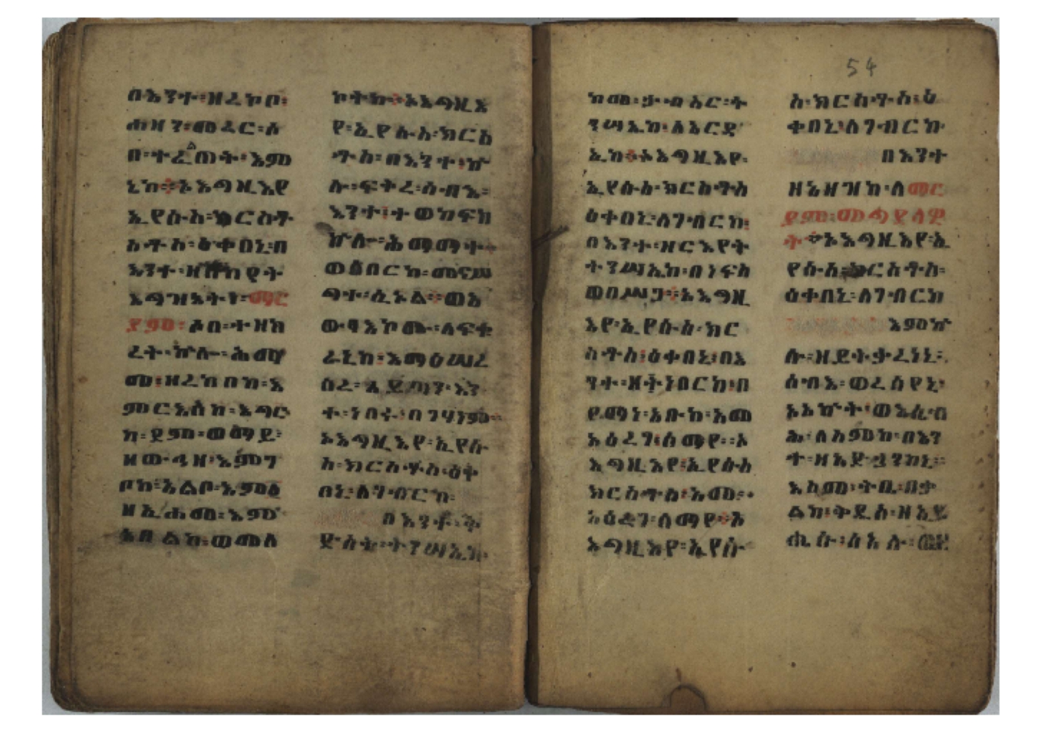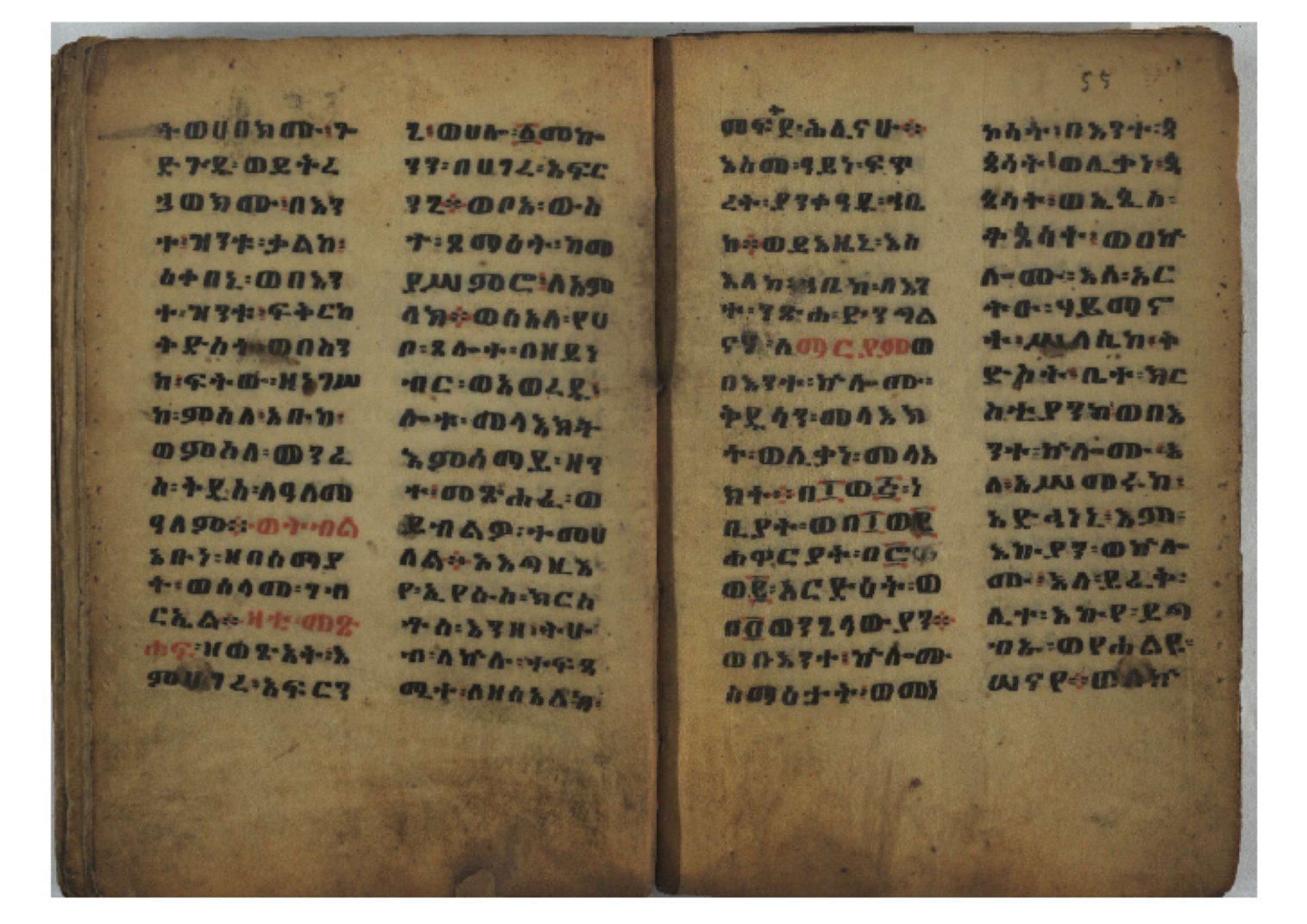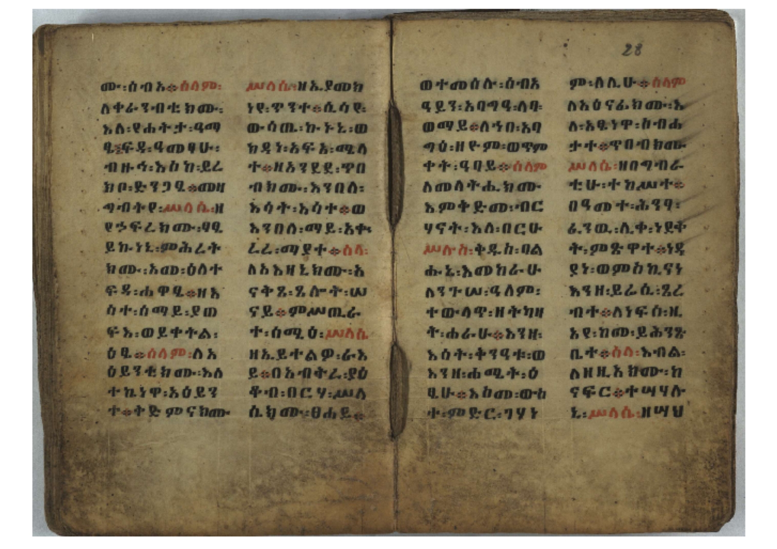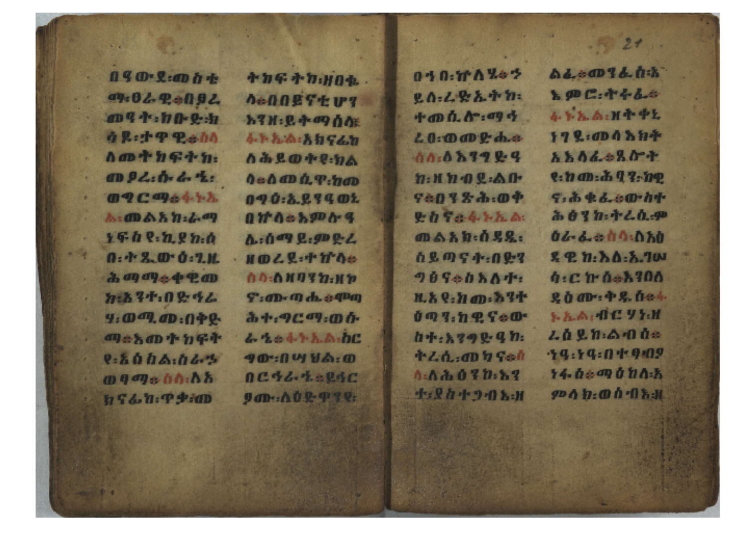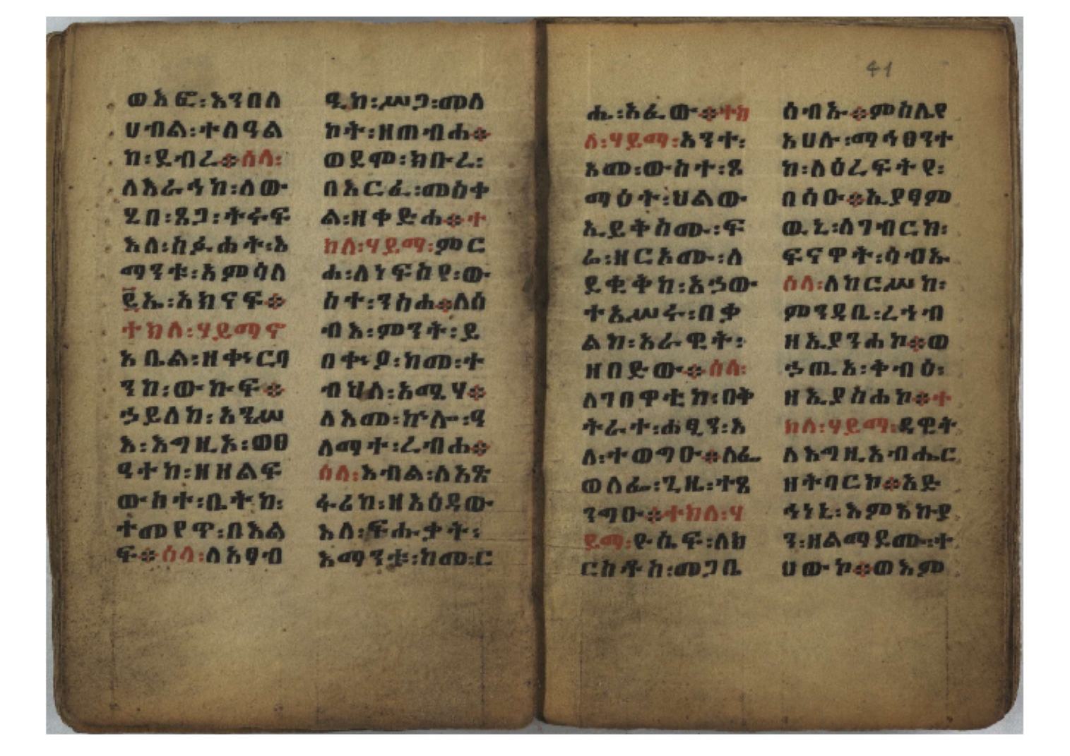 Ff. 3r–8vb: Tǝmhǝrtä ḫǝbuʾat (“The Doctrine of Mysteries”) Incipit: በእንተ፡ ትምህረተ፡ ኅቡዓት፡ ቅድመ፡ ዘትትነገር፡ እምጵርስፎራ፡ ለምዕመናን፡ ኅቡዓት[፡] ትምህርተ፡ ኅቡዓትሰ፡ ከመዝ፡ ንግር፡ ዘቅድመ፡ ሀሎ፡ ወይሄሉ፡ ዘመጽአ፡ ዘሐመ፡ ወሞተ፡ ወተቀብረ፡ ወተንሥአ፡ Ff. 9ra–12ra: Ǝgziʾabǝḥer zä-bǝrhanat (“God of the Lights”) Incipit: እግዚአብሔር፡ ዘብርሃናት፡ እግዚአብሔር፡ ዘሥልጣናት፡ እግዚአብሔር፡ ዘአርእስተ[፡] መላእክት፡ ዘእምታሕተ፡ እኂዘትከ[፡] ኵሉ፡ ፍጥረት። ንጉሠ፡ ነገሥት፡ ወእግዚአ፡ አጋእዝት። F. 12a–17ra: Ṣälotä mädḫanit (“Prayer of salvation”) Incipit: በስመ፡ አብ፡ ወወልድ፡ ወመንፈስ፡ ቅዱስ፡ ፩አምላከ፡ ጸሎተ፡ መድ()ኃኒት፡ አስማተ፡ ኃይላት፡ ዘወረደ፡ እምአርያም። ሰለታዊ፡ ኤላዊ፡ ኤላዊ፡ ሕዝቅያህ፡ ሰሮባኤላዊ፡ ኬንያዊ፡ ዴጋና፡ Ff. 17vb–26rb: Mälkǝʾa Fanuʾel (Mälkǝʾ-hymn to Fanuʾel, Chaine nr. 166) Incipit: ሰላም፡ ለዝክረ፡ ስምከ፡ ዘይደልዎ፡ ተበፅዓ። እምኀበ፡ ኵሎሙ፡ ሰብእ፡ በተዚያንዎ[፡] ወተዛውይ። እስመ[፡] ቀዋሚሆሙ፡ አንተ፡ ዘትተግህ፡ ለተራድኦ። ፋኑኤል፡ ስመከ፡ ሶበ፡ እዌጥን[፡] ጸውዖ። Ff. 26vb–35vb: Mälkǝʾa Śǝllase (Mälkǝʾ-hymn to the Trinity, Chaine nr. 20) Incipit: ሰላም፡ ለህላዌክሙ፡ ዘይመውእ፡ ህላዌያተ። ለረኪበ[፡] ስሙ፡ ኅቡዕ፡ አመ[፡] ወጠኑ፡ ተምኔተ። እምግብርክሙ፡ ሥላሴ፡ ሶበ፡ ረከብኩ፡ አስማተ። Ff. 35vb–46rb: Mälkǝʾa Täklä Haymanot (Mälkǝʾ-hymn to Täklä Haymanot, Chaine nr. 211) Incipit: ሰላም፡ ለፅንሰትከ፡ ወለልደትከ፡ እምከርሥ። አመ፡ እስራ፡ ወረቡዑ፡ ለወርኃ፡ ታኅሣሥ። ተክለ፡ ሃይማኖት፡ በኵሉ፡ ወበውስተ፡ ኵሉ፡ ውዱስ። ናሁ፡ ወጠንኩ፡ ወእቤ፡ እምስብሐቲከ፡ ሐዲስ፡ Ff. 46va–58rb: ʿƎqäbänni (“Protect me”, Chaine nr. 371), long version. It includes a section telling how a Frank nobleman received the prayer from heaven. Incipit: በስመ፡ … ኦእግዚእየ፡ ኢየሱስ፡ ክርስቶስ፡ ዕቀበኒ፡ በእንተ፡ ዘኃደርከ፡ በከርሠ፡ ማርያም[፡] እምከ፡ በእንተ፡ ማኅፀና፡ ለማርያም፡ ዘፆረተከ፡ ፱አውራኃ፡ ወ፭ዕለተ፡ ማርያም፡ ድንግል፡ እቀብኒ፡ Ff. 58rb–65ra: Ṣälot bäʾəntä ləssanä säbʾa (“Prayer against the tongue of men”). Incipit: ናሁ፡ ተማኀፀንኩ፡ በኆኅያተ፡ ስምከ፡ ካፍ፡ ወበቀዳማይ፡ የውጣ፡ ዘፕንተ፡ ፈደሎን፡ አሌፍ። ከመ፡ ታድኅነኒ፡ ክርስቶ[ስ]፡ እምትንሣኤ፡ ልሳን፡ ወአፍ። |