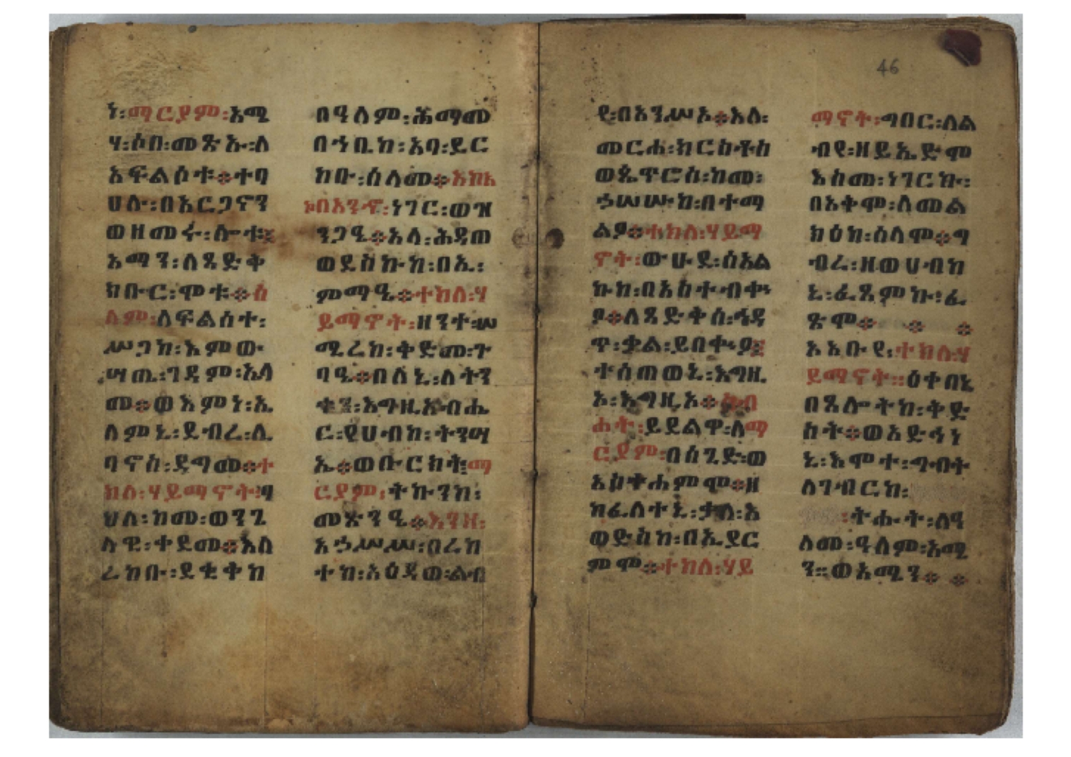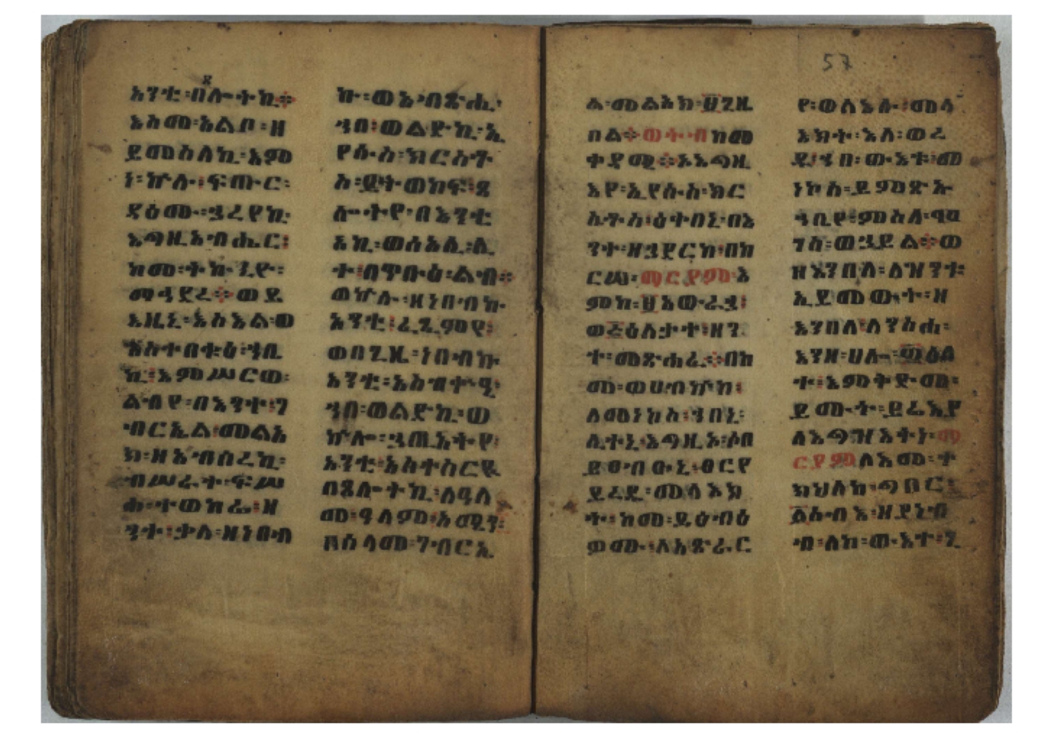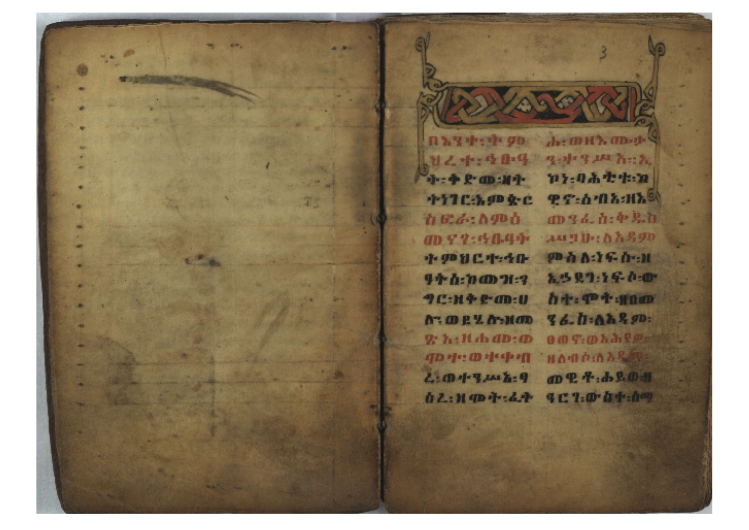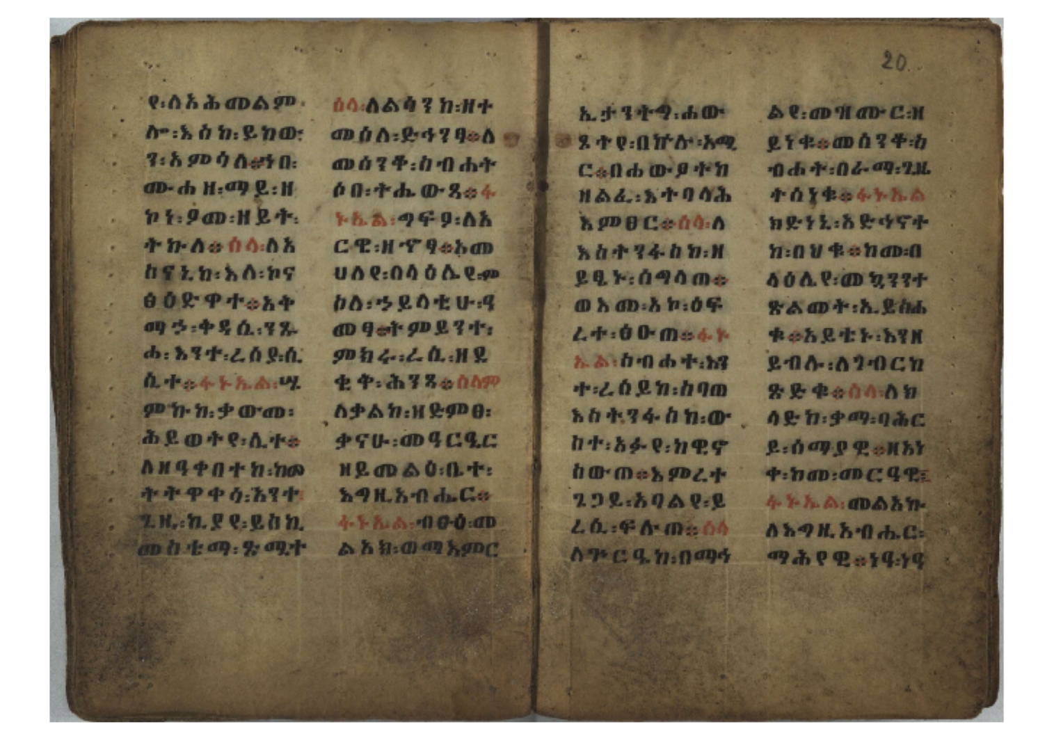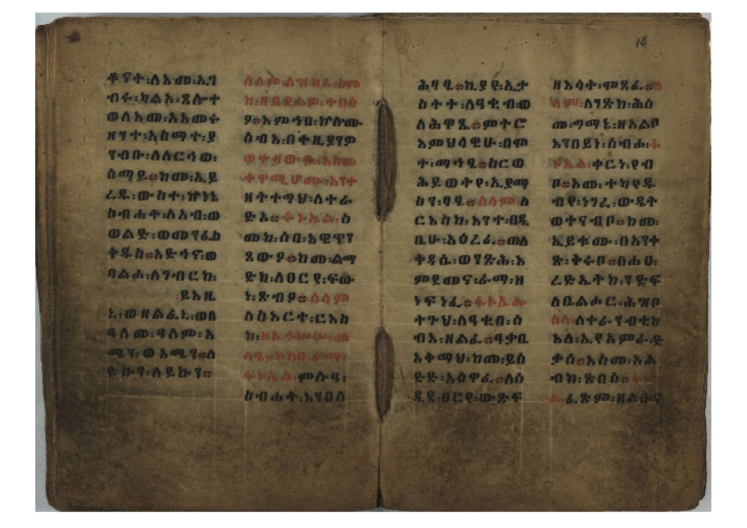 Ff. 3r–8vb: Tǝmhǝrtä ḫǝbuʾat (“The Doctrine of Mysteries”) Incipit: በእንተ፡ ትምህረተ፡ ኅቡዓት፡ ቅድመ፡ ዘትትነገር፡ እምጵርስፎራ፡ ለምዕመናን፡ ኅቡዓት[፡] ትምህርተ፡ ኅቡዓትሰ፡ ከመዝ፡ ንግር፡ ዘቅድመ፡ ሀሎ፡ ወይሄሉ፡ ዘመጽአ፡ ዘሐመ፡ ወሞተ፡ ወተቀብረ፡ ወተንሥአ፡ Ff. 9ra–12ra: Ǝgziʾabǝḥer zä-bǝrhanat (“God of the Lights”) Incipit: እግዚአብሔር፡ ዘብርሃናት፡ እግዚአብሔር፡ ዘሥልጣናት፡ እግዚአብሔር፡ ዘአርእስተ[፡] መላእክት፡ ዘእምታሕተ፡ እኂዘትከ[፡] ኵሉ፡ ፍጥረት። ንጉሠ፡ ነገሥት፡ ወእግዚአ፡ አጋእዝት። F. 12a–17ra: Ṣälotä mädḫanit (“Prayer of salvation”) Incipit: በስመ፡ አብ፡ ወወልድ፡ ወመንፈስ፡ ቅዱስ፡ ፩አምላከ፡ ጸሎተ፡ መድ()ኃኒት፡ አስማተ፡ ኃይላት፡ ዘወረደ፡ እምአርያም። ሰለታዊ፡ ኤላዊ፡ ኤላዊ፡ ሕዝቅያህ፡ ሰሮባኤላዊ፡ ኬንያዊ፡ ዴጋና፡ Ff. 17vb–26rb: Mälkǝʾa Fanuʾel (Mälkǝʾ-hymn to Fanuʾel, Chaine nr. 166) Incipit: ሰላም፡ ለዝክረ፡ ስምከ፡ ዘይደልዎ፡ ተበፅዓ። እምኀበ፡ ኵሎሙ፡ ሰብእ፡ በተዚያንዎ[፡] ወተዛውይ። እስመ[፡] ቀዋሚሆሙ፡ አንተ፡ ዘትተግህ፡ ለተራድኦ። ፋኑኤል፡ ስመከ፡ ሶበ፡ እዌጥን[፡] ጸውዖ። Ff. 26vb–35vb: Mälkǝʾa Śǝllase (Mälkǝʾ-hymn to the Trinity, Chaine nr. 20) Incipit: ሰላም፡ ለህላዌክሙ፡ ዘይመውእ፡ ህላዌያተ። ለረኪበ[፡] ስሙ፡ ኅቡዕ፡ አመ[፡] ወጠኑ፡ ተምኔተ። እምግብርክሙ፡ ሥላሴ፡ ሶበ፡ ረከብኩ፡ አስማተ። Ff. 35vb–46rb: Mälkǝʾa Täklä Haymanot (Mälkǝʾ-hymn to Täklä Haymanot, Chaine nr. 211) Incipit: ሰላም፡ ለፅንሰትከ፡ ወለልደትከ፡ እምከርሥ። አመ፡ እስራ፡ ወረቡዑ፡ ለወርኃ፡ ታኅሣሥ። ተክለ፡ ሃይማኖት፡ በኵሉ፡ ወበውስተ፡ ኵሉ፡ ውዱስ። ናሁ፡ ወጠንኩ፡ ወእቤ፡ እምስብሐቲከ፡ ሐዲስ፡ Ff. 46va–58rb: ʿƎqäbänni (“Protect me”, Chaine nr. 371), long version. It includes a section telling how a Frank nobleman received the prayer from heaven. Incipit: በስመ፡ … ኦእግዚእየ፡ ኢየሱስ፡ ክርስቶስ፡ ዕቀበኒ፡ በእንተ፡ ዘኃደርከ፡ በከርሠ፡ ማርያም[፡] እምከ፡ በእንተ፡ ማኅፀና፡ ለማርያም፡ ዘፆረተከ፡ ፱አውራኃ፡ ወ፭ዕለተ፡ ማርያም፡ ድንግል፡ እቀብኒ፡ Ff. 58rb–65ra: Ṣälot bäʾəntä ləssanä säbʾa (“Prayer against the tongue of men”). Incipit: ናሁ፡ ተማኀፀንኩ፡ በኆኅያተ፡ ስምከ፡ ካፍ፡ ወበቀዳማይ፡ የውጣ፡ ዘፕንተ፡ ፈደሎን፡ አሌፍ። ከመ፡ ታድኅነኒ፡ ክርስቶ[ስ]፡ እምትንሣኤ፡ ልሳን፡ ወአፍ። |