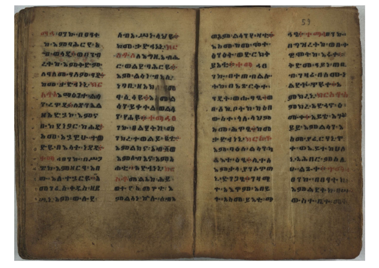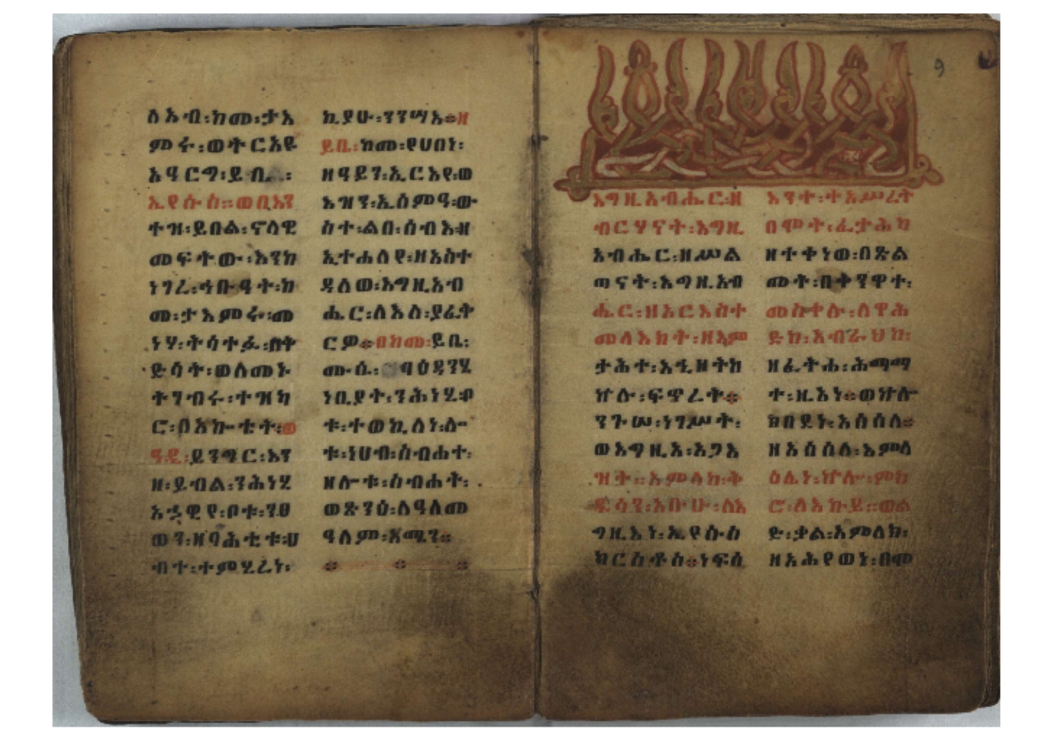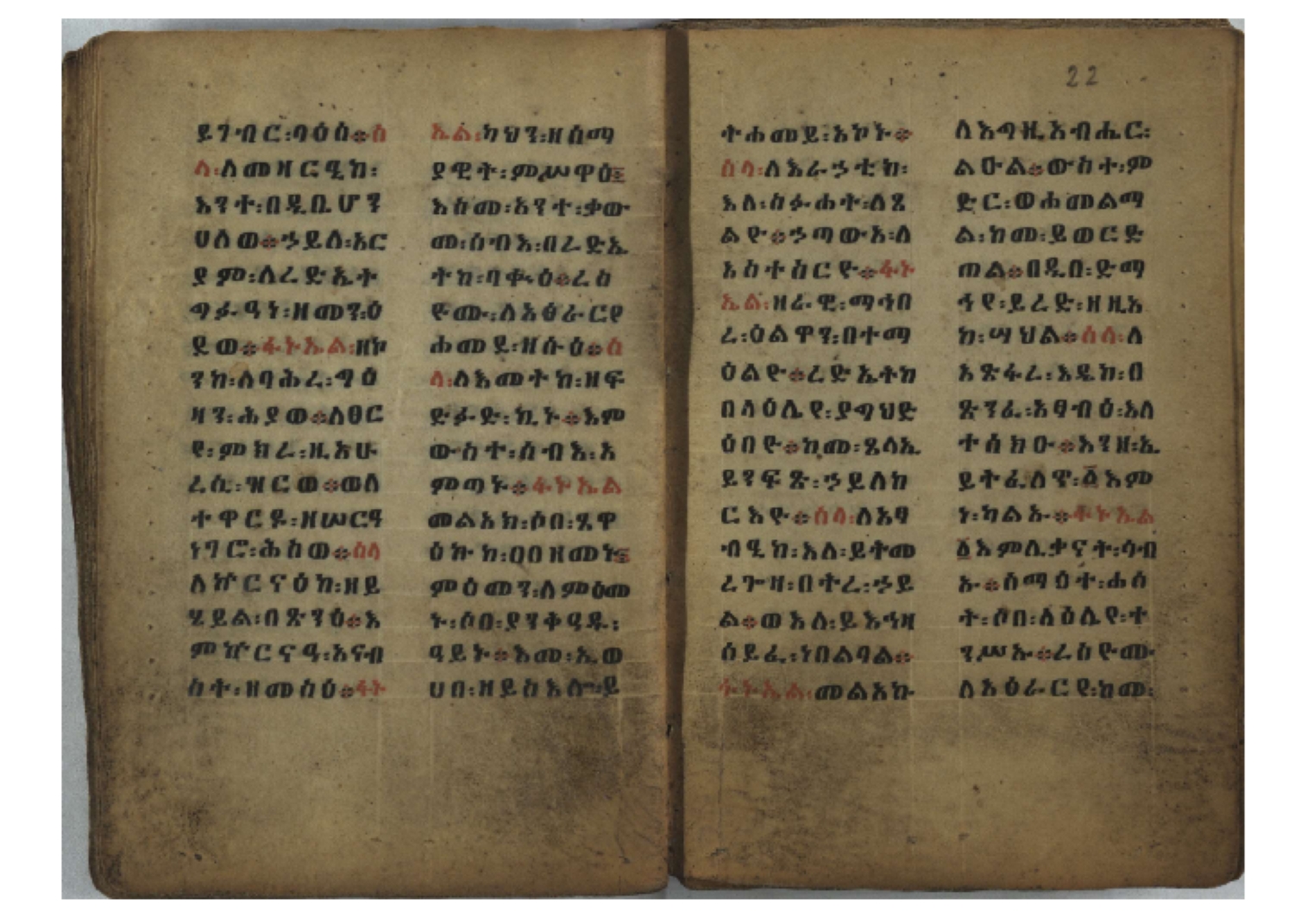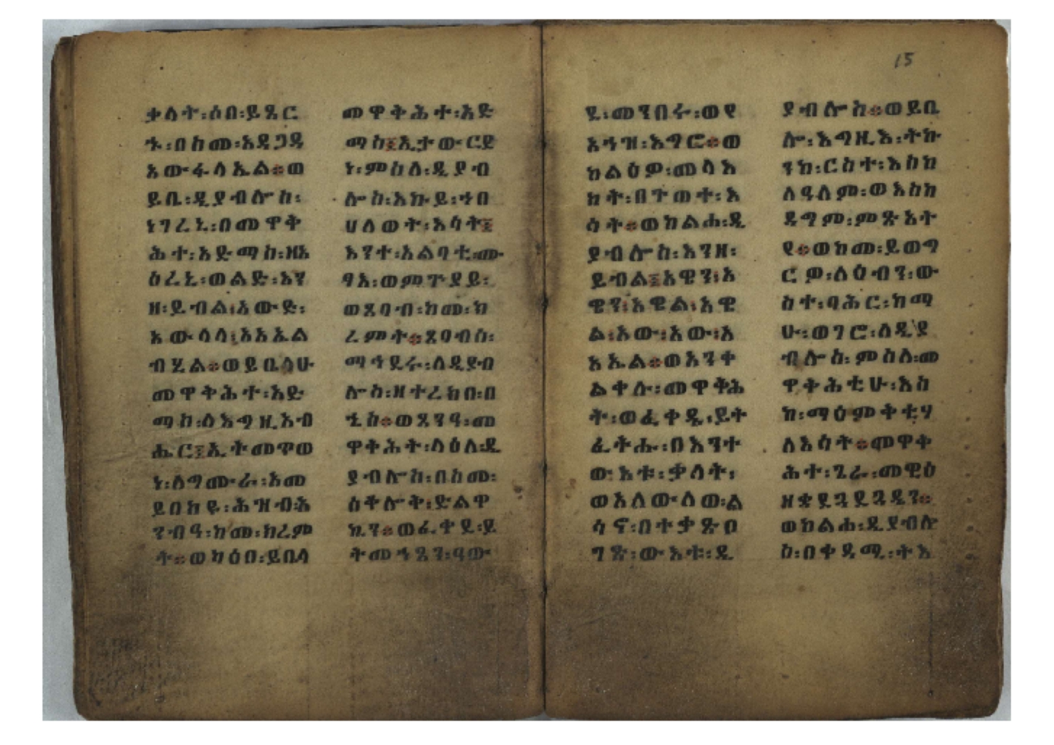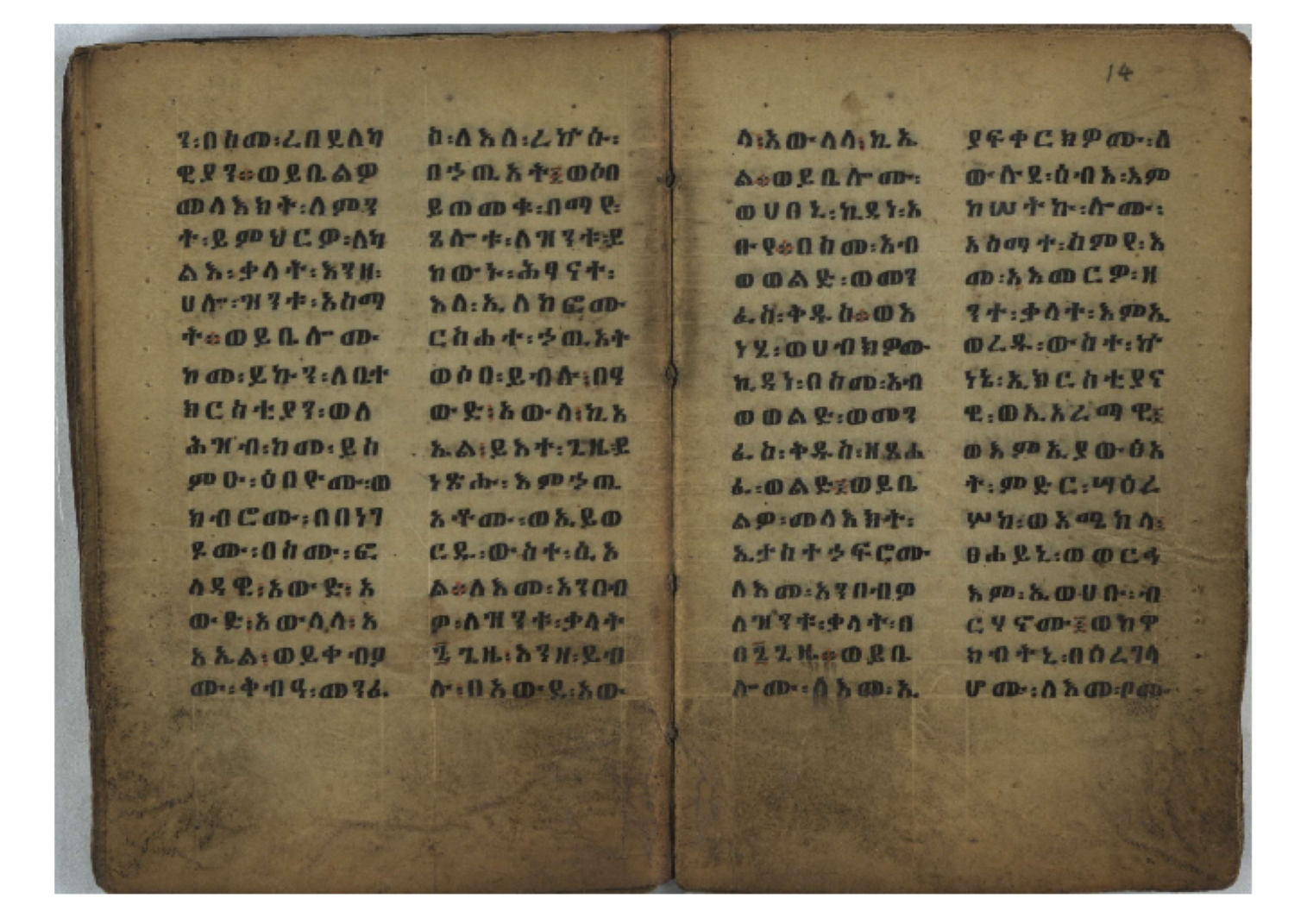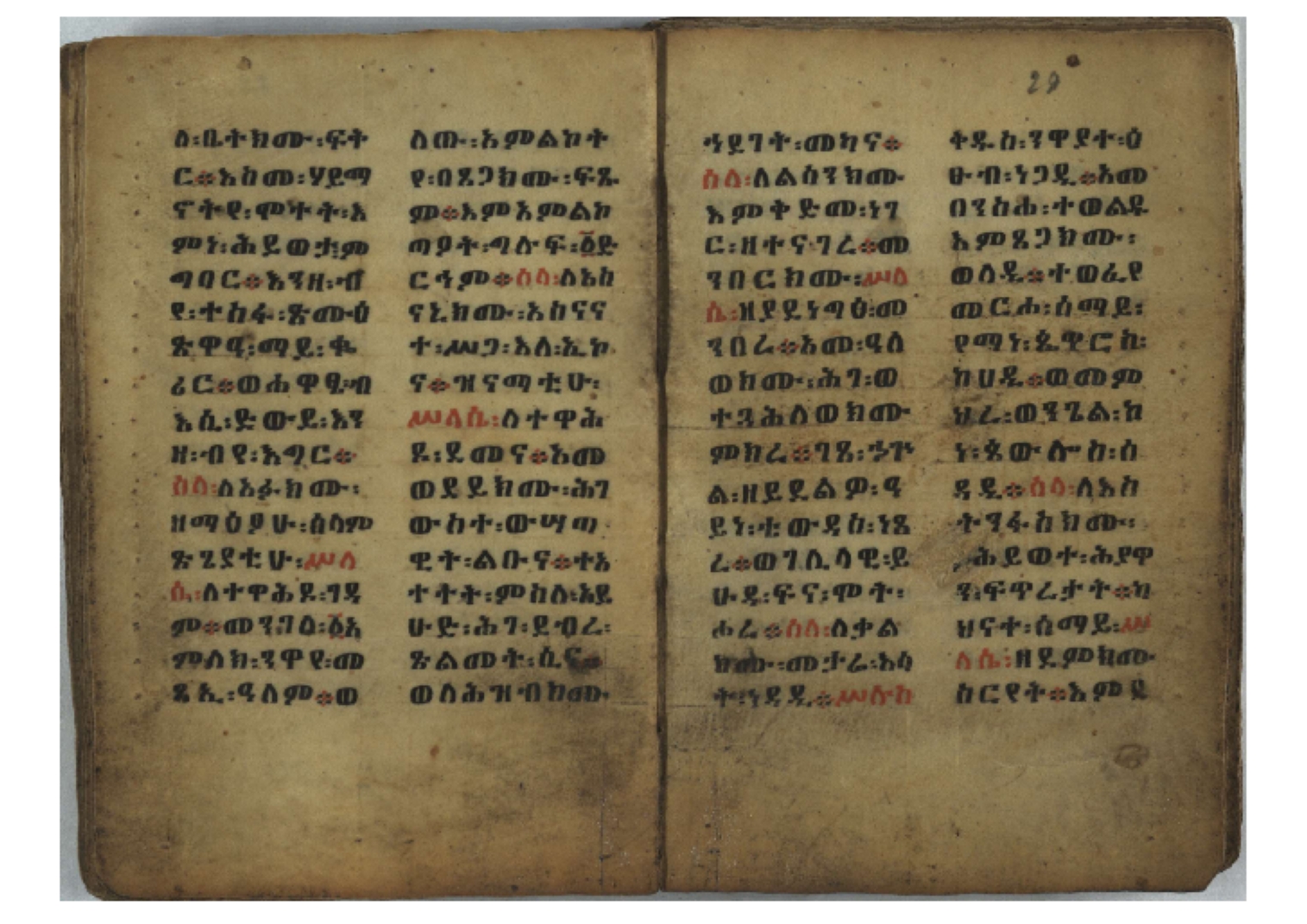 Ff. 3r–8vb: Tǝmhǝrtä ḫǝbuʾat (“The Doctrine of Mysteries”) Incipit: በእንተ፡ ትምህረተ፡ ኅቡዓት፡ ቅድመ፡ ዘትትነገር፡ እምጵርስፎራ፡ ለምዕመናን፡ ኅቡዓት[፡] ትምህርተ፡ ኅቡዓትሰ፡ ከመዝ፡ ንግር፡ ዘቅድመ፡ ሀሎ፡ ወይሄሉ፡ ዘመጽአ፡ ዘሐመ፡ ወሞተ፡ ወተቀብረ፡ ወተንሥአ፡ Ff. 9ra–12ra: Ǝgziʾabǝḥer zä-bǝrhanat (“God of the Lights”) Incipit: እግዚአብሔር፡ ዘብርሃናት፡ እግዚአብሔር፡ ዘሥልጣናት፡ እግዚአብሔር፡ ዘአርእስተ[፡] መላእክት፡ ዘእምታሕተ፡ እኂዘትከ[፡] ኵሉ፡ ፍጥረት። ንጉሠ፡ ነገሥት፡ ወእግዚአ፡ አጋእዝት። F. 12a–17ra: Ṣälotä mädḫanit (“Prayer of salvation”) Incipit: በስመ፡ አብ፡ ወወልድ፡ ወመንፈስ፡ ቅዱስ፡ ፩አምላከ፡ ጸሎተ፡ መድ()ኃኒት፡ አስማተ፡ ኃይላት፡ ዘወረደ፡ እምአርያም። ሰለታዊ፡ ኤላዊ፡ ኤላዊ፡ ሕዝቅያህ፡ ሰሮባኤላዊ፡ ኬንያዊ፡ ዴጋና፡ Ff. 17vb–26rb: Mälkǝʾa Fanuʾel (Mälkǝʾ-hymn to Fanuʾel, Chaine nr. 166) Incipit: ሰላም፡ ለዝክረ፡ ስምከ፡ ዘይደልዎ፡ ተበፅዓ። እምኀበ፡ ኵሎሙ፡ ሰብእ፡ በተዚያንዎ[፡] ወተዛውይ። እስመ[፡] ቀዋሚሆሙ፡ አንተ፡ ዘትተግህ፡ ለተራድኦ። ፋኑኤል፡ ስመከ፡ ሶበ፡ እዌጥን[፡] ጸውዖ። Ff. 26vb–35vb: Mälkǝʾa Śǝllase (Mälkǝʾ-hymn to the Trinity, Chaine nr. 20) Incipit: ሰላም፡ ለህላዌክሙ፡ ዘይመውእ፡ ህላዌያተ። ለረኪበ[፡] ስሙ፡ ኅቡዕ፡ አመ[፡] ወጠኑ፡ ተምኔተ። እምግብርክሙ፡ ሥላሴ፡ ሶበ፡ ረከብኩ፡ አስማተ። Ff. 35vb–46rb: Mälkǝʾa Täklä Haymanot (Mälkǝʾ-hymn to Täklä Haymanot, Chaine nr. 211) Incipit: ሰላም፡ ለፅንሰትከ፡ ወለልደትከ፡ እምከርሥ። አመ፡ እስራ፡ ወረቡዑ፡ ለወርኃ፡ ታኅሣሥ። ተክለ፡ ሃይማኖት፡ በኵሉ፡ ወበውስተ፡ ኵሉ፡ ውዱስ። ናሁ፡ ወጠንኩ፡ ወእቤ፡ እምስብሐቲከ፡ ሐዲስ፡ Ff. 46va–58rb: ʿƎqäbänni (“Protect me”, Chaine nr. 371), long version. It includes a section telling how a Frank nobleman received the prayer from heaven. Incipit: በስመ፡ … ኦእግዚእየ፡ ኢየሱስ፡ ክርስቶስ፡ ዕቀበኒ፡ በእንተ፡ ዘኃደርከ፡ በከርሠ፡ ማርያም[፡] እምከ፡ በእንተ፡ ማኅፀና፡ ለማርያም፡ ዘፆረተከ፡ ፱አውራኃ፡ ወ፭ዕለተ፡ ማርያም፡ ድንግል፡ እቀብኒ፡ Ff. 58rb–65ra: Ṣälot bäʾəntä ləssanä säbʾa (“Prayer against the tongue of men”). Incipit: ናሁ፡ ተማኀፀንኩ፡ በኆኅያተ፡ ስምከ፡ ካፍ፡ ወበቀዳማይ፡ የውጣ፡ ዘፕንተ፡ ፈደሎን፡ አሌፍ። ከመ፡ ታድኅነኒ፡ ክርስቶ[ስ]፡ እምትንሣኤ፡ ልሳን፡ ወአፍ። |