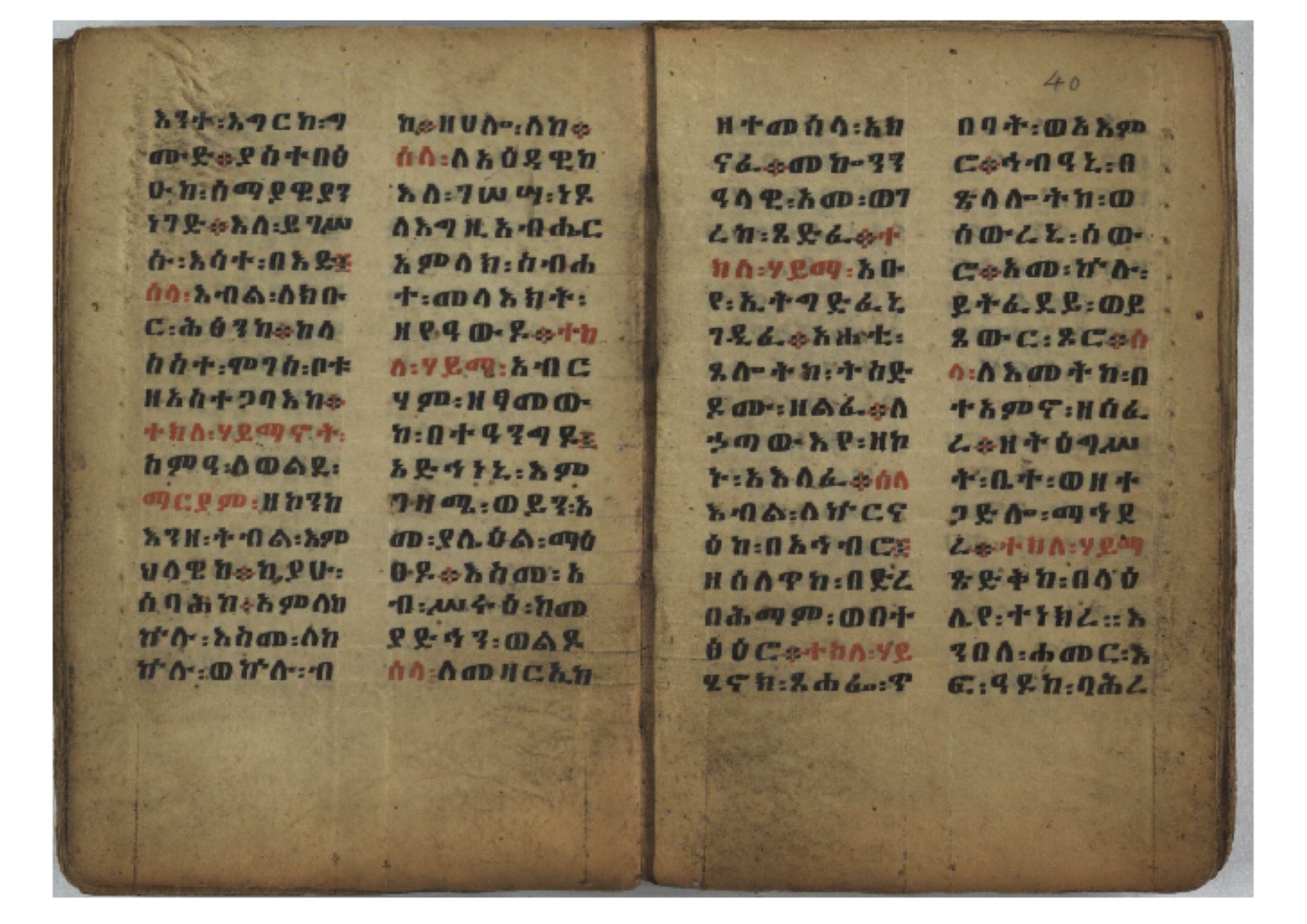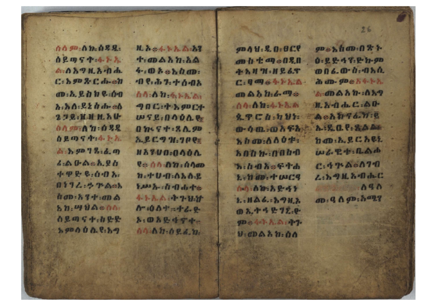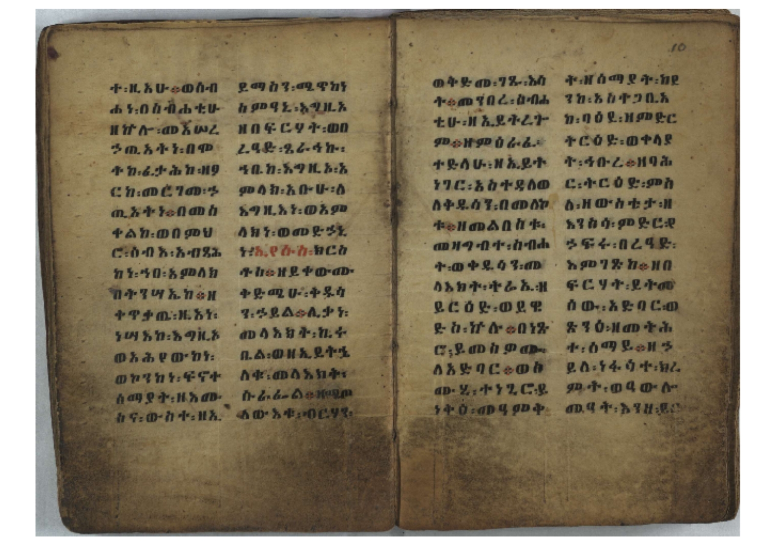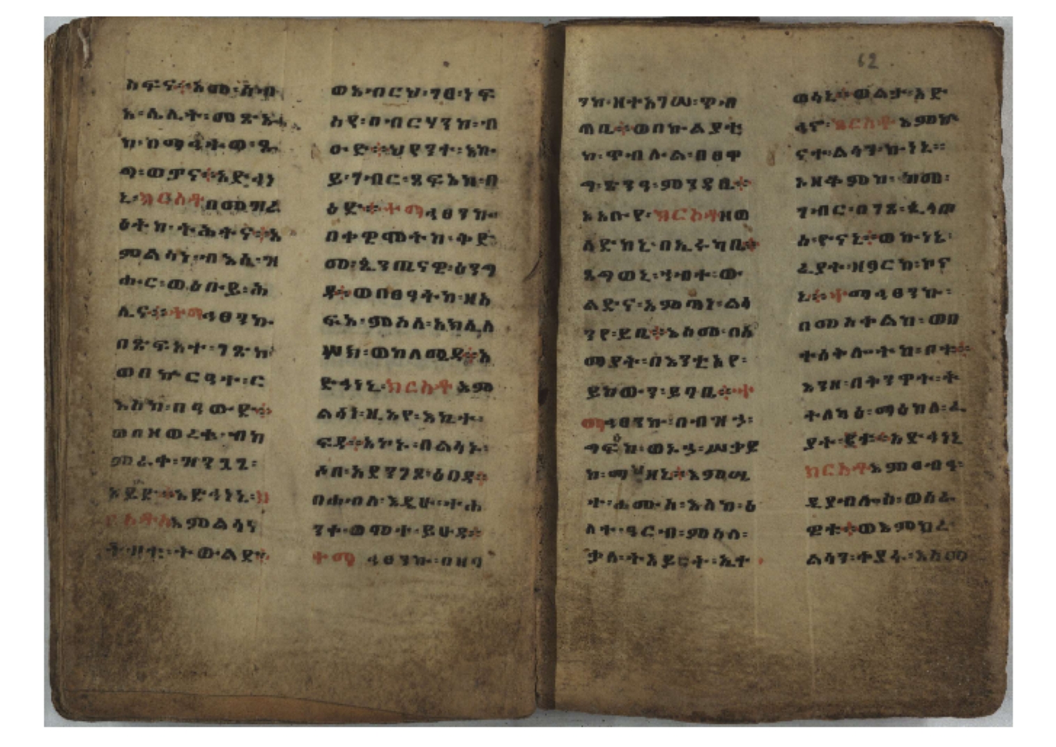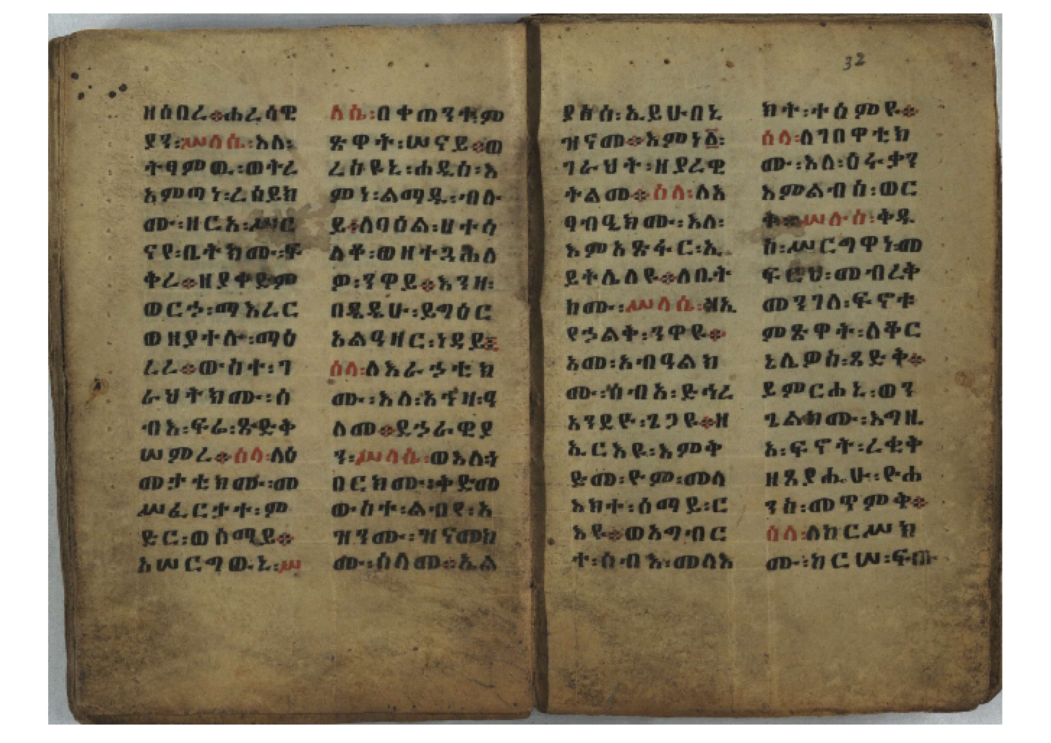 Ff. 3r–8vb: Tǝmhǝrtä ḫǝbuʾat (“The Doctrine of Mysteries”) Incipit: በእንተ፡ ትምህረተ፡ ኅቡዓት፡ ቅድመ፡ ዘትትነገር፡ እምጵርስፎራ፡ ለምዕመናን፡ ኅቡዓት[፡] ትምህርተ፡ ኅቡዓትሰ፡ ከመዝ፡ ንግር፡ ዘቅድመ፡ ሀሎ፡ ወይሄሉ፡ ዘመጽአ፡ ዘሐመ፡ ወሞተ፡ ወተቀብረ፡ ወተንሥአ፡ Ff. 9ra–12ra: Ǝgziʾabǝḥer zä-bǝrhanat (“God of the Lights”) Incipit: እግዚአብሔር፡ ዘብርሃናት፡ እግዚአብሔር፡ ዘሥልጣናት፡ እግዚአብሔር፡ ዘአርእስተ[፡] መላእክት፡ ዘእምታሕተ፡ እኂዘትከ[፡] ኵሉ፡ ፍጥረት። ንጉሠ፡ ነገሥት፡ ወእግዚአ፡ አጋእዝት። F. 12a–17ra: Ṣälotä mädḫanit (“Prayer of salvation”) Incipit: በስመ፡ አብ፡ ወወልድ፡ ወመንፈስ፡ ቅዱስ፡ ፩አምላከ፡ ጸሎተ፡ መድ()ኃኒት፡ አስማተ፡ ኃይላት፡ ዘወረደ፡ እምአርያም። ሰለታዊ፡ ኤላዊ፡ ኤላዊ፡ ሕዝቅያህ፡ ሰሮባኤላዊ፡ ኬንያዊ፡ ዴጋና፡ Ff. 17vb–26rb: Mälkǝʾa Fanuʾel (Mälkǝʾ-hymn to Fanuʾel, Chaine nr. 166) Incipit: ሰላም፡ ለዝክረ፡ ስምከ፡ ዘይደልዎ፡ ተበፅዓ። እምኀበ፡ ኵሎሙ፡ ሰብእ፡ በተዚያንዎ[፡] ወተዛውይ። እስመ[፡] ቀዋሚሆሙ፡ አንተ፡ ዘትተግህ፡ ለተራድኦ። ፋኑኤል፡ ስመከ፡ ሶበ፡ እዌጥን[፡] ጸውዖ። Ff. 26vb–35vb: Mälkǝʾa Śǝllase (Mälkǝʾ-hymn to the Trinity, Chaine nr. 20) Incipit: ሰላም፡ ለህላዌክሙ፡ ዘይመውእ፡ ህላዌያተ። ለረኪበ[፡] ስሙ፡ ኅቡዕ፡ አመ[፡] ወጠኑ፡ ተምኔተ። እምግብርክሙ፡ ሥላሴ፡ ሶበ፡ ረከብኩ፡ አስማተ። Ff. 35vb–46rb: Mälkǝʾa Täklä Haymanot (Mälkǝʾ-hymn to Täklä Haymanot, Chaine nr. 211) Incipit: ሰላም፡ ለፅንሰትከ፡ ወለልደትከ፡ እምከርሥ። አመ፡ እስራ፡ ወረቡዑ፡ ለወርኃ፡ ታኅሣሥ። ተክለ፡ ሃይማኖት፡ በኵሉ፡ ወበውስተ፡ ኵሉ፡ ውዱስ። ናሁ፡ ወጠንኩ፡ ወእቤ፡ እምስብሐቲከ፡ ሐዲስ፡ Ff. 46va–58rb: ʿƎqäbänni (“Protect me”, Chaine nr. 371), long version. It includes a section telling how a Frank nobleman received the prayer from heaven. Incipit: በስመ፡ … ኦእግዚእየ፡ ኢየሱስ፡ ክርስቶስ፡ ዕቀበኒ፡ በእንተ፡ ዘኃደርከ፡ በከርሠ፡ ማርያም[፡] እምከ፡ በእንተ፡ ማኅፀና፡ ለማርያም፡ ዘፆረተከ፡ ፱አውራኃ፡ ወ፭ዕለተ፡ ማርያም፡ ድንግል፡ እቀብኒ፡ Ff. 58rb–65ra: Ṣälot bäʾəntä ləssanä säbʾa (“Prayer against the tongue of men”). Incipit: ናሁ፡ ተማኀፀንኩ፡ በኆኅያተ፡ ስምከ፡ ካፍ፡ ወበቀዳማይ፡ የውጣ፡ ዘፕንተ፡ ፈደሎን፡ አሌፍ። ከመ፡ ታድኅነኒ፡ ክርስቶ[ስ]፡ እምትንሣኤ፡ ልሳን፡ ወአፍ። |