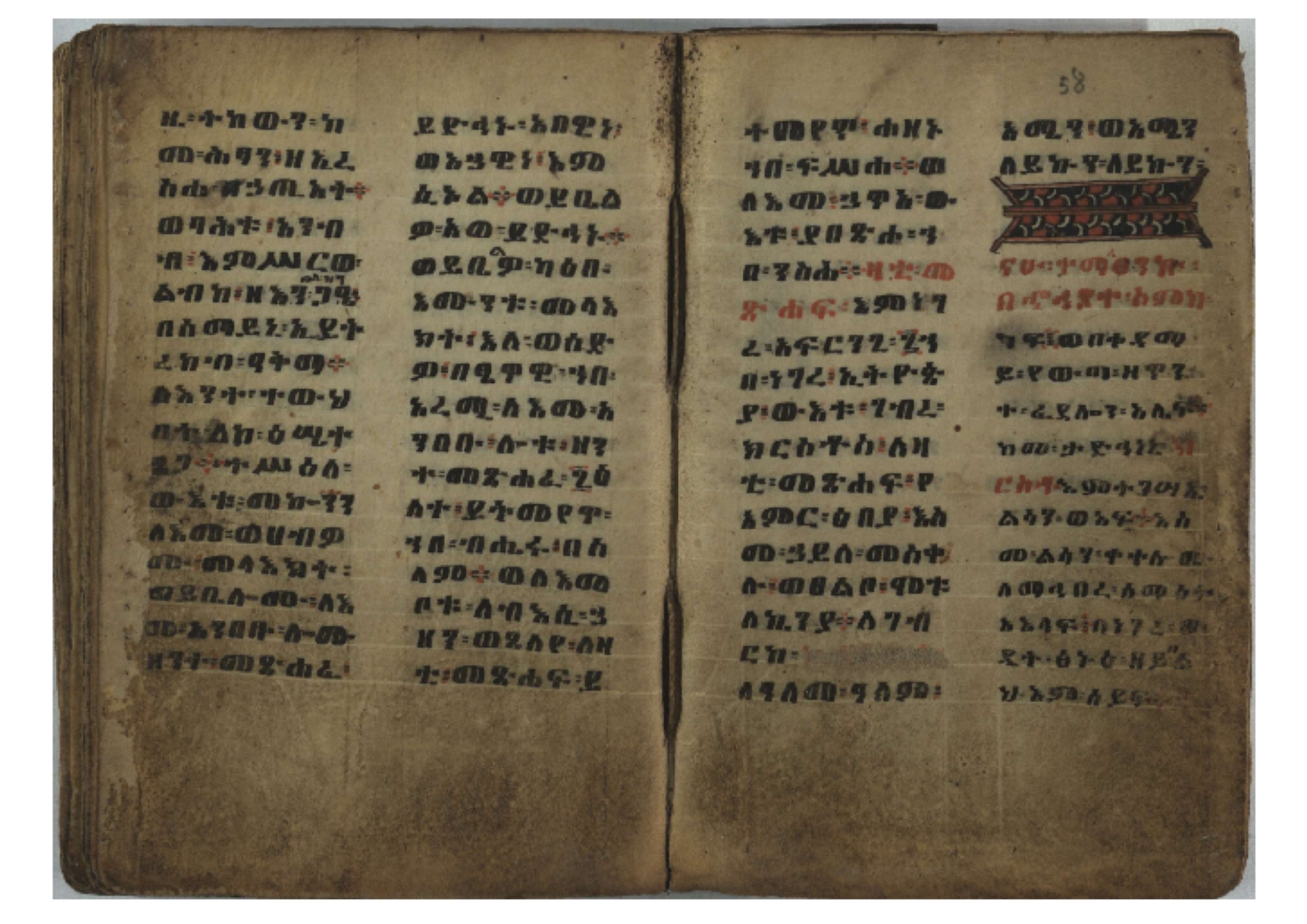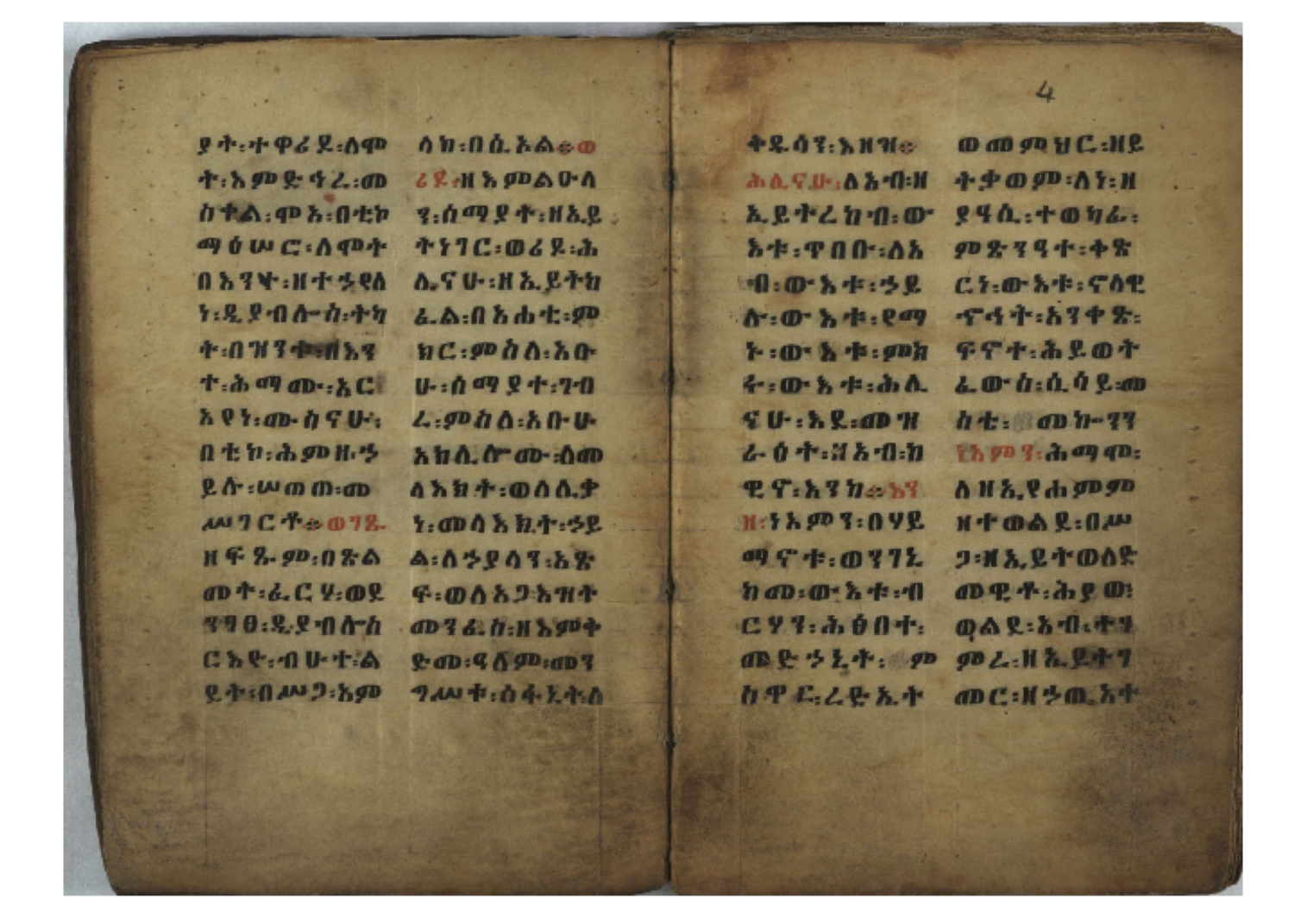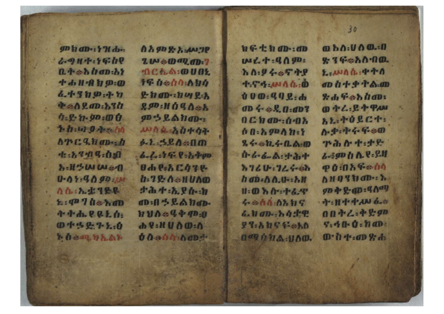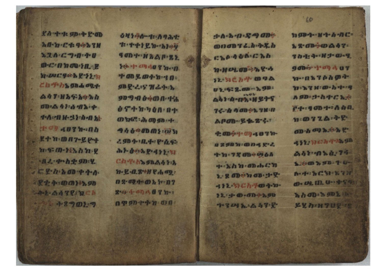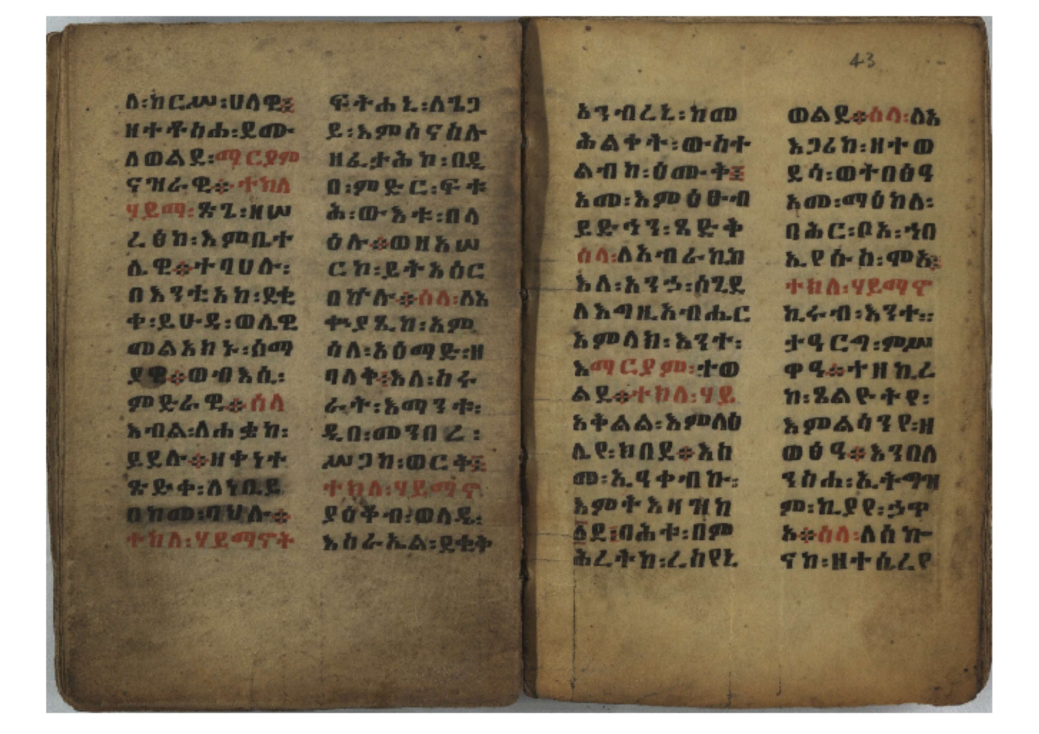 Ff. 3r–8vb: Tǝmhǝrtä ḫǝbuʾat (“The Doctrine of Mysteries”) Incipit: በእንተ፡ ትምህረተ፡ ኅቡዓት፡ ቅድመ፡ ዘትትነገር፡ እምጵርስፎራ፡ ለምዕመናን፡ ኅቡዓት[፡] ትምህርተ፡ ኅቡዓትሰ፡ ከመዝ፡ ንግር፡ ዘቅድመ፡ ሀሎ፡ ወይሄሉ፡ ዘመጽአ፡ ዘሐመ፡ ወሞተ፡ ወተቀብረ፡ ወተንሥአ፡ Ff. 9ra–12ra: Ǝgziʾabǝḥer zä-bǝrhanat (“God of the Lights”) Incipit: እግዚአብሔር፡ ዘብርሃናት፡ እግዚአብሔር፡ ዘሥልጣናት፡ እግዚአብሔር፡ ዘአርእስተ[፡] መላእክት፡ ዘእምታሕተ፡ እኂዘትከ[፡] ኵሉ፡ ፍጥረት። ንጉሠ፡ ነገሥት፡ ወእግዚአ፡ አጋእዝት። F. 12a–17ra: Ṣälotä mädḫanit (“Prayer of salvation”) Incipit: በስመ፡ አብ፡ ወወልድ፡ ወመንፈስ፡ ቅዱስ፡ ፩አምላከ፡ ጸሎተ፡ መድ()ኃኒት፡ አስማተ፡ ኃይላት፡ ዘወረደ፡ እምአርያም። ሰለታዊ፡ ኤላዊ፡ ኤላዊ፡ ሕዝቅያህ፡ ሰሮባኤላዊ፡ ኬንያዊ፡ ዴጋና፡ Ff. 17vb–26rb: Mälkǝʾa Fanuʾel (Mälkǝʾ-hymn to Fanuʾel, Chaine nr. 166) Incipit: ሰላም፡ ለዝክረ፡ ስምከ፡ ዘይደልዎ፡ ተበፅዓ። እምኀበ፡ ኵሎሙ፡ ሰብእ፡ በተዚያንዎ[፡] ወተዛውይ። እስመ[፡] ቀዋሚሆሙ፡ አንተ፡ ዘትተግህ፡ ለተራድኦ። ፋኑኤል፡ ስመከ፡ ሶበ፡ እዌጥን[፡] ጸውዖ። Ff. 26vb–35vb: Mälkǝʾa Śǝllase (Mälkǝʾ-hymn to the Trinity, Chaine nr. 20) Incipit: ሰላም፡ ለህላዌክሙ፡ ዘይመውእ፡ ህላዌያተ። ለረኪበ[፡] ስሙ፡ ኅቡዕ፡ አመ[፡] ወጠኑ፡ ተምኔተ። እምግብርክሙ፡ ሥላሴ፡ ሶበ፡ ረከብኩ፡ አስማተ። Ff. 35vb–46rb: Mälkǝʾa Täklä Haymanot (Mälkǝʾ-hymn to Täklä Haymanot, Chaine nr. 211) Incipit: ሰላም፡ ለፅንሰትከ፡ ወለልደትከ፡ እምከርሥ። አመ፡ እስራ፡ ወረቡዑ፡ ለወርኃ፡ ታኅሣሥ። ተክለ፡ ሃይማኖት፡ በኵሉ፡ ወበውስተ፡ ኵሉ፡ ውዱስ። ናሁ፡ ወጠንኩ፡ ወእቤ፡ እምስብሐቲከ፡ ሐዲስ፡ Ff. 46va–58rb: ʿƎqäbänni (“Protect me”, Chaine nr. 371), long version. It includes a section telling how a Frank nobleman received the prayer from heaven. Incipit: በስመ፡ … ኦእግዚእየ፡ ኢየሱስ፡ ክርስቶስ፡ ዕቀበኒ፡ በእንተ፡ ዘኃደርከ፡ በከርሠ፡ ማርያም[፡] እምከ፡ በእንተ፡ ማኅፀና፡ ለማርያም፡ ዘፆረተከ፡ ፱አውራኃ፡ ወ፭ዕለተ፡ ማርያም፡ ድንግል፡ እቀብኒ፡ Ff. 58rb–65ra: Ṣälot bäʾəntä ləssanä säbʾa (“Prayer against the tongue of men”). Incipit: ናሁ፡ ተማኀፀንኩ፡ በኆኅያተ፡ ስምከ፡ ካፍ፡ ወበቀዳማይ፡ የውጣ፡ ዘፕንተ፡ ፈደሎን፡ አሌፍ። ከመ፡ ታድኅነኒ፡ ክርስቶ[ስ]፡ እምትንሣኤ፡ ልሳን፡ ወአፍ። |
