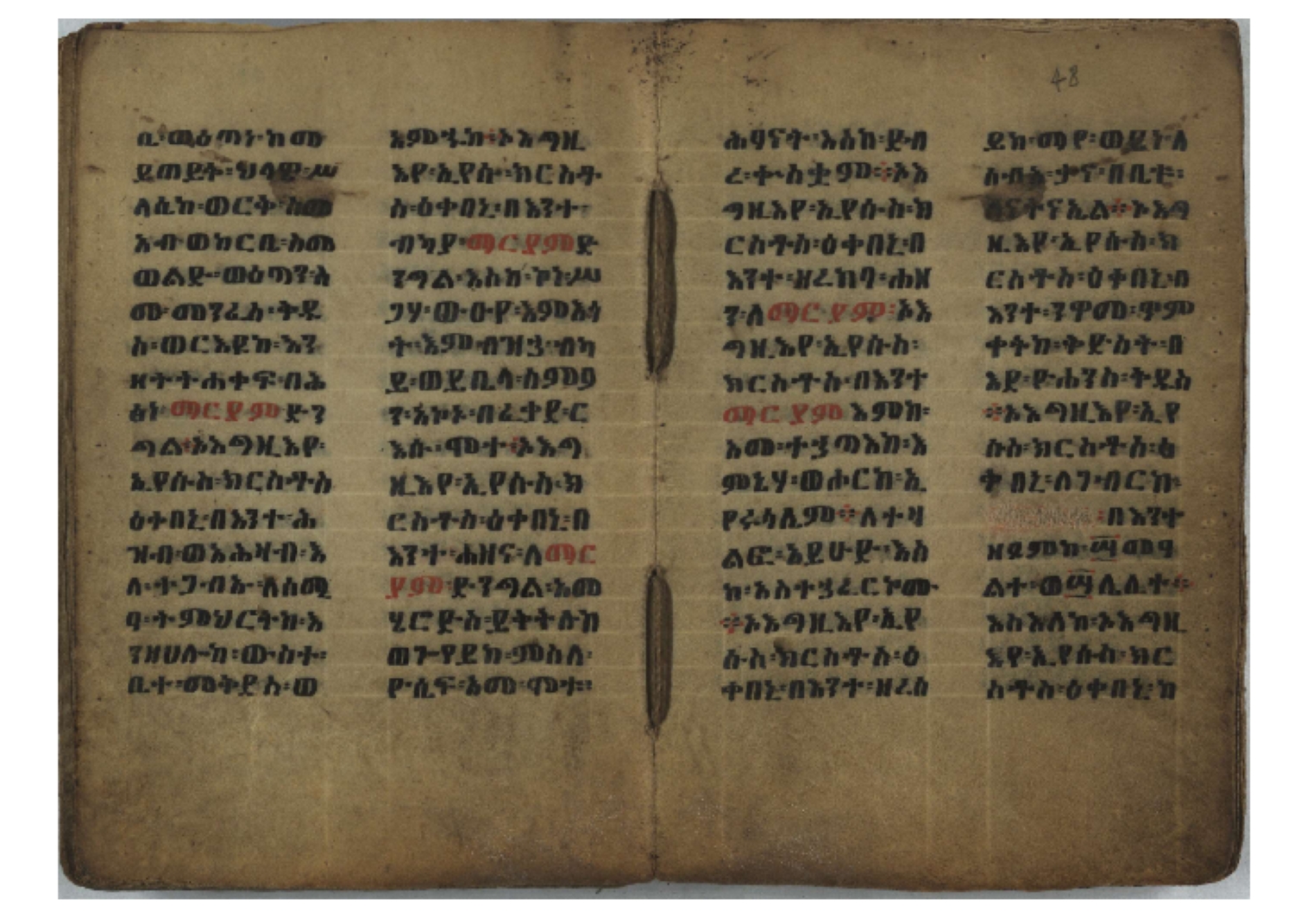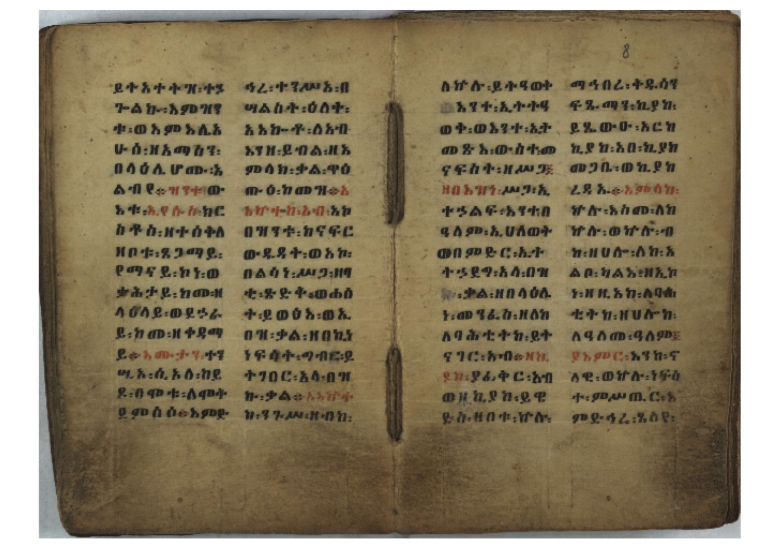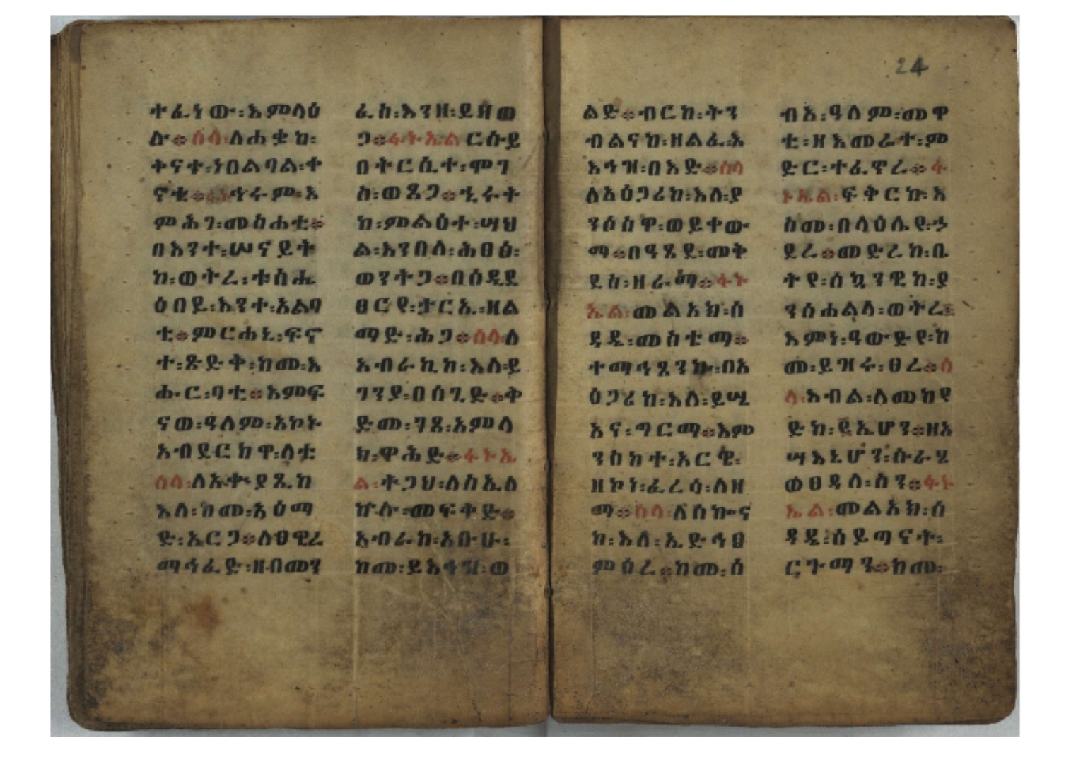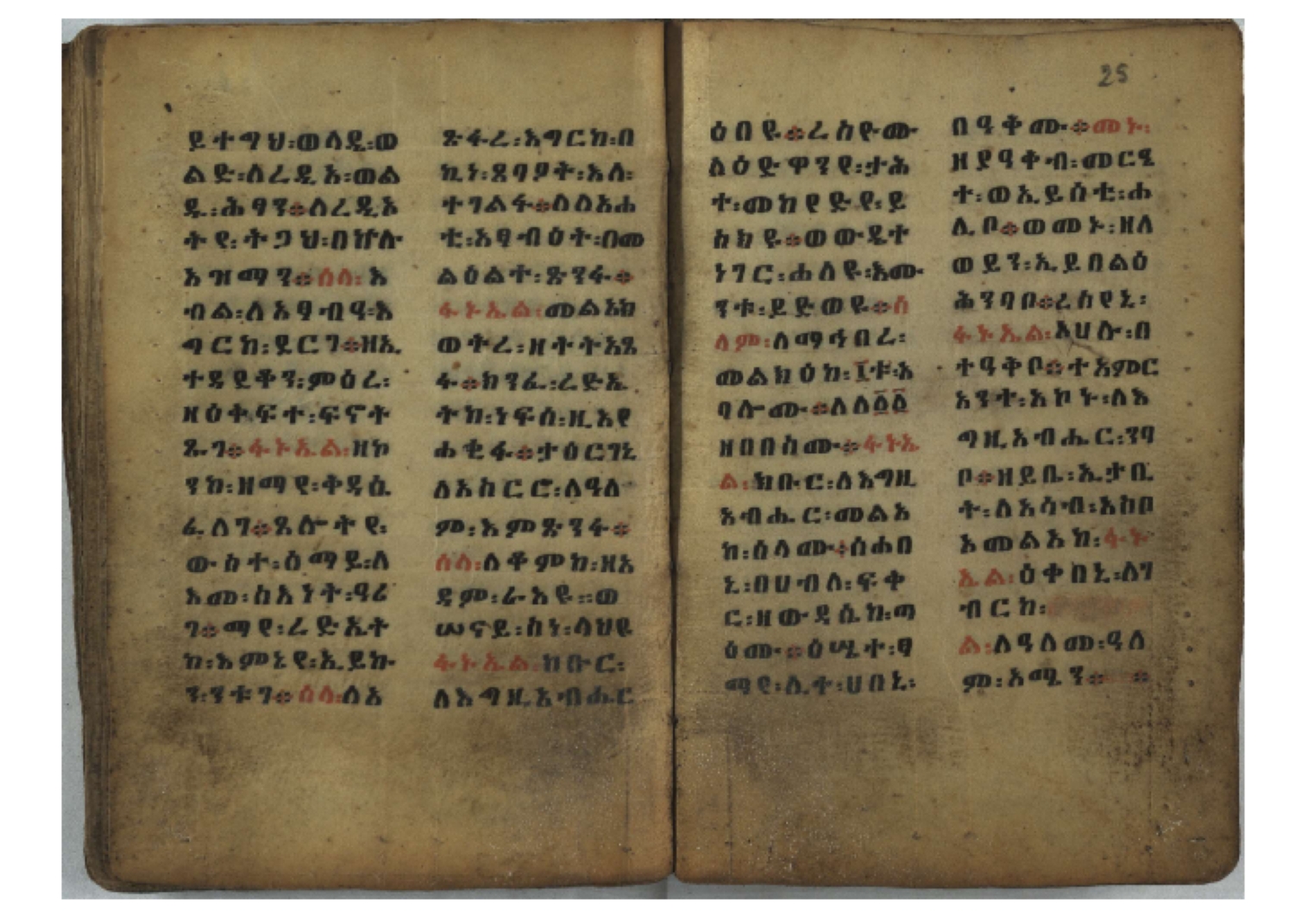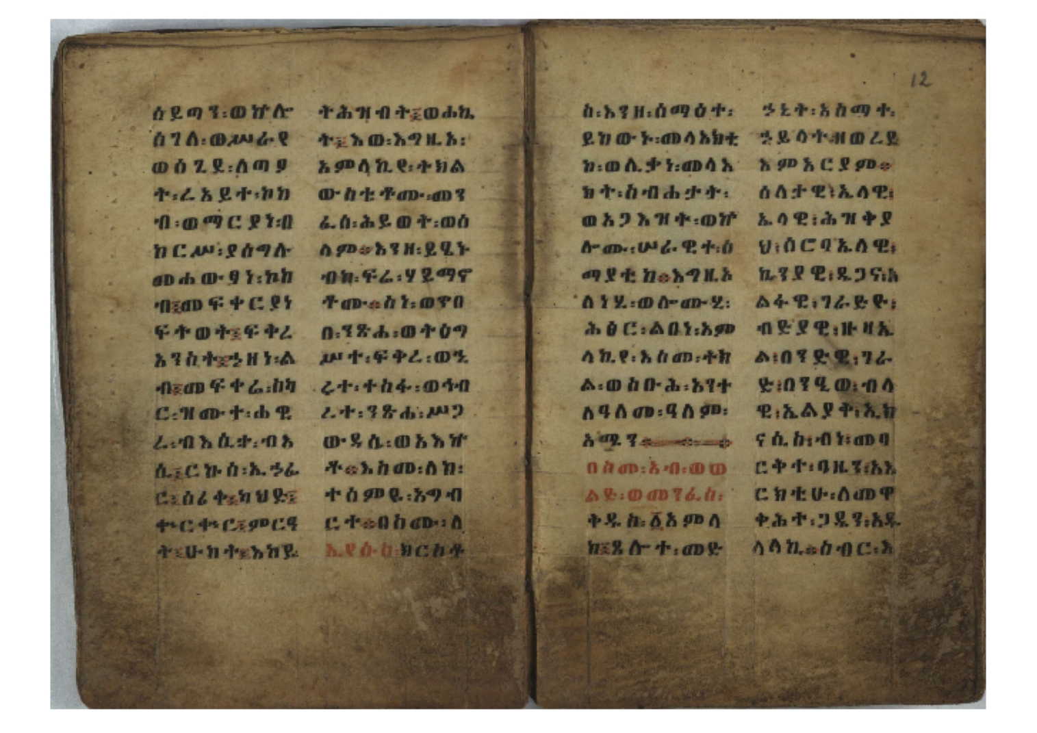 Ff. 3r–8vb: Tǝmhǝrtä ḫǝbuʾat (“The Doctrine of Mysteries”) Incipit: በእንተ፡ ትምህረተ፡ ኅቡዓት፡ ቅድመ፡ ዘትትነገር፡ እምጵርስፎራ፡ ለምዕመናን፡ ኅቡዓት[፡] ትምህርተ፡ ኅቡዓትሰ፡ ከመዝ፡ ንግር፡ ዘቅድመ፡ ሀሎ፡ ወይሄሉ፡ ዘመጽአ፡ ዘሐመ፡ ወሞተ፡ ወተቀብረ፡ ወተንሥአ፡ Ff. 9ra–12ra: Ǝgziʾabǝḥer zä-bǝrhanat (“God of the Lights”) Incipit: እግዚአብሔር፡ ዘብርሃናት፡ እግዚአብሔር፡ ዘሥልጣናት፡ እግዚአብሔር፡ ዘአርእስተ[፡] መላእክት፡ ዘእምታሕተ፡ እኂዘትከ[፡] ኵሉ፡ ፍጥረት። ንጉሠ፡ ነገሥት፡ ወእግዚአ፡ አጋእዝት። F. 12a–17ra: Ṣälotä mädḫanit (“Prayer of salvation”) Incipit: በስመ፡ አብ፡ ወወልድ፡ ወመንፈስ፡ ቅዱስ፡ ፩አምላከ፡ ጸሎተ፡ መድ()ኃኒት፡ አስማተ፡ ኃይላት፡ ዘወረደ፡ እምአርያም። ሰለታዊ፡ ኤላዊ፡ ኤላዊ፡ ሕዝቅያህ፡ ሰሮባኤላዊ፡ ኬንያዊ፡ ዴጋና፡ Ff. 17vb–26rb: Mälkǝʾa Fanuʾel (Mälkǝʾ-hymn to Fanuʾel, Chaine nr. 166) Incipit: ሰላም፡ ለዝክረ፡ ስምከ፡ ዘይደልዎ፡ ተበፅዓ። እምኀበ፡ ኵሎሙ፡ ሰብእ፡ በተዚያንዎ[፡] ወተዛውይ። እስመ[፡] ቀዋሚሆሙ፡ አንተ፡ ዘትተግህ፡ ለተራድኦ። ፋኑኤል፡ ስመከ፡ ሶበ፡ እዌጥን[፡] ጸውዖ። Ff. 26vb–35vb: Mälkǝʾa Śǝllase (Mälkǝʾ-hymn to the Trinity, Chaine nr. 20) Incipit: ሰላም፡ ለህላዌክሙ፡ ዘይመውእ፡ ህላዌያተ። ለረኪበ[፡] ስሙ፡ ኅቡዕ፡ አመ[፡] ወጠኑ፡ ተምኔተ። እምግብርክሙ፡ ሥላሴ፡ ሶበ፡ ረከብኩ፡ አስማተ። Ff. 35vb–46rb: Mälkǝʾa Täklä Haymanot (Mälkǝʾ-hymn to Täklä Haymanot, Chaine nr. 211) Incipit: ሰላም፡ ለፅንሰትከ፡ ወለልደትከ፡ እምከርሥ። አመ፡ እስራ፡ ወረቡዑ፡ ለወርኃ፡ ታኅሣሥ። ተክለ፡ ሃይማኖት፡ በኵሉ፡ ወበውስተ፡ ኵሉ፡ ውዱስ። ናሁ፡ ወጠንኩ፡ ወእቤ፡ እምስብሐቲከ፡ ሐዲስ፡ Ff. 46va–58rb: ʿƎqäbänni (“Protect me”, Chaine nr. 371), long version. It includes a section telling how a Frank nobleman received the prayer from heaven. Incipit: በስመ፡ … ኦእግዚእየ፡ ኢየሱስ፡ ክርስቶስ፡ ዕቀበኒ፡ በእንተ፡ ዘኃደርከ፡ በከርሠ፡ ማርያም[፡] እምከ፡ በእንተ፡ ማኅፀና፡ ለማርያም፡ ዘፆረተከ፡ ፱አውራኃ፡ ወ፭ዕለተ፡ ማርያም፡ ድንግል፡ እቀብኒ፡ Ff. 58rb–65ra: Ṣälot bäʾəntä ləssanä säbʾa (“Prayer against the tongue of men”). Incipit: ናሁ፡ ተማኀፀንኩ፡ በኆኅያተ፡ ስምከ፡ ካፍ፡ ወበቀዳማይ፡ የውጣ፡ ዘፕንተ፡ ፈደሎን፡ አሌፍ። ከመ፡ ታድኅነኒ፡ ክርስቶ[ስ]፡ እምትንሣኤ፡ ልሳን፡ ወአፍ። |