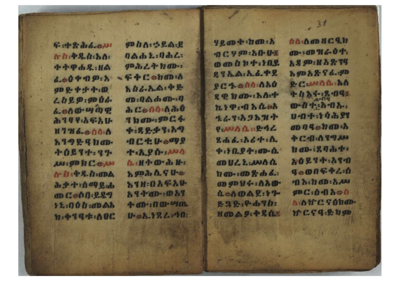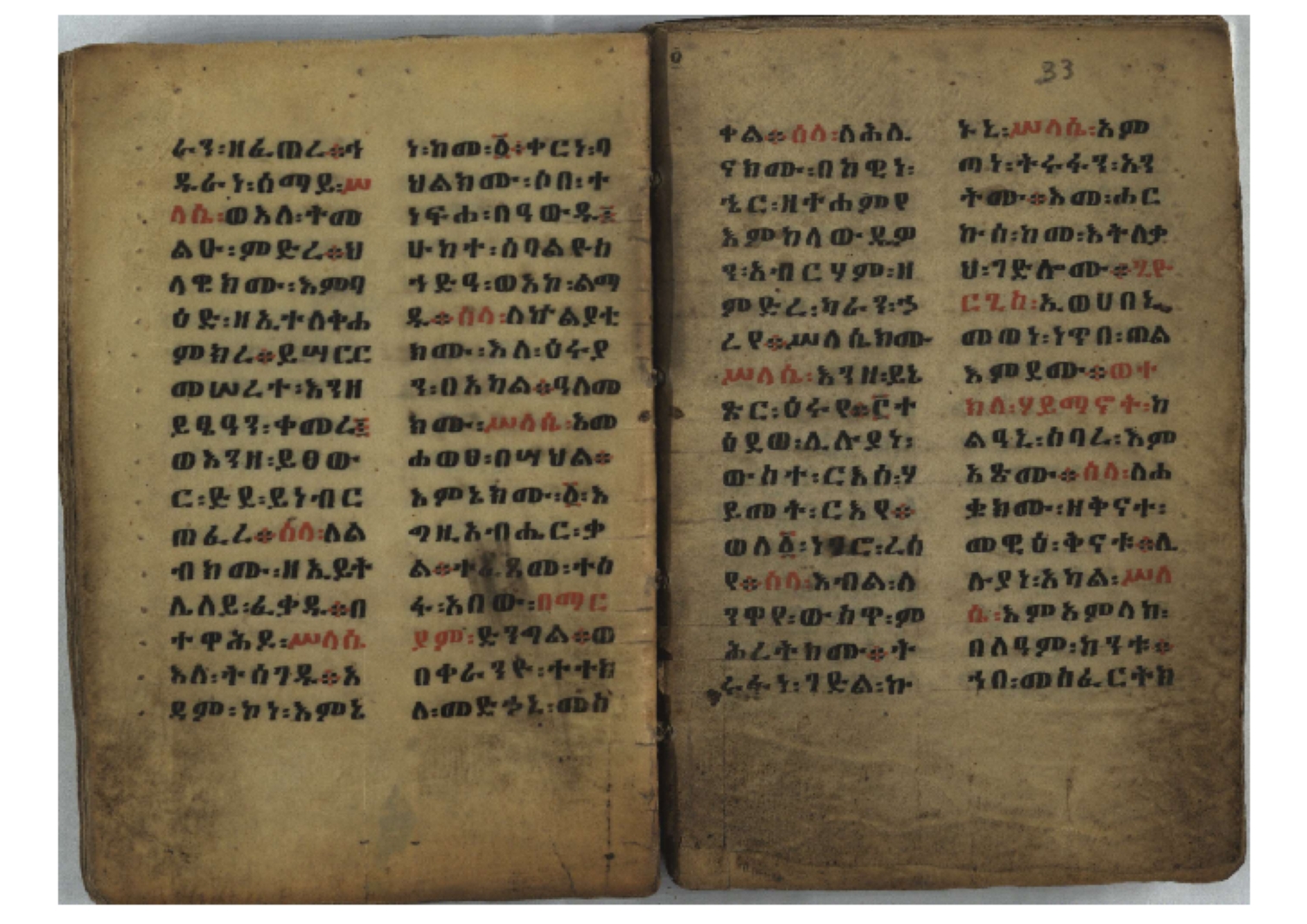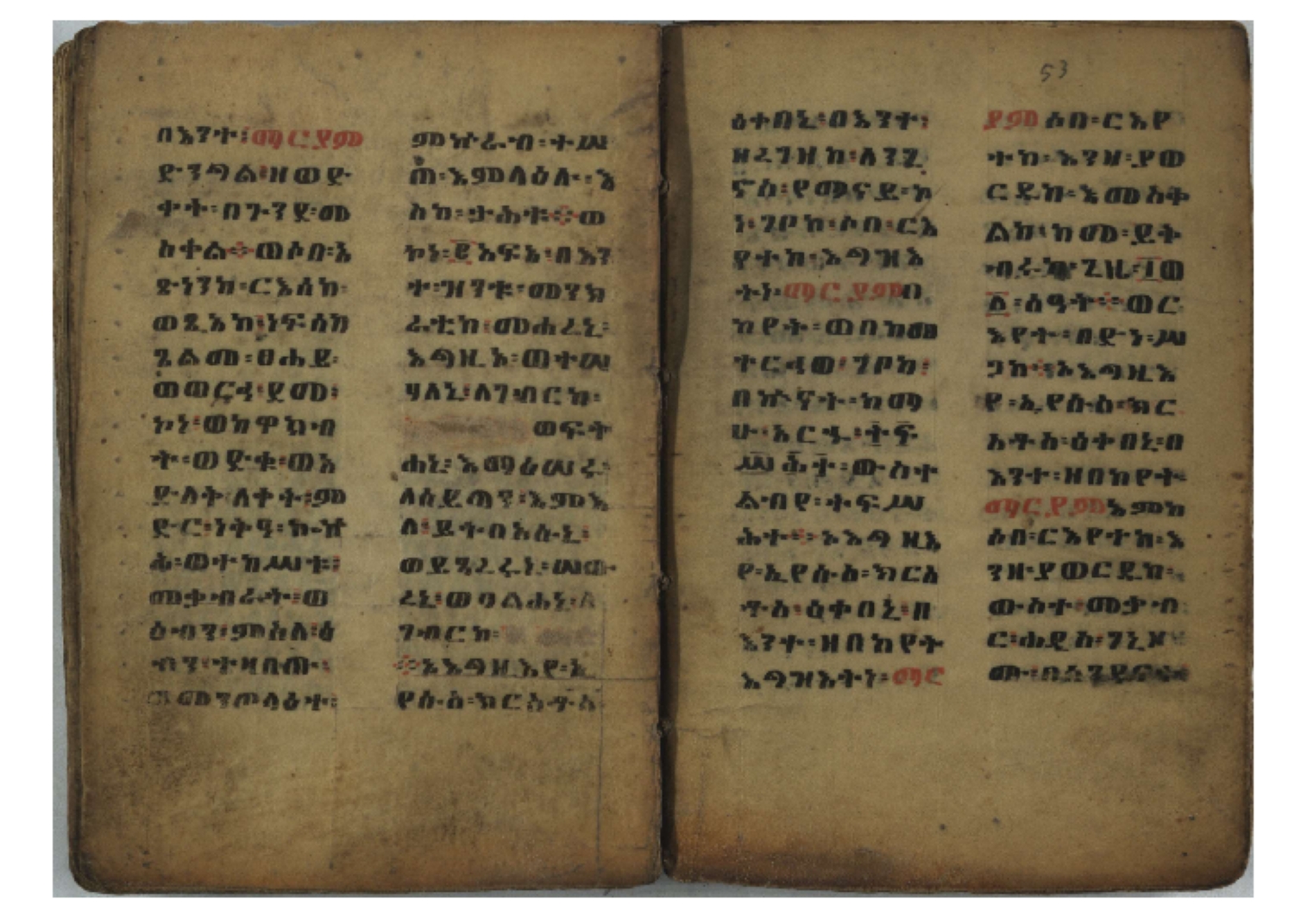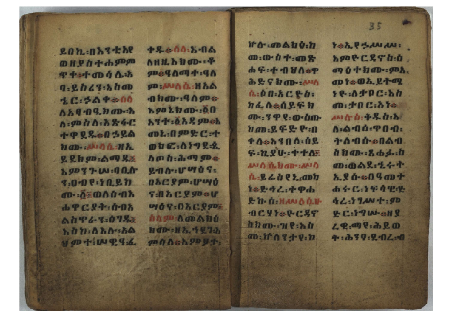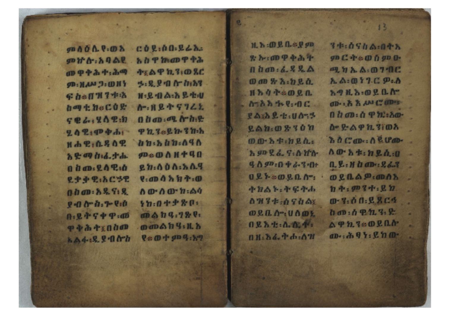 Ethiopic numerals on the upper inner corner of the recto of the first folio of the third, fourth and fifth quires: ff. 13r (፪), 23r (፫), and 33r (፬). |