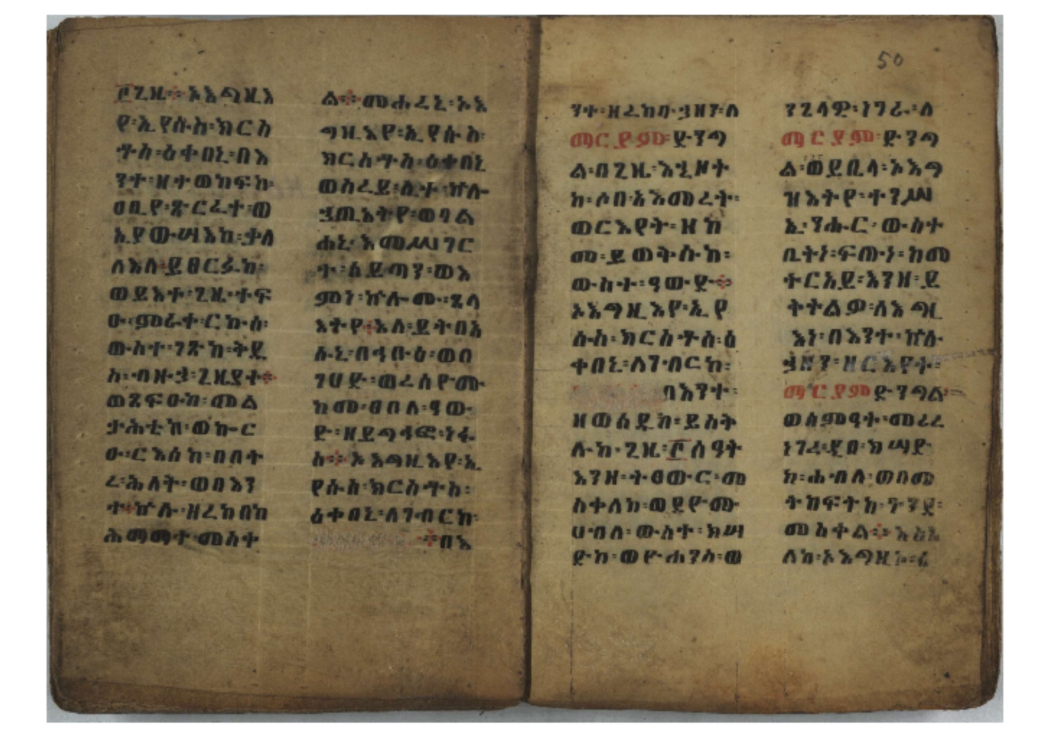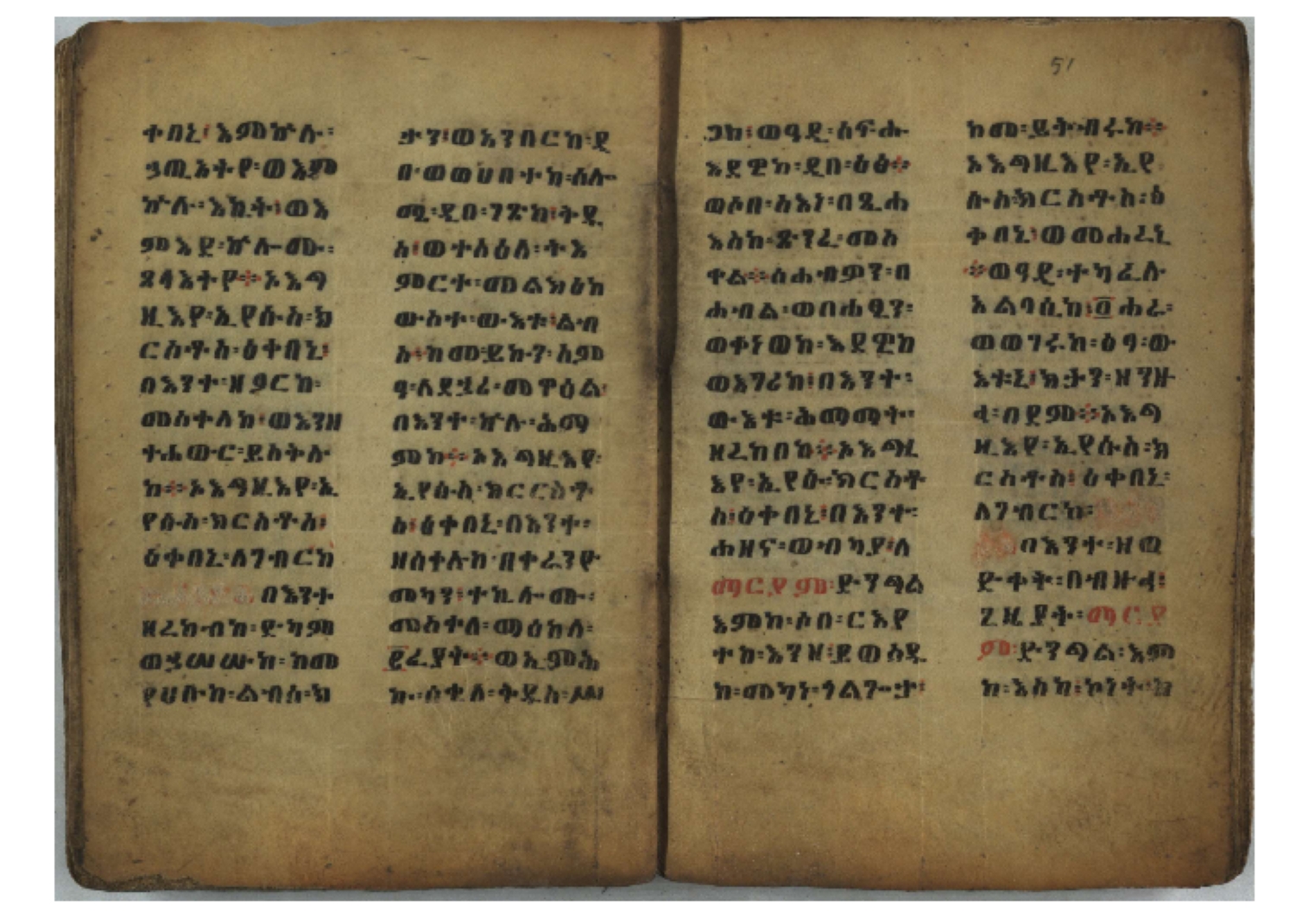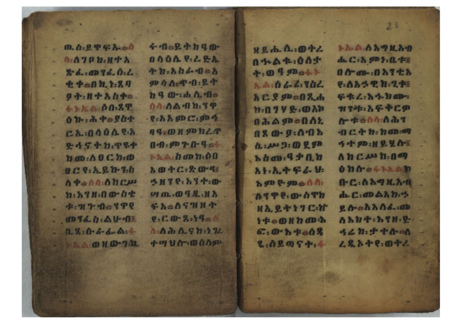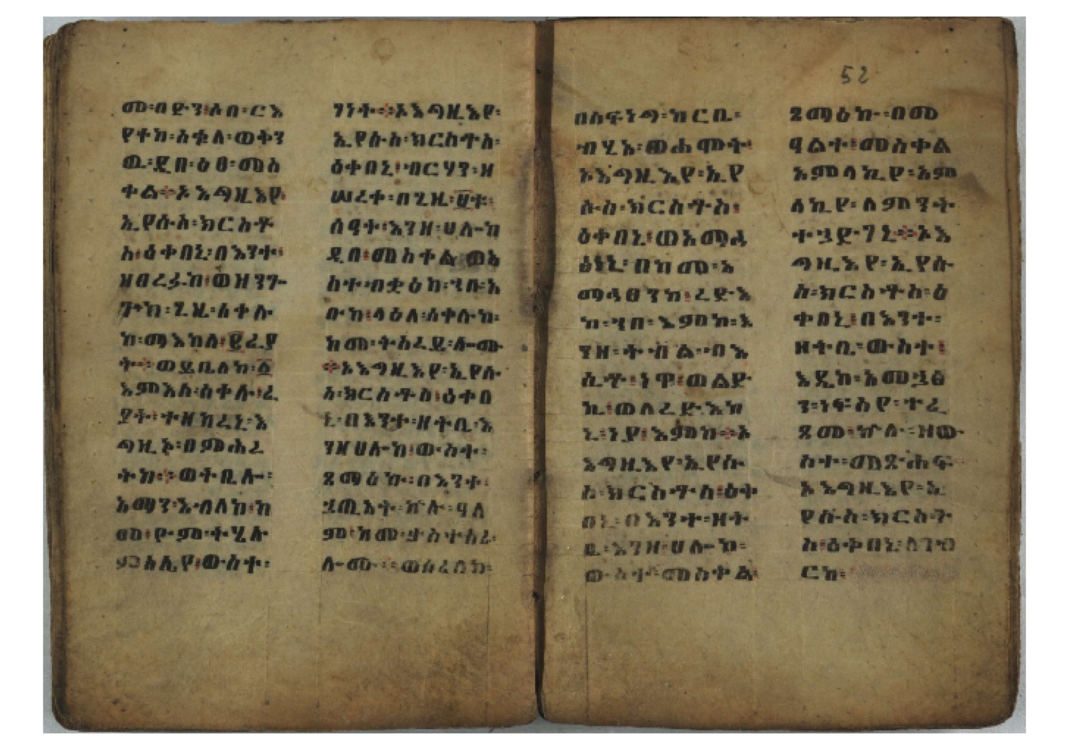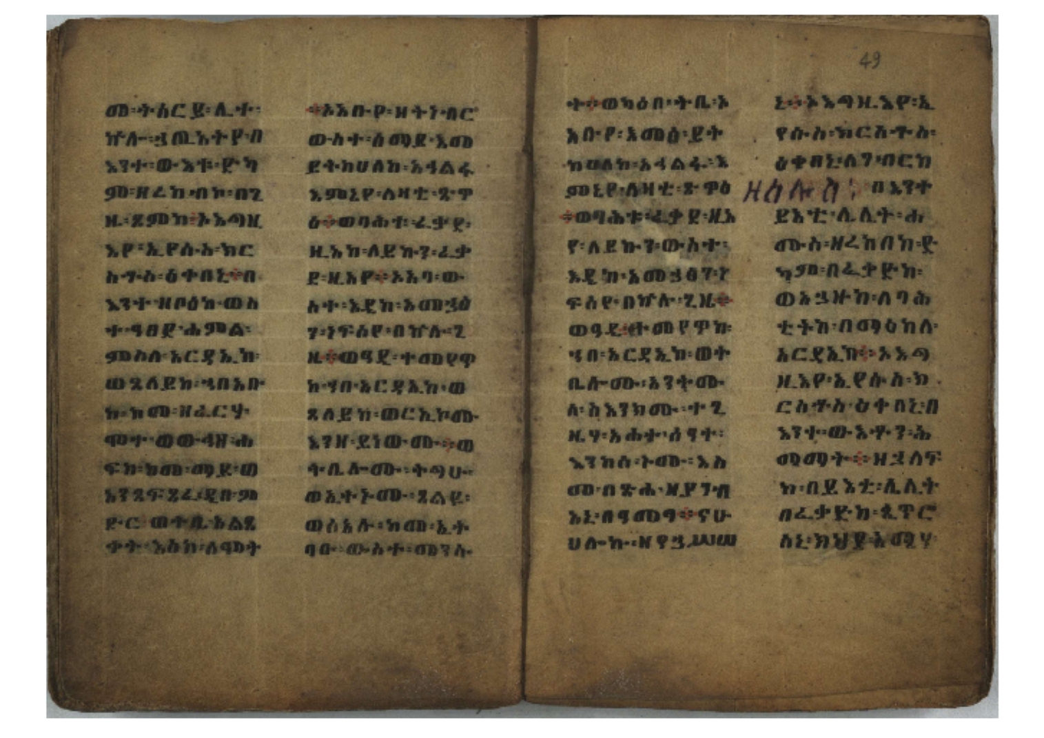 Ethiopic numerals on the upper inner corner of the recto of the first folio of the third, fourth and fifth quires: ff. 13r (፪), 23r (፫), and 33r (፬). |