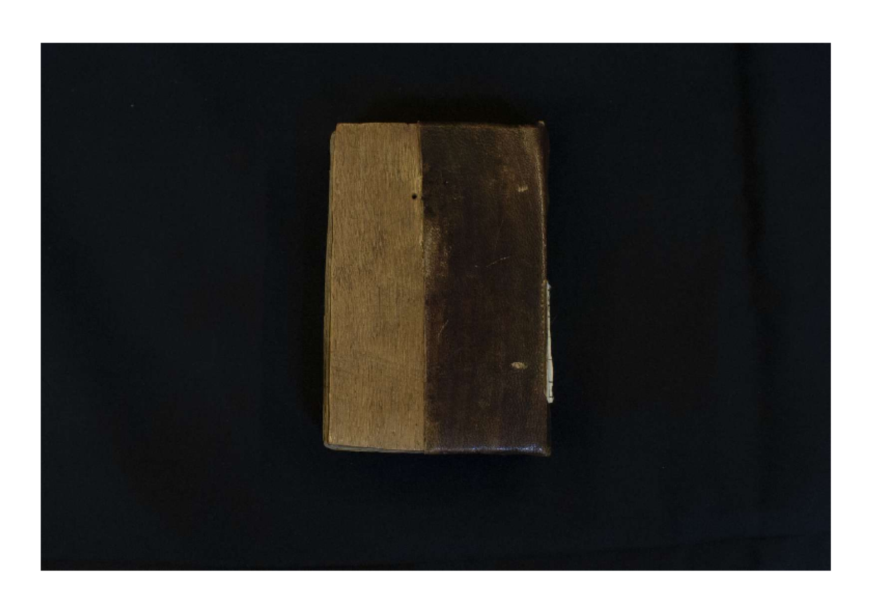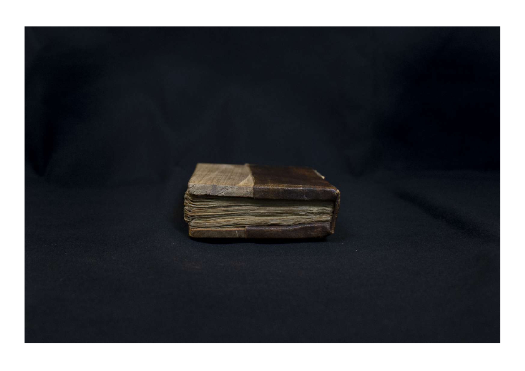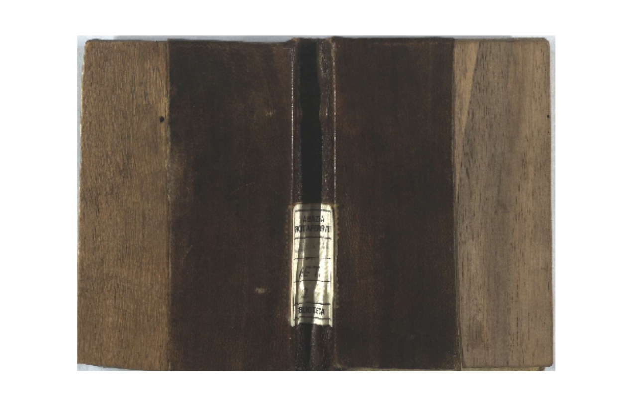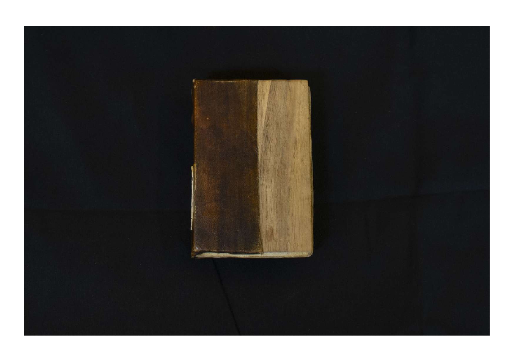 Two wooden boards covered with brown leather. Two sewing stations. |