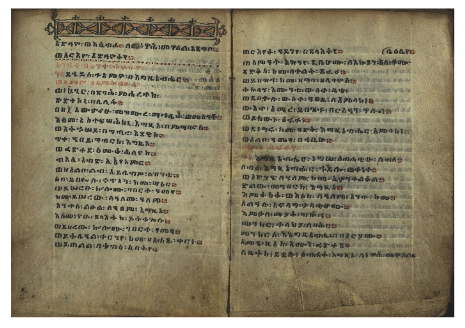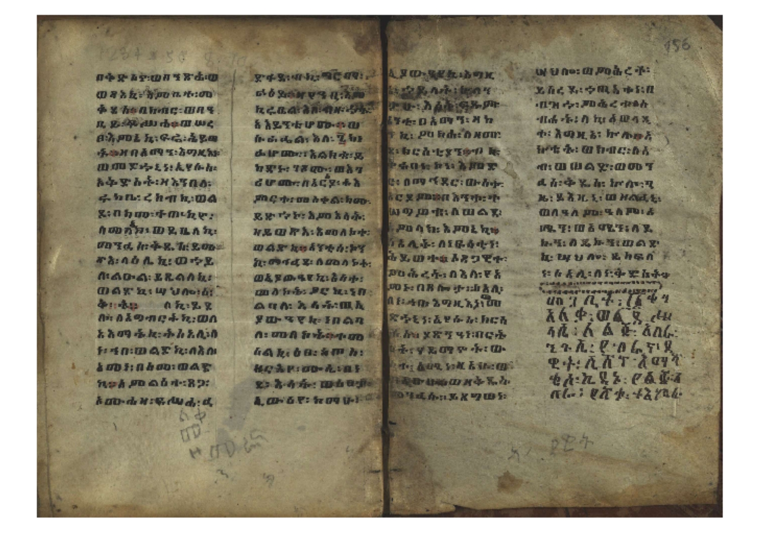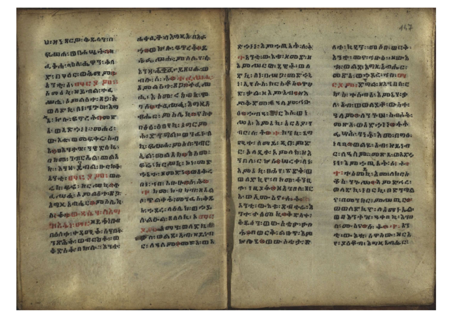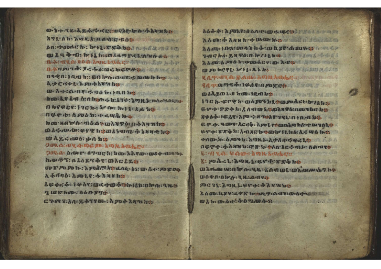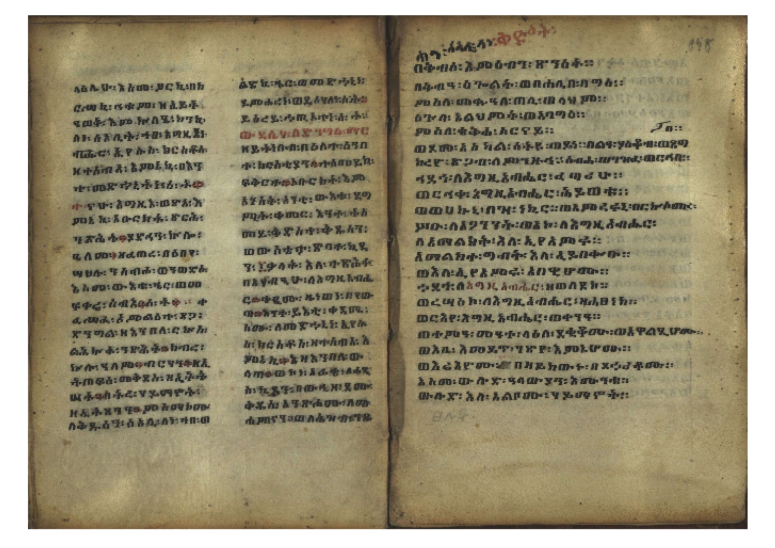 1. F. 1r–v: Mälkǝʾ-hymn to St Michael (Chaine nr. 119), written in an inaccurate hand. The words ሰላም፡ and ሚካኤል፡ are rubricated. Incipit: ሰላም፡ ለዝክረ፡ ስምከ፡ ምስለ፡ ስመ፡ ልዑል፡ ዘተሳተፈ። ወልደ፡ ያሬድ፡ ሄኖክ፡ በከመ፡ ጸሐፈ፡ ሶበ፡ እጼ<ውዕ፡> ስመከ፡ ከሲትየ፡ አፈ፡ ረዳኤ።. The text is incomplete. 2. Ff. 1v–2v: pen trials and other minor scribbles in pencil. 3. F. 156rb–v: Note on the commission of the manuscript, written in Amharic. It mentions the commissioner Aläqa Wäldä Śǝllase and the recipient Lǝǧǧ Abärra Nǝguse. Incipit: መጋቢት፡ ፲፩ቀን፡ አለቃ፡ ወልደ፡ ሥላሴ፡ ለልጅ፡ አበራ፡ ንጉሴ፡ የብራና፡ ዳዊት፡ ሲሸጥ፡ እማኝ፡ ቄስ፡ ኪዳኑ፡ የልጅ፡ አበራ፡ የሸቃ፡. ተእምራ(156v)ት፡ መድህን፡ አለቃ፡ ሐደረ፡ በሶስት፡ ብር፡ ታላድ፡ ሶሽጥ፡ በሶስት፡ ብር፡ ታላድ፡ ሺገዛ፡ ፈጣሚ፡ ብላ፡ ገብሩ፡. |