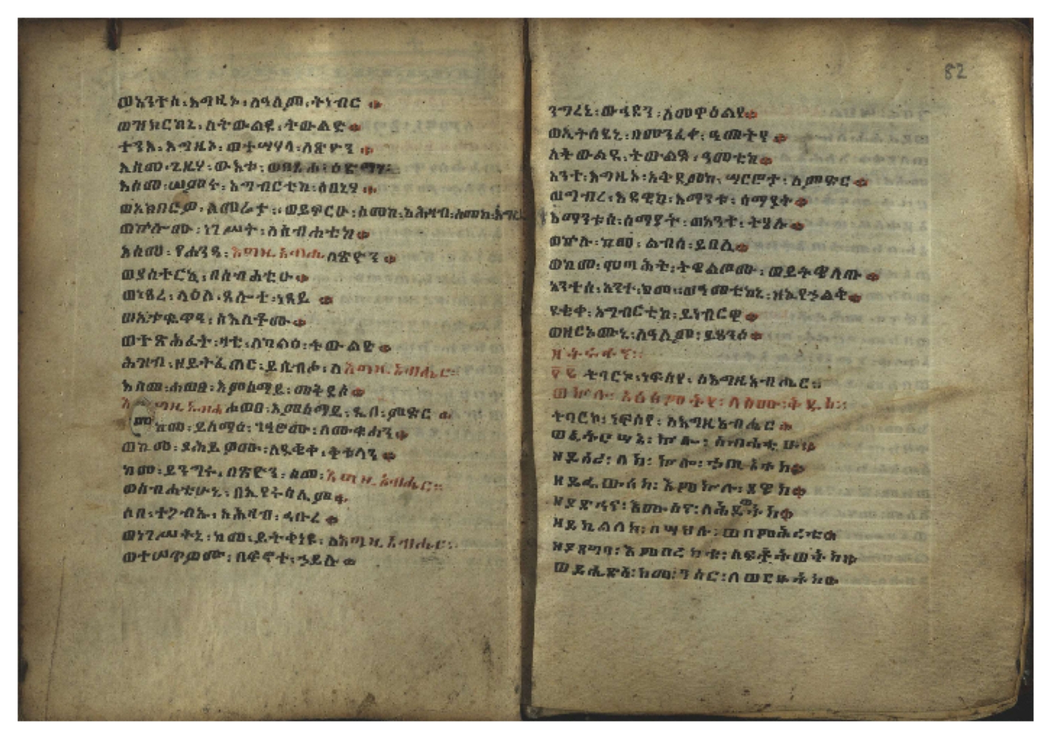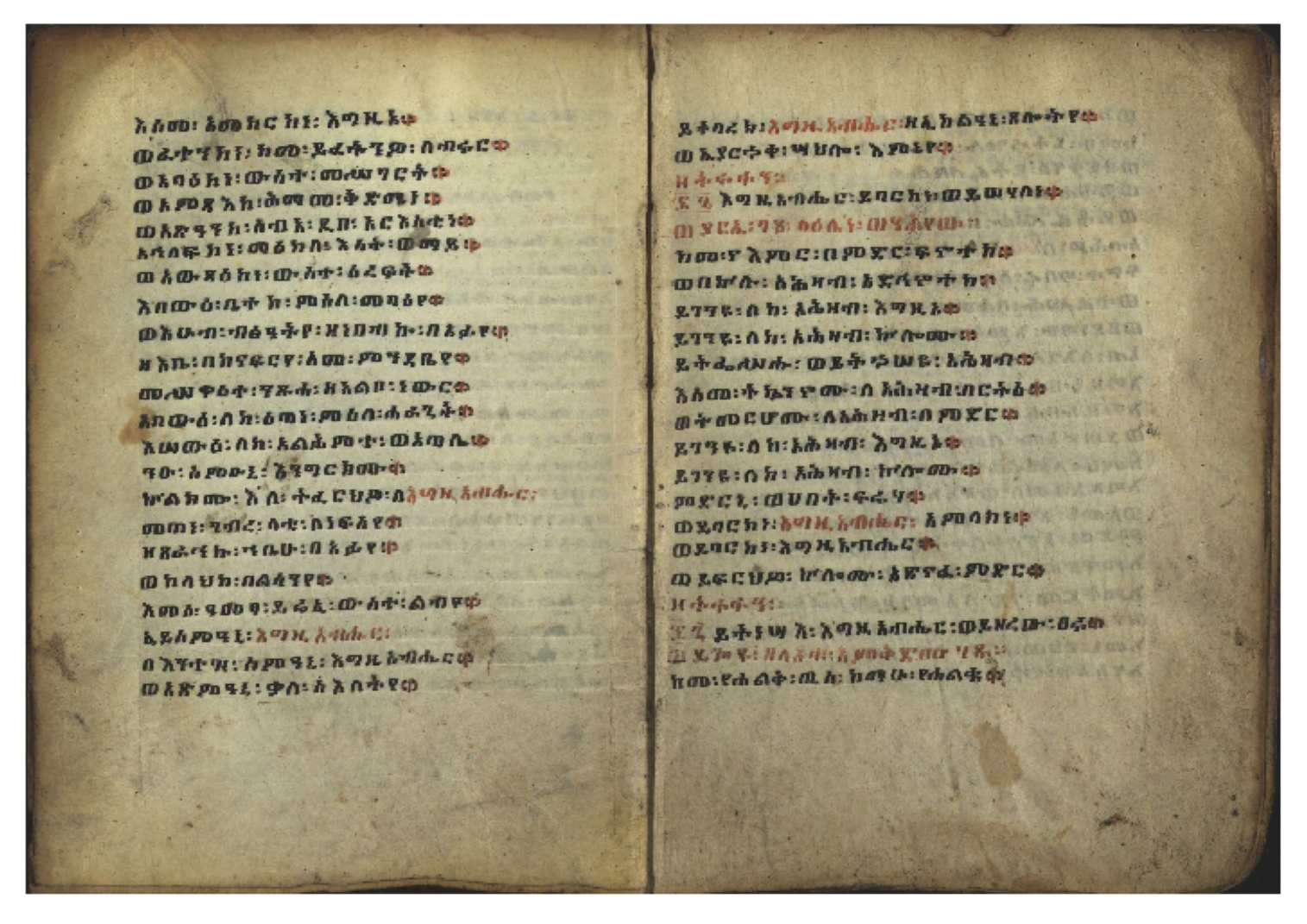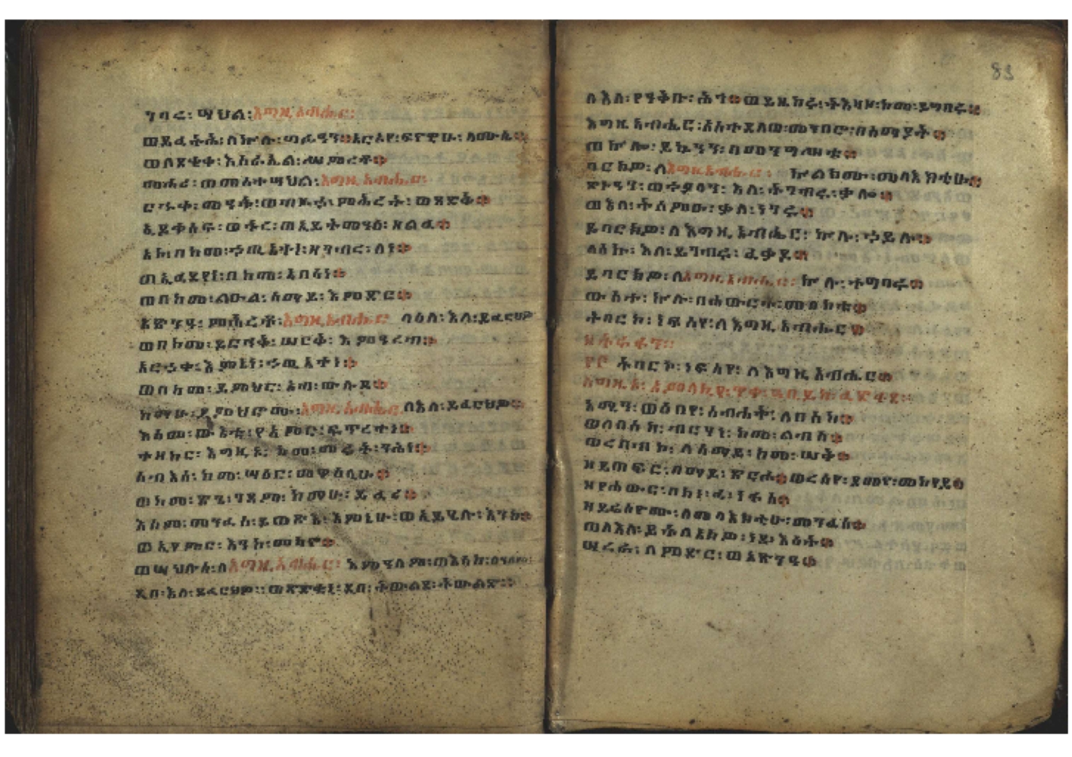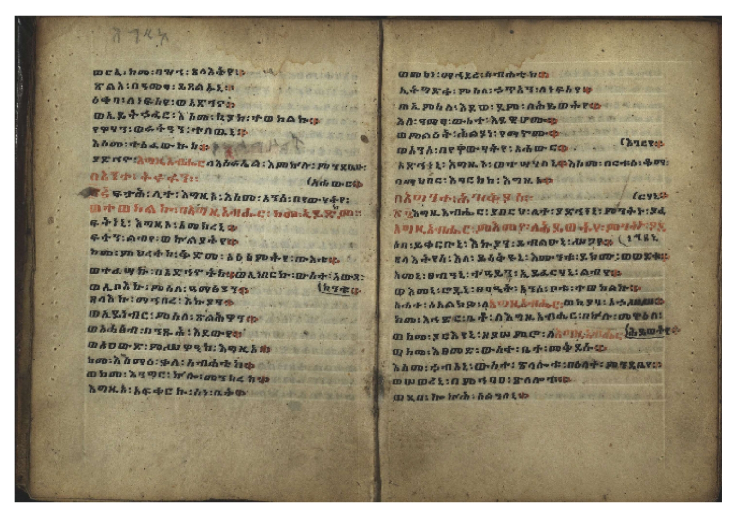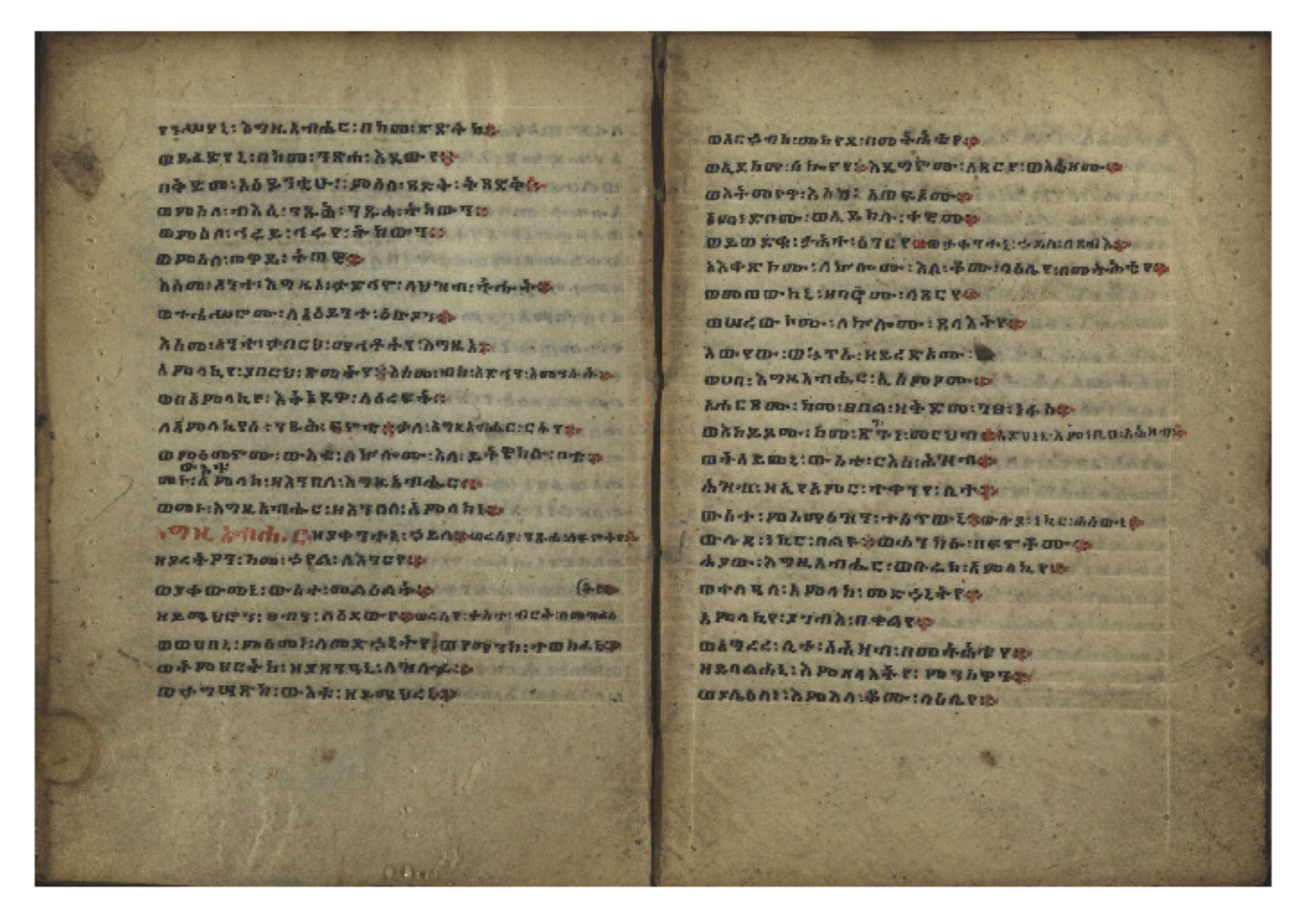 1. F. 1r–v: Mälkǝʾ-hymn to St Michael (Chaine nr. 119), written in an inaccurate hand. The words ሰላም፡ and ሚካኤል፡ are rubricated. Incipit: ሰላም፡ ለዝክረ፡ ስምከ፡ ምስለ፡ ስመ፡ ልዑል፡ ዘተሳተፈ። ወልደ፡ ያሬድ፡ ሄኖክ፡ በከመ፡ ጸሐፈ፡ ሶበ፡ እጼ<ውዕ፡> ስመከ፡ ከሲትየ፡ አፈ፡ ረዳኤ።. The text is incomplete. 2. Ff. 1v–2v: pen trials and other minor scribbles in pencil. 3. F. 156rb–v: Note on the commission of the manuscript, written in Amharic. It mentions the commissioner Aläqa Wäldä Śǝllase and the recipient Lǝǧǧ Abärra Nǝguse. Incipit: መጋቢት፡ ፲፩ቀን፡ አለቃ፡ ወልደ፡ ሥላሴ፡ ለልጅ፡ አበራ፡ ንጉሴ፡ የብራና፡ ዳዊት፡ ሲሸጥ፡ እማኝ፡ ቄስ፡ ኪዳኑ፡ የልጅ፡ አበራ፡ የሸቃ፡. ተእምራ(156v)ት፡ መድህን፡ አለቃ፡ ሐደረ፡ በሶስት፡ ብር፡ ታላድ፡ ሶሽጥ፡ በሶስት፡ ብር፡ ታላድ፡ ሺገዛ፡ ፈጣሚ፡ ብላ፡ ገብሩ፡. |