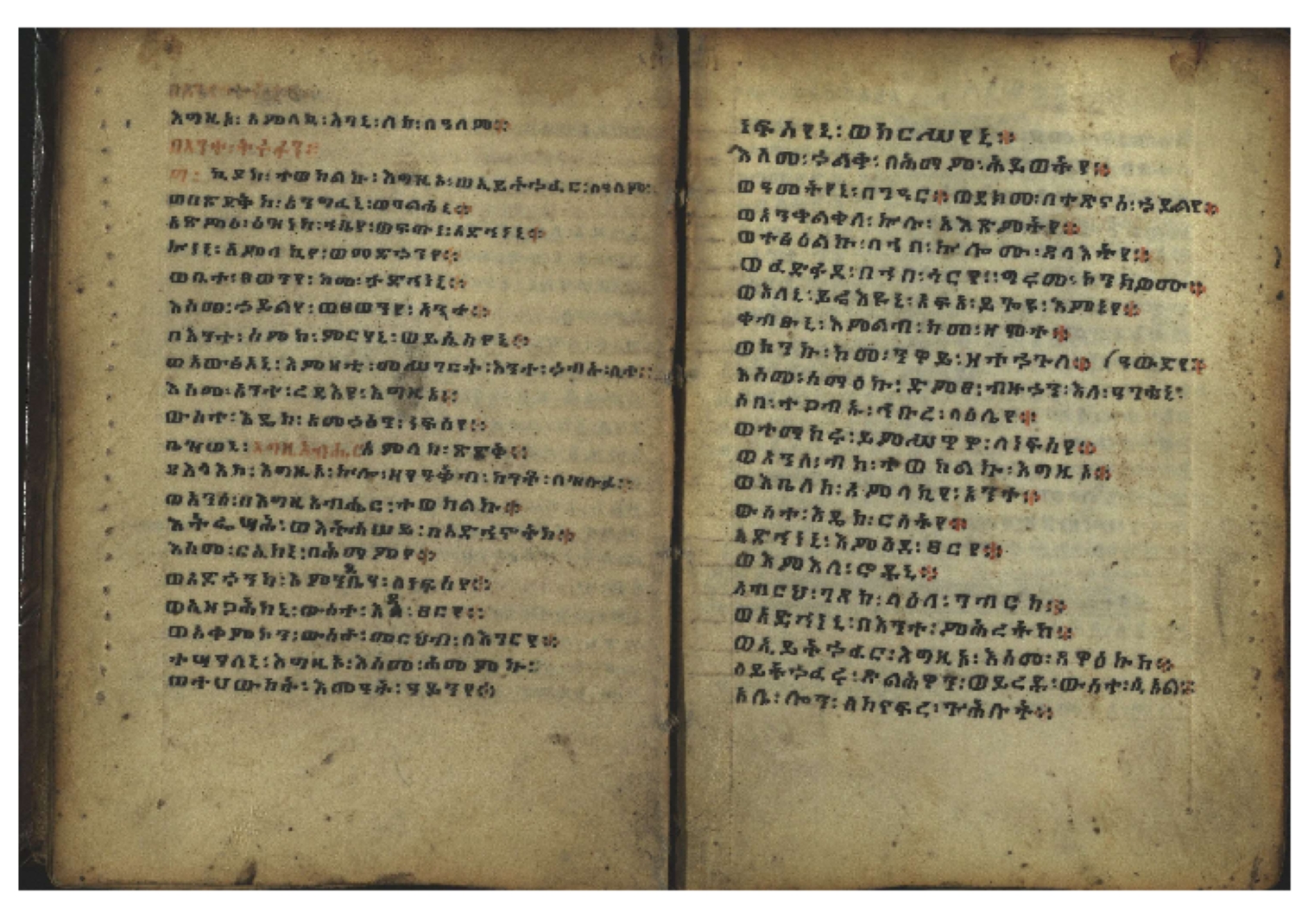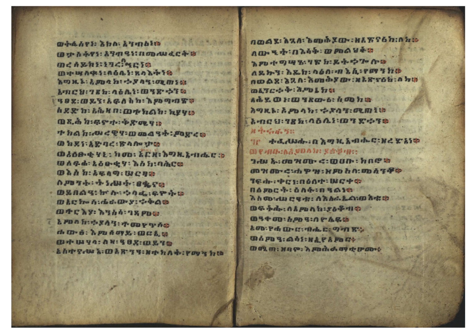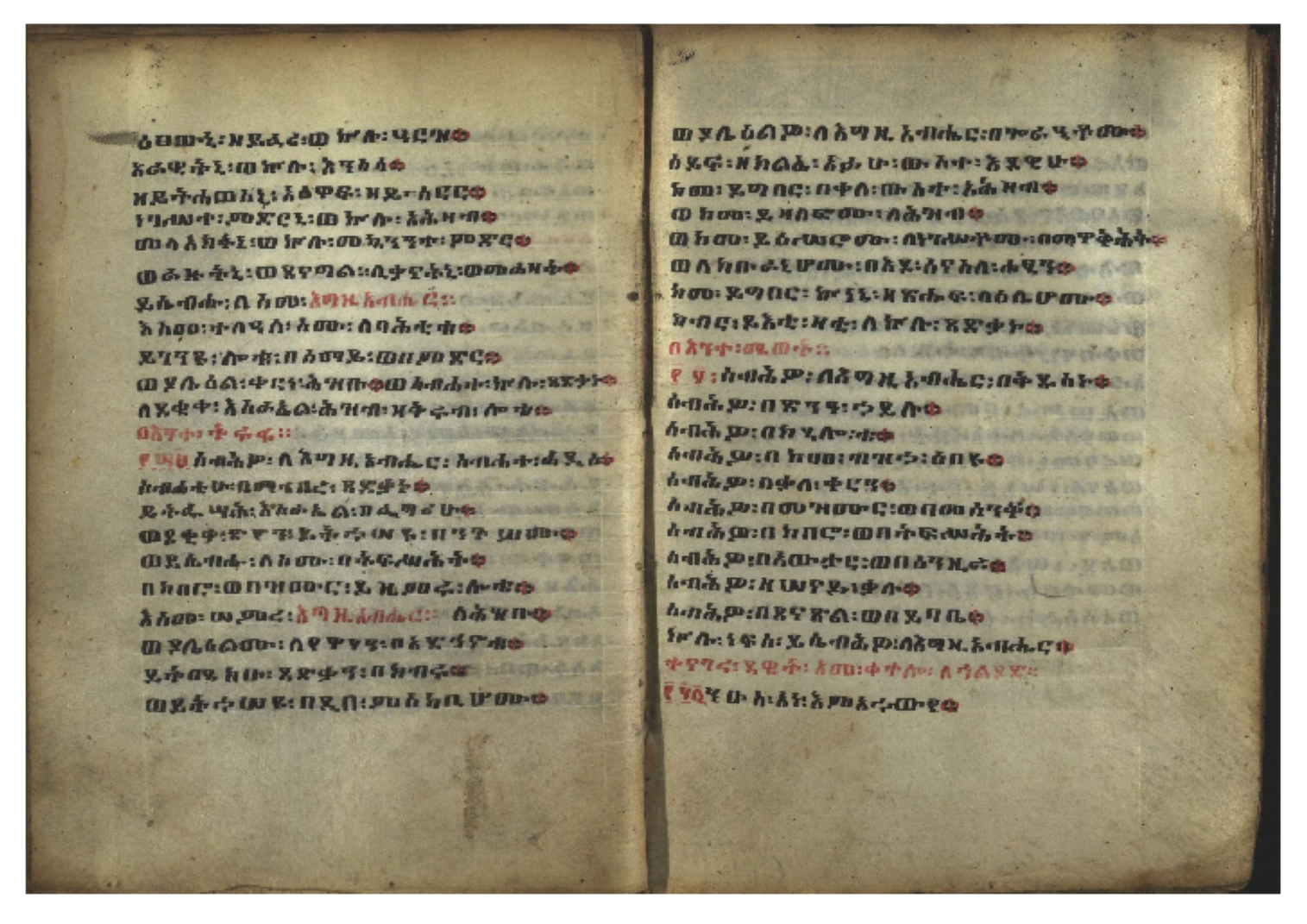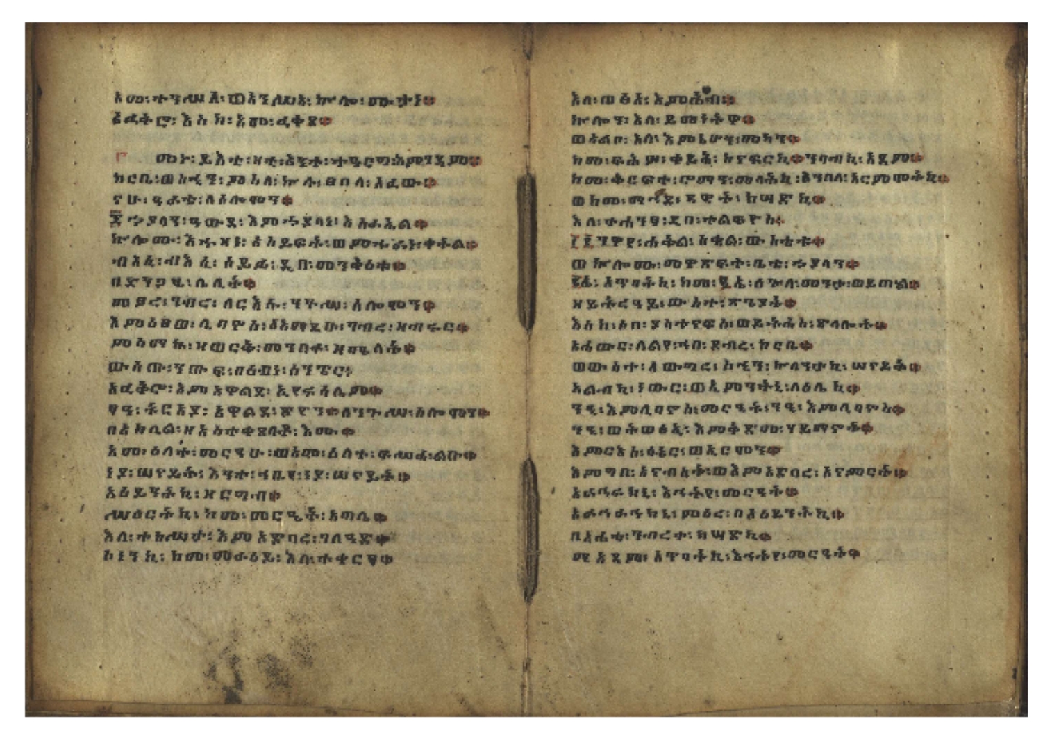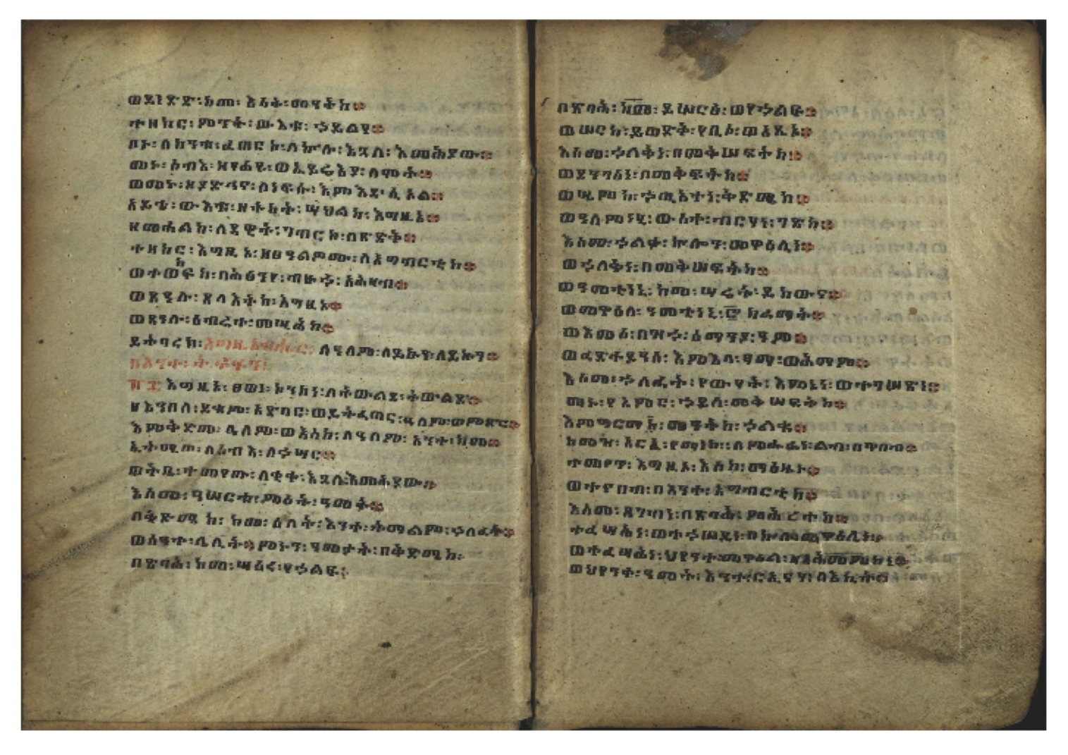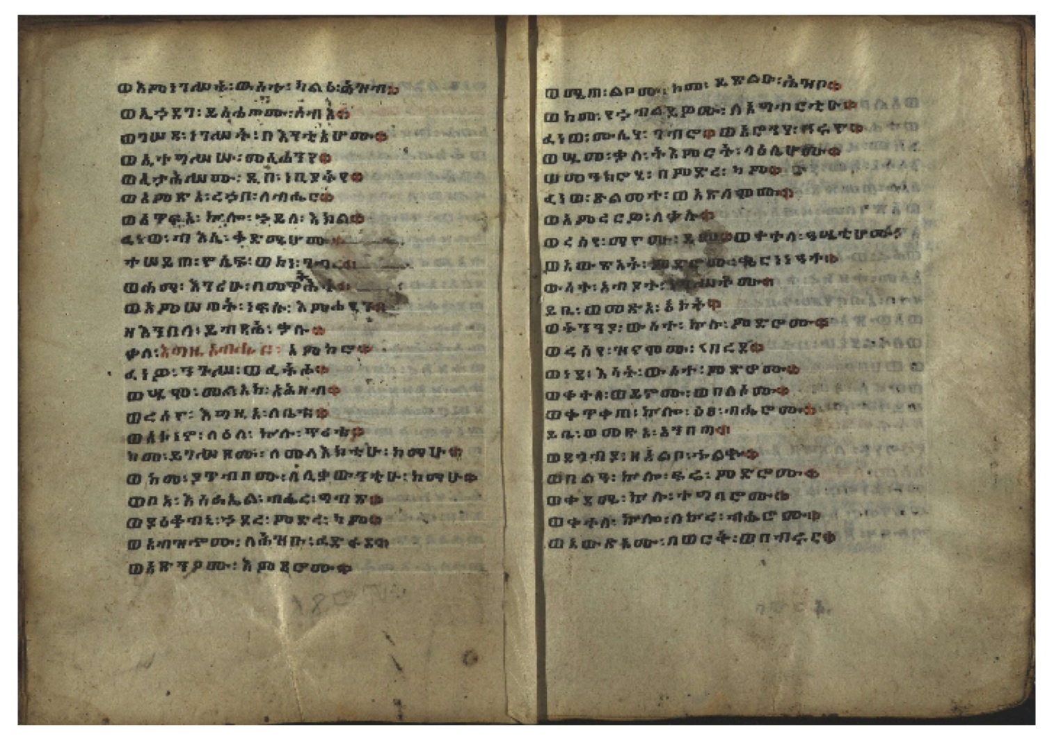 1. F. 1r–v: Mälkǝʾ-hymn to St Michael (Chaine nr. 119), written in an inaccurate hand. The words ሰላም፡ and ሚካኤል፡ are rubricated. Incipit: ሰላም፡ ለዝክረ፡ ስምከ፡ ምስለ፡ ስመ፡ ልዑል፡ ዘተሳተፈ። ወልደ፡ ያሬድ፡ ሄኖክ፡ በከመ፡ ጸሐፈ፡ ሶበ፡ እጼ<ውዕ፡> ስመከ፡ ከሲትየ፡ አፈ፡ ረዳኤ።. The text is incomplete. 2. Ff. 1v–2v: pen trials and other minor scribbles in pencil. 3. F. 156rb–v: Note on the commission of the manuscript, written in Amharic. It mentions the commissioner Aläqa Wäldä Śǝllase and the recipient Lǝǧǧ Abärra Nǝguse. Incipit: መጋቢት፡ ፲፩ቀን፡ አለቃ፡ ወልደ፡ ሥላሴ፡ ለልጅ፡ አበራ፡ ንጉሴ፡ የብራና፡ ዳዊት፡ ሲሸጥ፡ እማኝ፡ ቄስ፡ ኪዳኑ፡ የልጅ፡ አበራ፡ የሸቃ፡. ተእምራ(156v)ት፡ መድህን፡ አለቃ፡ ሐደረ፡ በሶስት፡ ብር፡ ታላድ፡ ሶሽጥ፡ በሶስት፡ ብር፡ ታላድ፡ ሺገዛ፡ ፈጣሚ፡ ብላ፡ ገብሩ፡. |