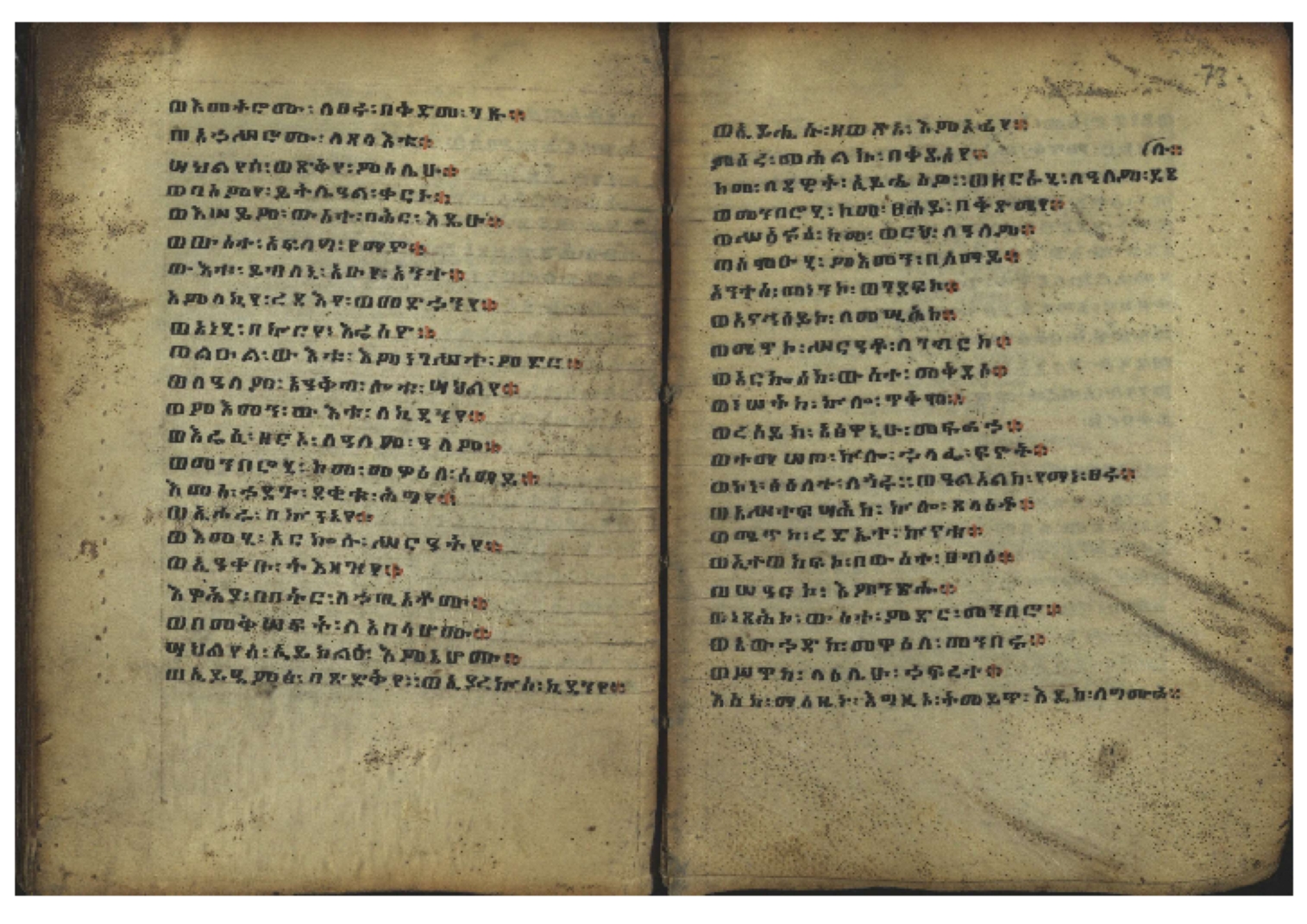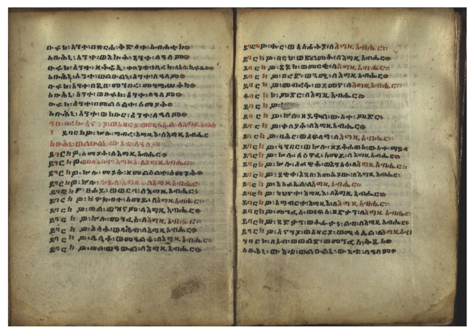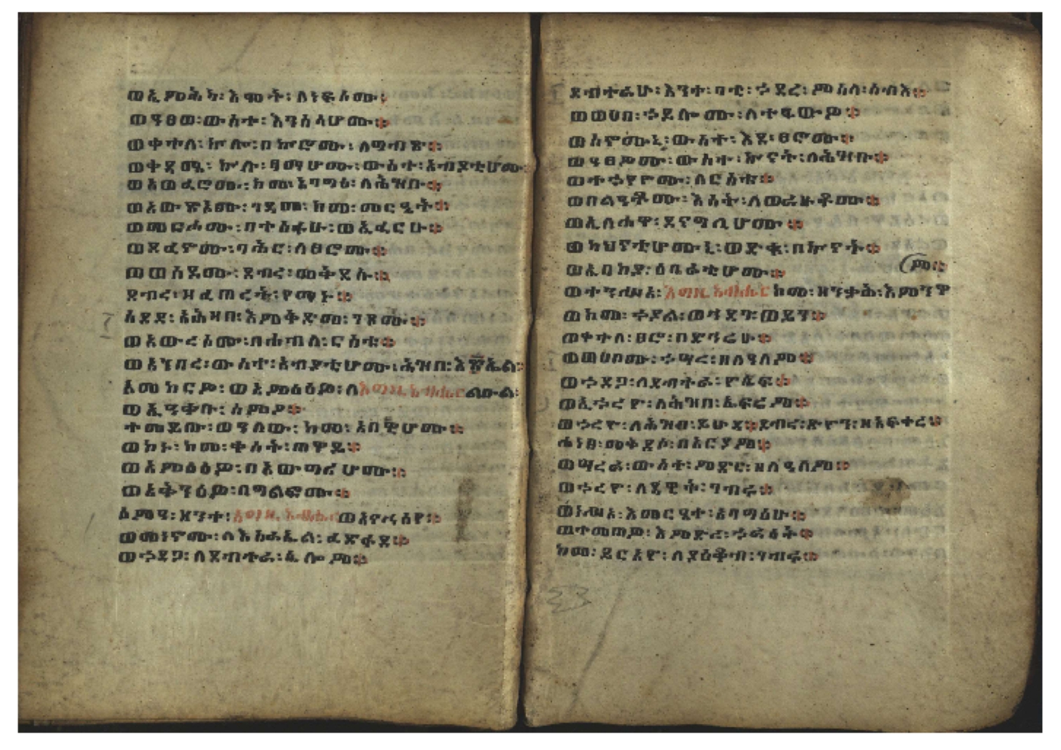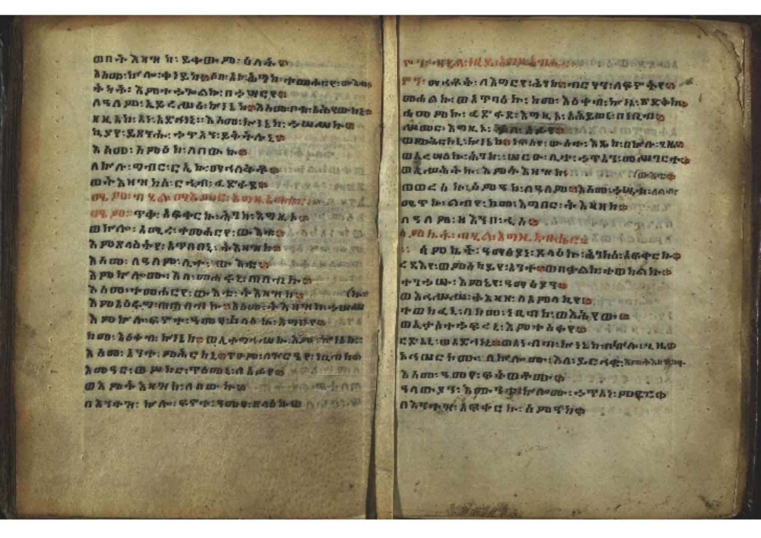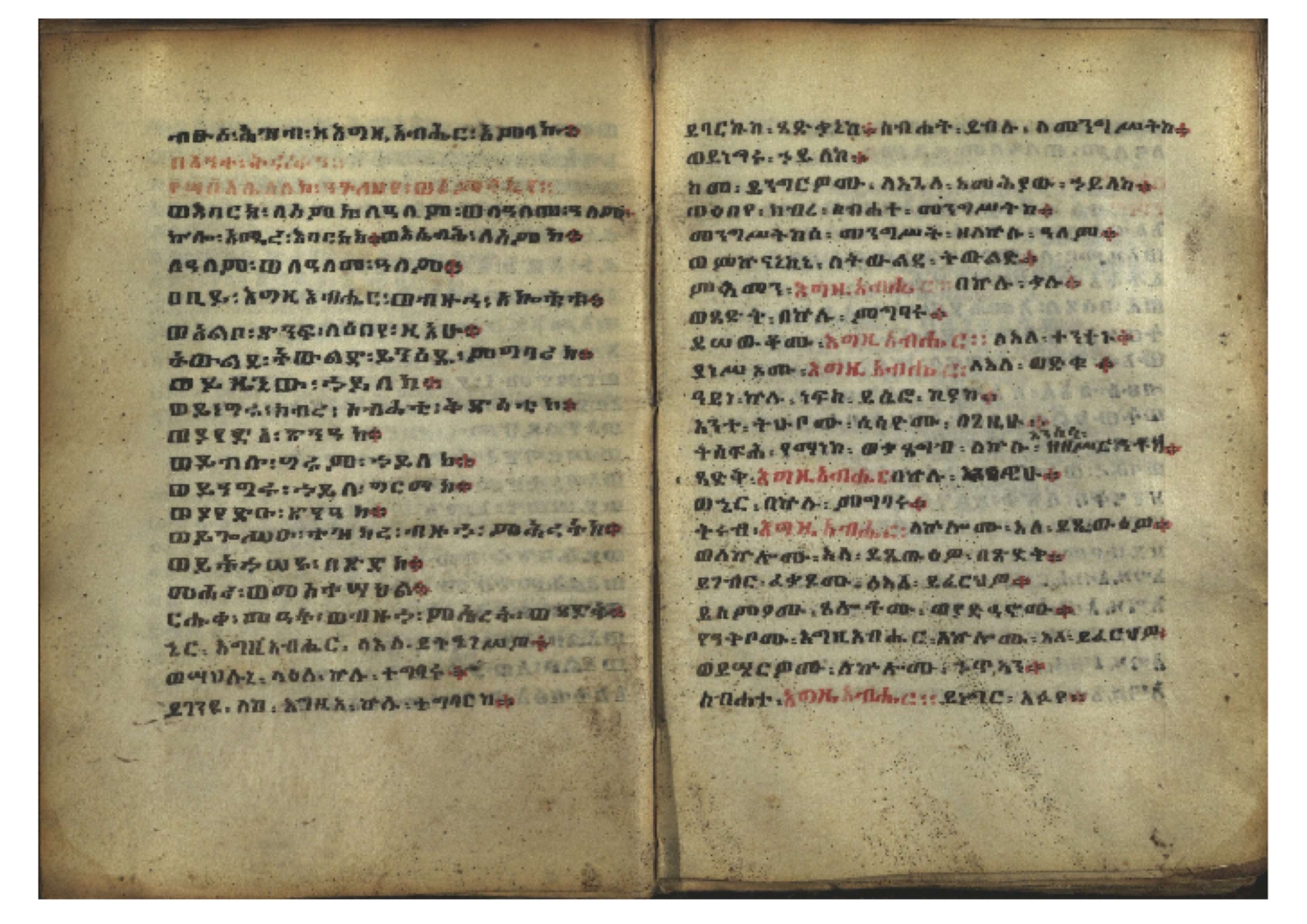 1. F. 1r–v: Mälkǝʾ-hymn to St Michael (Chaine nr. 119), written in an inaccurate hand. The words ሰላም፡ and ሚካኤል፡ are rubricated. Incipit: ሰላም፡ ለዝክረ፡ ስምከ፡ ምስለ፡ ስመ፡ ልዑል፡ ዘተሳተፈ። ወልደ፡ ያሬድ፡ ሄኖክ፡ በከመ፡ ጸሐፈ፡ ሶበ፡ እጼ<ውዕ፡> ስመከ፡ ከሲትየ፡ አፈ፡ ረዳኤ።. The text is incomplete. 2. Ff. 1v–2v: pen trials and other minor scribbles in pencil. 3. F. 156rb–v: Note on the commission of the manuscript, written in Amharic. It mentions the commissioner Aläqa Wäldä Śǝllase and the recipient Lǝǧǧ Abärra Nǝguse. Incipit: መጋቢት፡ ፲፩ቀን፡ አለቃ፡ ወልደ፡ ሥላሴ፡ ለልጅ፡ አበራ፡ ንጉሴ፡ የብራና፡ ዳዊት፡ ሲሸጥ፡ እማኝ፡ ቄስ፡ ኪዳኑ፡ የልጅ፡ አበራ፡ የሸቃ፡. ተእምራ(156v)ት፡ መድህን፡ አለቃ፡ ሐደረ፡ በሶስት፡ ብር፡ ታላድ፡ ሶሽጥ፡ በሶስት፡ ብር፡ ታላድ፡ ሺገዛ፡ ፈጣሚ፡ ብላ፡ ገብሩ፡. |