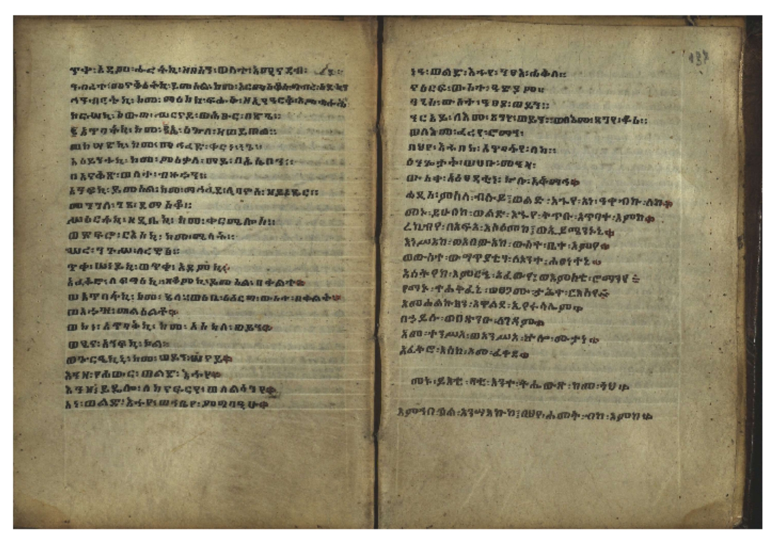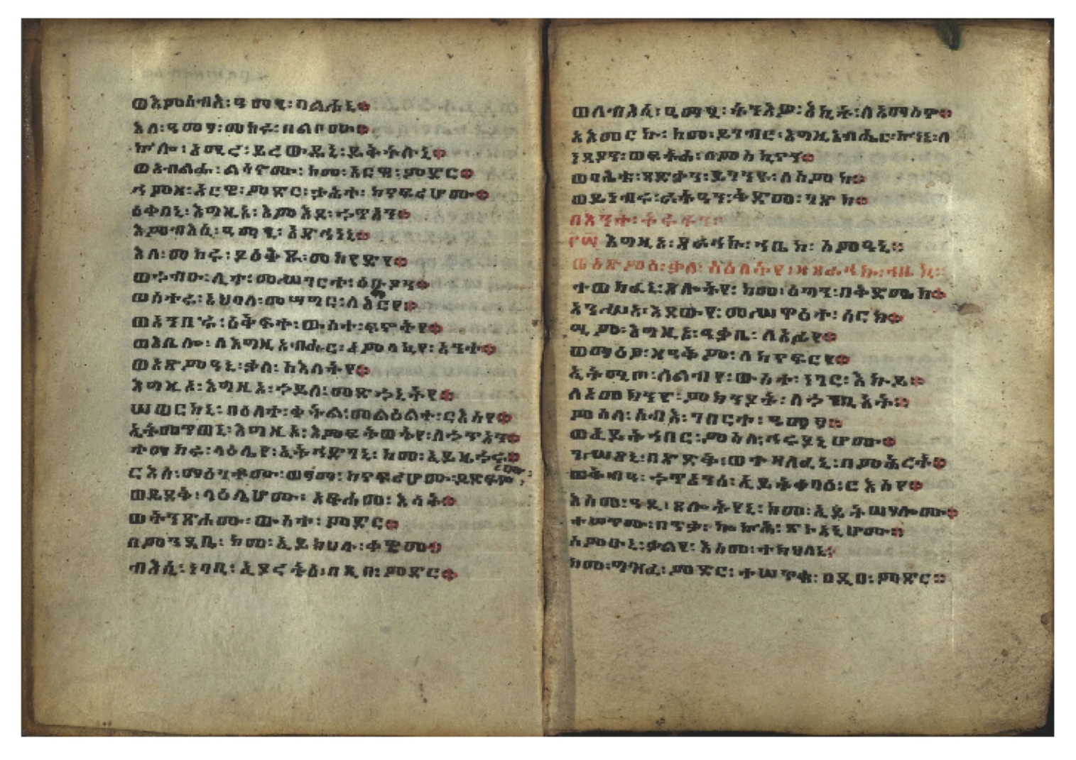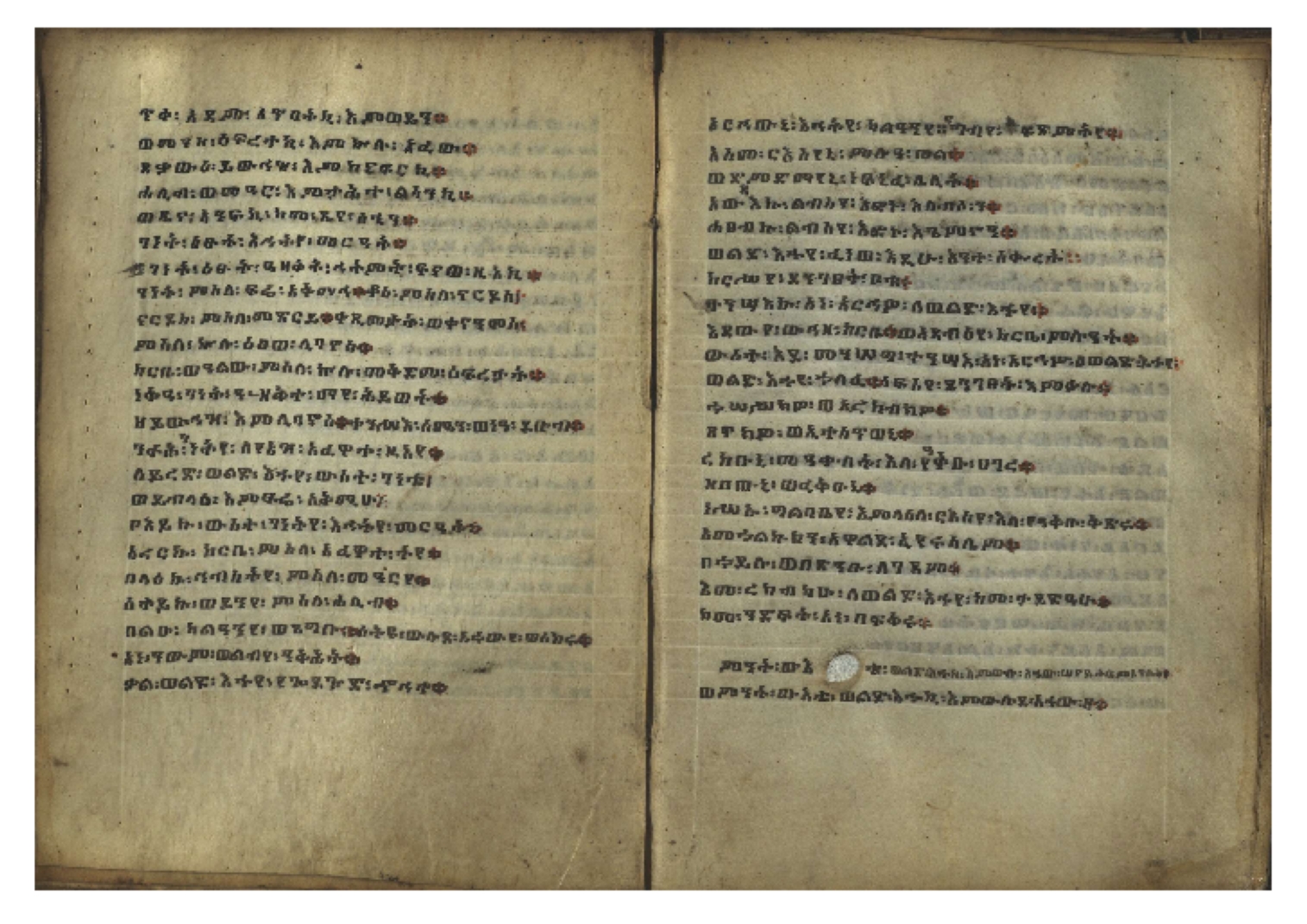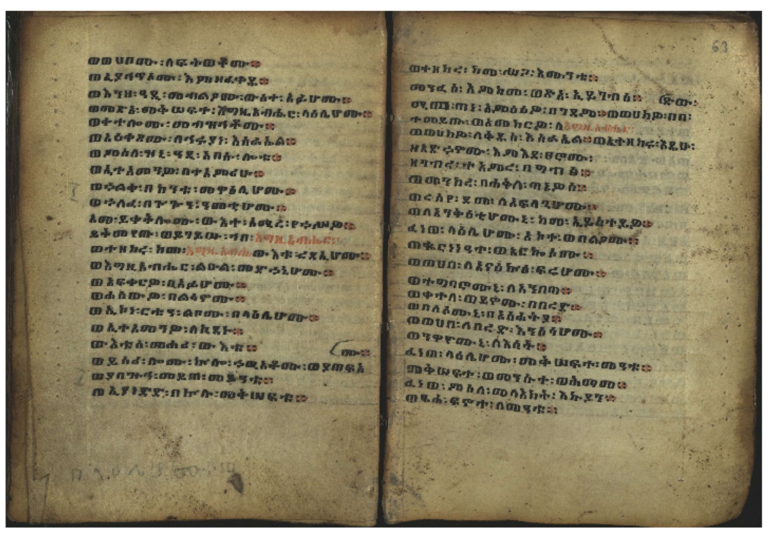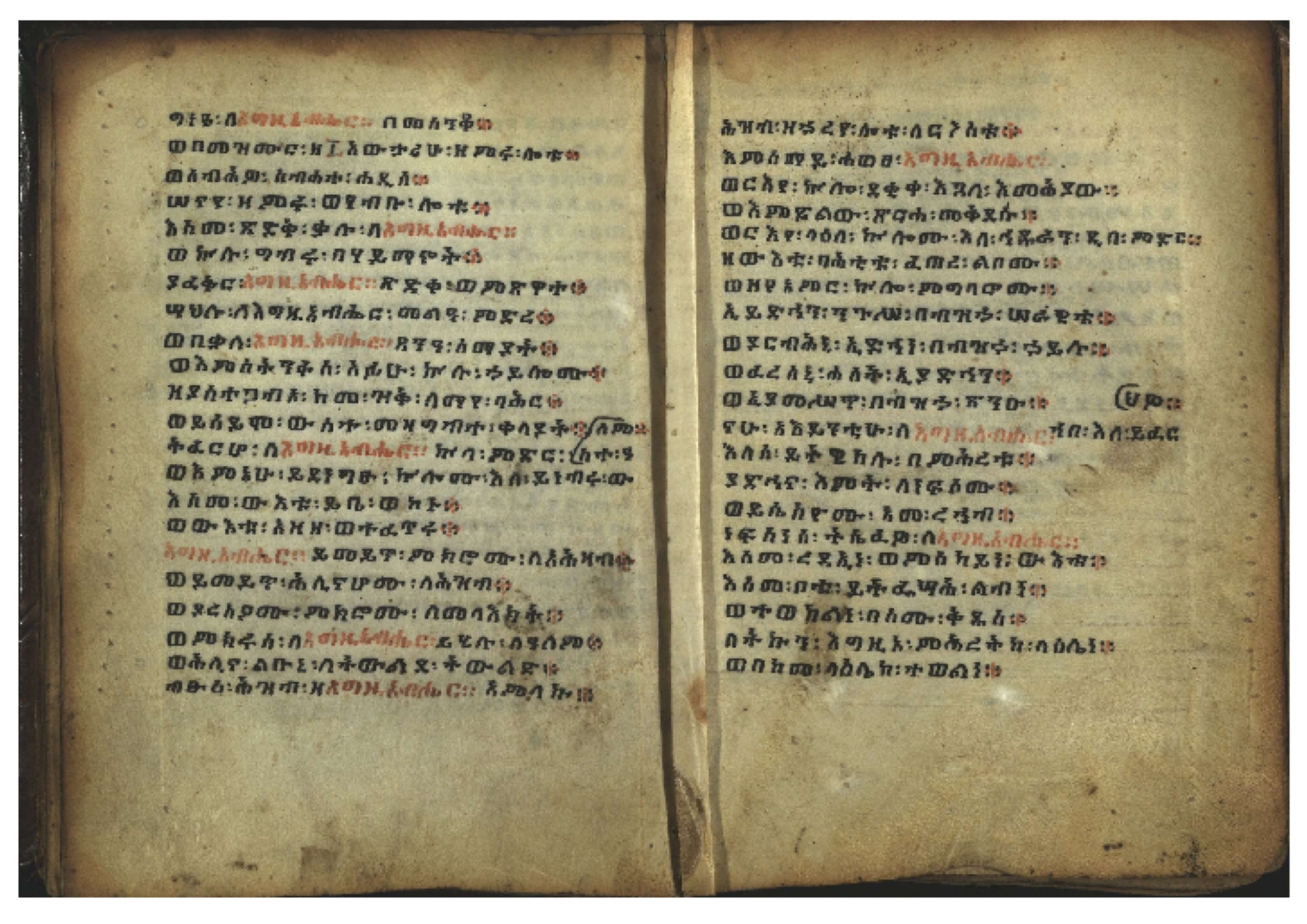 1. F. 1r–v: Mälkǝʾ-hymn to St Michael (Chaine nr. 119), written in an inaccurate hand. The words ሰላም፡ and ሚካኤል፡ are rubricated. Incipit: ሰላም፡ ለዝክረ፡ ስምከ፡ ምስለ፡ ስመ፡ ልዑል፡ ዘተሳተፈ። ወልደ፡ ያሬድ፡ ሄኖክ፡ በከመ፡ ጸሐፈ፡ ሶበ፡ እጼ<ውዕ፡> ስመከ፡ ከሲትየ፡ አፈ፡ ረዳኤ።. The text is incomplete. 2. Ff. 1v–2v: pen trials and other minor scribbles in pencil. 3. F. 156rb–v: Note on the commission of the manuscript, written in Amharic. It mentions the commissioner Aläqa Wäldä Śǝllase and the recipient Lǝǧǧ Abärra Nǝguse. Incipit: መጋቢት፡ ፲፩ቀን፡ አለቃ፡ ወልደ፡ ሥላሴ፡ ለልጅ፡ አበራ፡ ንጉሴ፡ የብራና፡ ዳዊት፡ ሲሸጥ፡ እማኝ፡ ቄስ፡ ኪዳኑ፡ የልጅ፡ አበራ፡ የሸቃ፡. ተእምራ(156v)ት፡ መድህን፡ አለቃ፡ ሐደረ፡ በሶስት፡ ብር፡ ታላድ፡ ሶሽጥ፡ በሶስት፡ ብር፡ ታላድ፡ ሺገዛ፡ ፈጣሚ፡ ብላ፡ ገብሩ፡. |