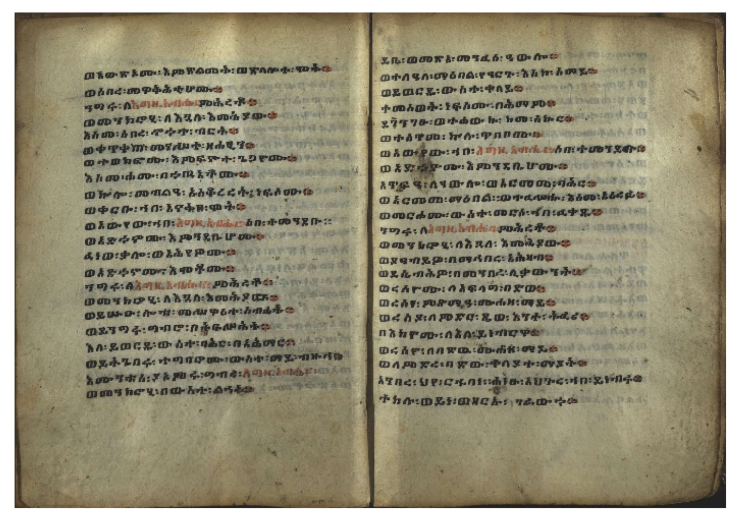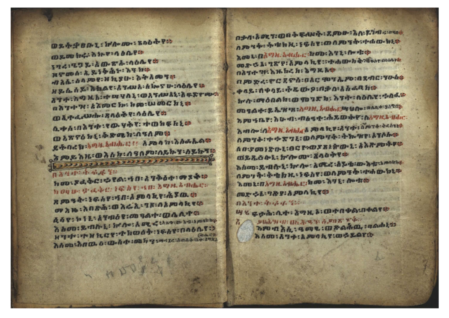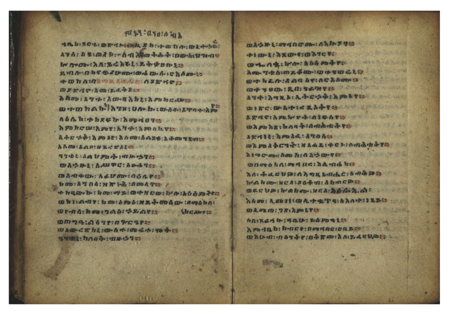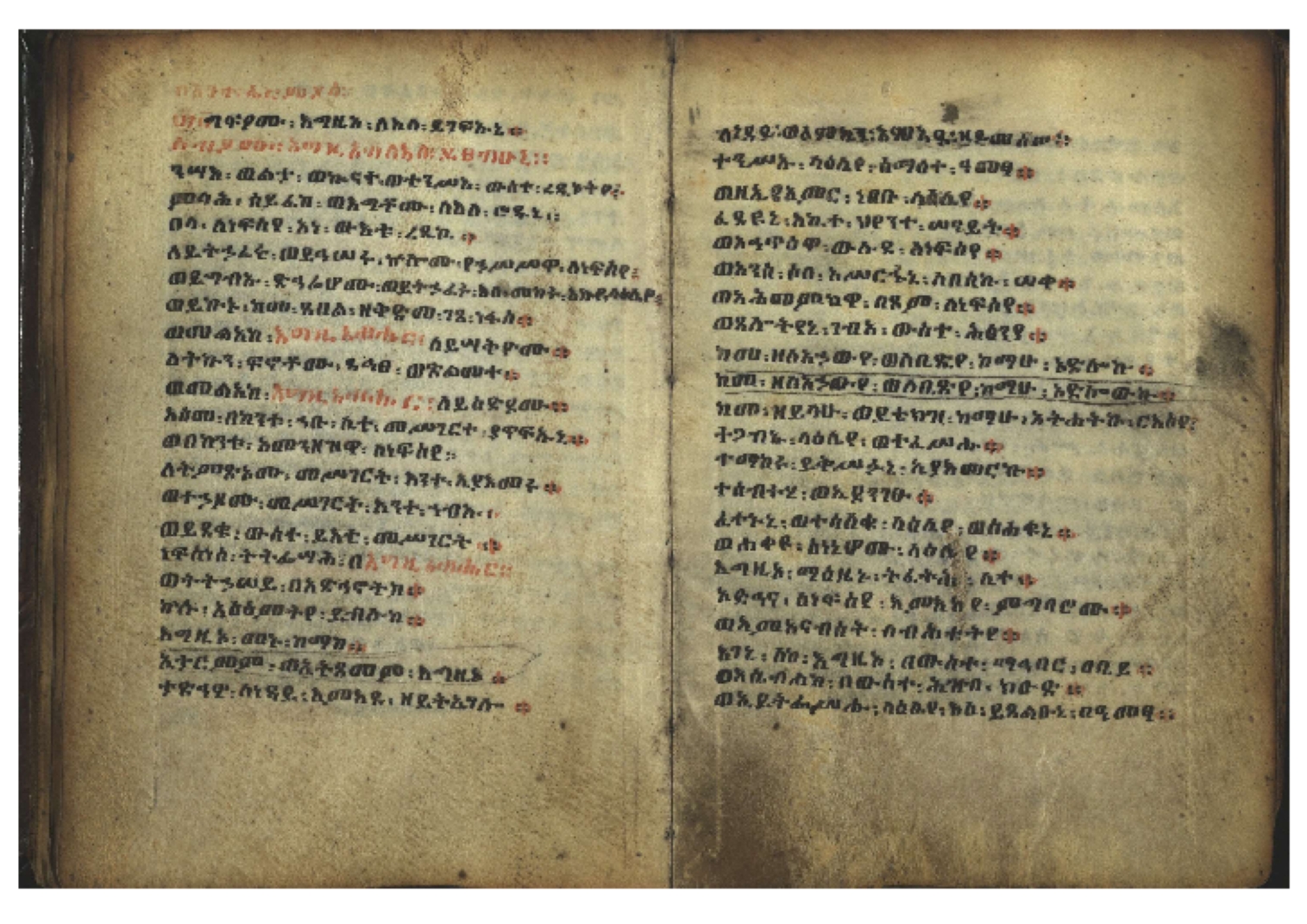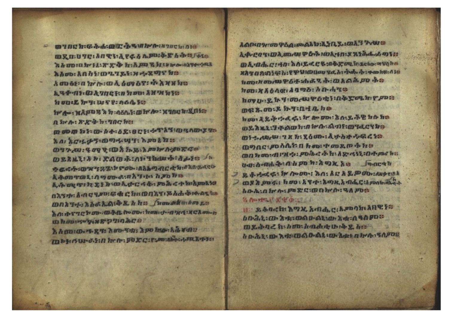 1. F. 1r–v: Mälkǝʾ-hymn to St Michael (Chaine nr. 119), written in an inaccurate hand. The words ሰላም፡ and ሚካኤል፡ are rubricated. Incipit: ሰላም፡ ለዝክረ፡ ስምከ፡ ምስለ፡ ስመ፡ ልዑል፡ ዘተሳተፈ። ወልደ፡ ያሬድ፡ ሄኖክ፡ በከመ፡ ጸሐፈ፡ ሶበ፡ እጼ<ውዕ፡> ስመከ፡ ከሲትየ፡ አፈ፡ ረዳኤ።. The text is incomplete. 2. Ff. 1v–2v: pen trials and other minor scribbles in pencil. 3. F. 156rb–v: Note on the commission of the manuscript, written in Amharic. It mentions the commissioner Aläqa Wäldä Śǝllase and the recipient Lǝǧǧ Abärra Nǝguse. Incipit: መጋቢት፡ ፲፩ቀን፡ አለቃ፡ ወልደ፡ ሥላሴ፡ ለልጅ፡ አበራ፡ ንጉሴ፡ የብራና፡ ዳዊት፡ ሲሸጥ፡ እማኝ፡ ቄስ፡ ኪዳኑ፡ የልጅ፡ አበራ፡ የሸቃ፡. ተእምራ(156v)ት፡ መድህን፡ አለቃ፡ ሐደረ፡ በሶስት፡ ብር፡ ታላድ፡ ሶሽጥ፡ በሶስት፡ ብር፡ ታላድ፡ ሺገዛ፡ ፈጣሚ፡ ብላ፡ ገብሩ፡. |