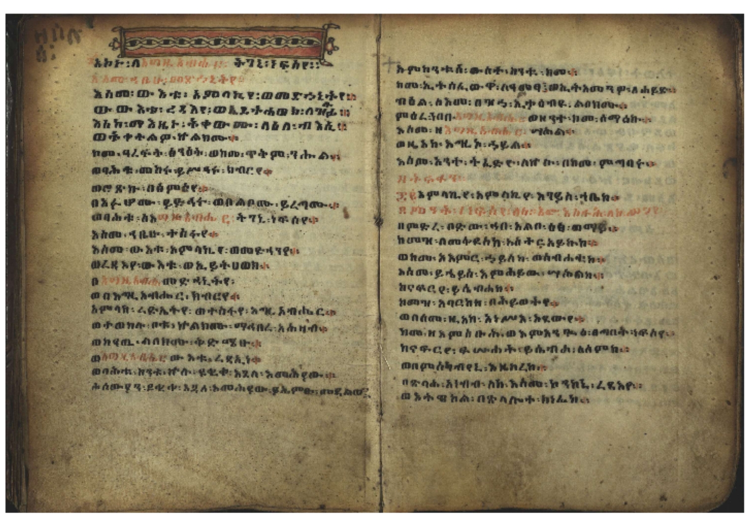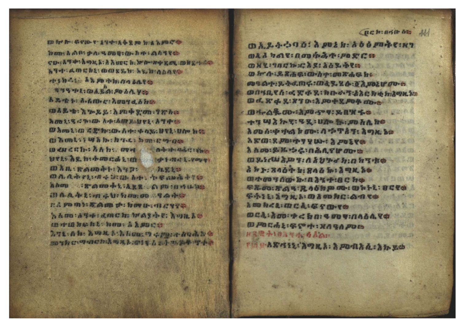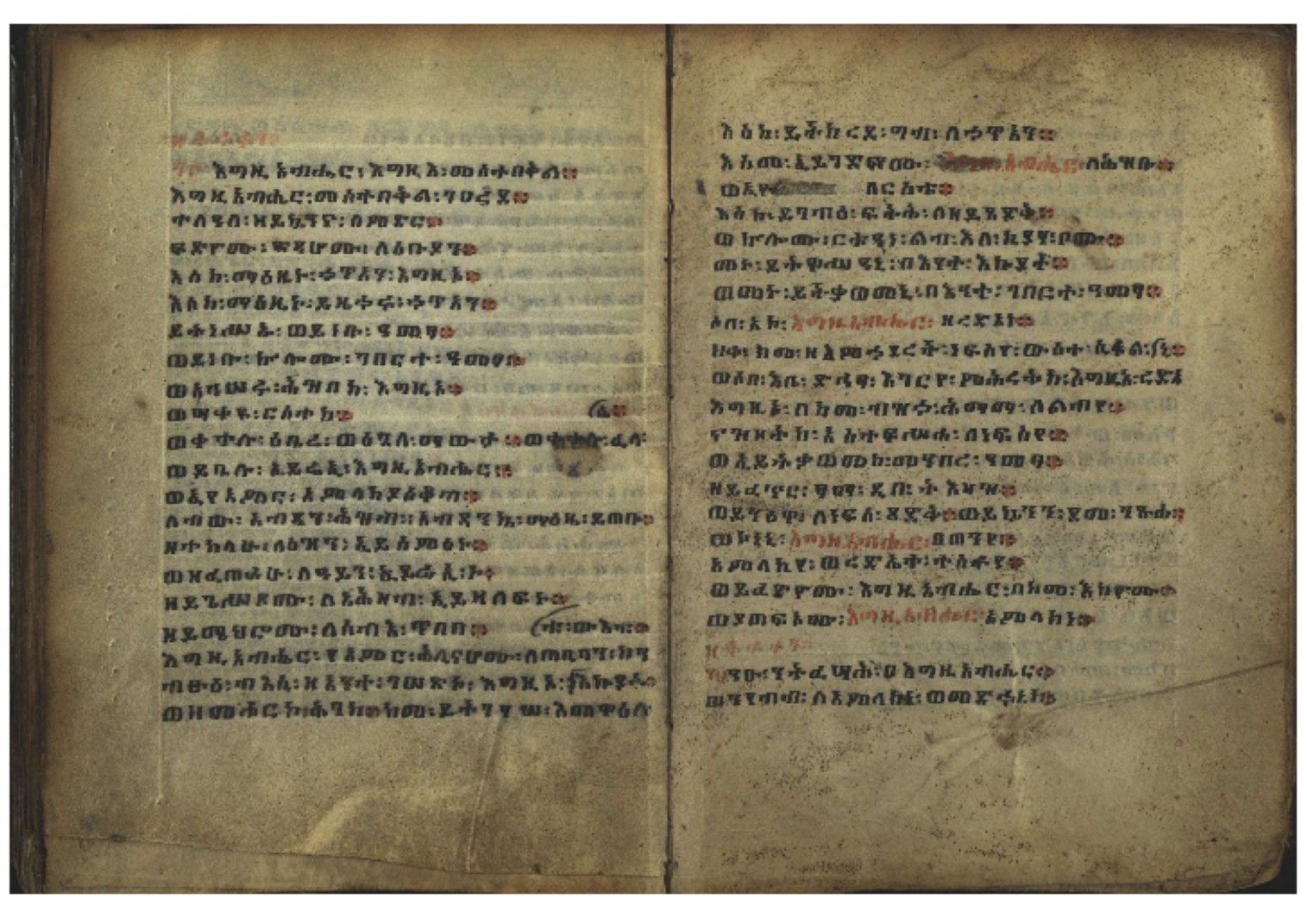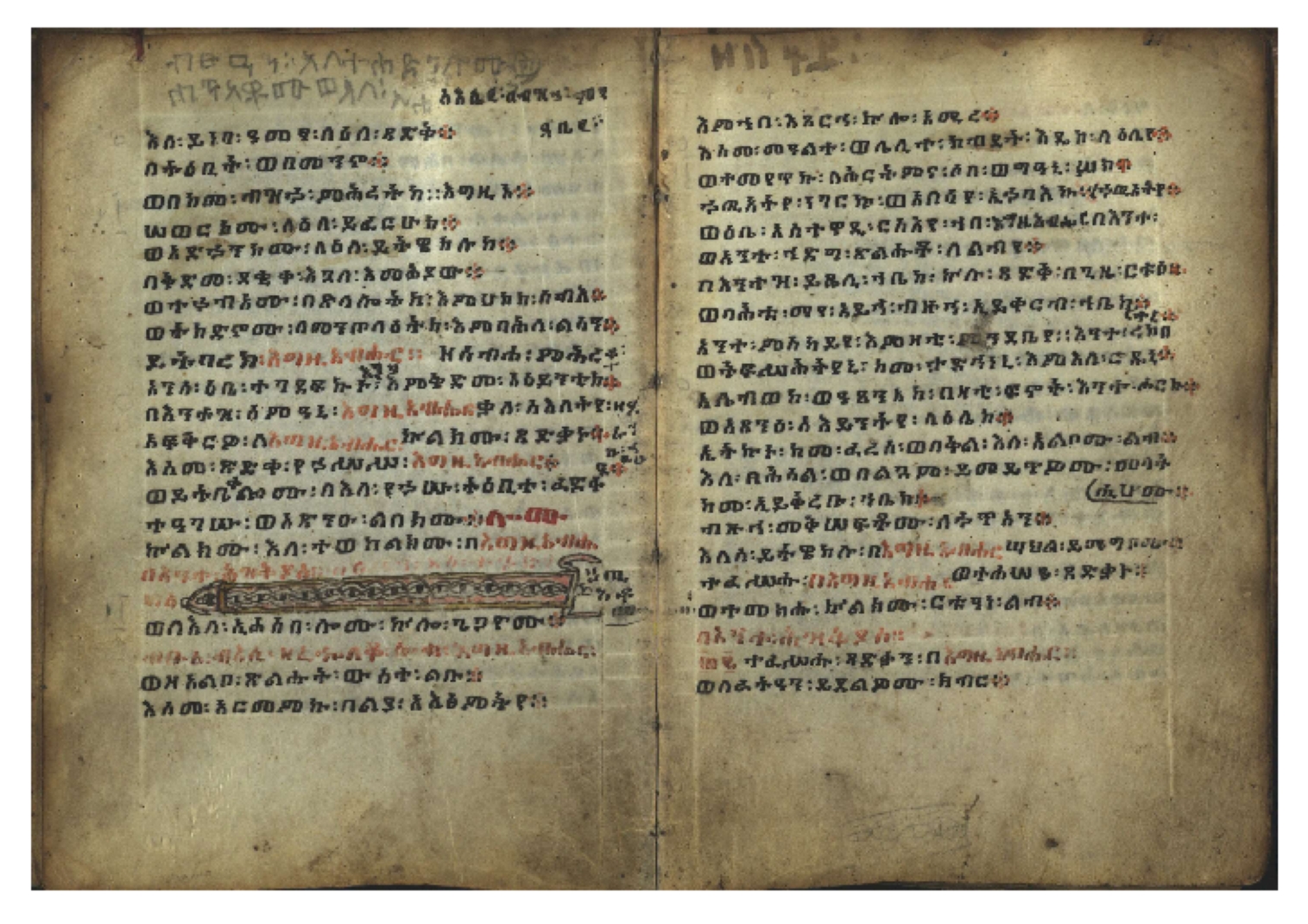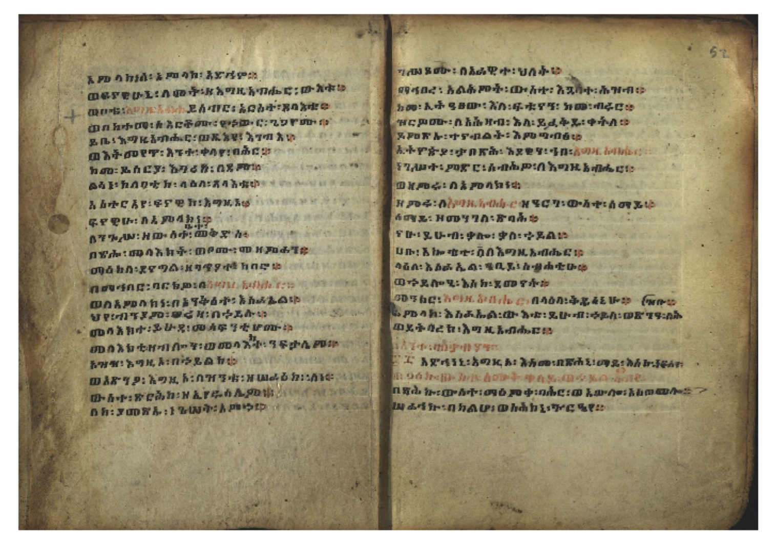 1. F. 1r–v: Mälkǝʾ-hymn to St Michael (Chaine nr. 119), written in an inaccurate hand. The words ሰላም፡ and ሚካኤል፡ are rubricated. Incipit: ሰላም፡ ለዝክረ፡ ስምከ፡ ምስለ፡ ስመ፡ ልዑል፡ ዘተሳተፈ። ወልደ፡ ያሬድ፡ ሄኖክ፡ በከመ፡ ጸሐፈ፡ ሶበ፡ እጼ<ውዕ፡> ስመከ፡ ከሲትየ፡ አፈ፡ ረዳኤ።. The text is incomplete. 2. Ff. 1v–2v: pen trials and other minor scribbles in pencil. 3. F. 156rb–v: Note on the commission of the manuscript, written in Amharic. It mentions the commissioner Aläqa Wäldä Śǝllase and the recipient Lǝǧǧ Abärra Nǝguse. Incipit: መጋቢት፡ ፲፩ቀን፡ አለቃ፡ ወልደ፡ ሥላሴ፡ ለልጅ፡ አበራ፡ ንጉሴ፡ የብራና፡ ዳዊት፡ ሲሸጥ፡ እማኝ፡ ቄስ፡ ኪዳኑ፡ የልጅ፡ አበራ፡ የሸቃ፡. ተእምራ(156v)ት፡ መድህን፡ አለቃ፡ ሐደረ፡ በሶስት፡ ብር፡ ታላድ፡ ሶሽጥ፡ በሶስት፡ ብር፡ ታላድ፡ ሺገዛ፡ ፈጣሚ፡ ብላ፡ ገብሩ፡. |