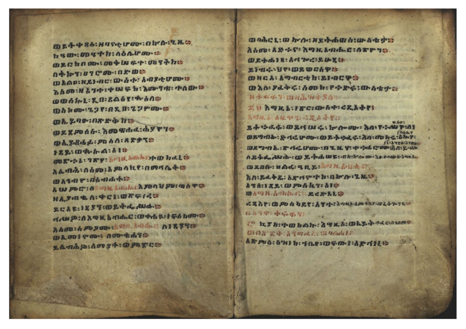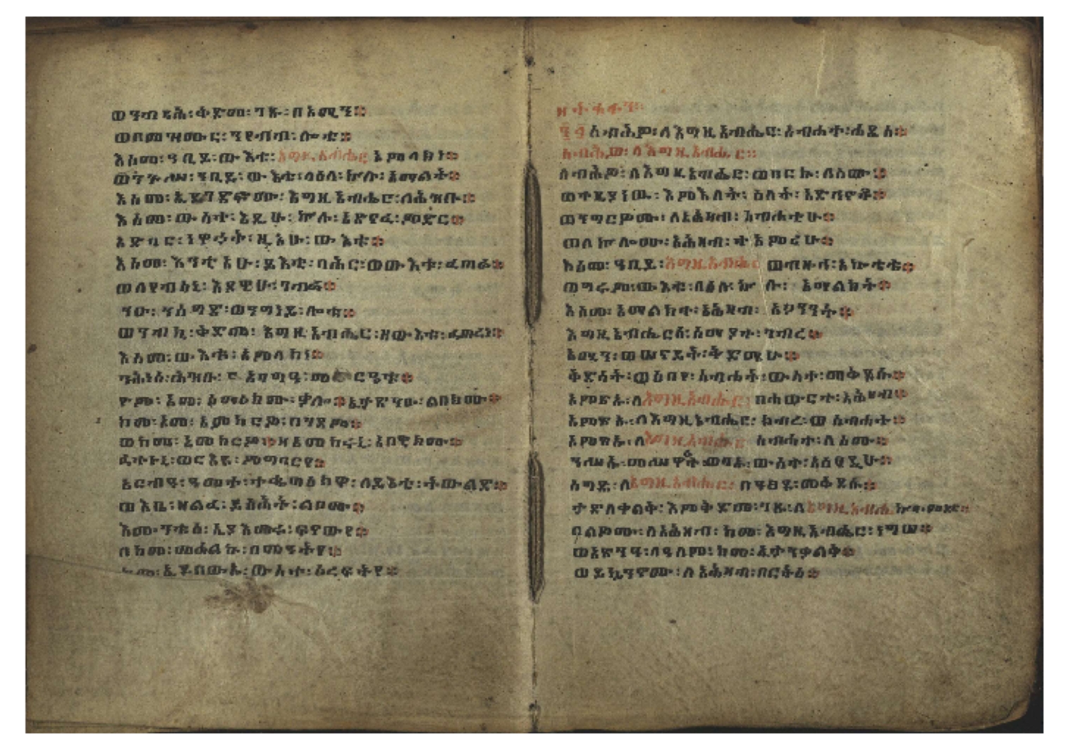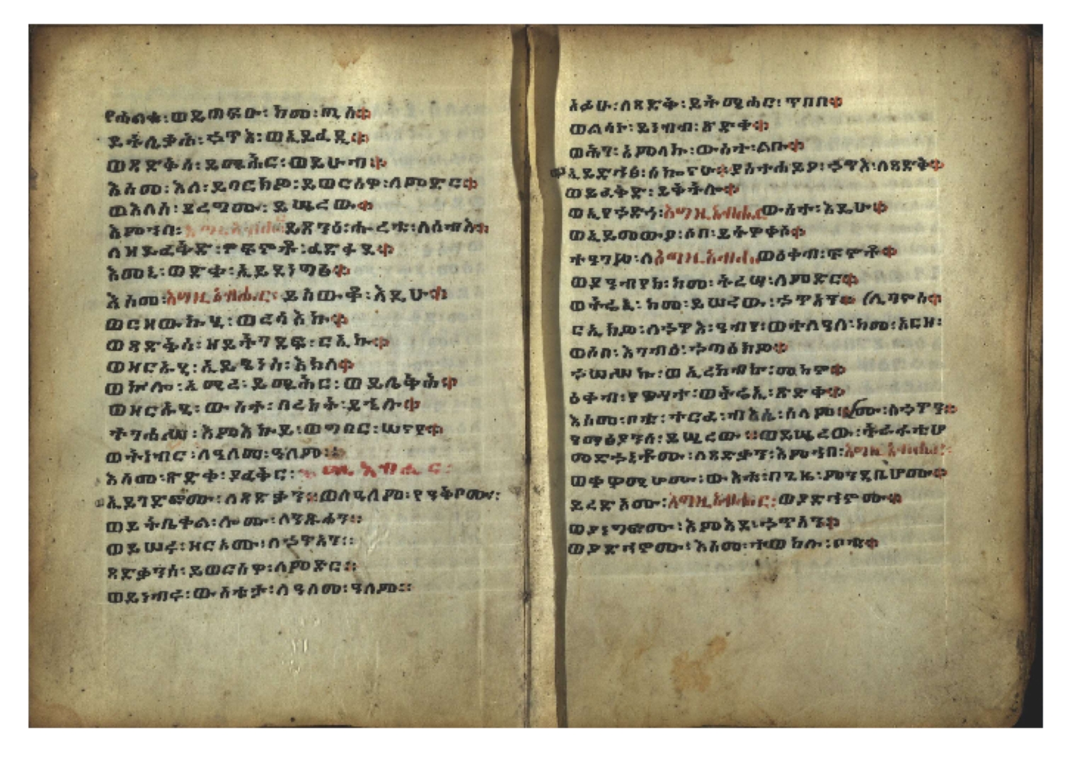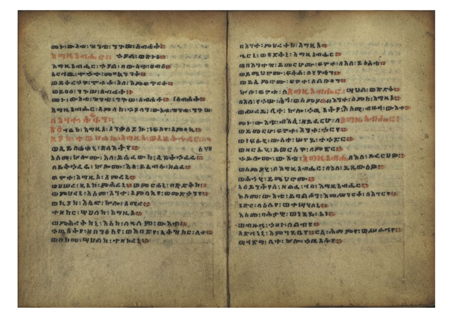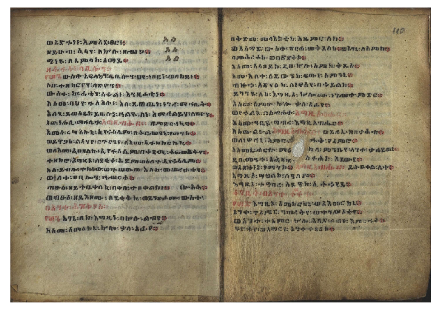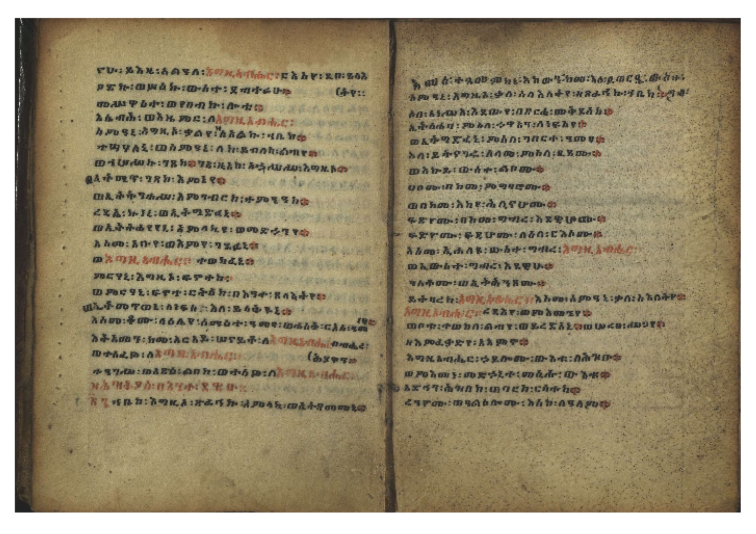 1. F. 1r–v: Mälkǝʾ-hymn to St Michael (Chaine nr. 119), written in an inaccurate hand. The words ሰላም፡ and ሚካኤል፡ are rubricated. Incipit: ሰላም፡ ለዝክረ፡ ስምከ፡ ምስለ፡ ስመ፡ ልዑል፡ ዘተሳተፈ። ወልደ፡ ያሬድ፡ ሄኖክ፡ በከመ፡ ጸሐፈ፡ ሶበ፡ እጼ<ውዕ፡> ስመከ፡ ከሲትየ፡ አፈ፡ ረዳኤ።. The text is incomplete. 2. Ff. 1v–2v: pen trials and other minor scribbles in pencil. 3. F. 156rb–v: Note on the commission of the manuscript, written in Amharic. It mentions the commissioner Aläqa Wäldä Śǝllase and the recipient Lǝǧǧ Abärra Nǝguse. Incipit: መጋቢት፡ ፲፩ቀን፡ አለቃ፡ ወልደ፡ ሥላሴ፡ ለልጅ፡ አበራ፡ ንጉሴ፡ የብራና፡ ዳዊት፡ ሲሸጥ፡ እማኝ፡ ቄስ፡ ኪዳኑ፡ የልጅ፡ አበራ፡ የሸቃ፡. ተእምራ(156v)ት፡ መድህን፡ አለቃ፡ ሐደረ፡ በሶስት፡ ብር፡ ታላድ፡ ሶሽጥ፡ በሶስት፡ ብር፡ ታላድ፡ ሺገዛ፡ ፈጣሚ፡ ብላ፡ ገብሩ፡. |