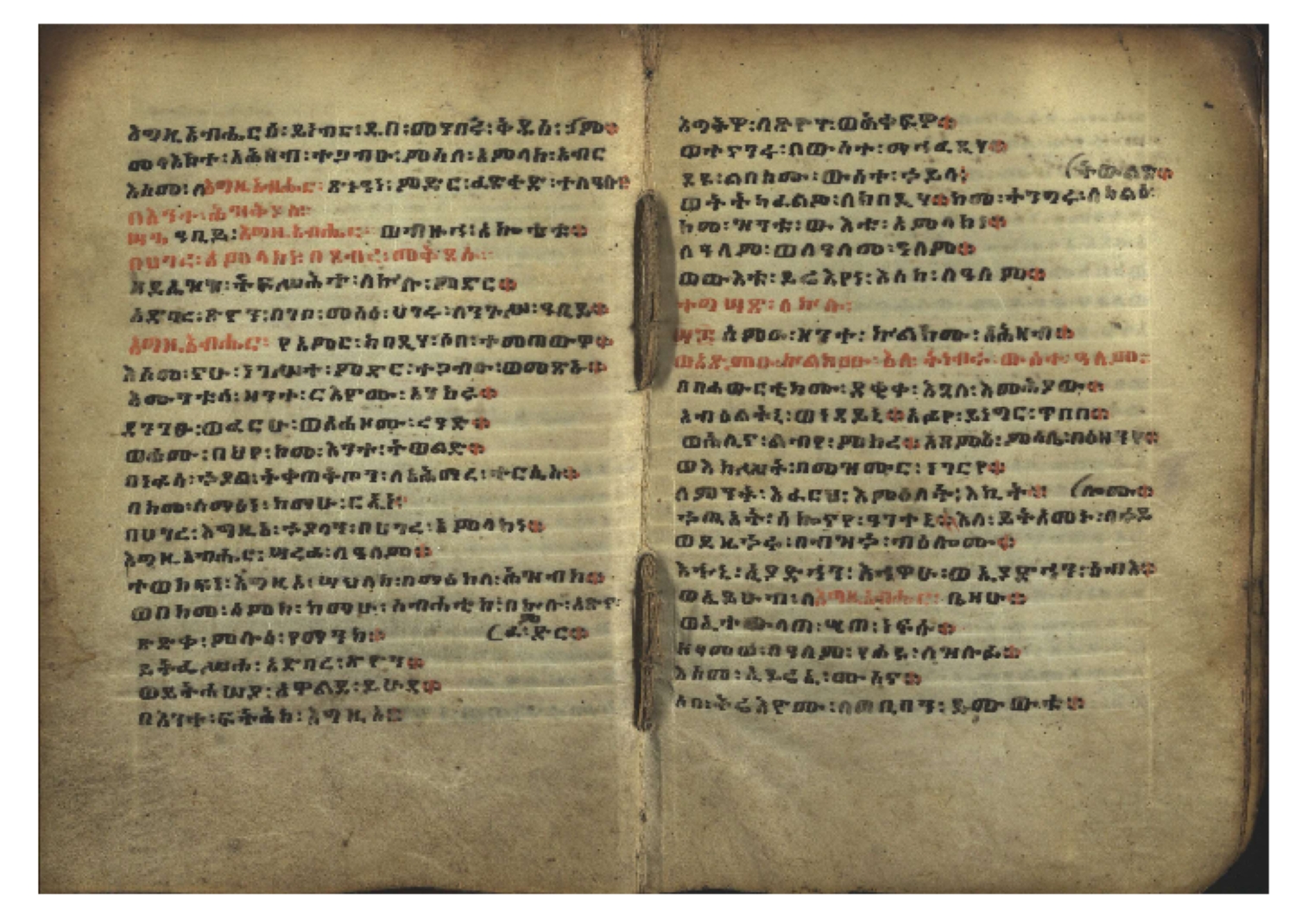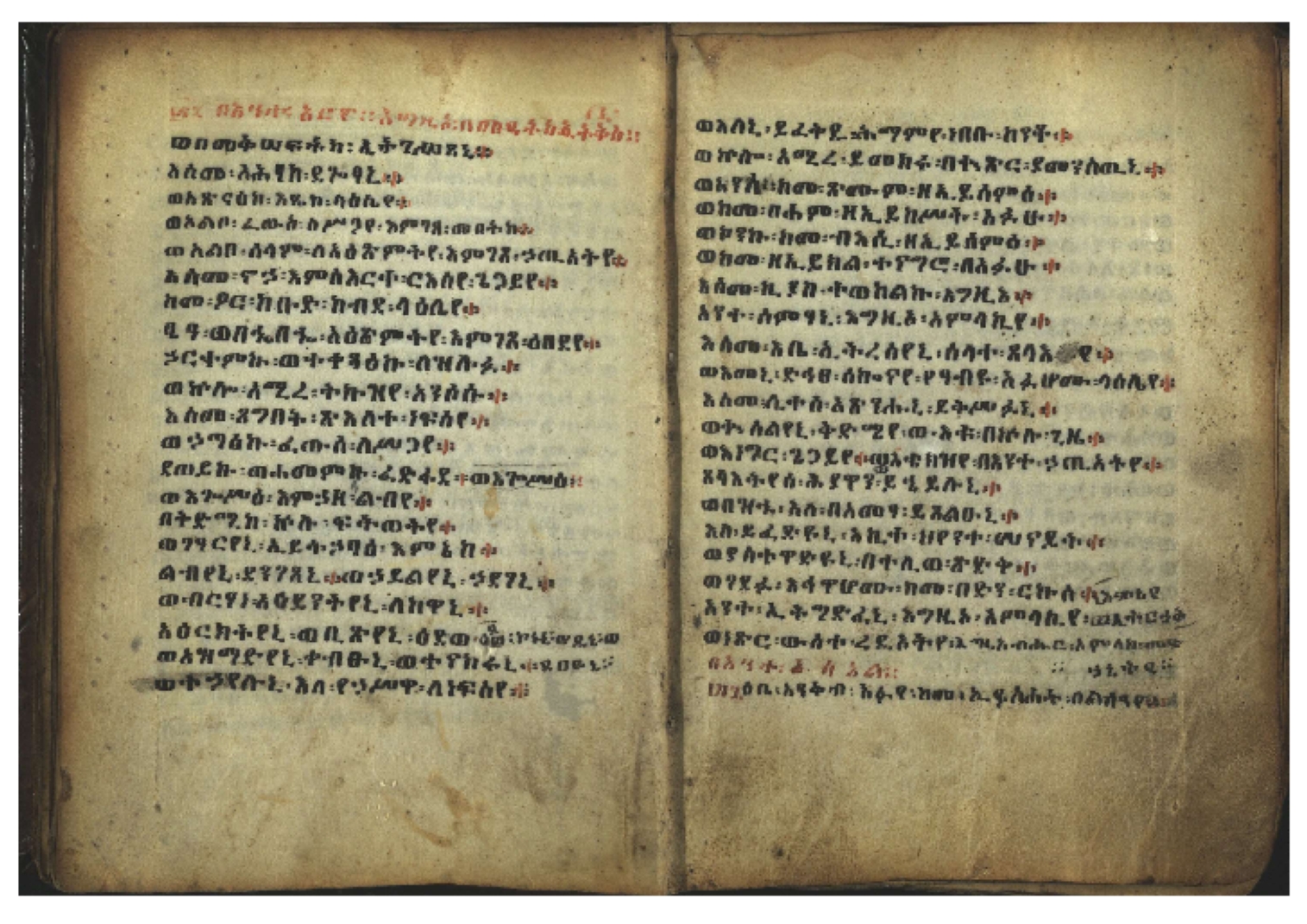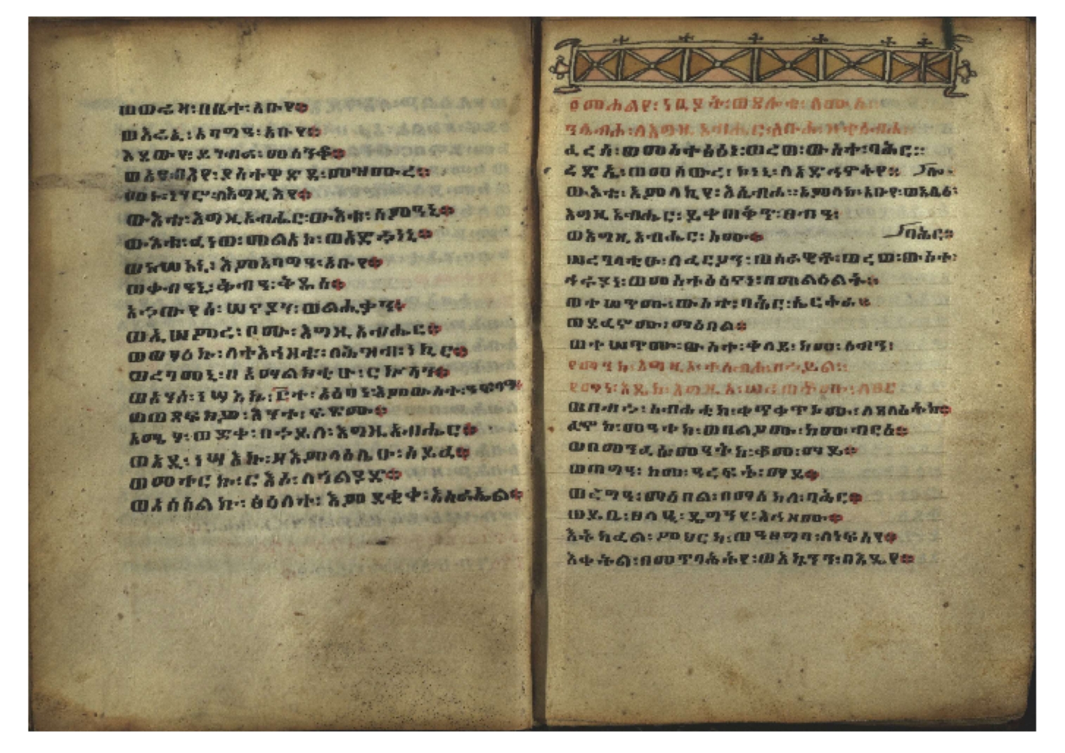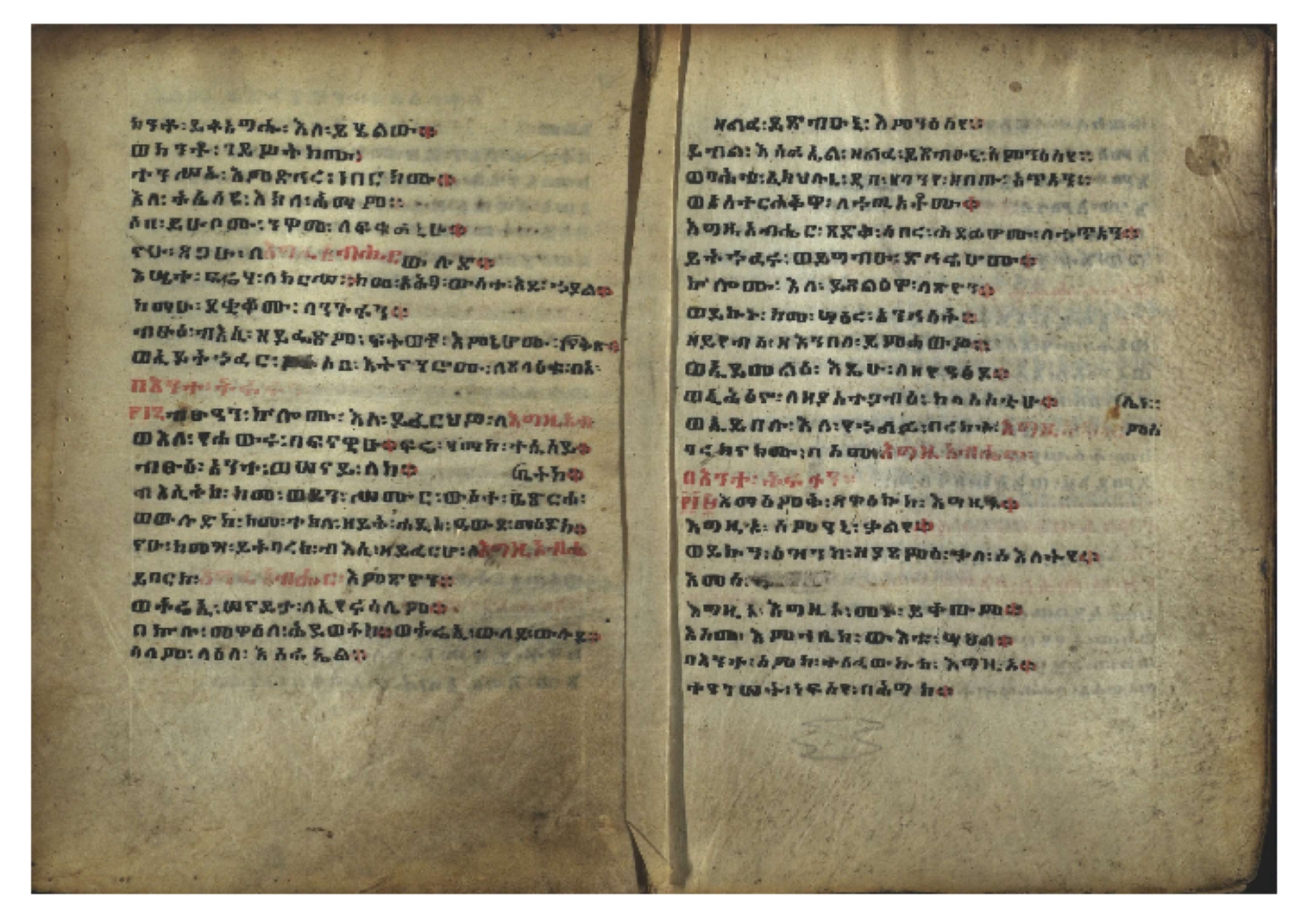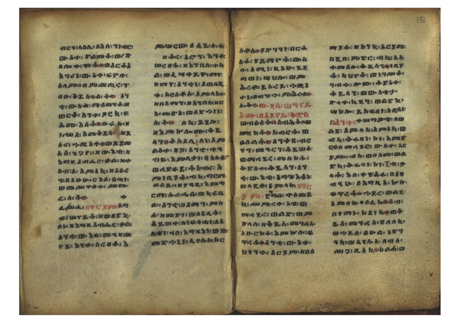 1. F. 1r–v: Mälkǝʾ-hymn to St Michael (Chaine nr. 119), written in an inaccurate hand. The words ሰላም፡ and ሚካኤል፡ are rubricated. Incipit: ሰላም፡ ለዝክረ፡ ስምከ፡ ምስለ፡ ስመ፡ ልዑል፡ ዘተሳተፈ። ወልደ፡ ያሬድ፡ ሄኖክ፡ በከመ፡ ጸሐፈ፡ ሶበ፡ እጼ<ውዕ፡> ስመከ፡ ከሲትየ፡ አፈ፡ ረዳኤ።. The text is incomplete. 2. Ff. 1v–2v: pen trials and other minor scribbles in pencil. 3. F. 156rb–v: Note on the commission of the manuscript, written in Amharic. It mentions the commissioner Aläqa Wäldä Śǝllase and the recipient Lǝǧǧ Abärra Nǝguse. Incipit: መጋቢት፡ ፲፩ቀን፡ አለቃ፡ ወልደ፡ ሥላሴ፡ ለልጅ፡ አበራ፡ ንጉሴ፡ የብራና፡ ዳዊት፡ ሲሸጥ፡ እማኝ፡ ቄስ፡ ኪዳኑ፡ የልጅ፡ አበራ፡ የሸቃ፡. ተእምራ(156v)ት፡ መድህን፡ አለቃ፡ ሐደረ፡ በሶስት፡ ብር፡ ታላድ፡ ሶሽጥ፡ በሶስት፡ ብር፡ ታላድ፡ ሺገዛ፡ ፈጣሚ፡ ብላ፡ ገብሩ፡. |