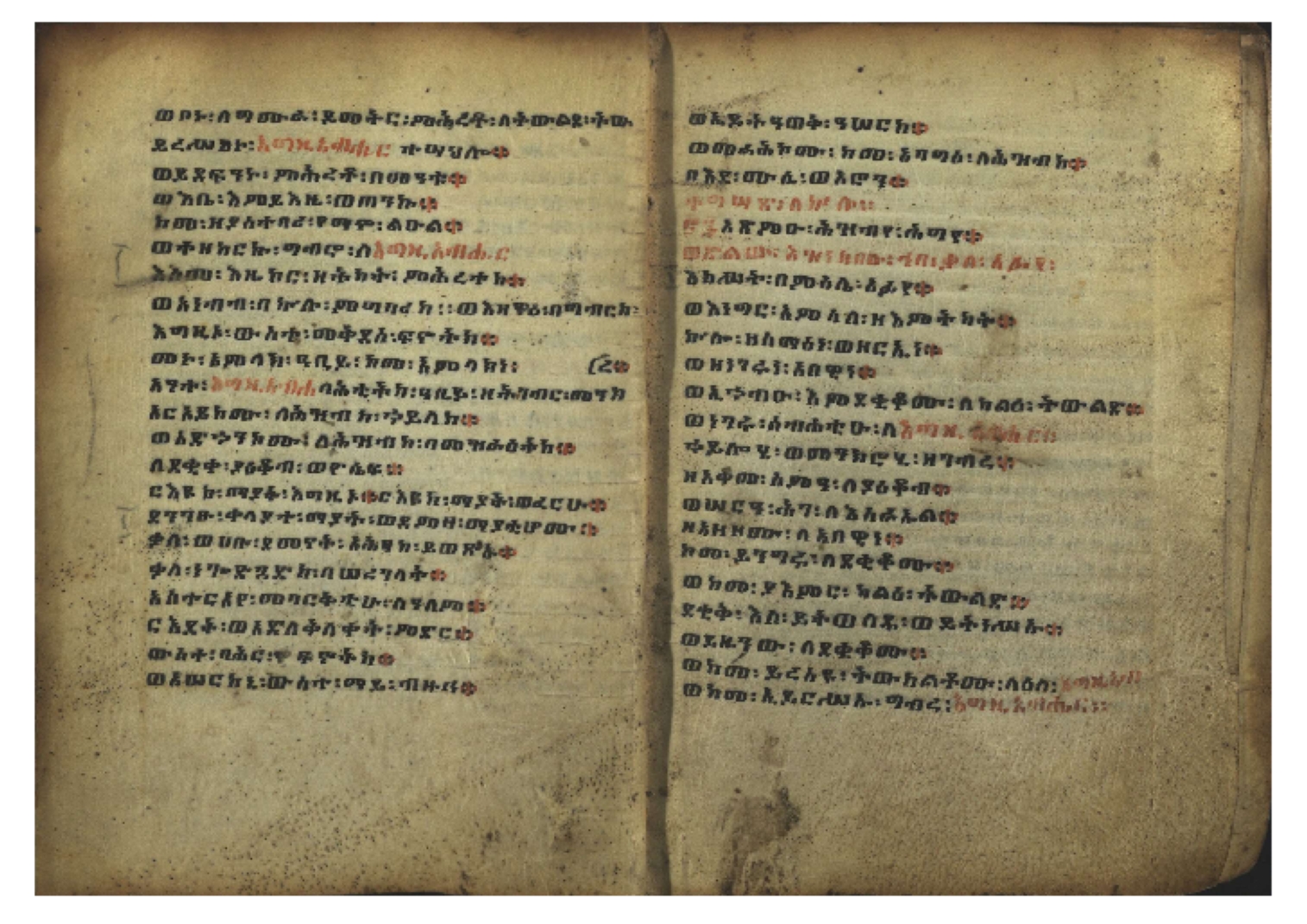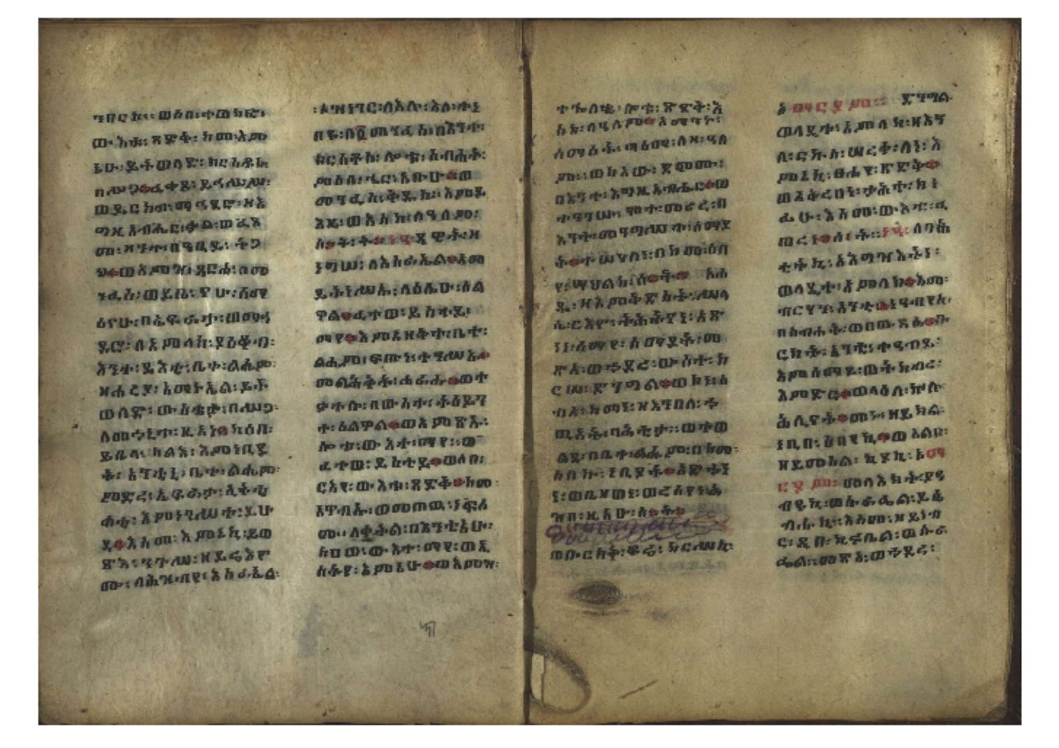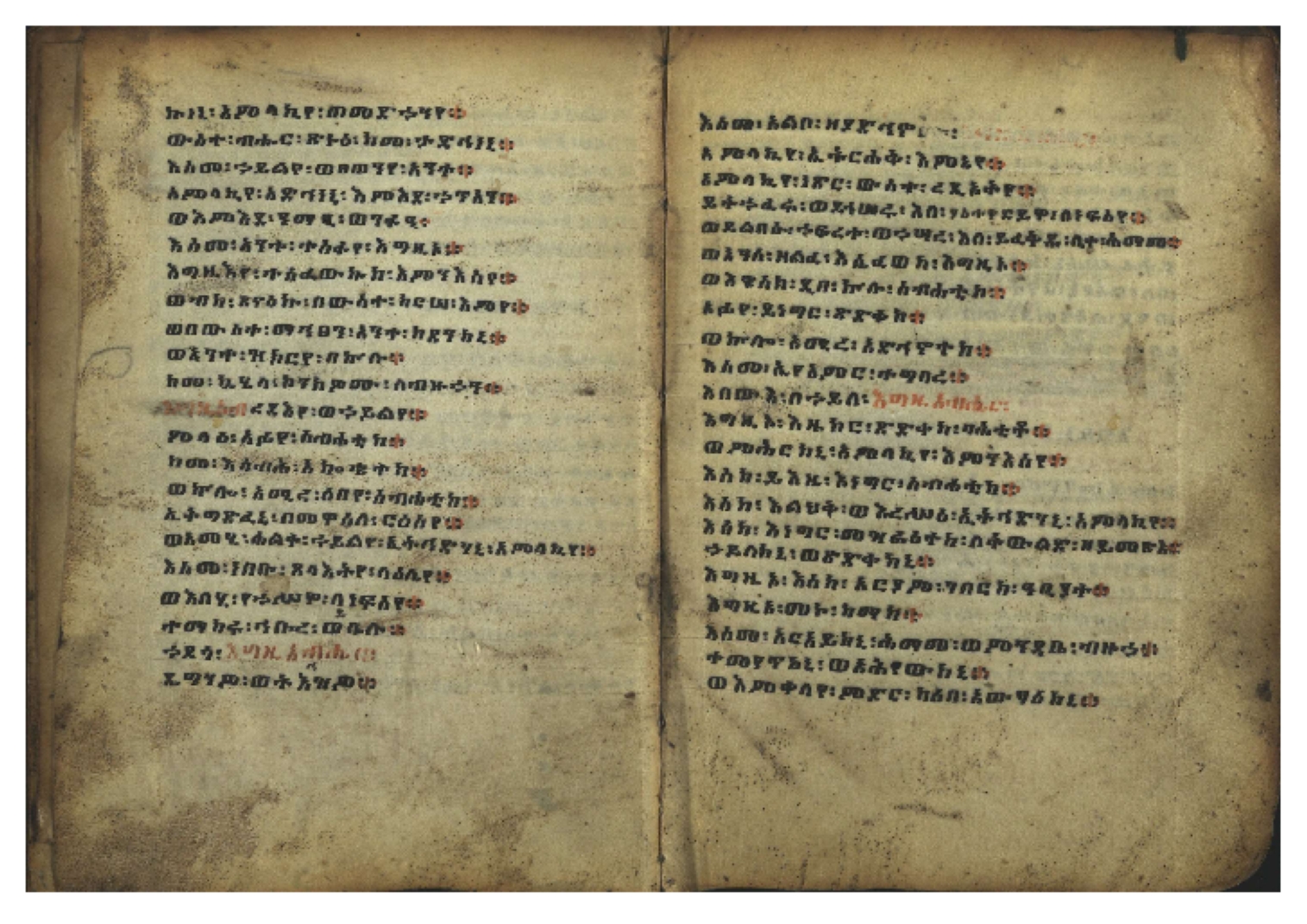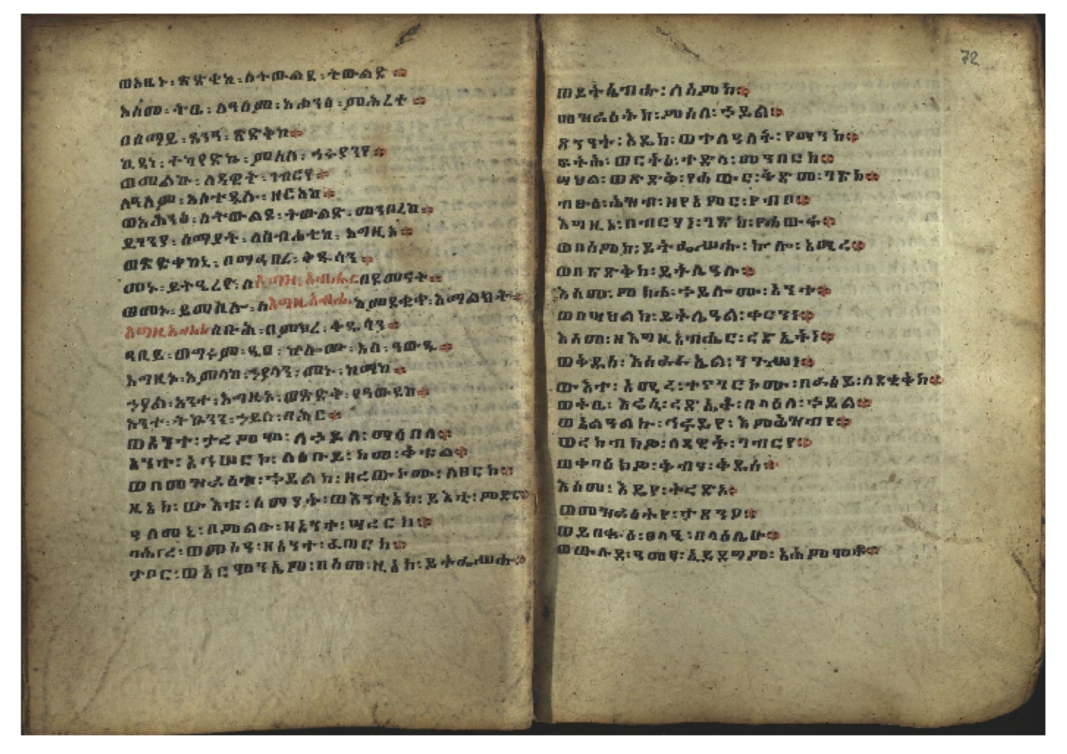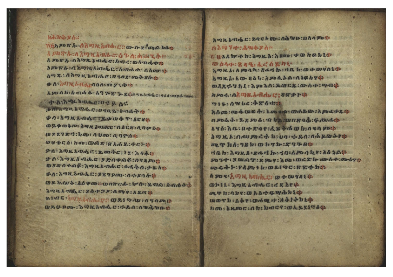 1. F. 1r–v: Mälkǝʾ-hymn to St Michael (Chaine nr. 119), written in an inaccurate hand. The words ሰላም፡ and ሚካኤል፡ are rubricated. Incipit: ሰላም፡ ለዝክረ፡ ስምከ፡ ምስለ፡ ስመ፡ ልዑል፡ ዘተሳተፈ። ወልደ፡ ያሬድ፡ ሄኖክ፡ በከመ፡ ጸሐፈ፡ ሶበ፡ እጼ<ውዕ፡> ስመከ፡ ከሲትየ፡ አፈ፡ ረዳኤ።. The text is incomplete. 2. Ff. 1v–2v: pen trials and other minor scribbles in pencil. 3. F. 156rb–v: Note on the commission of the manuscript, written in Amharic. It mentions the commissioner Aläqa Wäldä Śǝllase and the recipient Lǝǧǧ Abärra Nǝguse. Incipit: መጋቢት፡ ፲፩ቀን፡ አለቃ፡ ወልደ፡ ሥላሴ፡ ለልጅ፡ አበራ፡ ንጉሴ፡ የብራና፡ ዳዊት፡ ሲሸጥ፡ እማኝ፡ ቄስ፡ ኪዳኑ፡ የልጅ፡ አበራ፡ የሸቃ፡. ተእምራ(156v)ት፡ መድህን፡ አለቃ፡ ሐደረ፡ በሶስት፡ ብር፡ ታላድ፡ ሶሽጥ፡ በሶስት፡ ብር፡ ታላድ፡ ሺገዛ፡ ፈጣሚ፡ ብላ፡ ገብሩ፡. |
