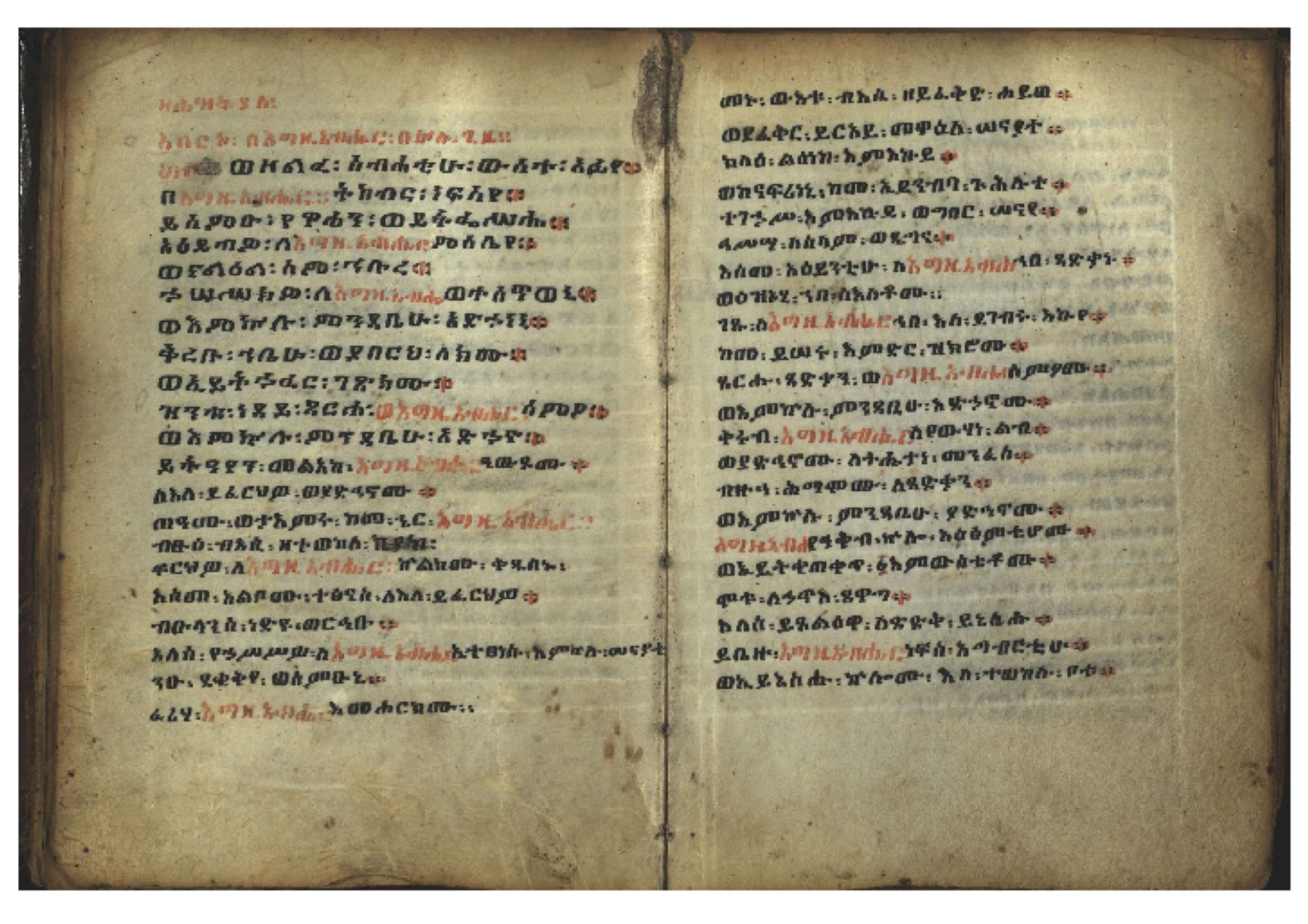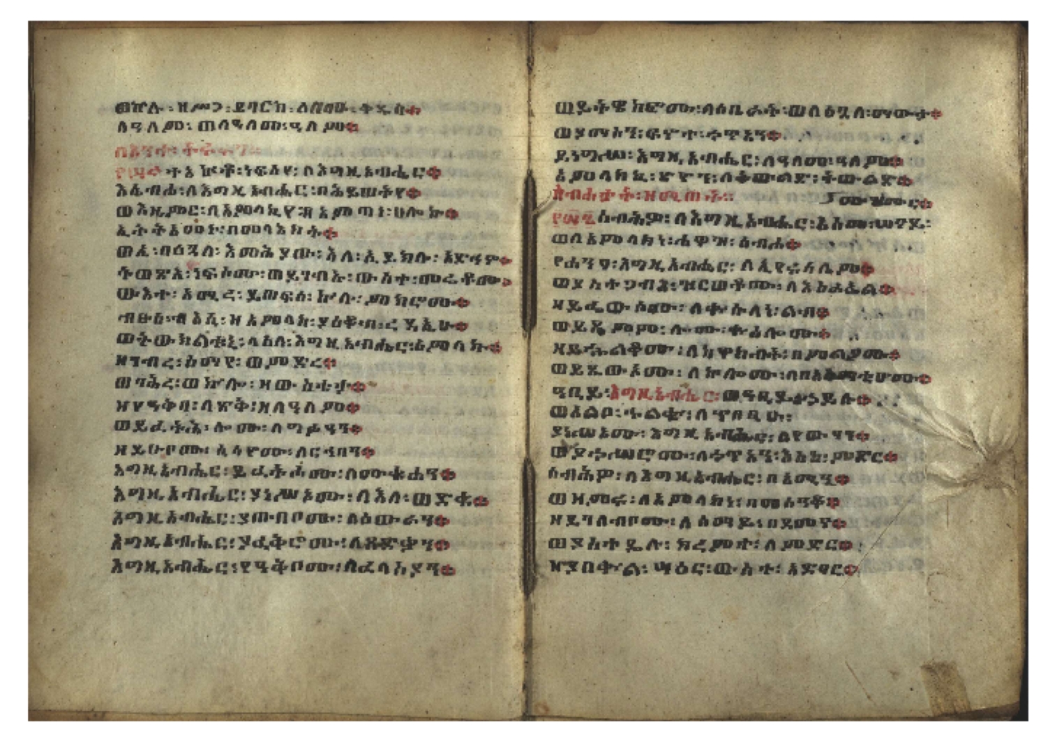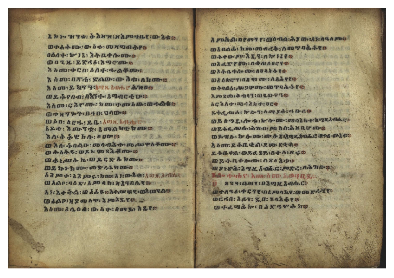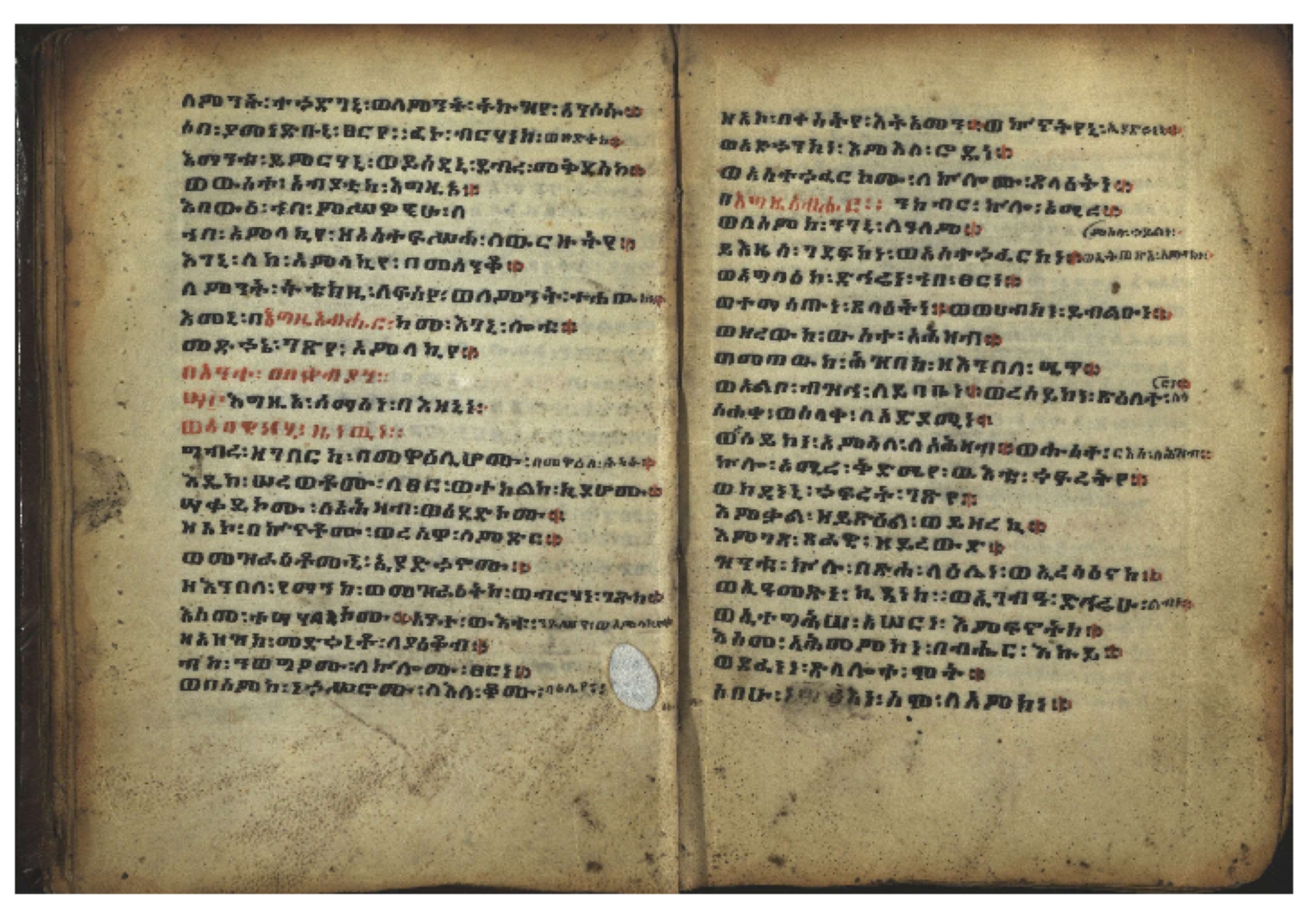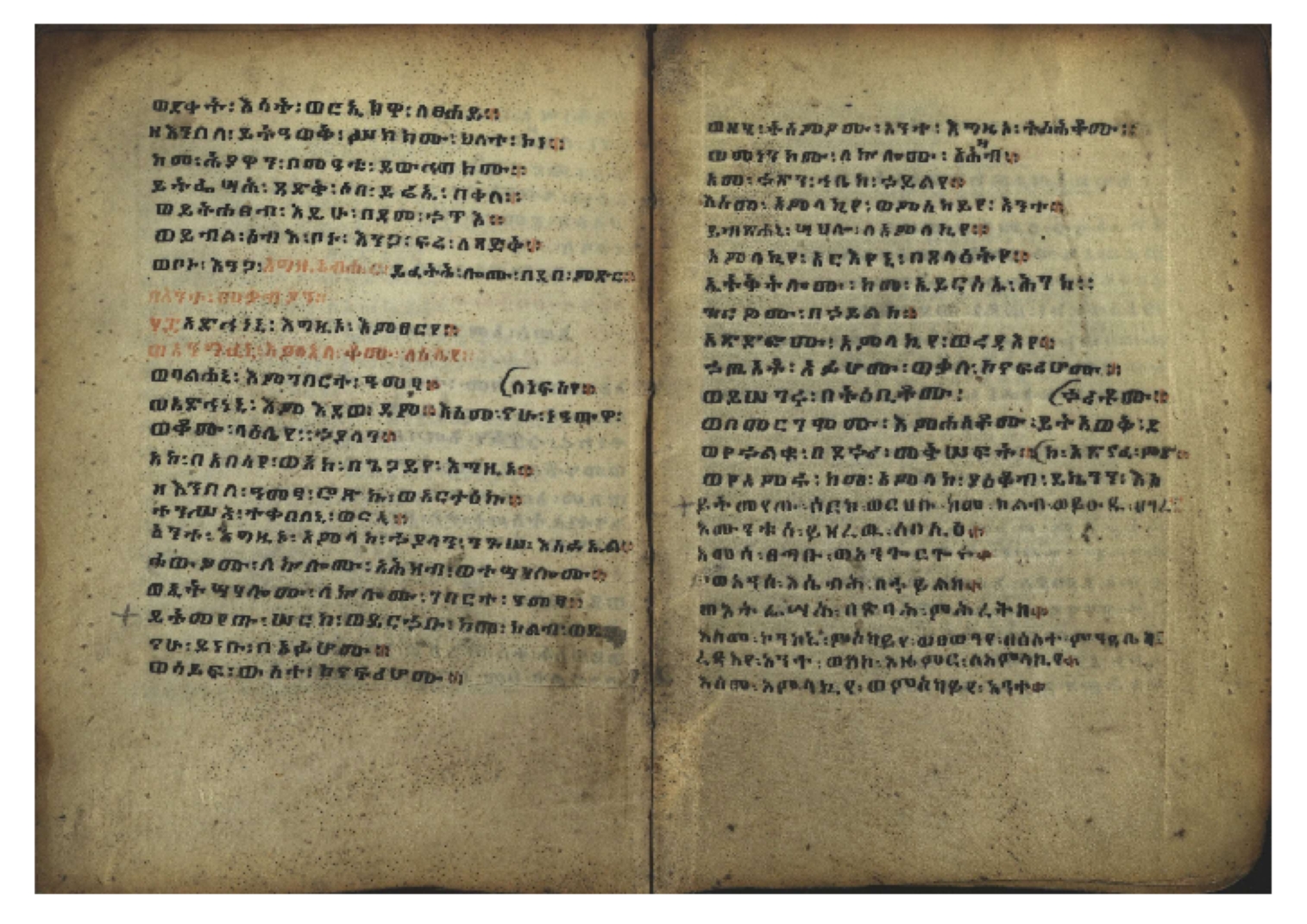 1. F. 1r–v: Mälkǝʾ-hymn to St Michael (Chaine nr. 119), written in an inaccurate hand. The words ሰላም፡ and ሚካኤል፡ are rubricated. Incipit: ሰላም፡ ለዝክረ፡ ስምከ፡ ምስለ፡ ስመ፡ ልዑል፡ ዘተሳተፈ። ወልደ፡ ያሬድ፡ ሄኖክ፡ በከመ፡ ጸሐፈ፡ ሶበ፡ እጼ<ውዕ፡> ስመከ፡ ከሲትየ፡ አፈ፡ ረዳኤ።. The text is incomplete. 2. Ff. 1v–2v: pen trials and other minor scribbles in pencil. 3. F. 156rb–v: Note on the commission of the manuscript, written in Amharic. It mentions the commissioner Aläqa Wäldä Śǝllase and the recipient Lǝǧǧ Abärra Nǝguse. Incipit: መጋቢት፡ ፲፩ቀን፡ አለቃ፡ ወልደ፡ ሥላሴ፡ ለልጅ፡ አበራ፡ ንጉሴ፡ የብራና፡ ዳዊት፡ ሲሸጥ፡ እማኝ፡ ቄስ፡ ኪዳኑ፡ የልጅ፡ አበራ፡ የሸቃ፡. ተእምራ(156v)ት፡ መድህን፡ አለቃ፡ ሐደረ፡ በሶስት፡ ብር፡ ታላድ፡ ሶሽጥ፡ በሶስት፡ ብር፡ ታላድ፡ ሺገዛ፡ ፈጣሚ፡ ብላ፡ ገብሩ፡. |